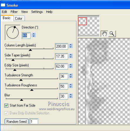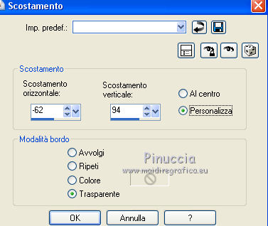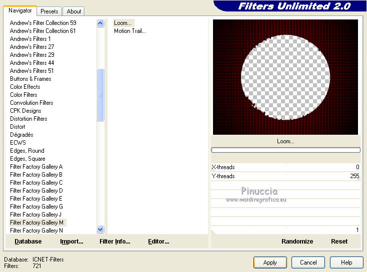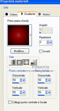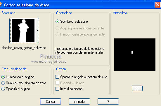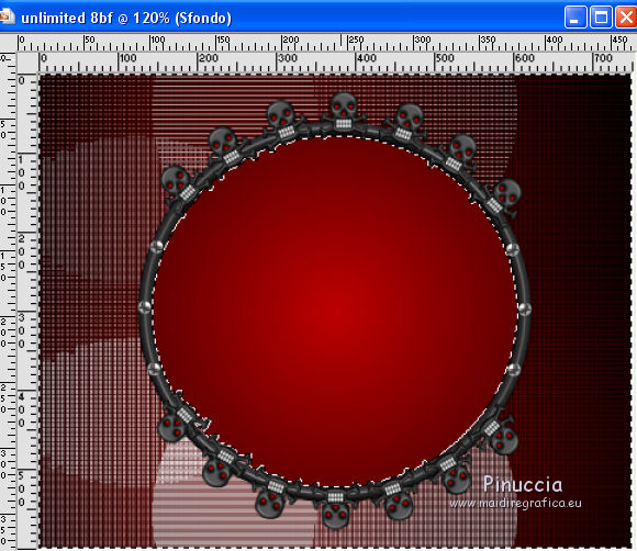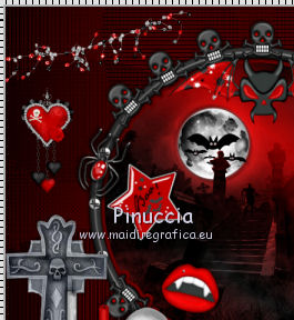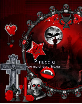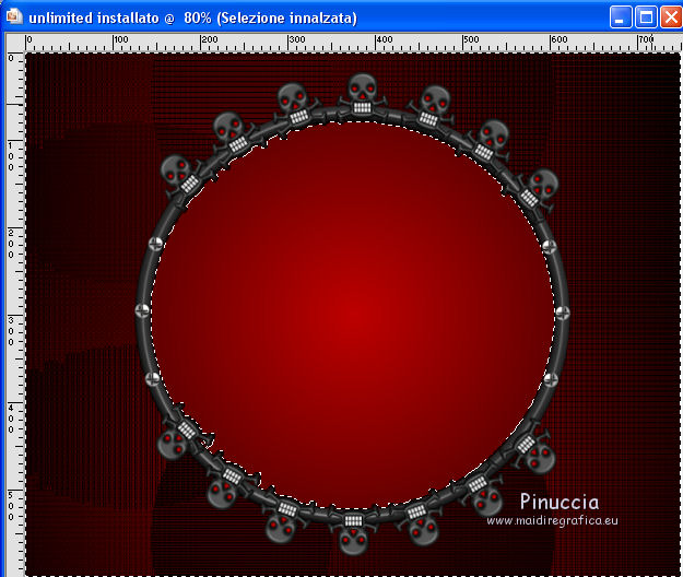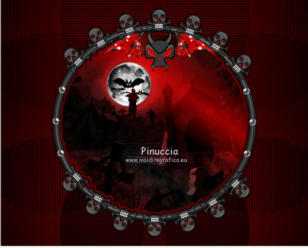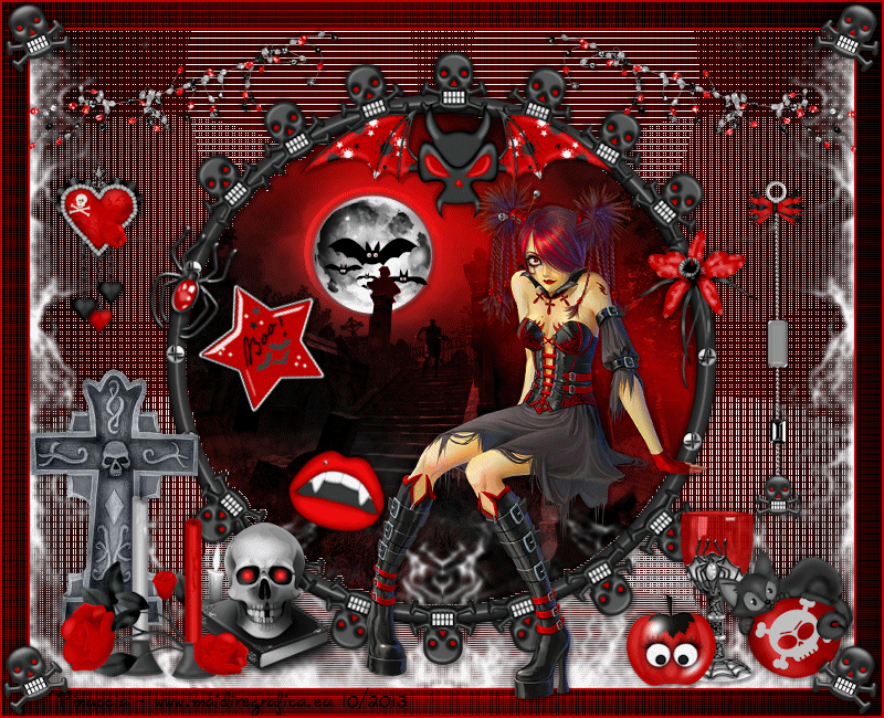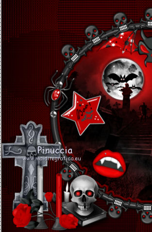qui puoi trovare qualche risposta ai tuoi dubbi. Se l'argomento che ti interessa non è presente, ti prego di segnalarmelo. Questo tutorial è una creazione di ©Titoune e non può essere copiato su altri siti nè essere offerto per il download. Lo stesso vale per la mia traduzione. Il tutorial è stato creato con PSP X5, ma può essere eseguito anche con le altre versioni di PSP. Secondo la versione utilizzata (anteriore a PSP X) potresti ottenere dei risultati differenti. Vedi la mia scheda riguardante le funzioni Rifletti>Capovolgi in X4 e X5 qui Per tradure il tutorial ho usato PSP X. Occorrente: Un tube a scelta. Il resto del materiale qui Tube utilizzato di Lori Rhae Filtri in caso di dubbi, ricorda di consultare la mia sezione filtri qui Filters Unlimited 2.0 qui Filter Factory Gallery M - Loom qui Eye Candy 4000 - Smoke qui I filtri Factory Gallery si possono usare da soli o importati in Filters Unlimited (come fare vedi qui) Se un filtro fornito appare con questa icona Animation Shop qui ![]() Metti la selezione nella cartella Selezioni. 1. Imposta il colore di primo piano con #bd0000, e il colore di sfondo con il colore nero #000000. Passa il colore di primo piano a Gradiente, stile Sprazzo di luce. ![]() 2. Apri una nuova immagine trasparente 750 x 600 pixels, e riempila con il gradiente.3. Apri l'elemento GH-Skull Frame Circle e vai a Modifica>Copia. Torna al tuo lavoro e vai a Modifica>Incolla come nuovo livello. 4. Attiva lo strumento Bacchetta magica ![]() e clicca al centro della cornice per selezionarla. Selezione>Inverti. 5. Attiva il livello inferiore. Selezione>Innalza selezione a livello. Effetti>Plugins>Filters Unlimited 2.0 - Filter Factory Gallery M - Loom, con i settaggi standard. ![]() Attenzione, qui devo aprire una parentesi. Circola in rete una versione di Unlimited, che non va installata, composta da file in formato 8bf. Questa versione, in alcuni casi e con alcuni filtri, può dare risultati differenti. Purtroppo, non è possibile codificare questi casi; si possono rilevare soltanto confrontando il proprio risultato con quelli dei tutorial originali. Questo è uno di quei casi. Per il mio esempio ho usato la versione che si installa. E questo è stato il risultato. ![]() Se nei tuoi Percorsi hai inserito la versione con i files in formato 8bf, avrai questo risultato. ![]() Per curiosità, ho terminato il tutorial con la versione in formato 8bf. Il risultato in fondo al tutorial. 6. Effetti>Effetti di riflesso>Specchio rotante. ![]() Selezione>Inverti. Selezione>Modifica>Contrai - 5 pixels. 7. Livelli>Nuovo livello raster. Livelli>Disponi>Sposta giù. 8. Apri l'elemento GH-P6 e vai a Modifica>Copia. Torna al tuo lavoro e vai a Modifica>Incolla nella selezione. Selezione>Deseleziona. 9. Attiva nuovamente il livello della cornice. Effetti>Effetti 3D>Sfalsa ombra, colore nero. ![]() Ripeti l'Effetto Sfalsa ombra, cambiando verticale e orizzontale con -3. 10. Apri l'elemento GH-Moon e vai a Modifica>Copia. Torna al tuo lavoro e vai a Modifica>Incolla come nuovo livello. 11. Effetti>Effetti di immagine>Scostamento. ![]() 12. Selezione>Carica/Salva selezione>Carica selezione da disco. Cerca e carica la selezione "selection_scrap_gothic_halloween". ![]() Premi sulla tastiera il tasto CANC ![]() Selezione>Deseleziona. Effetti>Effetti 3D>Sfalsa ombra, con i settaggi precedenti. 13. Apri l'elemento GH-Winged Skull e vai a Modifica>Copia. Torna al tuo lavoro e vai a Modifica>Incolla come nuovo livello. Spostalo nella parte superiore della cornice.![]() Effetti>Effetti 3D>Sfalsa ombra, con i settaggi precedenti. 14. Apri l'elemento GH-Amaranth Flower e vai a Modifica>Copia. Torna al tuo lavoro e vai a Modifica>Incolla come nuovo livello. Spostalo sul bordo della cornice, a destra.Vedi l'esempio finale. Effetti>Effetti 3D>Sfalsa ombra, con i settaggi precedenti. 15. Apri l'elemento GH-Star2 e vai a Modifica>Copia. Torna al tuo lavoro e vai a Modifica>Incolla come nuovo livello. Spostalo a sinistra.Vedi l'esempio finale. Effetti>Effetti 3D>Sfalsa ombra, con i settaggi precedenti. 16. Apri l'elemento GH-Vamp Teeth e vai a Modifica>Copia. Torna al tuo lavoro e vai a Modifica>Incolla come nuovo livello. Spostalo nella parte inferiore della cornice.![]() Effetti>Effetti 3D>Sfalsa ombra, con i settaggi precedenti. 17. Apri l'elemento GH-Hnger e vai a Modifica>Copia. Torna al tuo lavoro e vai a Modifica>Incolla come nuovo livello. Spostalo a destra.Vedi l'esempio finale. Effetti>Effetti 3D>Sfalsa ombra, con i settaggi precedenti. 18. Apri l'elemento GH-Cat e vai a Modifica>Copia. Torna al tuo lavoro e vai a Modifica>Incolla come nuovo livello. Spostalo in basso a destra.![]() Effetti>Effetti 3D>Sfalsa ombra, con i settaggi precedenti. 19. Apri l'elemento GH-Gothic Goblet e vai a Modifica>Copia. Torna al tuo lavoro e vai a Modifica>Incolla come nuovo livello. Sposta anche questo elemento in basso a destra.Vedi l'esempio finale. Effetti>Effetti 3D>Sfalsa ombra, con i settaggi precedenti. Porta questo livello sotto il livello del gatto. ![]() 20. Apri l'elemento GH-Pumperkin e vai a Modifica>Copia. Torna al tuo lavoro e vai a Modifica>Incolla come nuovo livello. Spostalo in basso a destra.Vedi l'esempio finale. Effetti>Effetti 3D>Sfalsa ombra, con i settaggi precedenti. 21. Apri l'elemento GH-Skull e vai a Modifica>Copia. Torna al tuo lavoro e vai a Modifica>Incolla come nuovo livello. Spostalo in basso a sinistra.Vedi l'esempio finale. Effetti>Effetti 3D>Sfalsa ombra, con i settaggi precedenti. 22. Apri l'elemento GH-Tombstone e vai a Modifica>Copia. Torna al tuo lavoro e vai a Modifica>Incolla come nuovo livello. Spostalo in basso a sinistra.Vedi l'esempio finale. Effetti>Effetti 3D>Sfalsa ombra, con i settaggi precedenti. 23. Apri l'elemento GH-Candles e vai a Modifica>Copia. Torna al tuo lavoro e vai a Modifica>Incolla come nuovo livello. Sposta anche questo elemento in basso a sinistra.![]() Effetti>Effetti 3D>Sfalsa ombra, con i settaggi precedenti. 24. Apri l'elemento GH-Ge