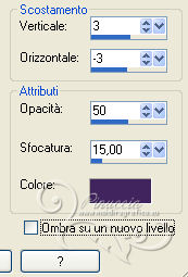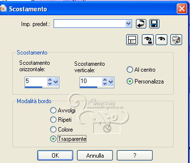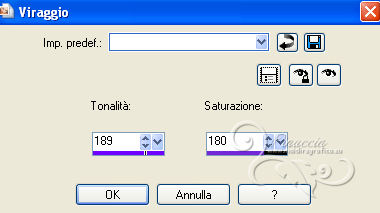 qui puoi trovare qualche risposta ai tuoi dubbi. Se l'argomento che ti interessa non è presente, ti prego di segnalarmelo. Questo tutorial è una creazione di ©Titoune e non può essere copiato su altri siti nè essere offerto per il download. Lo stesso vale per la mia traduzione. Il tutorial è stato creato con PSP X5, ma può essere eseguito anche con le altre versioni di PSP. Secondo la versione utilizzata (anteriore a PSP X) potresti ottenere dei risultati differenti. Vedi la mia scheda riguardante le funzioni Rifletti>Capovolgi in X4 e X5 qui Per tradure il tutorial ho usato PSP X. Grazie ai creatori dei tubes che mettono a disposizione il loro lavoro in vari gruppi di condivisione. Rispetta il lavoro degli autori, non cambiare il nome del file e non cancellare il watermark. Occorrente: Un tube a scelta. Il resto del materiale qui Il tube utilizzato è di Occhi blu. Gli elementi scrap sono una creazione Mago74. ![]() 1. Apri una nuova immagine trasparente 650 x 650 pixels. Selezione>Seleziona tutto. 2. Apri l'elemento Happy Day by_Mago74 pp (3) e vai a Modifica>Copia. Torna al tuo lavoro e vai a Modifica>Incolla nella selezione. Selezione>Deseleziona. 3. Attiva lo strumento Bacchetta magica ![]() e clicca al centro della cornice per selezionarla. Dovrai cliccare più volte per una selezione ottimale (eventualmente aumenta la tolleranza della bacchetta). ![]() Livelli>Nuovo livello raster. 4. Apri l'immagine 091612fffc2a4ee1cb4277d63c8d2389 e vai a Modifica>Copia. Torna al tuo lavoro e vai a Modifica>Incolla nella selezione. Mantieni selezionato. 5. Livelli>Nuovo livello raster. Apri l'elemento HappyDay by_Mago74 el (22). Regola>Tonalità e saturazione>Viraggio. ![]() Modifica>Copia. Torna al tuo lavoro e vai a Modifica>Incolla nella selezione. Abbassa l'opacità di questo livello al 40%. Selezione>Deseleziona. 7. Apri l'elemento HappyDay by_Mago74 el (86) e vai a Modifica>Copia. Torna al tuo lavoro e vai a Modifica>Incolla come nuovo livello. 8. Effetti>Effetti di immagine>Scostamento. ![]() 9. Apri l'elemento HappyDay by_Mago74 el (96) e vai a Modifica>Copia. Torna al tuo lavoro e vai a Modifica>Incolla come nuovo livello. 10. Effetti>Effetti 3D>Sfalsa ombra, con il colore #41255d. ![]() 11. Apri l'elemento HappyDay by_Mago74 el (101) e vai a Modifica>Copia. Torna al tuo lavoro e vai a Modifica>Incolla come nuovo livello. Effetti>Effetti 3D>Sfalsa ombra, con i settaggi precedenti. 12. Apri l'elemento HappyDay by_Mago74 el (21) e vai a Modifica>Copia. Torna al tuo lavoro e vai a Modifica>Incolla come nuovo livello. Spostalo sulla cornice in alto.Vedi l'esempio finale. Effetti>Effetti 3D>Sfalsa ombra, con i settaggi precedenti. 13. Apri l'elemento HappyDay by_Mago74 el (28) e vai a Modifica>Copia. Torna al tuo lavoro e vai a Modifica>Incolla come nuovo livello. Spostalo sulla parte destra della cornice.Vedi l'esempio finale. Effetti>Effetti 3D>Sfalsa ombra, con i settaggi precedenti. 14. Apri l'elemento HappyDay by_Mago74 el (26) e vai a Modifica>Copia. Torna al tuo lavoro e vai a Modifica>Incolla come nuovo livello. Spostalo in basso a destra della cornice.![]() Effetti>Effetti 3D>Sfalsa ombra, con i settaggi precedenti. 15. Apri l'elemento HappyDay by_Mago74 el (92) e vai a Modifica>Copia. Torna al tuo lavoro e vai a Modifica>Incolla come nuovo livello. Spostalo sulla parte inferiore della cornice.![]() Effetti>Effetti 3D>Sfalsa ombra, con i settaggi precedenti. 16. Apri l'elemento HappyDay by_Mago74 el (43) e vai a Modifica>Copia. Torna al tuo lavoro e vai a Modifica>Incolla come nuovo livello. Sposta anche questo elemento sulla parte inferiore della cornice.Vedi l'esempio finale. Livelli>Disponi>Sposta giù. Effetti>Effetti 3D>Sfalsa ombra, con i settaggi precedenti. 17. Attiva nuovamente il livello superiore. Apri l'elemento HappyDay by_Mago74 el (31) e vai a Modifica>Copia. Torna al tuo lavoro e vai a Modifica>Incolla come nuovo livello. Spostalo in basso a sinistra della cornice.![]() Effetti>Effetti 3D>Sfalsa ombra, con i settaggi precedenti. 18. Apri l'elemento HappyDay by_Mago74 el (97) e vai a Modifica>Copia. Torna al tuo lavoro e vai a Modifica>Incolla come nuovo livello. Sposta anche questo elemento in basso a sinistra.Vedi l'esempio finale. Effetti>Effetti 3D>Sfalsa ombra, con i settaggi precedenti. 19. Apri l'elemento HappyDay by_Mago74 el (57) e vai a Modifica>Copia. Torna al tuo lavoro e vai a Modifica>Incolla come nuovo livello. Spostalo in basso a sinistra.Vedi l'esempio finale. Effetti>Effetti 3D>Sfalsa ombra, con i settaggi precedenti. 20. Apri l'elemento HappyDay by_Mago74 el (42) e vai a Modifica>Copia. Torna al tuo lavoro e vai a Modifica>Incolla come nuovo livello. Spostalo in basso a sinistra.Vedi l'esempio finale. Effetti>Effetti 3D>Sfalsa ombra, con i settaggi precedenti. 21. Apri l'elemento HappyDay by_Mago74 el (61) e vai a Modifica>Copia. Torna al tuo lavoro e vai a Modifica>Incolla come nuovo livello. Spostalo sul vaso.![]() Effetti>Effetti 3D>Sfalsa ombra, con i settaggi precedenti. 22. Apri l'elemento HappyDay by_Mago74 el (100) e vai a Modifica>Copia. Torna al tuo lavoro e vai a Modifica>Incolla come nuovo livello. Spostalo in basso a sinistra, davanti al vaso.![]() Effetti>Effetti 3D>Sfalsa ombra, con i settaggi precedenti. 23. Apri l'elemento HappyDay by_Mago74 el (84) e vai a Modifica>Copia. Torna al tuo lavoro e vai a Modifica>Incolla come nuovo livello. Spostalo in alto a sinistra.Vedi l'esempio finale. Effetti>Effetti 3D>Sfalsa ombra, con i settaggi precedenti. Livelli>Duplica. Immagine>Capovolgi. Immagine>Rifletti. 24. Apri l'elemento HappyDay by_Mago74 el (89) e vai a Modifica>Copia. Torna al tuo lavoro e vai a Modifica>Incolla come nuovo livello. Spostalo nella parte superiore sinistra della cornice.![]() Effetti>Effetti 3D>Sfalsa ombra, con i settaggi precedenti. 25. Apri l'elemento HappyDay by_Mago74 el (45) e vai a Modifica>Copia. Torna al tuo lavoro e vai a Modifica>Incolla come nuovo livello. Spostalo in basso a destra.Vedi l'esempio