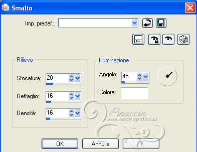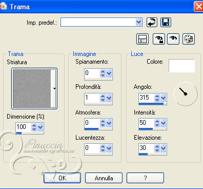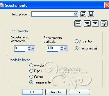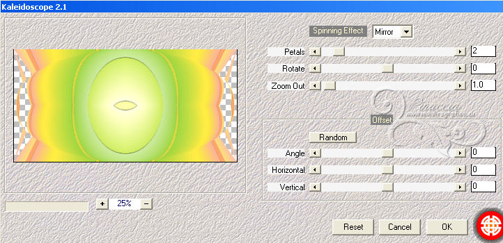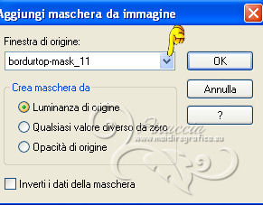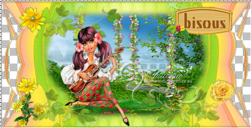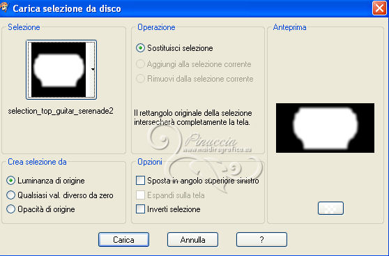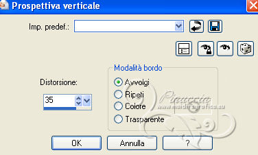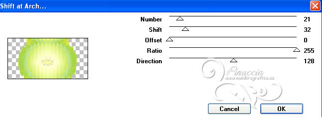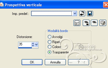 qui puoi trovare qualche risposta ai tuoi dubbi. Se l'argomento che ti interessa non è presente, ti prego di segnalarmelo. Questo tutorial è una creazione di ©Titoune e non può essere copiato su altri siti nè essere offerto per il download. Lo stesso vale per la mia traduzione. Il tutorial è stato creato con PSP X5, ma può essere eseguito anche con le altre versioni di PSP. Secondo la versione utilizzata (anteriore a PSP X) potresti ottenere dei risultati differenti. Per tradurlo, ho usato PSP X. Grazie ai creatori dei tubes che mettono a disposizione il loro lavoro in vari gruppi di condivisione. Rispetta il lavoro degli autori, non cambiare il nome del file e non cancellare il watermark. Occorrente: Un tube a scelta. Il resto del maeriale qui Il tube utilizzato è di Jer. Filtri Mehdi - Kaleidoscope 2.1 qui Mura's Seamless - Shift at Arch qui ![]() Metti il gradiente nella cartella Gradienti. Metti le selezioni nella cartella Selezioni. Apri la maschera in PSP e minimizzala con il resto del materiale. 1. Passa il colore di primo piano a Gradiente, e seleziona il gradiente winterchaos_gradient012 con i seguenti settaggi. ![]() 2. Apri una nuova immagine trasparente 1280 x 650 pixels, e riempila con il gradiente.3. Effetti>Effetti artistici>Smalto - colore bianco. ![]() 4. Effetti>Effetti geometrici>Prospettiva verticale. ![]() 5. Di nuovo Effetti>Effetti geometrici>Prospettiva verticale, 2 volte con i seguenti settaggi. ![]() 6. Effetti>Effetti geometrici>Sfera. ![]() 7. Selezione>Carica/Salva selezione>Carica selezione da disco. Cerca e carica la selezione "selection_top_guitar_serenade". ![]() Selezione>Innalza selezione a livello. 8. Effetti>Effetti artistici>Mezzitoni. ![]() Effetti>Effetti di bordo>Aumenta. Selezione>Deseleziona. 9. Effetti>Effetti 3D>Sfalsa ombra, con il colore #223307. ![]() Ripeti l'Effetto Sfalsa ombra, cambiando verticale e orizzontale con -3/3. ![]() Dovresti avere questo. ![]() 10. Attiva il livello inferiore. Effetti>Plugins>Mehdi - Kaleidoscope 2.1. ![]() 11. Attiva nuovamente il livello superiore. Effetti>Plugins>Mehdi - Kaleidoscope 2.1, con i settaggi precedenti. Rinomina questo livello "bordo". 12. Ritorna al livello inferiore. Attiva lo strumento Selezione ![]() clicca sull'icona Selezione personalizzata ![]() e imposta i seguenti settaggi. ![]() Selezione>Innalza selezione a livello. Selezione>Deseleziona. 13. Effetti>Effetti geometrici>Sfera, con i settaggi precedenti. 14. Effetti>Plugins>Mura's Seamless - Shift At Arch. ![]() Rinomina questo livello "arco". Immagine>Capovolgi. 15. Selezione>Carica/Salva selezione>Carica selezione da disco. Cerca e carica la selezione "selection_top_guitar_serenade2". ![]() Regola>Sfocatura>Sfocatura gaussiana - raggio 25. ![]() 16. Effetti>Effetti di trama>Trama - seleziona la trama Striatura (nelle versioni più recenti corrisponde alla trama Corel_15_029, con i seguenti settaggi. ![]() 17. Livelli>Nuovo livello raster. Apri l'immagine Fantasti-naturewallpapers_03. Immagine>Rifletti. Modifica>Copia. Torna al tuo lavoro e vai a Modifica>Incolla nella selezione. Mantieni selezionato. 18. Livelli>Nuovo livello raster. Apri l'immagine Nature9_22.10 e vai a Modifica>Copia. Torna al tuo lavoro e vai a Modifica>Incolla nella selezione. Selezione>Inverti. 19. Attiva il livello "arco". Selezione>Innalza selezione a livello. Livelli>Disponi>Porta in alto. Selezione>Deseleziona. Effetti>Effetti artistici>Mezzitoni, con i settaggi precedenti. 20. Livelli>Duplica. Attiva il livello sottostante dell'originale. Effetti>Effetti 3D>Sfalsa ombra, con i settaggi precedenti. 21. Attiva il livello "bordo". Livelli>Disponi>Porta in alto. Apri l'elemento branchs e vai a Modifica>Copia. Torna al tuo lavoro e vai a Modifica>Incolla come nuovo livello. Effetti>Effetti 3D>Sfalsa ombra, con i settaggi precedenti. Livelli>Disponi>Sposta giù. 22. Apri l'elemento da94cbed e vai a Modifica>Copia. Torna al tuo lavoro e vai a Modifica>Incolla come nuovo livello. Spostalo in alto a destra.![]() Effetti>Effetti 3D>Sfalsa ombra, con i settaggi precedenti. 23. Apri l'elemento bee_douceur_el26 e vai a Modifica>Copia. Torna al tuo lavoro e vai a Modifica>Incolla come nuovo livello. Spostalo in basso a destra.Effetti>Effetti 3D>Sfalsa ombra, con i settaggi precedenti. 24. Apri l'elemento Bee_douceur_el12 e vai a Modifica>Copia. Torna al tuo lavoro e vai a Modifica>Incolla come nuovo livello. Spostalo in basso a sinistra.Effetti>Effetti 3D>Sfalsa ombra, con i settaggi precedenti. 25. Apri l'elemento Bee_douceur_el10 e vai a Modifica>Copia. Torna al tuo lavoro e vai a Modifica>Incolla come nuovo livello. Spostalo in alto a sinistra.![]() Effetti>Effetti 3D>Sfalsa ombra, con i settaggi precedenti. 26. Apri l'elemento e8edf15b (uccello) e vai a Modifica>Copia. Torna al tuo lavoro e vai a Modifica>Incolla come nuovo livello. Spostalo sull'altalena.Effetti>Effetti 3D>Sfalsa ombra, con i settaggi precedenti. 27. Apri il tuo tube e vai a Modifica>Copia. Torna al tuo lavoro e vai a Modifica>Incolla come nuovo livello. Immagine>Ridimensiona, se e quanto necessario, tutti i livelli non selezionato. Spostalo dove preferisci,o vedi il mio esempio. ![]() Effetti>Effetti 3D>Sfalsa ombra, con i settaggi precedenti. 28. Attiva il livello Raster 1. Selezione>Seleziona tutto. Immagine>Ritaglia la selezione. 29. Immagine>Dimensioni tela - 1280 x 1500 pixels. ![]() Livelli>Nuovo livello raster. Livelli>Disponi>Sposta giù. Riempi con il gradiente di partenza.Modifica>Copia. 30. Apri una nuova immagine trasparente 1280 x 350 pixels. Selezione>Seleziona tutto. Modifica>Incolla nella selezione. Selezione>Deseleziona. Effetti>Effetti artistici>Mezzitoni, con i settaggi precedenti. 31. Livelli>Nuovo livello maschera>Da immagine. Apri il menu sotto la finestra di origine e vedrai la lista dei files aperti. Seleziona la maschera bordurtop-mask_11, con i seguenti settaggi. ![]() Livelli>Unisci>Unisci gruppo. Modifica>Copia. Torna al tuo top e vai a Modifica>Incolla come nuov