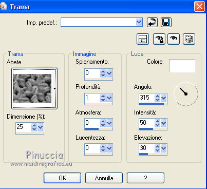 7. Effetti>Effetti di trama>Trama - seleziona la trama Abete, con i seguenti settaggi.