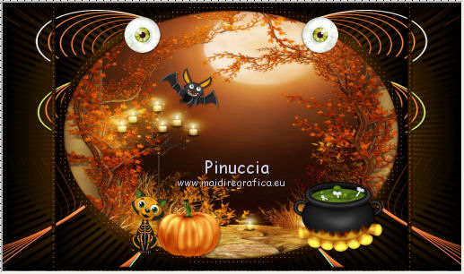 qui puoi trovare qualche risposta ai tuoi dubbi. Se l'argomento che ti interessa non è presente, ti prego di segnalarmelo. Questo tutorial è una creazione di ©Titoune e non può essere copiato su altri siti nè essere offerto per il download. Lo stesso vale per la mia traduzione. Il tutorial è stato creato con PSP X5, ma può essere eseguito anche con le altre versioni di PSP. Secondo la versione utilizzata (anteriore a PSP X) potresti ottenere dei risultati differenti. Dalla versione X4, il comando Immagine>Rifletti è stato sostituito con Immagine>Capovolgi in orizzontale, e il comando Immagine>Capovolgi con Immagine>Capovolgi in verticale. Nelle versioni X5 e X6, le funzioni sono state migliorate rendendo disponibile il menu Oggetti. Con la nuova version x7 sono tornati i comandi Rifletti e Capovolgi, ma con nuove differenze. Vedi la scheda sull'argomento qui Per tradurre il tutorial ho usato PSP X. Occorrente: Un tube a scelta. Il resto del materiale qui ![]() Metti le selezioni nella cartella Selezioni. Apri la maschera in PSP e minimizzala con il resto del materiale. 1. Imposta il colore di primo piano con #e78b02, e il colore di sfondo con il colore nero. Passa il colore di primo piano a Gradiente di primo piano/sfondo, stile Rettangolare. ![]() 2. Apri una nuova immagine trasparente 1000 x 750 pixels, e riempila con il gradiente.3. Apri l'elemento coordonnées polaires e vai a Modifica>Copia. Torna al tuo lavoro e vai a Modifica>Incolla come nuovo livello. 4. Attiva il livello Raster 1. Selezione>Carica/Salva selezione>Carica selezione da disco. Cerca e carica la selezione "selection_top_Halloween_fractal". ![]() Selezione>Innalza selezione a livello. Livelli>Disponi>Sposta su. 5. Effetti>Effetti di trama>Intessitura. colore intessitura #510508 riempi spazi #dd9537. ![]() 6. Effetti>Effetti 3D>Smusso a incasso. ![]() 7. Selezione>Carica/Salva selezione>Carica selezione da disco. Cerca e carica la selezione "selection_top_Halloween_fractal2". ![]() 8. Livelli>Nuovo livello raster. Livelli>Disponi>Sposta giù. Apri l'immagine g 102111, e vai a Modifica>Copia. Torna al tuo lavoro e vai a Modifica>Incolla nella selezione. Selezione>Deseleziona. 9. Attiva il livello superiore. Effetti>Effetti 3D>Sfalsa ombra, colore nero. ![]() Ripeti l'Effetto Sfalsa ombra, cambiando verticale e orizzontale con -3. 10. Attiva il livello Raster 2. Livelli>Unisci>Unisci giù. Modifica>Copia. Selezione>Seleziona tutto. Immagine>Ritaglia la selezione. 11. Immagine>Dimensioni tela - 1280 x 750 pixels. ![]() 12. Livelli>Nuovo livello raster. Livelli>Disponi>Sposta giù. Selezione>Seleziona tutto. Modifica>Incolla nella selezione. 13. Attiva il livello immediatamente sopra - Raster 1. Selezione>Mobile. Selezione>Immobilizza. 14. Selezione>Modifica>Seleziona bordature selezione. ![]() Attiva nuovamente il livello inferiore. Selezione>Innalza selezione a liello. Livelli>Disponi>Porta in alto. Effetti>Effetti di trama>Intessitura, con i settaggi precedenti. Effetti>Effetti 3D>Smusso a incasso, con i settaggi precedenti. Selezione>Deseleziona. 15. Effetti>Effetti di riflesso>Specchio rotante. ![]() Effetti>Effetti 3D>Sfalsa ombra, con i settaggi precedenti. 16. Attiva il livello Raster 1. Selezione>Seleziona tutto. Livelli>Nuovo livello raster. 17. Apri l'elemento 240414pg25, e vai a Modifica>Copia. Torna al tuo lavoro e vai a Modifica>INcolla nella selezione. Selezione>Deseleziona. Effetti>Effetti 3D>Sfalsa ombra, colore nero. ![]() 18. Attiva nuovamente il livello superiore. Apri l'elemento MHE-27, e vai a Modifica>Copia. Torna al tuo lavoro e vai a Modifica>Incolla come nuovo livello. Spostalo al centro della cornice,vedi l'esempio finale. Effetti>Effetti 3D>Sfalsa ombra, con i settaggi precedenti. 19. Apri l'elemento MHE-24, e vai a Modifica>Copia. Torna al tuo lavoro e vai a Modifica>Incolla come nuovo livello. Spostalo in basso a sinistra,vedi l'esempio finale. Effetti>Effetti 3D>Sfalsa ombra, con i settaggi precedenti. 20. Apri l'elemento MHE-4, e vai a Modifica>Copia. Torna al tuo lavoro e vai a Modifica>Incolla come nuovo livello. Spostalo in basso a sinistra, accanto all'elemento precedente.![]() Effetti>Effetti 3D>Sfalsa ombra, con i settaggi precedenti. 21. Apri l'elemento MHE-19, e vai a Modifica>Copia. Torna al tuo lavoro e vai a Modifica>Incolla come nuovo livello. Spostalo in basso a destra,vedi l'esempio finale. Effetti>Effetti 3D>Sfalsa ombra, con i settaggi precedenti. 22. Apri l'elemento MHE-7, e vai a Modifica>Copia. Torna al tuo lavoro e vai a Modifica>Incolla come nuovo livello. Spostalo in alto a sinistra,vedi l'esempio finale. Effetti>Effetti 3D>Sfalsa ombra, con i settaggi precedenti. Livelli>Duplica. Immagine>Rifletti. ![]() 23. halloween_wordart, e vai a Modifica>Copia. Torna al tuo lavoro e vai a Modifica>Incolla come nuovo livello. Spostalo in alto al centro.vedi l'esempio finale. Effetti>Effetti 3D>Sfalsa ombra, con i settaggi precedenti. 24. Apri l'elemento Halloween Beads 6, e vai a Modifica>Copia. Torna al tuo lavoro e vai a Modifica>Incolla come nuovo livello. Spostalo a sinistra,vedi l'esempio finale. Effetti>Effetti 3D>Sfalsa ombra, con i settaggi precedenti. Livelli>Duplica. Immagine>Rifletti. 25. Apri il tuo tube, e vai a Modifica>Copia. Torna al tuo lavoro e vai a Modifica>Incolla come nuovo livello. Immagine>Ridimensiona, se e quanto necessario, tutti i livelli non selezionato. Spostalo dove preferisci,o vedi il mio esempio. Effetti>Effetti 3D>Sfalsa ombra, con i settaggi precedenti. 26. Attiva il livello inferiore. Selezione>Seleziona tutto. Immagine>Ritaglia la selezione. 27. Immagine>Dimensioni tela - 1280 x 1700 pixels. ![]() 28. Livelli>Nuovo livello raster. Livelli>Disponi>Sposta giù. Riempi con il colore nero.29. Apri una nuova immagine trasparente 1280 x 350 pixels. Selezione>Seleziona tutto. Apri l'immagine g102111, e vai a Modifica>Copia. Torna al lavoro e vai a Modifica>Incolla nella selezione. Selezione>Deseleziona. 30. Effetti>Effetti di immagine>Motivo