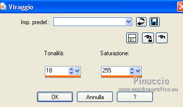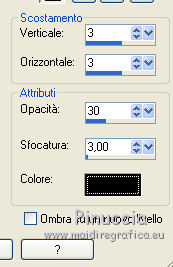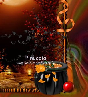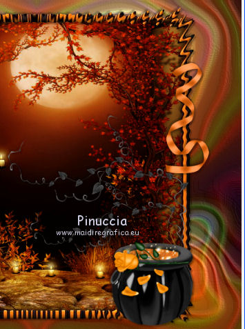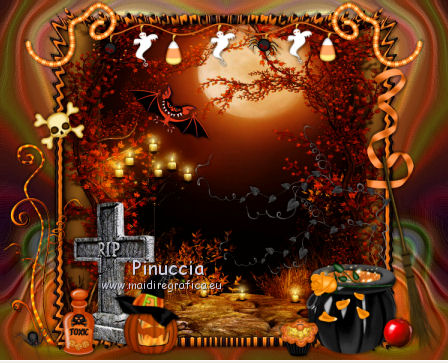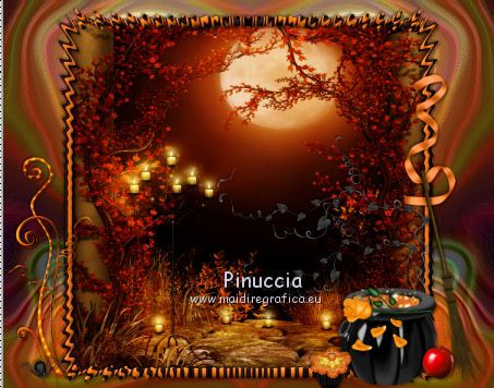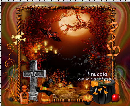 qui puoi trovare qualche risposta ai tuoi dubbi. Se l'argomento che ti interessa non è presente, ti prego di segnalarmelo. Questo tutorial è una creazione di ©Titoune e non può essere copiato su altri siti nè essere offerto per il download. Lo stesso vale per la mia traduzione. Il tutorial è stato creato con PSP X5, ma può essere eseguito anche con le altre versioni di PSP. Secondo la versione utilizzata (anteriore a PSP X) potresti ottenere dei risultati differenti. Vedi la mia scheda riguardante le funzioni Rifletti>Capovolgi in X4 e X5 qui Per tradure il tutorial ho usato PSP X. Occorrente: Un tube a scelta. Il resto del materiale qui Filtri in caso di dubbi, ricorda di consultare la mia sezione filtri qui Graphics Plus - Cross Shadow qui ![]() 1. Apri una nuova immagine trasparente 750 x 600 pixels. Selezione>Seleziona tutto. 2. Apri l'immagine HalloweenEve01 e vai a Modifica>Copia. Torna al tuo lavoro e vai a Modifica>Incolla nella selezione. Selezione>Deseleziona. 3. Regola>Sfocatura>Sfocatura gaussiana - raggio 25. ![]() 4. Effetti>Plugins>Graphics Plus - Cross Shadow. ![]() 5. Apri l'elemento Halloween Frame 7 e vai a Modifica>Copia. Torna al tuo lavoro e vai a Modifica>Incolla come nuovo livello. Rinomina questo livello "Cornice". 6. Attiva lo strumento Bacchetta magica ![]() e clicca al centro della cornice per selezionarla. Selezione>Modifica>Espandi - 5 pixels. Selezione>Inverti. Attiva il livello Raster 1. 7. Effetti>Effetti di trama>Plastica morbida. ![]() Selezione>Deseleziona. Immagine>Rifletti. 8. Effetti>Effetti di riflesso>Specchio rotante. ![]() 9. Attiva nuovamente il livello "cornice". Con la bacchetta magica , clicca al centro della cornice per selezionarla.Selezione>Modifica>Espandi - 5 pixels. 10. Livelli>Nuovo livello raster. Livelli>Disponi>Sposta giù. Apri l'immagine "g 102111" e vai a Modifica>Copia. Torna al tuo lavoro e vai a Modifica>Incolla nella selezione. Selezione>Deseleziona. Livelli>Duplica, e cambia la modalità di miscelatura di questo livello in Moltiplica. 11. Attiva il livello "cornice". Effetti>Effetti 3D>Smusso a incasso. ![]() 12. Effetti>Effetti 3D>Sfalsa ombra, colore #040100. ![]() Ripeti l'Effetto Sfalsa ombra, cambiando verticale e orizzontale con -3. 13. Apri l'elemento sd-element 34 e vai a Modifica>Copia. Torna al tuo lavoro e vai a Modifica>Incolla come nuovo livello. Spostalo a destra.Vedi l'esempio finale. Effetti>Effetti 3D>Sfalsa ombra, con i settaggi precedenti. 14. Apri l'elemento sd-element 16 e vai a Modifica>Copia. Torna al tuo lavoro e vai a Modifica>Incolla come nuovo livello. Spostalo in basso a destra.Vedi l'esempio finale. Effetti>Effetti 3D>Sfalsa ombra, con i settaggi precedenti. 15. Apri l'elemento sd-element 5 e vai a Modifica>Copia. Torna al tuo lavoro e vai a Modifica>Incolla come nuovo livello. Spostalo in basso a destra.Vedi l'esempio finale. Effetti>Effetti 3D>Sfalsa ombra, con i settaggi precedenti. 16. Apri l'elemento sd-element 27 e vai a Modifica>Copia. Torna al tuo lavoro e vai a Modifica>Incolla come nuovo livello. Spostalo sul calderone.![]() Effetti>Effetti 3D>Sfalsa ombra, con i settaggi precedenti. 17. Apri l'elemento sd-element 4 e vai a Modifica>Copia. Torna al tuo lavoro e vai a Modifica>Incolla come nuovo livello. Spostalo in basso a destra.Vedi l'esempio finale. Effetti>Effetti 3D>Sfalsa ombra, con i settaggi precedenti. 18. Apri l'elemento sd-element 20 e vai a Modifica>Copia. Torna al tuo lavoro e vai a Modifica>Incolla come nuovo livello. Spostalo in basso a destra.![]() Effetti>Effetti 3D>Sfalsa ombra, con i settaggi precedenti. 19. Apri l'elemento sd-element 22 e vai a Modifica>Copia. Torna al tuo lavoro e vai a Modifica>Incolla come nuovo livello. Spostalo in basso, a sinistra del calderone.Vedi l'esempio finale. Effetti>Effetti 3D>Sfalsa ombra, con i settaggi precedenti. 20. Apri l'elemento sd-element 15 e vai a Modifica>Copia. Torna al tuo lavoro e vai a Modifica>Incolla come nuovo livello. Spostalo in basso a sinistra.Vedi l'esempio finale. Effetti>Effetti 3D>Sfalsa ombra, con i settaggi precedenti. 21. Apri l'elemento sd-element 3 e vai a Modifica>Copia. Torna al tuo lavoro e vai a Modifica>Incolla come nuovo livello. Spostalo in basso a sinistra.![]() Effetti>Effetti 3D>Sfalsa ombra, con i settaggi precedenti. 22. Apri l'elemento sd-element 7 e vai a Modifica>Copia. Torna al tuo lavoro e vai a Modifica>Incolla come nuovo livello. Spostalo in basso a sinistra.Vedi l'esempio finale. Effetti>Effetti 3D>Sfalsa ombra, con i settaggi precedenti. 23. Apri l'elemento sd-element 21 e vai a Modifica>Copia. Torna al tuo lavoro e vai a Modifica>Incolla come nuovo livello. Spostalo a sinistra della lapide.Vedi l'esempio finale. Effetti>Effetti 3D>Sfalsa ombra, con i settaggi precedenti. 24. Apri l'elemento sd-element 8 e vai a Modifica>Copia. Torna al tuo lavoro e vai a Modifica>Incolla come nuovo livello. Spostalo a destra della lapide.Vedi l'esempio finale. Effetti>Effetti 3D>Sfalsa ombra, con i settaggi precedenti. 25. Apri l'elemento sd-element 2 e vai a Modifica>Copia. Torna al tuo lavoro e vai a Modifica>Incolla come nuovo livello. Spostalo sopra la zucca.![]() Effetti>Effetti 3D>Sfalsa ombra, con i settaggi precedenti. 26. Apri l'elemento sd-element 33 e vai a Modifica>Copia. Torna al tuo lavoro e vai a Modifica>Incolla come nuovo livello. Spostalo a sinistra.Vedi l'esempio finale. Effetti>Effetti 3D>Sfalsa ombra, con i settaggi precedenti. 27. Apri l'elemento sd-element 24 e vai a Modifica>Copia. Torna al tuo lavoro e vai a Modifica>Incolla come nuovo livello. Spostalo dove preferisci,o vedi il mio esempio. ![]() Effetti>Effetti 3D>Sfalsa ombra, con i settaggi precedenti. 28. Apri l'elemento sd-element 19 e vai a Modifica>Copia. Torna al tuo lavoro e vai a Modifica>Incolla come nuovo livello. Spostalo in alto.Vedi l'esempio finale. Effetti>Effetti 3D>Sfalsa ombra, con i settaggi precedenti. 29. Apri l'elemento sd-element 1 e vai a Modifica>Copia. Torna al tuo lavoro e vai a Modifica