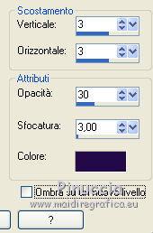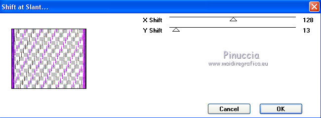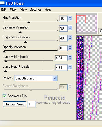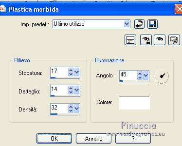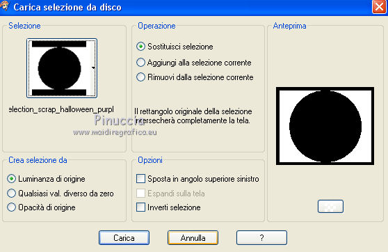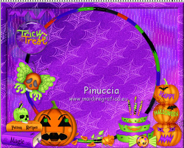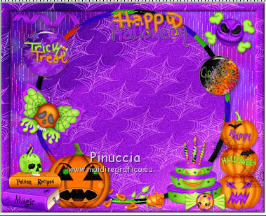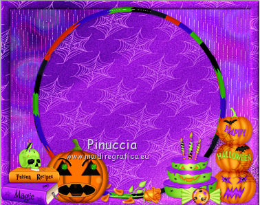 qui puoi trovare qualche risposta ai tuoi dubbi. Se l'argomento che ti interessa non è presente, ti prego di segnalarmelo. Questo tutorial è una creazione di ©Titoune e non può essere copiato su altri siti nè essere offerto per il download. Lo stesso vale per la mia traduzione. Il tutorial è stato creato con PSP X5, ma può essere eseguito anche con le altre versioni di PSP. Secondo la versione utilizzata (anteriore a PSP X) potresti ottenere dei risultati differenti. Vedi la mia scheda riguardante le funzioni Rifletti>Capovolgi in X4 e X5 qui Per tradure il tutorial ho usato PSP X. Occorrente: Un tube a scelta. Il resto del materiale qui Filtri in caso di dubbi, ricorda di consultare la mia sezione filtri qui Mura's Seamless - Shift at Slant qui Eye Candy 4000 - HSB Noise qui Animation Shop qui ![]() Metti la selezione nella cartella Selezioni. 1. Apri una nuova immagine trasparente 750 x 600 pixels. Selezione>Seleziona tutto. 2. Apri l'elemento LL_Halloween_Me_Paper 7 e vai a Modifica>Copia. Torna al tuo lavoro e vai a Modifica>Incolla nella selezione. 3. Selezione>Carica/Salva selezione>Carica selezione da disco. Cerca e carica la selezione "selection_scrap_halloween_purple". ![]() Regola>Sfocatura>Sfocatura gaussiana - raggio 15. ![]() Selezione>Innalza selezione a livello. 4. Effetti>Effetti di trama>Plastica morbida. ![]() 5. Attiva il livello inferiore. Selezione>Seleziona tutto. Selezione>Modifica>Contrai - 25 pixels. Selezione>Inverti. Selezione>Innalza selezione a livello. 6. Effetti>Effetti 3D>Smusso a incasso. ![]() Livelli>Disponi>Porta in alto. Selezione>Deseleziona. 7. Livelli>Duplica. Attiva il livello sottostante dell'originale. Effetti>Plugins>Mura's Seamless - Shift At Slant. ![]() Rinomina questo livello "animazione". 8. Attiva il livello superiore. Apri l'elemento LL_Halloween Me_Frame e vai a Modifica>Copia. Torna al tuo lavoro e vai a Modifica>Incolla come nuovo livello. 9. Attiva lo strumento Bacchetta magica ![]() e clicca al centro della cornice per selezionarla. Selezione>Modifica>Espandi - 6 pixels. Attiva il livello "animazione". Premi sulla tastiera il tasto CANC ![]() Selezione>Deseleziona. Effetti>Effetti di bordo>Aumenta. 10. Effetti>Effetti 3D>Sfalsa ombra, colore #250c48. ![]() 11. Attiva nuovamente il livello superiore. Apri l'elemento LL_Halloween Me_Pumpkins e vai a Modifica>Copia. Torna al tuo lavoro e vai a Modifica>Incolla come nuovo livello. Spostalo in basso a destra.![]() Effetti>Effetti 3D>Sfalsa ombra, con i settaggi precedenti. 12. Apri l'elemento LL_Halloween Me_Pumpkin Cake e vai a Modifica>Copia. Torna al tuo lavoro e vai a Modifica>Incolla come nuovo livello. Spostalo in basso.Vedi l'esempio finale. Effetti>Effetti 3D>Sfalsa ombra, con i settaggi precedenti. 13. Apri l'elemento LL_Halloween Me_Candy 5 e vai a Modifica>Copia. Torna al tuo lavoro e vai a Modifica>Incolla come nuovo livello. Spostalo in basso a destra, davanti alla torta.![]() Effetti>Effetti 3D>Sfalsa ombra, con i settaggi precedenti. 14. Apri l'elemento LL_Halloween Me_Rose 1 e vai a Modifica>Copia. Torna al tuo lavoro e vai a Modifica>Incolla come nuovo livello. Spostalo in basso, sul bordo della cornice.Vedi l'esempio finale. Effetti>Effetti 3D>Sfalsa ombra, con i settaggi precedenti. 15. Apri l'elemento LL_Halloween Me_Rose 1_1 e vai a Modifica>Copia. Torna al tuo lavoro e vai a Modifica>Incolla come nuovo livello. Sposta i petali sulla rosa.![]() Effetti>Effetti 3D>Sfalsa ombra, con i settaggi precedenti. 16. Apri l'elemento LL_Halloween Me_Pumpkin e vai a Modifica>Copia. Torna al tuo lavoro e vai a Modifica>Incolla come nuovo livello. Spostalo in basso.Vedi l'esempio finale. Effetti>Effetti 3D>Sfalsa ombra, con i settaggi precedenti. 17. Apri l'elemento LL_Halloween Me_Magic Books e vai a Modifica>Copia. Torna al tuo lavoro e vai a Modifica>Incolla come nuovo livello. Spostalo nell'angolo in basso a sinistra.![]() Effetti>Effetti 3D>Sfalsa ombra, con i settaggi precedenti. 18. Apri l'elemento LL_Halloween Me_Skull Butterfly 1 e vai a Modifica>Copia. Torna al tuo lavoro e vai a Modifica>Incolla come nuovo livello. Spostalo a sinistra, sul bordo della cornice.Vedi l'esempio finale. Effetti>Effetti 3D>Sfalsa ombra, con i settaggi precedenti. 19. Apri l'elemento LL_Halloween Me_Sticker 1 e vai a Modifica>Copia. Torna al tuo lavoro e vai a Modifica>Incolla come nuovo livello. Spostalo in alto a sinistra, sul bordo della cornice.Vedi l'esempio finale. Effetti>Effetti 3D>Sfalsa ombra, con i settaggi precedenti. 20. Apri l'elemento LL_Halloween Me_Ribbon 3 e vai a Modifica>Copia. Torna al tuo lavoro e vai a Modifica>Incolla come nuovo livello. Spostalo nell'angolo in alto a sinistra.![]() Effetti>Effetti 3D>Sfalsa ombra, con i settaggi precedenti. 21. Apri l'elemento LL_Halloween Me_WordArt 1 e vai a Modifica>Copia. Torna al tuo lavoro e vai a Modifica>Incolla come nuovo livello. Spostalo in alto al centro.Vedi l'esempio finale. Effetti>Effetti 3D>Sfalsa ombra, con i settaggi precedenti. 22. Apri l'elemento Me_Jack Skull e vai a Modifica>Copia. Torna al tuo lavoro e vai a Modifica>Incolla come nuovo livello. Spostalo in alto a destra.Vedi l'esempio finale. Effetti>Effetti 3D>Sfalsa ombra, con i settaggi precedenti. 23. Apri l'elemento LL_Halloween Me_Sticker 2 e vai a Modifica>Copia. Torna al tuo lavoro e vai a Modifica>Incolla come nuovo livello. Spostalo sul bordo della cornice, a destra.![]() Effetti>Effetti 3D>Sfalsa ombra, con i settaggi precedenti. 24. Apri il tuo tube e vai a Modifica>Copia. Torna al tuo lavoro e vai a Modifica>Incolla come nuovo livello. Immagine>Ridimensiona, se e quanto necessario, tutti i livelli non selezionato. Posiziona il tube al centro.Effetti>Effetti 3D>Sfalsa ombra, con i settaggi precedenti. 25. Animazione. Attiva il livello "animazione". Livelli>Duplica - 2 volte, e rimani posizionato sul livello della seconda copia. 26. Effetti>Plugins>Eye Candy 4000 - HSB Noise, con i seguenti settagi: ![]() Chiudi questo livello, mantieni selezio