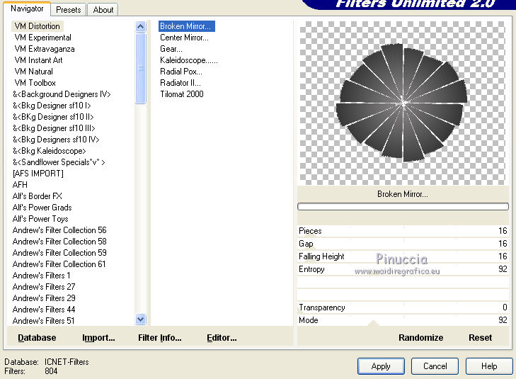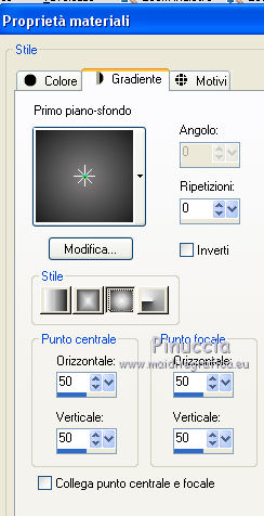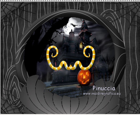 qui puoi trovare qualche risposta ai tuoi dubbi. Se l'argomento che ti interessa non è presente, ti prego di segnalarmelo. Questo tutorial è una creazione di ©Titoune e non può essere copiato su altri siti nè essere offerto per il download. Lo stesso vale per la mia traduzione. Il tutorial è stato creato con PSP X5, ma può essere eseguito anche con le altre versioni di PSP. Secondo la versione utilizzata (anteriore a PSP X) potresti ottenere dei risultati differenti. Vedi la mia scheda riguardante le funzioni Rifletti>Capovolgi in X4 e X5 qui Per tradure il tutorial ho usato PSP X. Occorrente: Un tube a scelta. Il resto del materiale qui Tube utilizzato "680551ketwomen391exclusiveTQT" di Ket. Filtri in caso di dubbi, ricorda di consultare la mia sezione filtri qui Filters Unlimited 2.0 qui VM Distortion - Broken Mirror qui Simple - Top Left Mirror qui Simple - Left Right Wrap qui Adjust - Variations qui Eye Candy 4000 - HSB Noise qui Animation Shop qui ![]() 1. Imposta il colore di primo piano con #838182, e il colore di sfondo con #1c1c1c. Passa il colore di primo piano a Gradiente, stile Sprazzo di luce. ![]() 2. Apri una nuova immagine trasparente 750 x 600 pixels. Selezione>Seleziona tutto. 3. Apri l'elemento ScrapTK_IB-ConettaKilmer-paper1 e vai a Modifica>Copia. Torna al tuo lavoro e vai a Modifica>Incolla nella selezione. Selezione>Deseleziona. 4. Apri l'elemento ScrapTK_IB-ConettaKilmer-frame1 e vai a Modifica>Copia. Torna al tuo lavoro e vai a Modifica>Incolla come nuovo livello. Non spostarlo. 5. Attiva lo strumento Bacchetta magica ![]() e clicca al centro della cornice per selezionarla. Selezione>Modifica>Espandi - 3 pixels. Livelli>Nuovo livello raster. Livelli>Disponi>Sposta giù. 6. Apri l'immagine wallpaper-61491 e vai a Modifica>Copia. Torna al tuo lavoro e vai a Modifica>Incolla nella selezione. Rinomina questo livello "animazione 1". Mantieni selezionato. 7. Livelli>Nuovo livello raster. Riempi la selezione con il gradiente.Selezione>Deseleziona. 8. Immagine>Ridimensiona, all'85%, tutti i livelli non selezionato. Effetti>Plugins>Filters Unlimited 2.0 - VM Distortion - Broken Mirror, con i settaggi standard. ![]() 9. Effetti>Effetti 3D>Sfalsa ombra, colore nero. ![]() Ripeti l'Effetto Sfalsa ombra, cambiando verticale e orizzontale con -3. 10. Effetti>Effetti di distorsione>Coordinate polari. ![]() Livelli>Disponi>Porta in alto. 11. Attiva lo strumento Selezione a mano libera ![]() e seleziona il motivo centrale. ![]() Modifica>Taglia (questo comando oltre a tagliare, tiene anche in memoria). Selezione>Deseleziona. Modifica>Incolla come nuovo livello. 12. Effetti>Effetti di immagine>Scostamento. ![]() Rinomina questo livello "animazione 2". 13. Attiva il livello dei due piccoli angoli. ![]() Livelli>Duplica. Immagine>Capovolgi. Livelli>Unisci>Unisci giù. Effetti>Effetti 3D>Sfalsa ombra, colore nero. ![]() 14. Attiva il livello superiore. Apri l'elemento ScrapTK_IB-ConettaKilmer-element10 e vai a Modifica>Copia. Torna al tuo lavoro e vai a Modifica>Incolla come nuovo livello. Spostalo nell'angolo in alto a sinistra.![]() Effetti>Plugins>Simple - Top Left Mirror. Effetti>Effetti 3D>Sfalsa ombra, con i settaggi precedenti. Porta questo livello sotto il livello "animazione 2". 15. Attiva nuovamente il livello superiore. Apri l'elemento ScrapTK_IB-ConettaKilmer-element3a e vai a Modifica>Copia. Torna al tuo lavoro e vai a Modifica>Incolla come nuovo livello. Non spostarlo. 16. Effetti>Effetti di riflesso>Specchio rotante. ![]() Avrai questo ![]() Effetti>Plugins>Simple - Left Right Wrap. Sposta l'elemento in basso.![]() Effetti>Effetti 3D>Sfalsa ombra, con i settaggi precedenti. 17. Apri l'elemento ScrapTK_IB-ConettaKilmer-element4 e vai a Modifica>Copia. Torna al tuo lavoro e vai a Modifica>Incolla come nuovo livello. Sposta il pannello a destra.Vedi l'esempio finale. Effetti>Effetti 3D>Sfalsa ombra, con i settaggi precedenti. 18. Apri l'elemento titoune_wordart_happy_halloween e vai a Modifica>Copia. Torna al tuo lavoro e vai a Modifica>Incolla come nuovo livello. Spostalo sul pannello.Vedi l'esempio finale. Effetti>Effetti 3D>Sfalsa ombra, con i settaggi precedenti. 19. Apri l'elemento ScrapTK_IB-ConettaKilmer-element6 e vai a Modifica>Copia. Torna al tuo lavoro e vai a Modifica>Incolla come nuovo livello. Sposta in alto a destra.![]() Effetti>Effetti 3D>Sfalsa ombra, con i settaggi precedenti. Livelli>Duplica. Immagine>Rifletti. 20. Apri l'elemento ScrapTK_IB-ConettaKilmer-element7 e vai a Modifica>Copia. Torna al tuo lavoro e vai a Modifica>Incolla come nuovo livello. Sposta l'elemento a destra.Vedi l'esempio finale. Effetti>Effetti 3D>Sfalsa ombra, con i settaggi precedenti. 21. Apri l'elemento ScrapTK_IB-ConettaKilmer-element8 e vai a Modifica>Copia. Torna al tuo lavoro e vai a Modifica>Incolla come nuovo livello. Spostalo in alto a sinistra.![]() Effetti>Effetti 3D>Sfalsa ombra, con i settaggi precedenti. 22. Apri l'elemento pumpkins e vai a Modifica>Copia. Torna al tuo lavoro e vai a Modifica>Incolla come nuovo livello. Spostalo in basso a sinistra.Vedi l'esempio finale. Niente Sfalsa ombra. 23. Apri l'elemento black_cat e vai a Modifica>Copia. Torna al tuo lavoro e vai a Modifica>Incolla come nuovo livello. Spostalo in basso.Vedi l'esempio finale. Effetti>Effetti 3D>Sfalsa ombra, con i settaggi precedenti. 24. Apri l'elemento ScrapTK_IB-ConettaKilmer-element11 e vai a Modifica>Copia. Torna al tuo lavoro e vai a Modifica>Incolla come nuovo livello. Immagine>Rifletti. Spostalo in basso.![]() Effetti>Effetti 3D>Sfalsa ombra, con i settaggi precedenti. 25. Apri il tuo tube e vai a Modifica>Copia. Torna al tuo lavoro e vai a Modifica>Incolla come nuovo livello. Immagine>Ridimensiona, se e quanto necessario, tutti i livelli non selezionato. Sposta il tube dove preferisci,o vedi il mio esempio. Effetti>Effetti 3D>Sfalsa ombra, con i settaggi precedenti. 26. Attiva il livello Raster 1. Selezione>Seleziona tutto. Immagine>Ritaglia la selezione. Livelli>Duplica. Live