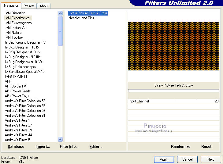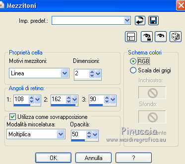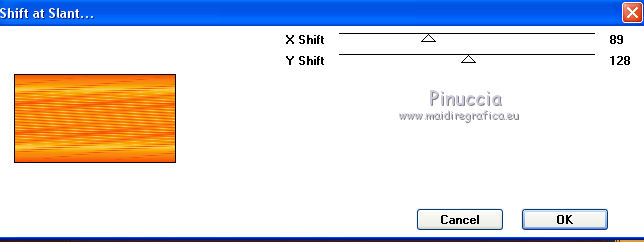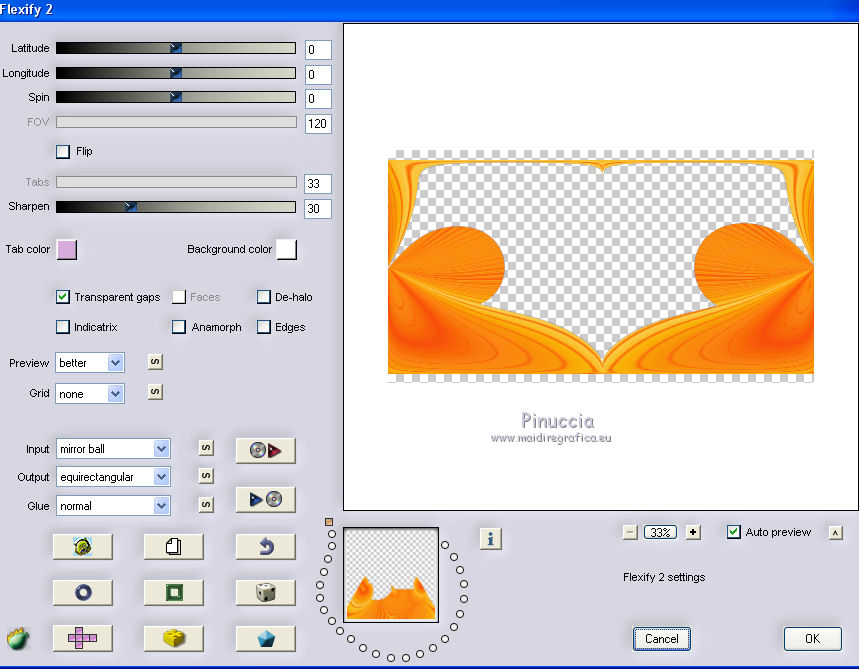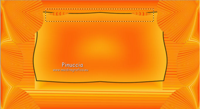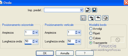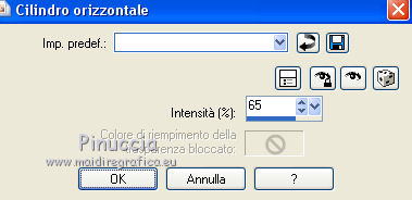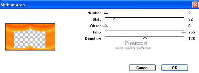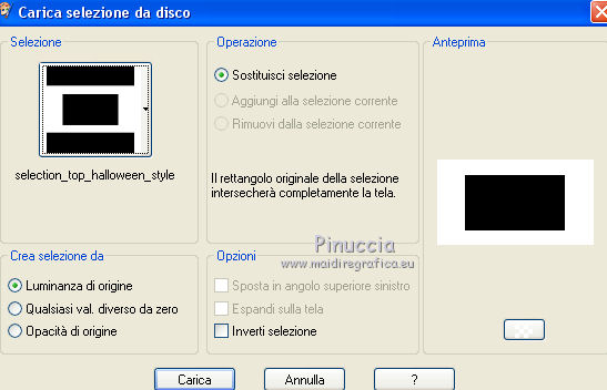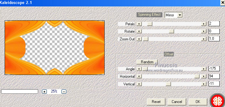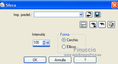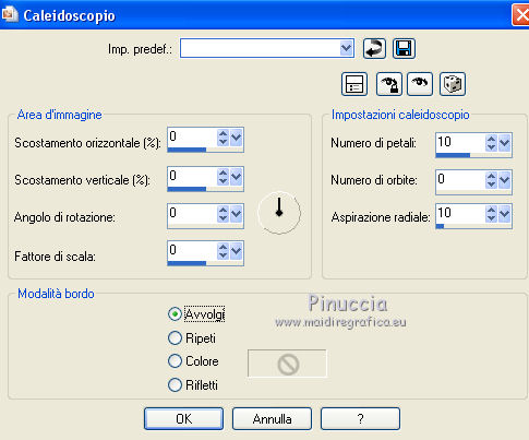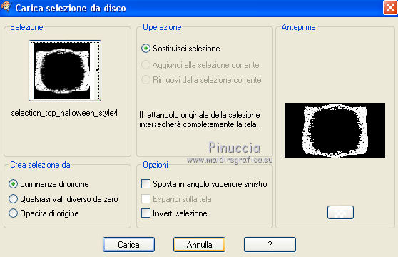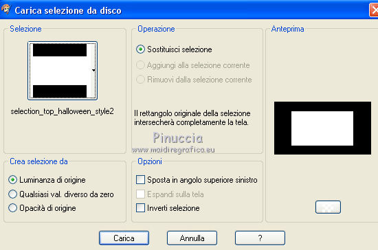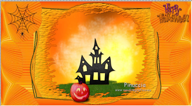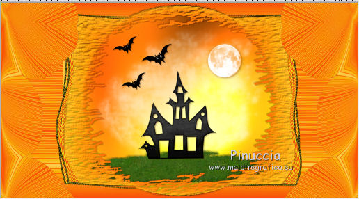 qui puoi trovare qualche risposta ai tuoi dubbi. Se l'argomento che ti interessa non è presente, ti prego di segnalarmelo. Questo tutorial è una creazione di ©Titoune e non può essere copiato su altri siti nè essere offerto per il download. Lo stesso vale per la mia traduzione. Il tutorial è stato creato con PSP X5, ma può essere eseguito anche con le altre versioni di PSP. Secondo la versione utilizzata (anteriore a PSP X) potresti ottenere dei risultati differenti. Vedi la mia scheda riguardante le funzioni Rifletti>Capovolgi in X4, X5 e X6 qui Per tradure il tutorial ho usato PSP X. Occorrente: Un tube a scelta. Il resto del materiale qui Gli elementi scrap utilizzati sono una creazione http://designsbyvaybs.blogspot.it/ Designs By Vaybs Filtri in caso di dubbi, ricorda di consultare la mia sezione filtri qui Mura's Seamless - Shift at Slant, Shift at Arch qui Flaming Pear - Flexify 2 qui Filters Unlimited 2.0 qui VM Experimental - Every picture tells a story qui Mehdi - Kaleidoscope 2.1 qui Graphics Plus - Cross Shadow qui I filtri Mura's Seamless, VM Experimental e Graphics Plus si possono usare da soli o importati in Filters Unlimited (come fare vedi qui) Se un filtro fornito appare con questa icona ![]() Metti il gradiente nella cartella Gradienti. Metti le selezioni nella cartella Selezioni. Apri la maschera in PSP e minimizzala con il resto del materiale. 1. Passa il colore di primo piano a Gradiente, e seleziona il gradiente "js-gradient-sunset_406, stile Rettangolare. ![]() 2. Apri una nuova immagine trasparente 1280 x 700 pixels, e riempila con il gradiente.3. Selezione>Carica/Salva selezione>Carica selezione da disco. Cerca e carica la selezione "top_halloween_style". ![]() 4. Effetti>Plugins>Mura's Seamless - Shift at slant. ![]() Selezione>Innalza selezione a livello. Selezione>Deseleziona. 5. Effetti>Plugins>Mura's Seamless - Shift at arch, con i settaggi standard. ![]() Immagine>Capovolgi. 6. Effetti>Plugins>Flaming Pear - Flexify 2. ![]() 7. Attiva il livello Raster 1. Selezione>Carica/Salva selezione>Carica selezione da disco. Cerca e carica la selezione "top_halloween_style2". ![]() Selezione>Innalza selezione a livello. Regola>Sfocatura>Sfocatura gaussiana - raggio 45. ![]() Livelli>Duplica. 8. Effetti>Plugins>Filter Unlimited 2 - VM Experimental - Every Picture Tells A Story, con i settaggi standard. ![]() Selezione>Modifica>Contrai - 5 pixels. ![]() Premi sulla tastiera il tasto CANC ![]() Selezione>Deseleziona. Livelli>Unisci>Unisci giù. 9. Effetti>Effetti di distorsione>Onda. ![]() 10. Effetti>Effetti di riflesso>Specchio rotante. ![]() 11. Effetti>Effetti di immagine>Scostamento. ![]() Rinomina questo livello "quadro centrale". 12. Attiva il livello superiore. Effetti>Plugins>Mehdi - Kaleidoscope 2.1. ![]() 13. Effetti>Effetti di riflesso>Caleidoscopio. ![]() 14. Effetti>Effetti geometrici>Cilindro verticale. ![]() Effetti>Plugins>Mura's Seamless - Shift at arch, con i settaggi precedenti. 15. Attiva lo strumento Selezione , rettangolo,e seleziona le due piccole losanghe. ![]() Premi sulla tastiera il tasto CANC. Attiva nuovamente il livello "quadro centrale". Modifica>Taglia (questo comando oltre a tagliare tiene anche in memoria). Modifica>Incolla come nuovo livello. Elimina il livello sottostante rimasto vuoto. ![]() Eliminando un livello si rimane posizionati su quello sottostante. Non dimenticare di ritornare sul livello soprastante. ![]() 16. Effetti>Effetti geometrici>Cilindro orizzontale. ![]() 17. Effetti>Effetti geometrici>Sfera. ![]() Rinomina questo livello "Sfera". 18. Selezione>Carica/Salva selezione>Carica selezione da disco. Cerca e carica la selezione "top_halloween_style3". ![]() 19. Effetti>Effetti artistici>Mezzitoni. ![]() Effetti>Effetti di bordo>Aumenta. 20. Effetti>Effetti 3D>Sfalsa ombra, colore #441604. ![]() Selezione>Innalza selezione a livello. Rinomina questo livello "bordo". Selezione>Deseleziona. 21. Effetti>Effetti di distorsione>Onda, con i settaggi precedenti. Attiva nuovamente il livello "Sfera". 22. Selezione>Carica/Salva selezione>Carica selezione da disco. Cerca e carica la selezione "top_halloween_style4". ![]() Selezione>Innalza selezione a livello. 23. Effetti>Effetti di trama>Trama - seleziona la trama Carta standard con i seguenti settaggi. ![]() Selezione>Deseleziona. 24. Effetti>Effetti 3D>Sfalsa ombra, colore 441604. ![]() Ripeti l'Effetto Sfalsa ombra, cambiando verticale e orizzontale con -3. 25. Attiva nuovamente il livello "sfera". Effetti>Plugins>Graphics Plus - Cross Shadow, con i settaggi standard. ![]() 26. Apri l'elemento DBV_HMelement (42) e vai a Modifica>Copia. Torna al tuo lavoro e vai a Modifica>Incolla come nuovo livello. Non spostarlo. 27. Apri l'elemento DBV_HMelement (11) e vai a Modifica>Copia. Torna al tuo lavoro e vai a Modifica>Incolla come nuovo livello. Spostalo in basso.![]() Effetti>Effetti 3D>Sfalsa ombra, colore #441604. ![]() 28. Attiva il livello superiore. Apri l'elemento DBV_HMelement (12) e vai a Modifica>Copia. Torna al tuo lavoro e vai a Modifica>Incolla come nuovo livello. Spostalo sull'erba.![]() Effetti>Effetti 3D>Sfalsa ombra, con i settaggi precedenti. 29. Apri l'elemento DBV_HMelement (41) e vai a Modifica>Copia. Torna al tuo lavoro e vai a Modifica>Incolla come nuovo livello. Spostalo in alto a destra.vedi l'esempio finale. Effetti>Effetti 3D>Sfalsa ombra, con i settaggi precedenti. 30. Apri l'elemento DBV_HMelement (3) e vai a Modifica>Copia. Torna al tuo lavoro e vai a Modifica>Incolla come nuovo livello. Spostalo in alto a sinistra.![]() Effetti>Effetti 3D>Sfalsa ombra, con i settaggi precedenti. 31. Apri l'elemento DBV_HMelement (38) e vai a Modifica>Copia. Torna al tuo lavoro e vai a Modifica>Incolla come nuovo livello. Spostalo nell'angolo in alto a sinistra.vedi l'esempio finale. Effetti>Effetti 3D>Sfalsa ombra, con i settaggi precedenti. 32. Apri l'elemento DBV_HMelement (30) e vai a Modifica>Copia. Torna al tuo lavoro e vai a Modifica>Incolla come nuovo live