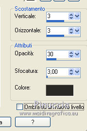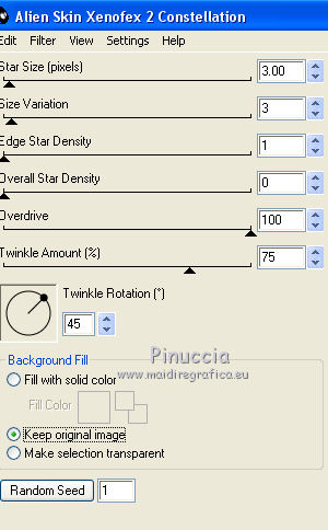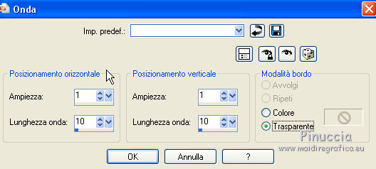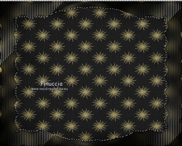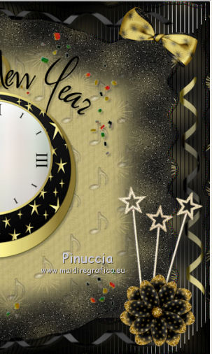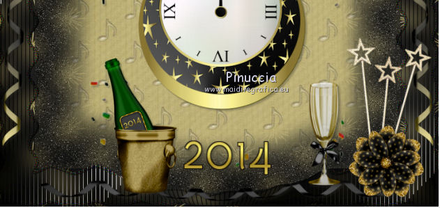 qui puoi trovare qualche risposta ai tuoi dubbi. Se l'argomento che ti interessa non è presente, ti prego di segnalarmelo. Questo tutorial è una creazione di ©Titoune e non può essere copiato su altri siti nè essere offerto per il download. Lo stesso vale per la mia traduzione. Il tutorial è stato creato con PSP X5, ma può essere eseguito anche con le altre versioni di PSP. Secondo la versione utilizzata (anteriore a PSP X) potresti ottenere dei risultati differenti. Vedi la mia scheda riguardante le funzioni Rifletti>Capovolgi in X4 e X5 qui Per tradure il tutorial ho usato PSP X. Occorrente: Un tube a scelta. Il resto del materiale qui Il tube utilizzato è di Joanie Filtri in caso di dubbi, ricorda di consultare la mia sezione filtri qui Tramages - Tow the line qui Alien Skin Eye Xenofex 2.0 - Constellation qui Graphics Plus - Cross Shadow qui Filters Unlimited 2.0 qui I filtri Tramages e Graphics Plus si possono usare da soli o importati in Filters Unlimited (come fare vedi qui) Se un filtro fornito appare con questa icona Animation Shop qui ![]() 1. Apri una nuova immagine trasparente 750 x 600 pixels. Selezione>Seleziona tutto. 2. Apri l'elemento Paper 3 e vai a Modifica>Copia. Torna al tuo lavoro e vai a Modifica>Incolla nella selezione. 3. Selezione>Modifica>Contrai - 65 pixels. Selezione>Inverti. Selezione>Innalza selezione a livello. 4. Effetti>Effetti di distorsione>Onda. ![]() Regola>Sfocatura>Sfocatura gaussiana - raggio 15. ![]() 5. Effetti>Plugins>Tramages - Tow the line, con i settaggi standard. ![]() 6. Selezione>Modifica>Seleziona bordature selezione. ![]() Selezione>Innalza selezione a livello. 7. Effetti>Effetti artistici>Mezzitoni. ![]() 8. Effetti>Effetti 3D>Smusso a incasso. ![]() Selezione>Deseleziona. Livelli>Unisci>Unisci giù. 9. Effetti>Effetti geometrici>Sfera. ![]() 10. Effetti>Plugins>Graphics Plus - Cross Shadow, con i settaggi standard. ![]() Rinomina questo livello "animazione". 11. Attiva lo strumento Bacchetta magica ,e clicca al centro della cornice per selezionarla. ![]() Selezione>Modifica>Contrai - 65 pixels. Selezione>Modifica>Sfuma - 45 pixels. Selezione>Inverti. 12. Attiva il livello Raster 1. Selezione>Innalza selezione a livello. Regola>Sfocatura>Sfocatura gaussiana - raggio 15. ![]() 13. Regola>Aggiungi/Rimuovi disturbo>Aggiungi disturbo. ![]() Selezione>Deseleziona. Attiva il livello della cornice "animazione". 14. Effetti>Effetti 3D>Sfalsa ombra, colore #2a2924. ![]() Ripeti l'Effetto Sfalsa ombra, cambiando verticale e orizzontale con -3. 15. Attiva il livello Raster 1, e premi sulla tastiera il tasto CANC ![]() 16. Selezione>Seleziona tutto. Apri l'elemento Paper 1 e vai a Modifica>Copia. Torna al tuo lavoro e vai a Modifica>Incolla nella selezione. Selezione>Deseleziona. 17. Attiva il livello superiore. Apri l'elemento confettis e vai a Modifica>Copia. Torna al tuo lavoro e vai a Modifica>Incolla come nuovo livello. Livelli>Disponi>Sposta giù. Effetti>Effetti 3D>Sfalsa ombra, colore #2a2924. ![]() 18. Attiva nuovamente il livello superiore. Apri l'elemento clock e vai a Modifica>Copia. Torna al tuo lavoro e vai a Modifica>Incolla come nuovo livello. Spostalo un po' più in alto.Vedi l'esempio finale. Effetti>Effetti 3D>Sfalsa ombra, con i settaggi precedenti. 19. Apri l'elemento Black Streamer e vai a Modifica>Copia. Torna al tuo lavoro e vai a Modifica>Incolla come nuovo livello. Spostalo nella parte inferiore.Vedi l'esempio finale. Livelli>Duplica. Immagine>Capovolgi. Livelli>Unisci>Unisci giù. 20. Effetti>Effetti geometrici>Sfera. ![]() Effetti>Effetti 3D>Sfalsa ombra, con i settaggi precedenti. 21. Apri l'elemento Flower e vai a Modifica>Copia. Torna al tuo lavoro e vai a Modifica>Incolla come nuovo livello. Spostalo in alto a sinistra.Vedi l'esempio finale. Effetti>Effetti 3D>Sfalsa ombra, con i settaggi precedenti. 22. Apri l'elemento Gradient Streamer e vai a Modifica>Copia. Torna al tuo lavoro e vai a Modifica>Incolla come nuovo livello. Spostalo a sinistra.Vedi l'esempio finale. 23. Effetti>Effetti di riflesso>Specchio rotante. ![]() Effetti>Effetti 3D>Sfalsa ombra, con i settaggi precedenti. 24. Apri l'elemento Princess Bow e vai a Modifica>Copia. Torna al tuo lavoro e vai a Modifica>Incolla come nuovo livello. Spostalo in alto a destra.Vedi l'esempio finale. Effetti>Effetti 3D>Sfalsa ombra, con i settaggi precedenti. 25. Apri l'elemento 3_Stars e vai a Modifica>Copia. Torna al tuo lavoro e vai a Modifica>Incolla come nuovo livello. Spostalo in basso a destra.Vedi l'esempio finale. Effetti>Effetti 3D>Sfalsa ombra, con i settaggi precedenti. 26. Apri l'elemento Glitter Flower e vai a Modifica>Copia. Torna al tuo lavoro e vai a Modifica>Incolla come nuovo livello. Spostalo in basso a destra, sotto l'elemento precedente.![]() Effetti>Effetti 3D>Sfalsa ombra, con i settaggi precedenti. 27. Apri l'elemento Champagne Glass e vai a Modifica>Copia. Torna al tuo lavoro e vai a Modifica>Incolla come nuovo livello. Spostalo in basso.Vedi l'esempio finale. Effetti>Effetti 3D>Sfalsa ombra, con i settaggi precedenti. 28. Apri l'elemento wordart2014 e vai a Modifica>Copia. Torna al tuo lavoro e vai a Modifica>Incolla come nuovo livello. Spostalo in basso al centro.Vedi l'esempio finale. Effetti>Effetti 3D>Sfalsa ombra, con i settaggi precedenti. 29. Apri l'elemento champain_bottle e vai a Modifica>Copia. Torna al tuo lavoro e vai a Modifica>Incolla come nuovo livello. Spostalo in basso a sinistra.![]() Effetti>Effetti 3D>Sfalsa ombra, con i settaggi precedenti. 30. Apri il tuo tube e vai a Modifica>Copia. Torna al tuo lavoro e vai a Modifica>Incolla come nuovo livello. Immagine>Ridimensiona, se e quanto necessario, tutti i livelli non selezionato. Regola>Messa a fuoco>Metti a fuoco. Spostalo dove preferisci,o vedi il mio esempio. Effetti>Effetti 3D>Sfalsa ombra, con i settaggi precedenti. 31. Attiva il livello inferiore. Selezione>Seleziona tutto. Immagine>Ritaglia la selezione. Immagine>Dimensioni tela - 800 x 650 pixels. ![]() 32. 