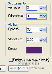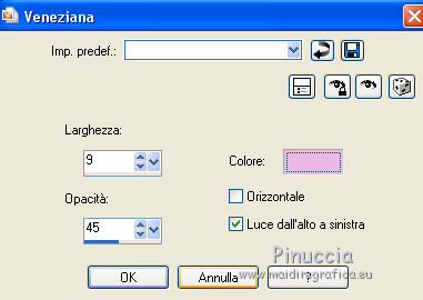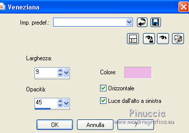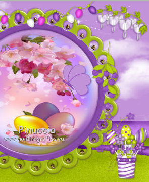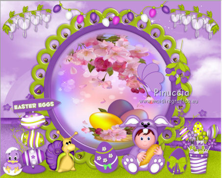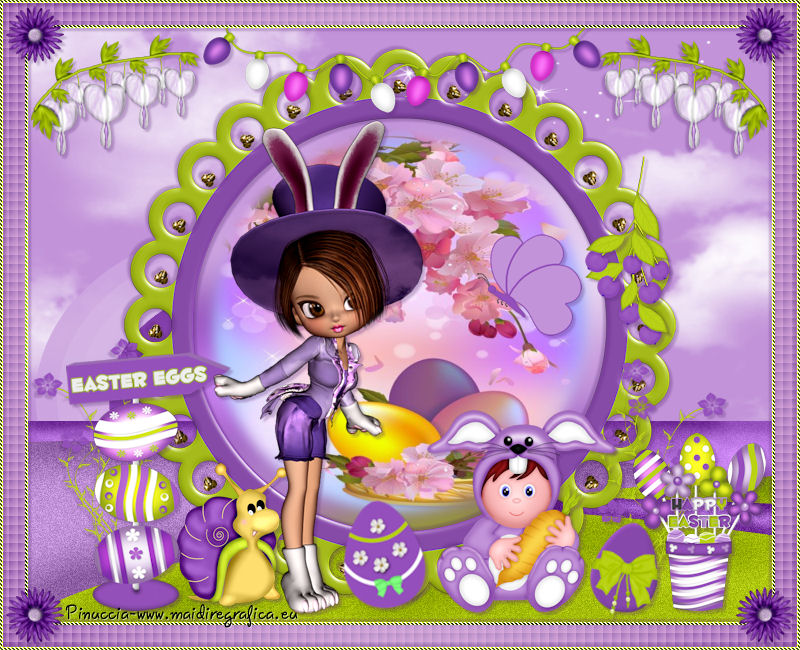 qui puoi trovare qualche risposta ai tuoi dubbi. Se l'argomento che ti interessa non è presente, ti prego di segnalarmelo. Questo tutorial è una creazione di ©Titoune e non può essere copiato su altri siti nè essere offerto per il download. Lo stesso vale per la mia traduzione. Il tutorial è stato creato con PSP X5, ma può essere eseguito anche con le altre versioni di PSP. Secondo la versione utilizzata (anteriore a PSP X) potresti ottenere dei risultati differenti. Dalla versione X4, il comando Immagine>Rifletti è stato sostituito con Immagine>Capovolgi in orizzontale, e il comando Immagine>Capovolgi con Immagine>Capovolgi in verticale. Nelle versioni X5 e X6, le funzioni sono state migliorate rendendo disponibile il menu Oggetti. Con il nuovo X7 sono tornati i comandi Rifletti/Capovolgi, ma con nuove differenze. Vedi la scheda sull'argomento qui Per tradurre il tutorial ho usato PSP X. Occorrente: Un tube a scelta. Il resto del materiale qui Filtri in caso di dubbi, ricorda di consultare la mia sezione filtri qui Filters Unlimited 2.0 qui Graphics Plus - Cross Shadow qui Simple - Top Left Mirror qui Penta.com - Jeans qui I filtri Graphics Plus, Penta.com e Simple si possono usare da soli o importati in Filters Unlimited (come fare vedi qui) Se un filtro fornito appare con questa icona ![]() 1. Apri una nuova immagine trasparente 750 x 600 pixels. Selezione>Seleziona tutto. 2. Apri l'elemento Backtound e vai a Modifica>Copia. Torna al tuo lavoro e vai a Modifica>Incolla nella selezione. Selezione>Deseleziona. 3. Apri l'elemento Frame-03.png e vai a Modifica>Copia. Torna al tuo lavoro e vai a Modifica>Incolla come nuovo livello. Non spostarlo. 4. Attiva lo strumento Bacchetta magica ![]() e clicca al centro della cornice per selezionarla. Selezione>Modifica>Espandi - 5 pixels. 5. Attiva il livello del paesaggio. Regola>Sfocatura>Sfocatura gaussiana - raggio 25. ![]() Selezione>Deseleziona. 6. Apri l'elemento Floral Easter, e vai a Modifica>Copia. Torna al tuo lavoro e vai a Modifica>Incolla come nuovo livello. 7. Attiva il livello della cornice. Effetti>Effetti 3D>Sfalsa ombra, colore #562571. ![]() Ripeti l'Effetto Sfalsa ombra, cambiando verticale e orizzontale con -3. 8. Apri l'elemento Light-01, e vai a Modifica>Copia. Torna al tuo lavoro e vai a Modifica>Incolla come nuovo livello. Spostalo nella parte superiore della cornice.Vedi l'esempio finale. Effetti>Effetti 3D>Sfalsa ombra, colore #562571. ![]() 9. Apri l'elemento Flower-01, e vai a Modifica>Copia. Torna al tuo lavoro e vai a Modifica>Incolla come nuovo livello. Spostalo in alto a sinistra.Vedi l'esempio finale. Effetti>Effetti 3D>Sfalsa ombra, con i settaggi precedenti. Livelli>Duplica. Immagine>Rifletti. 10. Apri l'elemento Ferry, e vai a Modifica>Copia. Torna al tuo lavoro e vai a Modifica>Incolla come nuovo livello. Spostalo nella parte destra della cornice.![]() Effetti>Effetti 3D>Sfalsa ombra, con i settaggi precedenti. 11. Apri l'elemento Flower-09, e vai a Modifica>Copia. Torna al tuo lavoro e vai a Modifica>Incolla come nuovo livello. Spostalo nella parte inferiore destra della cornice.Vedi l'esempio finale. Effetti>Effetti 3D>Sfalsa ombra, con i settaggi precedenti. Livelli>Duplica. Immagine>Rifletti. 12. Apri l'elemento Schmetterling-01, e vai a Modifica>Copia. Torna al tuo lavoro e vai a Modifica>Incolla come nuovo livello. Spostalo nel paesaggio e dove preferisci.Effetti>Effetti 3D>Sfalsa ombra, con i settaggi precedenti. 13. Apri l'elemento Happy Easter, e vai a Modifica>Copia. Torna al tuo lavoro e vai a Modifica>Incolla come nuovo livello. Spostalo nella parte inferiore destra della cornice.![]() Effetti>Effetti 3D>Sfalsa ombra, con i settaggi precedenti. 14. Apri l'elemento Baby-01, e vai a Modifica>Copia. Torna al tuo lavoro e vai a Modifica>Incolla come nuovo livello. Spostalo nella parte inferiore destra della cornice.Vedi l'esempio finale. Effetti>Effetti 3D>Sfalsa ombra, con i settaggi precedenti. 15. Apri l'elemento Egg-15, e vai a Modifica>Copia. Torna al tuo lavoro e vai a Modifica>Incolla come nuovo livello. Spostalo nella parte inferiore della cornice.Vedi l'esempio finale. Effetti>Effetti 3D>Sfalsa ombra, con i settaggi precedenti. 16. Apri l'elemento Egg-11, e vai a Modifica>Copia. Torna al tuo lavoro e vai a Modifica>Incolla come nuovo livello. Spostalo nella parte inferiore della cornice.Vedi l'esempio finale. Effetti>Effetti 3D>Sfalsa ombra, con i settaggi precedenti. 17. Apri l'elemento Schnecke, e vai a Modifica>Copia. Torna al tuo lavoro e vai a Modifica>Incolla come nuovo livello. Spostalo nella parte inferiore della cornice.Vedi l'esempio finale. Effetti>Effetti 3D>Sfalsa ombra, con i settaggi precedenti. 18. Apri l'elemento Eastereggs, e vai a Modifica>Copia. Torna al tuo lavoro e vai a Modifica>Incolla come nuovo livello. Spostalo in basso a sinistra.Vedi l'esempio finale. Effetti>Effetti 3D>Sfalsa ombra, con i settaggi precedenti. 19. Apri l'elemento Chicken-03, e vai a Modifica>Copia. Torna al tuo lavoro e vai a Modifica>Incolla come nuovo livello. Spostalo nell'angolo in basso a sinistra.![]() Effetti>Effetti 3D>Sfalsa ombra, con i settaggi precedenti. 20. Apri il tuo tube, e vai a Modifica>Copia. Torna al tuo lavoro e vai a Modifica>Incolla come nuovo livello. Immagine>Ridimensiona, se e quanto necessario, tutti i livelli non selezionato. Spostalo dove preferisci o vedi il mio esempio.Effetti>Effetti 3D>Sfalsa ombra, con i settaggi precedenti. 21. Attiva il livello superiore. Livelli>Nuovo livello raster. Imposta il colore di primo piano con #a6bb1d, e riempi il livello con questo colore.Effetti>Plugins>Graphics Plus - Cross Shadow. ![]() 22. Selezione>Seleziona tutto. Selezione>Modifica>Contrai - 3 pixels. Premi sulla tastiera il tasto CANC ![]() Selezione>Deseleziona. 23. Effetti>Plugins>Penta.com - Jeans, con i settaggi precedenti. ![]() Effetti>Effetti di bordo>Aumenta. Effetti>Effetti 3D>Sfalsa ombra, colore #562571. ![]() Ripeti l'Effetto Sfalsa ombra, cambiando vertic