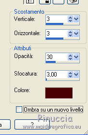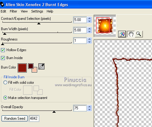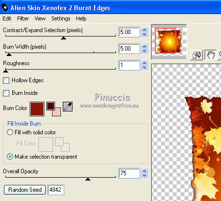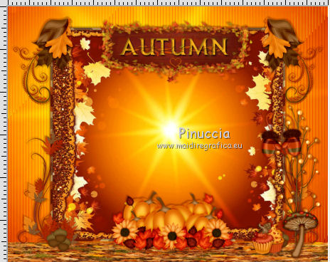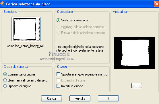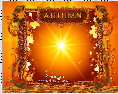 qui puoi trovare qualche risposta ai tuoi dubbi. Se l'argomento che ti interessa non è presente, ti prego di segnalarmelo. Questo tutorial è una creazione di ©Titoune e non può essere copiato su altri siti nè essere offerto per il download. Lo stesso vale per la mia traduzione. Il tutorial è stato creato con Corel17, ma può essere eseguito anche con le altre versioni di PSP. Secondo la versione utilizzata (anteriore a PSP X) potresti ottenere dei risultati differenti. Dalla versione X4, il comando Immagine>Rifletti è stato sostituito con Immagine>Capovolgi in orizzontale, e il comando Immagine>Capovolgi con Immagine>Capovolgi in verticale. Nelle versioni X5 e X6, le funzioni sono state migliorate rendendo disponibile il menu Oggetti. Con il nuovo X7 sono tornati i comandi Rifletti/Capovolgi, ma con nuove differenze. Vedi la scheda sull'argomento qui Per tradurre il tutorial ho usato PSP X. Occorrente: Un tube a scelta. Il resto del materiale qui Filtri in caso di dubbi, ricorda di consultare la mia sezione filtri qui Tramage - Tow the line qui Alien Skin Xenofex 2 - Burnt Edges qui ![]() Metti la trama nella cartella Trame. Metti la selezione nella cartella Selezioni. 1. Apri una nuova immagine trasparente 750 x 600 pixels. 2. Selezione>Seleziona tutto. Apri l'elemento tuile, e vai a Modifica>Copia. Torna al tuo lavoro e vai a Modifica>Incolla nella selezione. Selezione>Deseleziona. Livelli>Duplica. Effetti>Plugins>Tramages - Tow the line, con i settaggi standard. ![]() Cambia la modalità di miscelatura di questo livello in Luce diffusa. Rinomina questo livello "tow the line". 3. Apri l'elemento leaves_floor, e vai a Modifica>Copia. Torna al tuo lavoro e vai a Modifica>Incolla come nuovo livello. Spostalo in basso.Vedi l'esempio finale. 4. Attiva lo strumento Selezione ![]() (non importa il tipo di selezione impostato, perchè con la selezione personalizzata si ottiene sempre un rettangolo) clicca sull'icona Selezione personalizzata ![]() e imposta i seguenti settaggi. ![]() Livelli>Nuovo livello raster. Livelli>Disponi>Sposta giù. 5. Apri l'elemento MC_OSBT_HappyFall_P02, e vai a Modifica>Copia. Torna al tuo lavoro e vai a Modifica>Incolla nella selezione. Rinomina questo livello "HappyFall-P02". 6. Selezione>Modifica>Seleziona bordature selezione. ![]() 7. Livelli>Nuovo livello raster. Apri l'elemento MC_OSBT_HappyFall_P03, e vai a Modifica>Copia. Torna al tuo lavoro e vai a Modifica>Incolla nella selezione. 8. Effetti>Effetti 3D>Smusso a incasso. ![]() 9. Effetti>Effetti 3D>Sfalsa ombra, colore #4a0200. ![]() Ripeti l'Effetto Sfalsa ombra, cambiando verticale e orizzontale con -3. Selezione>Deseleziona. 10. Attiva il livello "HappyFall_P02" (il terzo dall'alto). Selezione>Carica/Salva selezione>Carica selezione da disco. Cerca e carica la selezione "selection_scrap_happy_fall". ![]() 11. Livelli>Nuovo livello raster. Apri l'elemento Fall_Style_Background, e vai a Modifica>Copia. Torna al tuo lavoro e vai a Modifica>Incolla nella selezione. Selezione>Deseleziona. 12. Effetti>Plugins>Alien Skin Xenofex 2 - Burnt Edges - colore #8a1509. ![]() Livelli>Duplica. 13. Effetti>Plugins>Alien Skin Xenofex 2 - Burnt Edges. ![]() 14. Attiva nuovamente il livello superiore. Apri l'elemento dani3dautumnbanner, e vai a Modifica>Copia. Torna al tuo lavoro e vai a Modifica>Incolla come nuovo livello. Spostalo nella parte superiore della cornice.Vedi l'esempio finale. Effetti>Effetti 3D>Sfalsa ombra, con i settaggi precedenti. 15. Apri l'elemento MC_OSBT_HappyFall_E11, e vai a Modifica>Copia. Torna al tuo lavoro e vai a Modifica>Incolla come nuovo livello. Spostalo nella parte superiore sinistra della cornice.Vedi l'esempio finale. Effetti>Effetti 3D>Sfalsa ombra, con i settaggi precedenti. Livelli>Duplica. Immagine>Rifletti. 16. Apri l'elemento MC_OSBT_HappyFall_E12, e vai a Modifica>Copia. Torna al tuo lavoro e vai a Modifica>Incolla come nuovo livello. Spostalo nella parte inferiore sinistra della cornice.Vedi l'esempio finale. Effetti>Effetti 3D>Sfalsa ombra, con i settaggi precedenti. Livelli>Duplica. Immagine>Rifletti. 17. Apri l'elemento MC_OSBT_HappyFall_E16, e vai a Modifica>Copia. Torna al tuo lavoro e vai a Modifica>Incolla come nuovo livello. Spostalo in basso a destra.![]() Effetti>Effetti 3D>Sfalsa ombra, con i settaggi precedenti. 19. Apri l'elemento MC_OSBT_HappyFall_E03, e vai a Modifica>Copia. Torna al tuo lavoro e vai a Modifica>Incolla come nuovo livello. Spostalo nella parte superiore destra della cornice.Vedi l'esempio finale. Effetti>Effetti 3D>Sfalsa ombra, con i settaggi precedenti. 21. Apri l'elemento MC_OSBT_HappyFall_E09, e vai a Modifica>Copia. Torna al tuo lavoro e vai a Modifica>Incolla come nuovo livello. Spostalo nella parte inferiore destra della cornice.Vedi l'esempio finale. Effetti>Effetti 3D>Sfalsa ombra, con i settaggi precedenti. 22. Apri l'elemento MC_OSBT_HappyFall_E08, e vai a Modifica>Copia. Torna al tuo lavoro e vai a Modifica>Incolla come nuovo livello. Spostalo nella parte inferiore della cornice.Vedi l'esempio finale. Effetti>Effetti 3D>Sfalsa ombra, con i settaggi precedenti. 23. Apri l'elemento MC_OSBT_HappyFall_E07, e vai a Modifica>Copia. Torna al tuo lavoro e vai a Modifica>Incolla come nuovo livello. Spostalo nella parte inferiore della cornice.Vedi l'esempio finale. Effetti>Effetti 3D>Sfalsa ombra, con i settaggi precedenti. 24. Apri l'elemento MC_OSBT_HappyFall_E10, e vai a Modifica>Copia. Torna al tuo lavoro e vai a Modifica>Incolla come nuovo livello. Spostalo nella parte inferiore della cornice.![]() Effetti>Effetti 3D>Sfalsa ombra, con i settaggi precedenti. 25. Apri l'elemento MC_OSBT_HappyFall_E05, e vai a Modifica>Copia. Torna al tuo lavoro e vai a Modifica>Incolla come nuovo livello. Spostalo nella parte inferiore della cornice.Vedi l'esempio finale. Effetti>Effetti 3D>Sfalsa ombra, con i settaggi precedenti. 26. Apri l'elemento MC_OSBT_HappyFall_E02, e vai a Modifica>Copia. Torna al tuo lavoro e vai a Modifica>Incolla come nuovo 