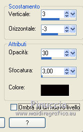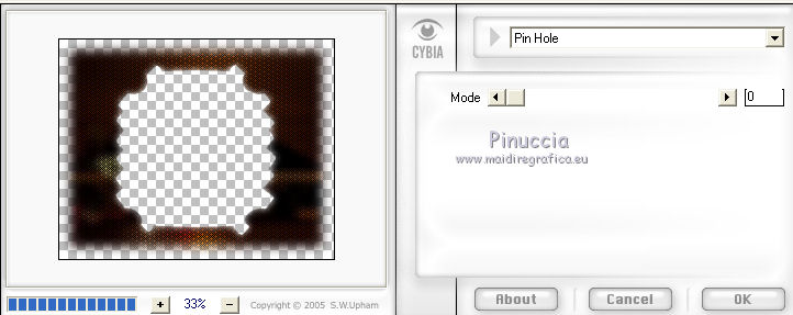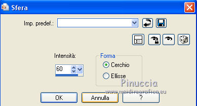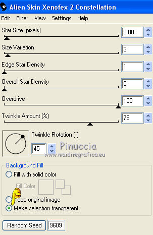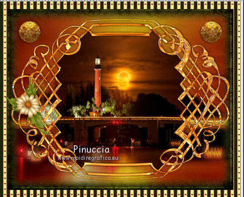 qui puoi trovare qualche risposta ai tuoi dubbi. Se l'argomento che ti interessa non è presente, ti prego di segnalarmelo. Questo tutorial è una creazione di ©Titoune e non può essere copiato su altri siti nè essere offerto per il download. Lo stesso vale per la mia traduzione. Il tutorial è stato creato con PSP X5, ma può essere eseguito anche con le altre versioni di PSP. Secondo la versione utilizzata (anteriore a PSP X) potresti ottenere dei risultati differenti. Vedi la mia scheda riguardante le funzioni Rifletti>Capovolgi in X4 e X5 qui Per tradure il tutorial ho usato PSP X. Occorrente: Un tube a scelta. Il resto del materiale qui Il tube utilizzato è di Anna Br Filtri Cybia - Screenworks qui Alien Skin Xenofex 2.0 - Constellation qui Animation Shop qui ![]() Metti la selezione nella cartella Selezioni. 1. Apri una nuova immagine trasparente 750 x 600 pixels. Selezione>Seleziona tutto. 2. Apri l'elemento SLR_Honeymoon_paper14 e vai a Modifica>Copia. Torna al tuo lavoro e vai a Modifica>Incolla nella selezione. 3. Selezione>Modifica>Contrai - 30 pixels. Selezione>Modifica>Sfuma - 25 pixels. 4. Livelli>Nuovo livello raster. Apri l'immagine Burning-Moonrise-at-Jupiter-Inlet-Lighthouse-Florida e vai a Modifica>Copia. Torna al tuo lavoro e vai a Modifica>Incolla nella selezione. Selezione>Deseleziona. 5. Apri l'elemento l'élément SLR_Honeymoon_frame3 e vai a Modifica>Copia. Torna al tuo lavoro e vai a Modifica>Incolla come nuovo livello. 6. Effetti>Effetti geometrici>Sfera. ![]() 7. Attiva lo strumento Bacchetta magica ![]() e clicca al centro della cornice per selezionarla. Selezione>Modifica>Espandi - 3 pixels. Selezione>Inverti. 8. Attiva il livello sottostante del paesaggio. Selezione>Innalza selezione a livello. 9. Regola>Sfocatura>Sfocatura gaussian - raggio 10. ![]() Effetti>Plugins>Cybia - Screenworks - Pinhole. ![]() Selezione>Deseleziona. Cambia la modalità di miscelatura di questo livello in Filtra. Effetti>Effetti di bordo>Aumenta. 10. Attiva nuovamente il livello della cornice. Clicca al centro della cornice con la bacchetta magica ![]() Selezione>Modifica>Espandi - 3 pixels. Livelli>Nuovo livello raster. Livelli>Disponi>Sposta giù. 11. Attiva nuovamente l'immagine Burning-Moonrise-at-Jupiter-Inlet-Lighthouse-Florida e vai a Modifica>Copia. Torna al tuo lavoro e vai a Modifica>Incolla nella selezione. Rinomina questo livello "animazione". Selezione>Deseleziona. 12. Attiva il livello inferiore Raster 1. Selezione>Seleziona tutto. Selezione>Modifica>Contrai - 10 pixels. Selezione>Inverti. Selezione>Innalza selezione a livello. Livelli>Disponi>Porta in alto. 13. Effetti>Effetti 3D>Smusso a incasso. ![]() Cambia la modalità di miscelatura di questo livello in Filtra. Selezione>Deseleziona. Effetti>Effetti di bordo>Aumenta. 14. Attiva il livello della cornice. Effetti>Effetti 3D>Sfalsa ombra, colore #080000. ![]() Ripeti l'Effetto Sfalsa ombra, cambiando verticale e orizzontale con -3/3. ![]() Effetti>Effetti di bordo>Aumenta. 15. Attiva nuovamente il livello inferiore Raster 1. Modifica>Copia. Selezione>Seleziona tutto. Immagine>Ritaglia la selezione. 16. Immagine>Dimensioni tela - 800 x 650 pixels. ![]() 17. Livelli>Nuovo livello raster. Livelli>Disponi>Sposta giù. Selezione>Seleziona tutto. Modifica>Incolla nella selezione. Selezione>Modifica>Contrai - 25 pixels. Selezione>Inverti. 18. Livelli>Nuovo livello raster. Apri l'elemento SLR_Honeymoon_paper03 e vai a Modifica>Copia. Torna al tuo lavoro e vai a Modifica>Incolla nella selezione. Selezione>Deseleziona. 19. Attiva il livello superiore. Apri l'elemento SLR_Honeymoon_bead4 e vai a Modifica>Copia. Torna al tuo lavoro e vai a Modifica>Incolla come nuovo livello. Spostalo in alto a sinistra.Vedi l'esempio finale. Effetti>Effetti 3D>Sfalsa ombra, con i settaggi precedenti. Livelli>Duplica. Immagine>Rifletti. 20. Apri l'elemento SLR_Honeymoon_flower4 e vai a Modifica>Copia. Torna al tuo lavoro e vai a Modifica>Incolla come nuovo livello. Spostalo a sinistra.![]() Effetti>Effetti 3D>Sfalsa ombra, con i settaggi precedenti. Livelli>Duplica. Immagine>Rifletti. 21. Apri l'elemento SLR_Honeymoon_WA3 e vai a Modifica>Copia. Torna al tuo lavoro e vai a Modifica>Incolla come nuovo livello. Spostalo in alto.Vedi l'esempio finale. Effetti>Effetti 3D>Sfalsa ombra, con i settaggi precedenti. 22. Apri l'elemento SLR_Honeymoon_heart_border e vai a Modifica>Copia. Torna al tuo lavoro e vai a Modifica>Incolla come nuovo livello. Spostalo in basso.![]() Effetti>Effetti 3D>Sfalsa ombra, con i settaggi precedenti. 23. Apri l'elemento SLR_Honeymoon_grapes e vai a Modifica>Copia. Torna al tuo lavoro e vai a Modifica>Incolla come nuovo livello. Spostalo in basso a sinistra.Vedi l'esempio finale. Effetti>Effetti 3D>Sfalsa ombra, con i settaggi precedenti. 24. Apri l'elemento SLR_Honeymoon_feather1 e vai a Modifica>Copia. Torna al tuo lavoro e vai a Modifica>Incolla come nuovo livello. Spostalo in basso a destra.Vedi l'esempio finale. Effetti>Effetti 3D>Sfalsa ombra, con i settaggi precedenti. 25. Apri il tuo tube e vai a Modifica>Copia. Torna al tuo lavoro e vai a Modifica>Incolla come nuovo livello. Immagine>Ridimensiona, se e quanto necessario, tutti i livelli non selezionato. Spostalo a sinistra.Vedi l'esempio finale. Nella paletta dei livelli porta questo livello sotto il livello della cornice. Livelli>Duplica. Livelli>Disponi>Porta in alto. 26. Attiva lo strumento Gomma ![]() e cancella la parte del tube che oltrepassa la cornice. Attiva il livello originale del tube. Effetti>Effetti 3D>Sfalsa ombra, con i settaggi precedenti. Firma il tuo lavoro. 27. Animazione. Attiva il livello "animazione". Livelli>Duplica - 2 volte, e rimani posizionato sul livello della seconda copia. 28. Selezione>Carica/Salva selezione>Carica selezione da disco. Cerca e carica la selezione "selection_honeymoon". ![]() 29. Effetti>Plugins>Alien Skin Xenofex 2.0 - Constellation. attenzione, è selezionato Make selection transparent ![]() Chiudi questo livel