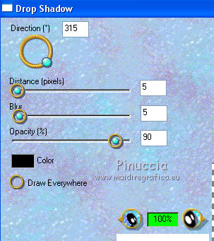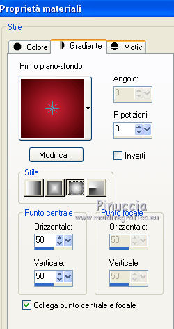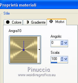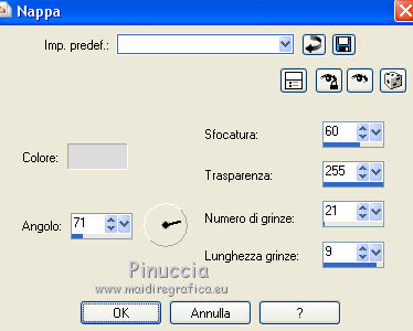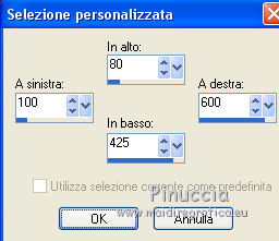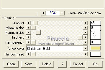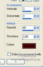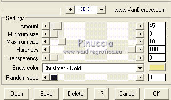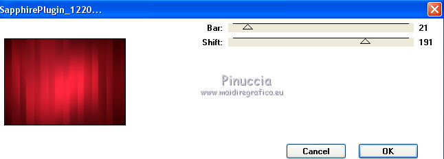 qui puoi trovare qualche risposta ai tuoi dubbi. Se l'argomento che ti interessa non è presente, ti prego di segnalarmelo. Per tradurre questo tutorial ho usato PSP X. Questo tutorial è una creazione di ©Titoune e non può essere copiato su altri siti nè essere offerto per il download. Lo stesso vale per la mia traduzione. Per tradurlo, ho usato PSP X, ma può essere eseguito anche con le altre versioni di PSP. Grazie ai creatori dei tubes che mettono a disposizione il loro lavoro in vari gruppi di condivisione. Rispetta il lavoro degli autori, non cambiare il nome del file e non cancellare il watermark. Occorrente: Materiale qui Filtri: Eye Candy 3.1 - Drop Shadow qui VDL Adrenaline - Snowflakes qui Graphics Plus - Cross Shadow qui Sapphire filters 13 - Sapphire plugin 1220 qui Animation Shop qui ![]() Se stai usando le nuove versioni X14 X15 e X16 le funzioni Immagine>Rifletti/Capovolgi hanno cambiato denominazione e comportamento. Vedi la mia scheda sull'argomento qui Apri il motivo Angra10 in PSP e minimizzalo con il resto del materiale. 1. Imposta il colore di primo piano con #d12236, e il colore di sfondo con #400000. Passa il colore di primo piano a Gradiente di primo piano/sfondo, stile Sprazzo di luce. ![]() 2. Apri una nuova immagine trasparente 750 x 650 pixels, e riempila con il gradiente.3. Effetti>Plugins>Graphics Plus - Cross Shadow. ![]() 4. Effetti>Plugins>Sapphire filters 13 - Sapphire plugin 1220. ![]() 5. Livelli>Nuovo livello raster. Selezione>Seleziona tutto. Apri il tube ff141109.png e vai a Modifica>Copia. Torna al tuo lavoro e vai a Modifica>Incolla nella selezione. Selezione>Deseleziona. Cambia la modalità di miscelatura di questo livello in Luminanza (esistente), e abbassa l'opacità al 40%. 6. Livelli>Nuovo livello raster. Selezione>Seleziona tutto. Selezione>Modifica>Contrai - 40 pixels. Riempi con il gradiente.7. Selezione>Seleziona tutto. Riporta il colore di primo piano a Colore e riempi il livello con il colore di primo piano.8. Selezione>Modifica>Contrai - 2 pixels. Riempi con il colore di sfondo.9. Selezione>Modifica>Contrai - 4 pixels. Premi sulla tastiera il tasto CANC ![]() 10. Effetti>Effetti 3D>Sfalsa ombra, con un colore scuro scelto dal tuo tube. per l'esempio #400000. ![]() 11. Livelli>Nuovo livello raster. Selezione>Modifica>Contrai - 40 pxiels. Selezione>Modifica>Sfuma - 80 pixels. 12. Apri il tube scenery boules suspendues by bienetre 27 10 09 e vai a Modifica>Copia. Torna al tuo lavoro e vai a Modifica>Incolla nella selezione. Selezione>Deseleziona. Cambia la modalità di miscelatura di questo livello in Luce netta. 13. Livelli>Nuovo livello raster. 14. Attiva lo strumento Selezione ![]() clicca sull'icona Selezione personalizzata ![]() e imposta i seguenti settaggi. ![]() Riempi la selezione con il gradiente.15. Effetti>Effetti di trama>Nappa. ![]() 16. Effetti>Plugins>Eye Candy 3.1 - Drop Shadow. ![]() 17. Selezione>Modifica>Contrai - 10 pixels. Livelli>Nuovo livello raster. 18. Passa il colore di primo piano a Motivi, e, nella categoria Immagini aperte, cerca e seleziona il motivo Angra 10, con i seguenti settaggi. ![]() Riempi la selezione con il motivo.19. Selezione>Modifica>Contrai - 2 pixels. Premi sulla tastiera il tasto CANC ![]() Selezione>Inverti. 20. Effetti>Effetti 3D>Sfalsa ombra, con i settaggi precedenti. Rinomina questo livello "bordo". Selezione>Inverti. 21. Livelli>Nuovo livello raster. Apri il tube NS_77_1311_09 e vai a Modifica>Copia. Torna al tuo lavoro e vai a Modifica>Incolla nella selezione. Selezione>Deseleziona. Rinomina questo livello "paesaggio". 22. Apri il tube AccentStars-V e vai a Modifica>Copia. Torna al tuo lavoro e vai a Modifica>Incolla come nuovo livello. 23. Effetti>Effetti di immagine>Scostamento. ![]() 24. Effetti>Effetti 3D>Sfalsa ombra, con i settaggi precedenti. Cambia la modalità di miscelatura di questo livello in Luce netta. Rinomina questo livello "stelle". 25. Apri il tube XBT_flower5_CBJ.png e vai a Modifica>Copia. Torna al tuo lavoro e vai a Modifica>Incolla come nuovo livello. 26. Immagine>Ridimensiona, al 20%, tutti i livelli non selezionato. Regola>Messa a fuoco>Metti a fuoco. Spostalo in basso a sinistra.27. Effetti>Effetti 3D>Sfalsa ombra, con i settaggi precedenti. 28. Activer le tube atce27 bv e vai a Modifica>Copia. Torna al tuo lavoro e vai a Modifica>Incolla come nuovo livello. 29. Immagine>Ridimensiona, al 45%, tutti i livelli non selezionato. Regola>Messa a fuoco>Metti a fuoco. Spostalo in alto a sinistra.30. Effetti>Effetti 3D>Sfalsa ombra, con i settaggi precedenti. 31. Apri il tube K44t e vai a Modifica>Copia. Torna al tuo lavoro e vai a Modifica>Incolla come nuovo livello. 32. Immagine>Ridimensiona, al 25%, tutti i livelli non selezionato. Regola>Messa a fuoco>Metti a fuoco. Spostalo a destra.Effetti>Effetti 3D>Sfalsa ombra, con i settaggi precedenti. 33. Attiva il livello superiore. Selezione>Seleziona tutto. Livelli>Nuovo livello raster. Riempi con il colore di primo piano.34. Selezione>Modifica>Contrai - 2 pixels. Premi sulla tastiera il tasto CANC. Selezione>Inverti. 35. Effetti>Effetti 3D>Sfalsa ombra, con i settaggi precedenti. Selezione>Deseleziona. 36. Copia e incolla sul tuo lavoro i due tubes di testo, e posizionali a tuo piacimento.37. Firma il tuo lavoro. 38. Attiva il livello "paesaggio". Livelli>Nuovo livello raster. 39. Selezione personalizzata ![]() ![]() 40. Effetti>Plugins>VanDerLee - Snowflakes se stai usando la versione precedente (il risultato non cambia): Effetti>Plugins>VDL Adrenaline - Snowflakes. ![]() Selezione>Deseleziona. 41. Modifica>Copia Unione. Apri Animation Shop e vai a Modifica>Incolla>Incolla come nuova animazione. 43. Torna in PSP. Modifica>Annulla azione Deseleziona. Modifica>Annulla Snowflakes. 44. Effetti>Plugins>VanDerLee - Snowflakes, cambia soltanto Random Seed con 1 e ok. ![]() Selezione>Deseleziona. 45. Cambia la modalità di miscelatura del livello "Stelle" in Sovrapponi. per cambiare la proprietà del livello non occorre at