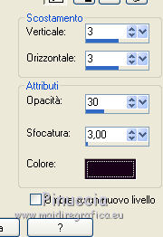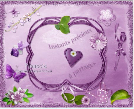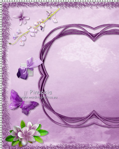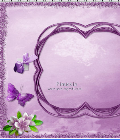 qui puoi trovare qualche risposta ai tuoi dubbi. Se l'argomento che ti interessa non è presente, ti prego di segnalarmelo. Questo tutorial è una creazione di ©Titoune e non può essere copiato su altri siti nè essere offerto per il download. Lo stesso vale per la mia traduzione. Il tutorial è stato creato con PSP X5, ma può essere eseguito anche con le altre versioni di PSP. Secondo la versione utilizzata (anteriore a PSP X) potresti ottenere dei risultati differenti. Dalla versione X4, il comando Immagine>Rifletti è stato sostituito con Immagine>Capovolgi in orizzontale, e il comando Immagine>Capovolgi con Immagine>Capovolgi in verticale. Nelle versioni X5 e X6, le funzioni sono state migliorate rendendo disponibile il menu Oggetti. Con il nuovo X7 sono tornati i comandi Rifletti/Capovolgi, ma con nuove differenze. Vedi la scheda sull'argomento qui Per tradure il tutorial ho usato PSP X. Occorrente: Un tube a scelta. Il resto del materiale qui ![]() 1. Apri una nuova immagine trasparente 750 x 600 pixels. Selezione>Seleziona tutto. 2. Apri l'elemento Tigroune - Purple dream - pp9, e vai a Modifica>Copia. Torna al tuo lavoro e vai a Modifica>Incolla nella selezione. Selezione>Deseleziona. 3. Apri l'elemento Tigroune - Purple dream - el 17, e vai a Modifica>Copia. Torna al tuo lavoro e vai a Modifica>Incolla come nuovo livello. 4. Effetti>Effetti 3D>Sfalsa ombra, colore #1a011a. ![]() Apri l'elemento Tigroune - Purple dream - el 49, e vai a Modifica>Copia. Torna al tuo lavoro e vai a Modifica>Incolla come nuovo livello. Effetti>Effetti 3D>Sfalsa ombra, con i settaggi precedenti. 5. Apri l'elemento Tigroune - Purple dream - el 9, e vai a Modifica>Copia. Torna al tuo lavoro e vai a Modifica>Incolla come nuovo livello. Spostalo in basso a sinistra.Vedi l'esempio finale. Effetti>Effetti 3D>Sfalsa ombra, con i settaggi precedenti. 6. Apri l'elemento Tigroune - Purple dream - el 54, e vai a Modifica>Copia. Torna al tuo lavoro e vai a Modifica>Incolla come nuovo livello. Spostalo in basso a sinistra.Vedi l'esempio finale. Effetti>Effetti 3D>Sfalsa ombra, con i settaggi precedenti. 7. Apri l'elemento Tigroune - Purple dream - el 19, e vai a Modifica>Copia. Torna al tuo lavoro e vai a Modifica>Incolla come nuovo livello. Spostalo a sinistra.![]() Effetti>Effetti 3D>Sfalsa ombra, con i settaggi precedenti. 8. Apri l'elemento Tigroune - Purple dream - el 32, e vai a Modifica>Copia. Torna al tuo lavoro e vai a Modifica>Incolla come nuovo livello. Spostalo in alto a sinistra.Vedi l'esempio finale. Effetti>Effetti 3D>Sfalsa ombra, con i settaggi precedenti. 9. Apri l'elemento Tigroune - Purple dream - el 10, e vai a Modifica>Copia. Torna al tuo lavoro e vai a Modifica>Incolla come nuovo livello. Spostalo in alto a sinistra.![]() Effetti>Effetti 3D>Sfalsa ombra, con i settaggi precedenti. 10. Apri l'elemento Tigroune - Purple dream - el 18, e vai a Modifica>Copia. Torna al tuo lavoro e vai a Modifica>Incolla come nuovo livello. Spostalo nella parte superiore della cornice.Vedi l'esempio finale. Effetti>Effetti 3D>Sfalsa ombra, con i settaggi precedenti. 11. Apri l'elemento Tigroune - Purple dream - el 44, e vai a Modifica>Copia. Torna al tuo lavoro e vai a Modifica>Incolla come nuovo livello. Spostalo in alto a destra.Vedi l'esempio finale. Effetti>Effetti 3D>Sfalsa ombra, con i settaggi precedenti. 12. Apri l'elemento Tigroune - Purple dream - el 55, e vai a Modifica>Copia. Torna al tuo lavoro e vai a Modifica>Incolla come nuovo livello. Spostalo sotto l'elemento precedente.![]() Effetti>Effetti 3D>Sfalsa ombra, con i settaggi precedenti. 13. Apri l'elemento Tigroune - Purple dream - el 36, e vai a Modifica>Copia. Torna al tuo lavoro e vai a Modifica>Incolla come nuovo livello. Spostalo nella parte destra della cornice.Vedi l'esempio finale. Effetti>Effetti 3D>Sfalsa ombra, con i settaggi precedenti. 14. Apri l'elemento Tigroune - Purple dream - el 53, e vai a Modifica>Copia. Torna al tuo lavoro e vai a Modifica>Incolla come nuovo livello. Spostalo in basso a destra.Vedi l'esempio finale. Effetti>Effetti 3D>Sfalsa ombra, con i settaggi precedenti. 15. Apri l'elemento Tigroune - Purple dream - el 46, e vai a Modifica>Copia. Torna al tuo lavoro e vai a Modifica>Incolla come nuovo livello. Spostalo in basso a destra.![]() Effetti>Effetti 3D>Sfalsa ombra, con i settaggi precedenti. 16. Apri l'elemento Tigroune - Purple dream - el 1, e vai a Modifica>Copia. Torna al tuo lavoro e vai a Modifica>Incolla come nuovo livello. Spostalo nella parte inferiore della cornice.Vedi l'esempio finale. Effetti>Effetti 3D>Sfalsa ombra, con i settaggi precedenti. 17. Apri l'elemento Tigroune - Purple dream - el 27, e vai a Modifica>Copia. Torna al tuo lavoro e vai a Modifica>Incolla come nuovo livello. Spostalo in basso.Vedi l'esempio finale. Effetti>Effetti 3D>Sfalsa ombra, con i settaggi precedenti. 18. Apri l'elemento Tigroune - Purple dream - el 11, e vai a Modifica>Copia. Torna al tuo lavoro e vai a Modifica>Incolla come nuovo livello. Spostalo nella parte inferiore della cornice.![]() Effetti>Effetti 3D>Sfalsa ombra, con i settaggi precedenti. 19. Apri l'elemento Tigroune - Purple dream - el 58, e vai a Modifica>Copia. Torna al tuo lavoro e vai a Modifica>Incolla come nuovo livello. Spostalo nella cornice in alto.Vedi l'esempio finale. Niente Sfalsa ombra. 20. Apri l'elemento Tigroune - Purple dream - el 58_2, e vai a Modifica>Copia. Torna al tuo lavoro e vai a Modifica>Incolla come nuovo livello. Sposta anche questo elemento nella cornice.Niente Sfalsa ombra. 21. Apri l'elemento Tigroune - Purple dream - el 38, e vai a Modifica>Copia. Torna al tuo lavoro e vai a Modifica>Incolla come nuovo livello. Spostalo nella cornice, tra i due testi.![]() Effetti>Effetti 3D>Sfalsa ombra, con i settaggi precedenti. 22. Apri il tube BirdieNoor002_cmh[1](tgw), e vai a Modifica>Copia. Torna al tuo lavoro e vai a Modifica>Incolla come nuovo livello. Spostalo sulla foglia in basso a destra.![]() Effetti>Effetti 3D>Sfalsa ombra,