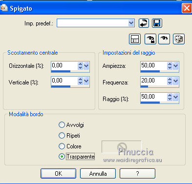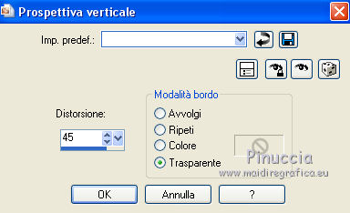 qui puoi trovare qualche risposta ai tuoi dubbi. Se l'argomento che ti interessa non è presente, ti prego di segnalarmelo. Questo tutorial è una creazione di ©Titoune e non può essere copiato su altri siti nè essere offerto per il download. Lo stesso vale per la mia traduzione. Il tutorial è stato creato con PSP X5, ma può essere eseguito anche con le altre versioni di PSP. Secondo la versione utilizzata (anteriore a PSP X) potresti ottenere dei risultati differenti. Dalla versione X4, il comando Immagine>Rifletti è stato sostituito con Immagine>Capovolgi in orizzontale, e il comando Immagine>Capovolgi con Immagine>Capovolgi in verticale. Nelle versioni X5 e X6, le funzioni sono state migliorate rendendo disponibile il menu Oggetti. Vedi la scheda sull'argomento qui Per tradure il tutorial ho usato PSP X. Occorrente: Un tube a scelta. Il resto del materiale qui Filtri in caso di dubbi, ricorda di consultare la mia sezione filtri qui Filters Unlimited 2.0 qui Penta.com - Jeans qui Mura's Meister - Perspective Tiling qui Mehdi - Kaleidoscope 2.1 qui Simple - Pizza Slice Mirror qui Simple - Left Right Wrap (bonus) qui VM Distortion - Kaleidoscope qui I filtri VM Distortion, Simple e Penta.com si possono usare da soli o importati in Filters Unlimited (come fare vedi qui) Se un filtro fornito appare con questa icona ![]() Metti la selezione nella cartella Selezioni. Apri la maschera in PSP e minimizzala con il resto del materiale. 1. Apri una nuova immagine trasparente 1280 x 750 pixels. Selezione>Seleziona tutto. Apri l'immagine Sumemr sea(5) e vai a Modifica>Copia. Torna al tuo lavoro e vai a Modifica>Incolla nella selezione. Selezione>Deseleziona. 2. Effetti>Effetti di immagine>Motivo unico. ![]() Regola>Sfocatura>Sfocatura gaussiana - raggio 35. ![]() 3. Effetti>Plugins>Filters Unlimited 2.0 - VM Distortion - Kaleidoscope, con i settaggi standard. ![]() Livelli>Duplica. Immagine>Ridimensiona, all'85%, tutti i livelli non selezionato. Effetti>Effetti di bordo>Aumenta di più. 4. Effetti>Plugins>Simple - Left Right Wrap. 5. Effetti>Plugins>Simple - Pizza Slice Mirror. 6. Effetti>Effetti di riflesso>Specchio rotante. ![]() 7. Effetti>Effetti di distorsione>Coordinate polari. ![]() 8. Effetti>Effetti geometrici>Prospettiva verticale. ![]() 9. Effetti>Plugins>Mehdi - Kaleidoscope 2.1. ![]() 10. Effetti>Effetti geometrici>Sfera. ![]() 11. Effetti>Effetti di distorsione>Spigato. ![]() 12. Effetti>Effetti 3D>Sfalsa ombra, colore #075788. ![]() Ripeti l'Effetto Sfalsa ombra, cambiando verticale e orizzontale con -3. 13. Selezione>Carica/Salva selezione>Carica selezione da disco. Cerca e carica la selezione "selection_island_summer". ![]() 14. Apri l'immagine Sumemr-sea-5 e vai a Modifica>Copia. Torna al tuo lavoro e vai a Modifica>Incolla nella selezione. Selezione>Deseleziona. 15. Attiva il livello Raster 1. Selezione>Seleziona tutto. Immagine>Ritaglia la selezione. 16. Immagine>Dimensioni tela - 1280 x 1500 pixels. ![]() 17. Di nuovo Selezione>Seleziona tutto. Modifica>Incolla nella selezione (l'immagine Summer sea(5) è ancora in memoria). Selezione>Deseleziona. Effetti>Effetti di immagine>Motivo unico, con i settaggi precedenti. Regola>Sfocatura>Sfocatura gaussiana - raggio 35. ![]() Modifica>Copia. 18. Apri una nuova immagine trasparente 1280 x 350 pixels. Selezione>Seleziona tutto. Modifica>Incolla nella selezione. Selezione>Deseleziona. 19. Effetti>Plugins>Filters Unlimited 2.0 - VM Distortion - Kaleidoscope, con i settaggi standard. ![]() 20. Livelli>Nuovo livello maschera>Da immagine. Apri il menu sotto la finestra di origine e vedrai la lista dei files aperti. Seleziona la maschera Mask 500 Brooke Kroeger, con i seguenti settaggi. ![]() Livelli>Unisci>Unisci gruppo. 21. Effetti>Plugins>Mura's Meister - Perspective Tiling, con i settaggi standard. ![]() Modifica>Copia. Torna al tuo top e vai a Modifica>Incolla come nuovo livello. Effetti>Effetti 3D>Sfalsa ombra, con i settaggi precedenti. 22. Attiva lo strumento Selezione ![]() (non importa il tipo di selezione impostato, perchè con la selezione personalizzata si ottiene sempre un rettangolo) clicca sull'icona Selezione personalizzata ![]() e imposta i seguenti settaggi. ![]() Selezione>Innalza selezione a livello. Selezione>Deseleziona. 23. Effetti>Plugins>Penta.com - Jeans, con i settaggi standard. ![]() Effetti>Effetti 3D>Sfalsa ombra, con i settaggi precedenti. 24. Attiva il livello superiore. Apri l'elemento palm-tre e vai a Modifica>Copia. Torna al tuo lavoro e vai a Modifica>Incolla come nuovo livello. Spostalo nell'angolo in alto a destra.Effetti>Effetti 3D>Sfalsa ombra, con i settaggi precedenti. Livelli>Duplica. Immagine>Rifletti. 25. Apri l'elemento BIBILASTSUMMERELEMS (12) e vai a Modifica>Copia. Torna al tuo lavoro e vai a Modifica>Incolla come nuovo livello. Spostalo in basso a destra.![]() Effetti>Effetti 3D>Sfalsa ombra, con i settaggi precedenti. 26. Apri l'elemento BIBILASTSUMMERELEMS (5) e vai a Modifica>Copia. Torna al tuo lavoro e vai a Modifica>Incolla come nuovo livello. Spostalo in basso.Effetti>Effetti 3D>Sfalsa ombra, con i settaggi precedenti. 27. Apri l'elemento BIBILASTSUMMERELEMS (13) e vai a Modifica>Copia. Torna al tuo lavoro e vai a Modifica>Incolla come nuovo livello. Spostalo in basso a destra.![]() Effetti>Effetti 3D>Sfalsa ombra, con i settaggi precedenti. 28. Apri l'elemento BIBILASTSUMMERELEMS (4) e vai a Modifica>Copia. Torna al tuo lavoro e vai a Modifica>Incolla come nuovo livello. Spostalo in basso a destra.Effetti>Effetti 3D>Sfalsa ombra, con i settaggi precedenti. 29. Apri l'elemento BIBILASTSUMMERELEMS (37) e vai a Modifica>Copia. Torna al tuo lavoro e vai a Modifica>Incolla come nuovo livello. Spostalo in basso.Effetti>Effetti 3D>Sfalsa ombra, con i settaggi precedenti. 30. Apri l'elemento BIBILASTSUMMERELEMS (2) e vai a Modifica>Copia. Torna al tuo lavoro e vai a Modifica>Incolla come nuovo livello. Spostalo in basso.![]() Effetti>Effetti 3D>Sfalsa ombra, con i settaggi precedenti. 