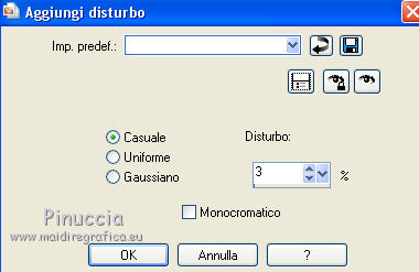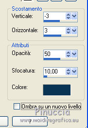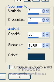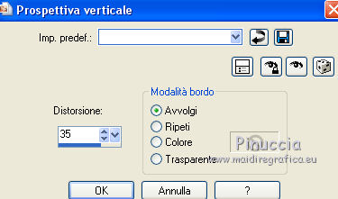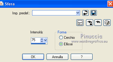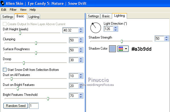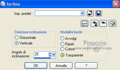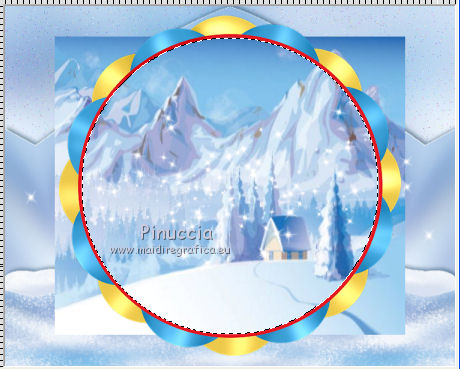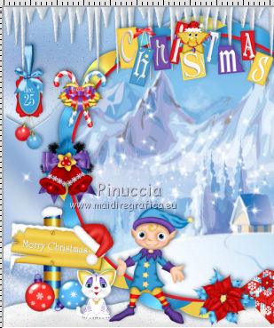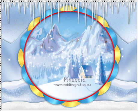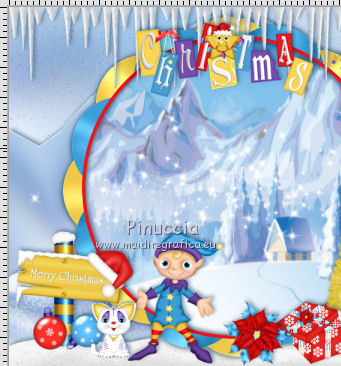 qui puoi trovare qualche risposta ai tuoi dubbi. Se l'argomento che ti interessa non è presente, ti prego di segnalarmelo. Questo tutorial è una creazione di ©Titoune e non può essere copiato su altri siti nè essere offerto per il download. Lo stesso vale per la mia traduzione. Il tutorial è stato creato con PSP X5, ma può essere eseguito anche con le altre versioni di PSP. Secondo la versione utilizzata (anteriore a PSP X) potresti ottenere dei risultati differenti. Vedi la mia scheda riguardante le funzioni Rifletti>Capovolgi in X4 e X5 qui Per tradure il tutorial ho usato PSP X. Occorrente: Un tube a scelta. Il resto del materiale qui Filtri in caso di dubbi, ricorda di consultare la mia sezione filtri qui Penta.com - Jeans qui Alien Skin Eye Candy 5 Nature - Snowdrift qui I filtri Penta.com si possono usare da soli o importati in Filters Unlimited (come fare vedi qui) Se un filtro fornito appare con questa icona ![]() Metti il preset Cliccando sul file una o due volte (a seconda delle tue impostazioni), automaticamente il preset si installerà nella cartella corretta. perchè uno o due clic vedi qui 1. Apri una nuova immagine trasparente 750 x 600 pixels. Selezione>Seleziona tutto. 2. Apri l'immagine winter-Background-7 e vai a Modifica>Copia. Torna al tuo lavoro e vai a Modifica>Incolla nella selezione. Selezione>Deseleziona. 3. Effetti>Effetti di immagine>Motivo unico, con i settaggi standard. ![]() 4. Regola>Sfocatura>Sfocatura gaussiana - raggio 35. ![]() Livelli>Duplica. 5. Effetti>Effetti geometrici>Inclina. ![]() Effetti>Effetti di bordo>Aumenta. 6. Effetti>Effetti di riflesso>Specchio rotante. ![]() 7. Effetti>Effetti geometrici>Sfera. ![]() 8. Effetti>Effetti geometrici>Prospettiva verticale. ![]() Rinomina questo livello "sfera". 9. Attiva il livello sottostante. Regola>Aggiungi/Rimuovi disturbo>Aggiungi disturbo. ![]() 10. Attiva il livello superiore (sfera). Livelli>Duplica. Premi il tasto K per attivare lo strumento Puntatore ![]() se stai usando PSP 9 il tasto D per attivare lo strumento Deformazione ![]() in modalità Scala, spingi il nodo superiore centrale verso il basso fino a 400 pixels, (se non visualizzi i Righelli, vai a Visualizza>Righelli) ![]() Premi il tasto M per deselezionare lo strumento. 11. Effetti>Plugins>Alien Skin Eye Candy 5 Nature - Snowdrift. Seleziona il preset "Scrap_its_christmas" e ok. ![]() Questi i settaggi che, in caso di problemi con il preset, puoi impostare manualmente. ![]() 12. Effetti>Effetti 3D>Sfalsa ombra, colore #0a3454. ![]() 13. Attiva il livello "sfera". Effetti>Effetti 3D>Sfalsa ombra, con i settaggi precedenti. Attiva nuovamente il livello superiore. 14. Modifica>Incolla come nuovo livello (l'immagine Winter-Background-7 è ancora in memoria). Non spostare l'immagine. 15. Apri l'elementi IC-48 e vai a Modifica>Copia. Torna al tuo lavoro e vai a Modifica>Incolla come nuovo livello. Non spostarlo. Niente Sfalsa ombra. 16. Apri l'elemento IC-63 e vai a Modifica>Copia. Torna al tuo lavoro e vai a Modifica>Incolla come nuovo livello. Non spostarlo. 17. Attiva lo strumento Bacchetta magica ![]() e clicca al centro della cornice per selezionarla. ![]() Selezione>Modifica>Espandi - 5 pixels. ![]() Selezione>Inverti. 18. Attiva il livello del paesaggio. Premi sulla tastiera il tasto CANC ![]() Selezione>Deseleziona. 19. Attiva il livello della cornice. Effetti>Effetti 3D>Sfalsa ombra, con i settaggi precedenti. Ripeti l'Effetto Sfalsa ombra, cambiando verticale e orizzontale con 3/-3. ![]() 20. Apri l'elemento IC-26 e vai a Modifica>Copia. Torna al tuo lavoro e vai a Modifica>Incolla come nuovo livello. Spostalo in basso, sul bordo.Vedi l'esempio finale. Regola>Aggiungi/Rimuovi disturbo>Aggiungi disturbo, con i settaggi precedenti. Porta questo livello sotto il livello del paesaggio. Effetti>Effetti 3D>Sfalsa ombra, con i settaggi precedenti. 21. Attiva nuovamente il livello superiore. Apri l'elemento IC-23 e vai a Modifica>Copia. Torna al tuo lavoro e vai a Modifica>Incolla come nuovo livello. Spostalo in alto, contro il bordo.![]() Effetti>Effetti 3D>Sfalsa ombra, colore #0a3454. ![]() 22. Apri l'elemento IC-4 e vai a Modifica>Copia. Torna al tuo lavoro e vai a Modifica>Incolla come nuovo livello. Spostalo sopra la cornice.Vedi l'esempio finale. Effetti>Effetti 3D>Sfalsa ombra, con i settaggi precedenti. 23. Apri l'elemento IC-13 e vai a Modifica>Copia. Torna al tuo lavoro e vai a Modifica>Incolla come nuovo livello. Spostalo nella parte superiore destra della cornice.Vedi l'esempio finale. Effetti>Effetti 3D>Sfalsa ombra, con i settaggi precedenti. 24. Apri l'elemento IC-55 e vai a Modifica>Copia. Torna al tuo lavoro e vai a Modifica>Incolla come nuovo livello. Spostalo a destra.Vedi l'esempio finale. Effetti>Effetti 3D>Sfalsa ombra, con i settaggi precedenti. 25. Apri l'elemento IC-31 e vai a Modifica>Copia. Torna al tuo lavoro e vai a Modifica>Incolla come nuovo livello. Spostalo a destra.![]() Effetti>Effetti 3D>Sfalsa ombra, con i settaggi precedenti. 26. Apri l'elemento IC-65 e vai a Modifica>Copia. Torna al tuo lavoro e vai a Modifica>Incolla come nuovo livello. Spostalo in basso a destra.Vedi l'esempio finale. Effetti>Effetti 3D>Sfalsa ombra, con i settaggi precedenti. 27. Apri l'elemento IC-6 e vai a Modifica>Copia. Torna al tuo lavoro e vai a Modifica>Incolla come nuovo livello. Spostalo in basso.Vedi l'esempio finale. Effetti>Effetti 3D>Sfalsa ombra, con i settaggi precedenti. 28. Apri l'elemento IC-59 e vai a Modifica>Copia. Torna al tuo lavoro e vai a Modifica>Incolla come nuovo livello. Spostalo in basso.Vedi l'esempio finale. Effetti>Effetti 3D>Sfalsa ombra, con i settaggi precedenti. 29. Apri l'elemento IC-24 e vai a Modifica>Copia. Torna al tuo lavoro e vai a Modifica>Incolla come nuovo livello. Spostalo in basso.![]() Effetti>Effetti 3D>Sfalsa ombra, con i settaggi precedenti. 30. Apri l'elemento IC-8 e vai a Modifica>Copia. Torna al tuo lavoro e vai a Modifica>Incolla come nuovo livello. Spostalo in basso a