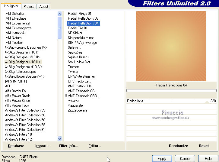 qui puoi trovare qualche risposta ai tuoi dubbi. Se l'argomento che ti interessa non è presente, ti prego di segnalarmelo. Questo tutorial è una creazione di ©Titoune e non può essere copiato su altri siti nè essere offerto per il download. Lo stesso vale per la mia traduzione. Il tutorial è stato creato con PSP X5, ma può essere eseguito anche con le altre versioni di PSP. Secondo la versione utilizzata (anteriore a PSP X) potresti ottenere dei risultati differenti. Dalla versione X4, il comando Immagine>Rifletti è stato sostituito con Immagine>Capovolgi in orizzontale, e il comando Immagine>Capovolgi con Immagine>Capovolgi in verticale. Nelle versioni X5 e X6, le funzioni sono state migliorate rendendo disponibile il menu Oggetti. Vedi la scheda sull'argomento qui Per tradure il tutorial ho usato PSP X. Occorrente: Un tube a scelta. Il resto del materiale qui Il tube utilizzato è di Joanie Filtri in caso di dubbi, ricorda di consultare la mia sezione filtri qui Filters Unlimited 2.0 qui &<Bkg Designer sf10III> - Radial Reflections 04 (da importare in Unlimited) qui VM Experimental - Love and Hate qui Simple - Top Left Mirror qui Penta.com - Jeans qui I filtri VM Experimenta, Simple e Penta.com si possono usare da soli o importati in Filters Unlimited (come fare vedi qui) Se un filtro fornito appare con questa icona ![]() 1. Imposta il colore di primo piano con #e8d58c, e il colore di sfondo con #d98456. Passa il colore di primo piano a Gradiente di primo piano/sfondo, stile Sprazzo di luce. ![]() 2. Apri una nuova immagine trasparente 650 x 650 pixels, e riempila con il gradiente.3. Apri l'elemento CCSJE17, e vai a Modifica>Copia. Torna al tuo lavoro e vai a Modifica>Incolla come nuovo livello. 4. Attiva lo strumento Bacchetta magica ![]() e clicca al centro della cornice per selezionarla. Selezione>Inverti. 5. Attiva il livello inferiore. Effetti>Plugins>Filters Unlimited 2.0 - &<Bkg Designer sf10III> - Radial Reflections 04, con i settaggi standard. ![]() Effetti>Effetti di bordo>Aumenta. 6. Selezione>Inverti. Selezione>Modifica>Contrai - 15 pixels. Selezione>Modifica>Sfuma - 15 pixels. 7. Sempre posizionato sul livello inferiore. Effetti>Plugins>Filters Unlimited 2.0 - VM Experimental - Love and Hate, con i settaggi standard. ![]() Selezione>Innalza selezione a livello. Selezione>Deseleziona. 8. Effetti>Effetti 3D>Sfalsa ombra, colore #50081c. ![]() 9. Attiva il livello della cornice. Effetti>Effetti 3D>Sfalsa ombra, con i settaggi precedenti. 10. Apri l'elemento CCSJE1, e vai a Modifica>Copia. Torna al tuo lavoro e vai a Modifica>Incolla come nuovo livello. Spostalo in alto a sinistra.Vedi l'esempio finale. Effetti>Effetti 3D>Sfalsa ombra, con i settaggi precedenti. 11. Apri l'elemento CCSJE12, e vai a Modifica>Copia. Torna al tuo lavoro e vai a Modifica>Incolla come nuovo livello. Spostalo a sinistra.Vedi l'esempio finale. Effetti>Effetti 3D>Sfalsa ombra, con i settaggi precedenti. 12. Apri l'elemento CCSJE11, e vai a Modifica>Copia. Torna al tuo lavoro e vai a Modifica>Incolla come nuovo livello. Spostalo in basso a sinistra.Vedi l'esempio finale. Effetti>Effetti 3D>Sfalsa ombra, con i settaggi precedenti. 13. Apri l'elemento CCSJE18, e vai a Modifica>Copia. Torna al tuo lavoro e vai a Modifica>Incolla come nuovo livello. Spostalo in basso a sinistra.![]() Effetti>Effetti 3D>Sfalsa ombra, con i settaggi precedenti. 14. Apri l'elemento CCSJE20, e vai a Modifica>Copia. Torna al tuo lavoro e vai a Modifica>Incolla come nuovo livello. Spostalo in basso a sinistra.Vedi l'esempio finale. Effetti>Effetti 3D>Sfalsa ombra, con i settaggi precedenti. 15. Apri l'elemento CCSJE5, e vai a Modifica>Copia. Torna al tuo lavoro e vai a Modifica>Incolla come nuovo livello. Spostalo in basso.Vedi l'esempio finale. Effetti>Effetti 3D>Sfalsa ombra, con i settaggi precedenti. 16. Apri l'elemento CCSJE7, e vai a Modifica>Copia. Torna al tuo lavoro e vai a Modifica>Incolla come nuovo livello. Spostalo in basso.![]() Effetti>Effetti 3D>Sfalsa ombra, con i settaggi precedenti. 17. Apri l'elemento CCSJE14, e vai a Modifica>Copia. Torna al tuo lavoro e vai a Modifica>Incolla come nuovo livello. Spostalo in basso a destra.Vedi l'esempio finale. Effetti>Effetti 3D>Sfalsa ombra, con i settaggi precedenti. 18. Apri l'elemento CCSJE15, e vai a Modifica>Copia. Torna al tuo lavoro e vai a Modifica>Incolla come nuovo livello. Spostalo in basso a destra.Vedi l'esempio finale. Effetti>Effetti 3D>Sfalsa ombra, con i settaggi precedenti. 19. Apri l'elemento CCSJE13, e vai a Modifica>Copia. Torna al tuo lavoro e vai a Modifica>Incolla come nuovo livello. Spostalo in basso.Vedi l'esempio finale. Effetti>Effetti 3D>Sfalsa ombra, con i settaggi precedenti. 20. Apri l'elemento CCSJE19, e vai a Modifica>Copia. Torna al tuo lavoro e vai a Modifica>Incolla come nuovo livello. Spostalo in basso a destra.![]() Effetti>Effetti 3D>Sfalsa ombra, con i settaggi precedenti. 21. Apri l'elemento CCSJE3, e vai a Modifica>Copia. Torna al tuo lavoro e vai a Modifica>Incolla come nuovo livello. Spostalo in basso a destra della cornice.Vedi l'esempio finale. Effetti>Effetti 3D>Sfalsa ombra, con i settaggi precedenti. 22. Apri l'elemento CCSJE2, e vai a Modifica>Copia. Torna al tuo lavoro e vai a Modifica>Incolla come nuovo livello. Spostalo nella parte superiore destra della cornice.![]() Effetti>Effetti 3D>Sfalsa ombra, con i settaggi precedenti. 23. Attiva il livello inferiore. Apri l'elemento CCSJE4, e vai a Modifica>Copia. Torna al tuo lavoro e vai a Modifica>Incolla come nuovo livello. Spostalo in alto a sinistra.Vedi l'esempio finale. Effetti>Plugins>Simple - Top Left Mirror. Effetti>Effetti 3D>Sfalsa ombra, con i settaggi precedenti. 24. Apri il tuo tube , e vai a Modifica>Copia. Torna al tuo lavoro e vai a Modifica>Incolla come nuovo livello. Immagine>Ridimensiona, se e quanto necessario, tutti i livelli non selezionato. Spostalo dove preferisci,o vedi il mio esempio. Effetti>Effetti 3D>Sfalsa ombra, con i settaggi preceden