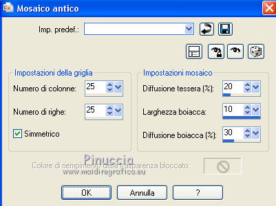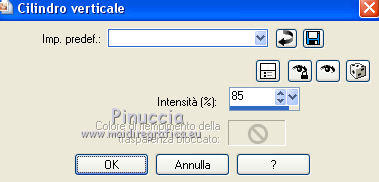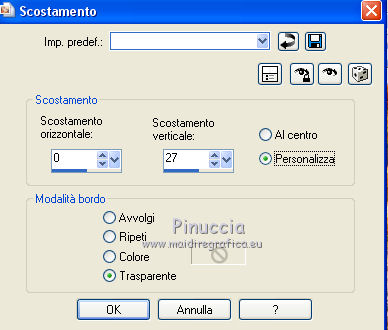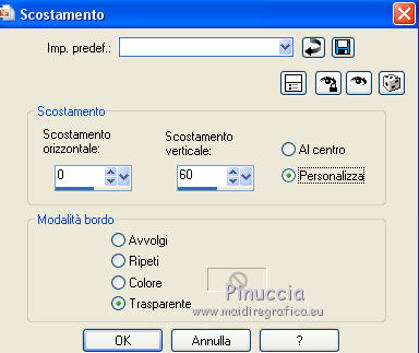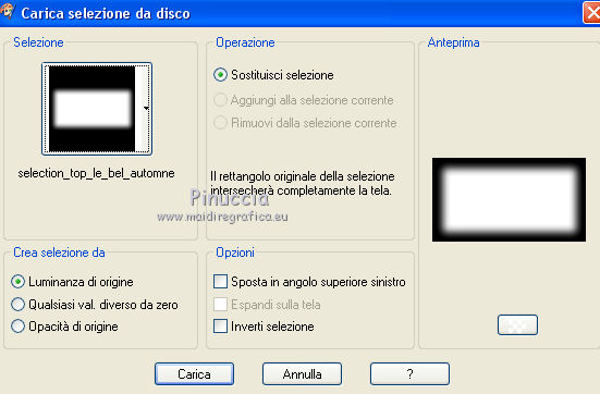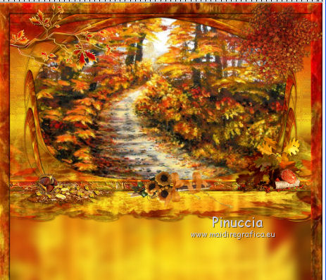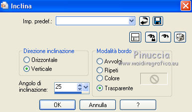 qui puoi trovare qualche risposta ai tuoi dubbi. Se l'argomento che ti interessa non è presente, ti prego di segnalarmelo. Questo tutorial è una creazione di ©Titoune e non può essere copiato su altri siti nè essere offerto per il download. Lo stesso vale per la mia traduzione. Il tutorial è stato creato con PSP X5, ma può essere eseguito anche con le altre versioni di PSP. Secondo la versione utilizzata (anteriore a PSP X) potresti ottenere dei risultati differenti. Vedi la mia scheda riguardante le funzioni Rifletti>Capovolgi in X4, X5 e X6 qui Per tradure il tutorial ho usato PSP X. Occorrente: Un tube a scelta. Il resto del materiale qui Il tube utilizzato è di Ivo. Filtri in caso di dubbi, ricorda di consultare la mia sezione filtri qui Flaming Pear - Flexify 2 qui Simple - Left Right Wrap (bonus) qui ![]() Metti le selezioni nella cartella Selezioni. Apri la maschera in PSP e minimizzala con il resto del materiale. 1. Apri una nuova immagine trasparente 1280 x 700 pixels. Selezione>Seleziona tutto. 2. Apri l'immagine 10996923-bright-autumn-leaves-on-the-abstract-with-paper-frame e vai a Modifica>Copia. non chiuderla perchè ti servirà ancora Torna al tuo lavoro e vai a Modifica>Incolla nella selezione. 3. Selezione>Modifica>Contrai - 45 pixels. Selezione>Inverti. Selezione>Innalza selezione a livello. Selezione>Deseleziona. 4. Effetti>Effetti 3D>Smusso a incasso. ![]() 5. Selezione>Carica/Salva selezione>Carica selezione da disco. Cerca e carica la selezione "sélection_top_le_bel_automne". ![]() 6. Attiva il livello inferiore. Selezione>Innalza selezione a livello. 7. Regola>Sfocatura>Sfocatura radiale. ![]() Livelli>Duplica. 8. Effetti>Effetti di trama>Mosaico antico. ![]() Effetti>Effetti di bordo>Aumenta. 9. Selezione>Carica/Salva selezione>Carica selezione da disco. Cerca e carica la selezione "sélection_top_le_bel_automne2". ![]() Selezione>Inverti. Premi sulla tastiera il tasto CANC ![]() Selezione>Deseleziona. Effetti>Plugins>Simple - Left Right Wrap. 10. Attiva il livello della cornice. Attiva lo strumento Selezione ![]() clicca sull'icona Selezione personalizzata ![]() e imposta i seguenti settaggi. ![]() Modifica>Taglia (questo comando oltre a tagliare tiene anche in memoria). Modifica>Incolla come nuova immagine, rinomina l'immagine "Fregio" e minimizzala (la userai più tardi). 11. Torna al tuo top. Rimani posizionato sul livello della cornice. Livelli>Duplica. 12. Attiva il livello sottostante dell'originale. Immagine>Ridimensiona, 2 volte al 95%, tutti i livelli non selezionato. 13. Effetti>Plugins>Flaming Pear - Flexify 2. ![]() Livelli>Duplica. 14. Attiva il livello sottostante dell'originale. Effetti>Effetti geometrici>Inclina. ![]() 15. Effetti>Effetti di riflesso>Specchio rotante. ![]() 16. Attiva il livello della copia. Livelli>Unisci>Unisci giù. 17. Effetti>Effetti geometrici>Cilindro verticale. ![]() Rinomina questo livello "bordo". 18. Attiva lo strumento Bacchetta magica ![]() e clicca al centro del bordo per selezionarlo. ![]() Selezione>Modifica>Espandi - 3 pixels. ![]() Livelli>Nuovo livello raster. Livelli>Disponi>Sposta giù. 19. Apri l'immagine del paesaggio e vai a Modifica>Copia. Torna al tuo lavoro e vai a Modifica>Incolla nella selezione. Selezione>Deseleziona. Attiva il livello "bordo". 20. Effetti>Effetti 3D>Sfalsa ombra, colore #0f0301. ![]() Ripeti l'Effetto Sfalsa ombra, cambiando verticale e orizzontale con -3. Adesso puoi eliminare il livello superiore della cornice. 21. Attiva il livello Raster 1. Modifica>Copia. Selezione>Seleziona tutto. Immagine>Ritaglia la selezione. 22. Immagine>Dimensioni tela - 1280 x 1500 pixels. ![]() 23. Livelli>Nuovo livello raster. Livelli>Disponi>Sposta giù. Selezione>Seleziona tutto. Modifica>Incolla nella selezione. 24. Selezione>Modifica>Contrai - 45 pixels. Regola>Sfocatura>Sfocatura gaussiana - raggio 15. ![]() Selezione>Inverti. Selezione>Innalza selezione a livello. Selezione>Deseleziona. Effetti>Effetti 3D>Smusso a incasso, con i settaggi precedenti. Selezione>Deseleziona. Livelli>Disponi>Porta in alto, e rinomina questo livello "cornice". 25. Attiva l'immagine "Fregio" che hai minimizzato al punto 10, e vai a Modifica>Copia. Torna al tuo top e vai a Modifica>Incolla come nuovo livello. 26. Effetti>Effetti di immagine>Scostamento. ![]() 27. Selezione>Seleziona tutto. Selezione>Mobile. Selezione>Modifica>Contrai - 10 pixels. 28. Effetti>Effetti di trama>Plastica morbida. ![]() Effetti>Effetti di bordo>Aumenta. Porta questo livello sotto il livello della cornice. Effetti>Effetti 3D>Sfalsa ombra, con i settaggi precedenti. 29. Apri una nuova immagine trasparente 1280 x 350 pixels. Selezione>Seleziona tutto. Attiva nuovamente l'immagine di partenza 10996923-bright-autumn-leaves-on-the-abstract-with-paper-frame. Modifica>Copia. Torna alla nuova immagine e vai a Modifica>Incolla nella selezione. Selezione>Deseleziona. 30. Livelli>Nuovo livello maschera>Da immagine. Apri il menu sotto la finestra di origine e vedrai la lista dei files aperti. Seleziona la maschera beccanae1, con i seguenti settaggi. ![]() Livelli>Unisci>Unisci gruppo. Modifica>Copia. 31. Torna al tuo top. Attiva il livello inferiore e vai a Modifica>Incolla come nuovo livello. 32. Effetti>Effetti di immagine>Scostamento. ![]() Effetti>Effetti 3D>Sfalsa ombra, con i settaggi precedenti. 33. Attiva il livello superiore. Apri l'elemento 0_48767_f92acbbd_L (ramo) e vai a Modifica>Copia. Torna al tuo lavoro e vai a Modifica>Incolla come nuovo livello. Spostalo in alto a sinistra.vedi l'esempio finale. Porta questo livello sotto il livello del bordo. Livelli>Duplica, e porta questo livello sopra il livello del bordo. 34. Attiva lo strumento Gomma ![]() e cancella la parte che deborda sulla cornice. ![]() Nessun Effetto Sfalsa ombra. 35. Apri l'elemento 0_6f27f_a002e24e_XL (fogliame) vai a Modifica>Copia. Torna al tuo lavoro e vai a Modifica>Incolla come nuovo livello. Spostalo in alto a destra.![]() Effetti>Effetti 3D>Sfalsa ombra, con 