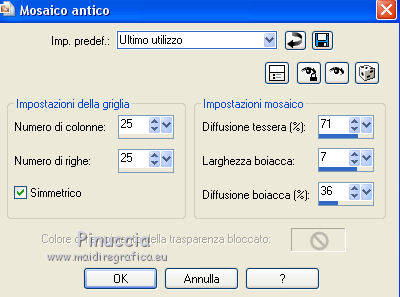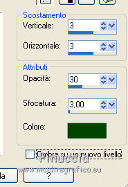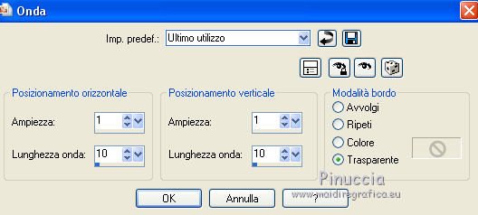 qui puoi trovare qualche risposta ai tuoi dubbi. Se l'argomento che ti interessa non è presente, ti prego di segnalarmelo. Questo tutorial è una creazione di ©Titoune e non può essere copiato su altri siti nè essere offerto per il download. Lo stesso vale per la mia traduzione. Il tutorial è stato creato con PSP X5, ma può essere eseguito anche con le altre versioni di PSP. Secondo la versione utilizzata (anteriore a PSP X) potresti ottenere dei risultati differenti. Dalla versione X4, il comando Immagine>Rifletti è stato sostituito con Immagine>Capovolgi in orizzontale, e il comando Immagine>Capovolgi con Immagine>Capovolgi in verticale. Nelle versioni X5 e X6, le funzioni sono state migliorate rendendo disponibile il menu Oggetti. Vedi la scheda sull'argomento qui Per tradure il tutorial ho usato PSP X. Occorrente: Un tube a scelta. Il resto del materiale qui Filtri in caso di dubbi, ricorda di consultare la mia sezione filtri qui Filters Unlimited 2.0 qui Simple - Left Right Wrap (bonus) qui I filtri Simple si possono usare da soli o importati in Filters Unlimited (come fare vedi qui) Se un filtro fornito appare con questa icona ![]() 1. Apri una nuova immagine trasparente 750 x 600 pixels. Selezione>Seleziona tutto. 2. Apri l'elemento DBV_LemonLimePaper e vai a Modifica>Copia. Torna al tuo lavoro e vai a Modifica>Incolla nella selezione. Selezione>Deseleziona. 3. Apri l'elemento Frame e vai a Modifica>Copia. Torna al tuo lavoro e vai a Modifica>Incolla come nuovo livello. Non spostarlo. Livelli>Duplica. 4. Attiva il livello sottostante dell'originale. Effetti>Effetti di trama>Mosaico antico. ![]() 5. Effetti>Effetti di distorsione>Onda. ![]() 6. Immagine>Ridimensiona, al 98%, tutti i livelli non selezionato. 7. Effetti>Effetti 3D>Sfalsa ombra, colore #034503. ![]() 8. Attiva il livello della cornice. Effetti>Effetti 3D>Sfalsa ombra, colore #034503. ![]() Ripeti l'Effetto Sfalsa ombra, cambiando verticale e orizzontale con -3. 9. Apri l'elemento DBV_LemonLimeElement (10), e vai a Modifica>Copia. Torna al tuo lavoro e vai a Modifica>Incolla come nuovo livello. Effetti>Plugins>Simple - Left Right Wrap. 10. Regola>Tonalità e saturazione>Viraggio. ![]() Spostalo in basso.Se stai usando CorelX15 o X16: Oggetti>Allinea>Inferiore. ![]() Effetti>Effetti 3D>Sfalsa ombra, con i settaggi precedenti. 11. Apri l'elemento DBV_LemonLimeElement (19), e vai a Modifica>Copia. Torna al tuo lavoro e vai a Modifica>Incolla come nuovo livello. Spostalo nella parte superiore della cornice.Vedi l'esempio finale. Effetti>Effetti 3D>Sfalsa ombra, con i settaggi precedenti. 12. Apri l'elemento DBV_LemonLimeElement (20), e vai a Modifica>Copia. Torna al tuo lavoro e vai a Modifica>Incolla come nuovo livello. Regola>Tonalità e saturazione>Viraggio, con i settaggi precedenti. Spostalo nella parte superiore della cornice.Vedi l'esempio finale. Effetti>Effetti 3D>Sfalsa ombra, con i settaggi precedenti. 13. Apri l'elemento DBV_LemonLimeElement (9), e vai a Modifica>Copia. Torna al tuo lavoro e vai a Modifica>Incolla come nuovo livello. Regola>Tonalità e saturazione>Viraggio, con i settaggi precedenti. Spostalo nella parte superiore destra della cornice.![]() Effetti>Effetti 3D>Sfalsa ombra, con i settaggi precedenti. 14. Apri l'elemento DBV_LemonLimeElement (5), e vai a Modifica>Copia. Torna al tuo lavoro e vai a Modifica>Incolla come nuovo livello. Spostalo in alto a destra.Vedi l'esempio finale. Effetti>Effetti 3D>Sfalsa ombra, con i settaggi precedenti. 15. Apri l'elemento DBV_LemonLimeElement (4), e vai a Modifica>Copia. Torna al tuo lavoro e vai a Modifica>Incolla come nuovo livello. Spostalo un po' discosto dall'elemento precedente.![]() Effetti>Effetti 3D>Sfalsa ombra, con i settaggi precedenti. 16. Apri l'elemento DBV_LemonLimeElement (2), e vai a Modifica>Copia. Torna al tuo lavoro e vai a Modifica>Incolla come nuovo livello. Spostalo sulla cornice, come nell'esempio.![]() Effetti>Effetti 3D>Sfalsa ombra, con i settaggi precedenti. 16. Apri l'elemento DBV_LemonLimeElement (13), e vai a Modifica>Copia. Torna al tuo lavoro e vai a Modifica>Incolla come nuovo livello. Spostalo nella parte inferiore della cornice.![]() Effetti>Effetti 3D>Sfalsa ombra, con i settaggi precedenti. 17. Apri l'elemento DBV_LemonLimeElement (14), e vai a Modifica>Copia. Torna al tuo lavoro e vai a Modifica>Incolla come nuovo livello. Spostalo nella parte inferiore destra della cornice.Vedi l'esempio finale. Effetti>Effetti 3D>Sfalsa ombra, con i settaggi precedenti. 18. Apri l'elemento DBV_LemonLimeElement (25), e vai a Modifica>Copia. Torna al tuo lavoro e vai a Modifica>Incolla come nuovo livello. Regola>Tonalità e saturazione>Viraggio, con i settaggi precedenti. Spostalo in basso a destra.Vedi l'esempio finale. Effetti>Effetti 3D>Sfalsa ombra, con i settaggi precedenti. 19. Apri l'elemento DBV_LemonLimeElement (28), e vai a Modifica>Copia. Torna al tuo lavoro e vai a Modifica>Incolla come nuovo livello. Spostalo nella parte inferiore della cornice.![]() Effetti>Effetti 3D>Sfalsa ombra, con i settaggi precedenti. 20. Apri l'elemento DBV_LemonLimeElement (24), e vai a Modifica>Copia. Torna al tuo lavoro e vai a Modifica>Incolla come nuovo livello. Regola>Tonalità e saturazione>Viraggio, con i settaggi precedenti. Spostalo in basso a destra.Vedi l'esempio finale. Effetti>Effetti 3D>Sfalsa ombra, con i settaggi precedenti. 21. Apri l'elemento DBV_LemonLimeElement (12), e vai a Modifica>Copia. Torna al tuo lavoro e vai a Modifica>Incolla come nuovo livello. Regola>Tonalità e saturazione>Viraggio, con i settaggi precedenti. Spostalo nella parte inferiore destra della cornice.![]() Effetti>Effetti 3D>Sfalsa ombra, con i settaggi precedenti. 22. Apri l'elemento BV_LemonLimeElement (26), e vai a Modifica>Copia. Torna al tuo lavoro e vai a Modifica>Incolla come nuovo livello. Spostalo nella parte inferiore sinistra della cornice.Vedi l'esempio finale. Effetti>Effetti 3D>Sfalsa ombra, con i settaggi precedenti. 23. Apri l'eleme