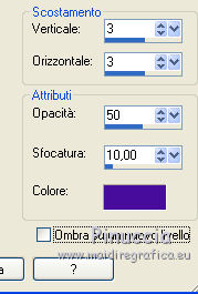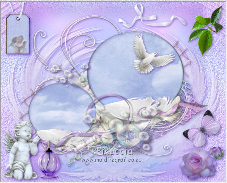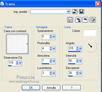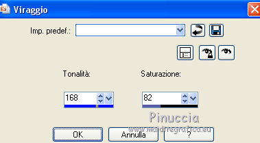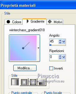 qui puoi trovare qualche risposta ai tuoi dubbi. Se l'argomento che ti interessa non è presente, ti prego di segnalarmelo. Questo tutorial è una creazione di ©Titoune e non può essere copiato su altri siti nè essere offerto per il download. Lo stesso vale per la mia traduzione. Il tutorial è stato creato con PSP X5, ma può essere eseguito anche con le altre versioni di PSP. Secondo la versione utilizzata (anteriore a PSP X) potresti ottenere dei risultati differenti. Dalla versione X4, il comando Immagine>Rifletti è stato sostituito con Immagine>Capovolgi in orizzontale, e il comando Immagine>Capovolgi con Immagine>Capovolgi in verticale. Nelle versioni X5 e X6, le funzioni sono state migliorate rendendo disponibile il menu Oggetti. Vedi la scheda sull'argomento qui Per tradure il tutorial ho usato PSP X. Occorrente: Un tube a scelta. Il resto del materiale qui Il tube utilizzato è di Zenyra ![]() Metti il gradiente nella cartella Gradienti. Metti la selezione nella cartella Selezioni. 1. Passa il colore di primo piano a Gradiente, e seleziona il gradiente winterchaos_gradient018, stile Lineare. ![]() 2. Apri una nuova immagine trasparente 750 x 600 pixels, e riempila con il gradiente.3. Effetti>Effetti di trama>Plastica morbida. ![]() Livelli>Duplica. Immagine>Rifletti. Abbassa l'opacità di questo livello al 50%. Livelli>Unisci>Unisci giù. 4. Selezione>Carica/Salva selezione>Carica selezione da disco. Cerca e carica la selezione selection_tag_lenvol. ![]() Selezione>Innalza selezione a livello. Selezione>Deseleziona. Regola>Sfocatura>Sfocatura gaussiana - raggio 25. ![]() 5. Effetti>Effetti di trama>Trama - seleziona la trama Carta con contrasti, con i seguenti settaggi. ![]() 6. Effetti>Effetti 3D>Sfalsa ombra, colore #470e9b. ![]() Livelli>Duplica. Immagine>Ruota per gradi - 90 gradi a sinistra. ![]() 7. Apri l'elemento "element 21", e vai a Modifica>Copia. Torna al tuo lavoro e vai a Modifica>Incolla come nuovo livello. Spostalo in basso a sinistra.![]() 8. Effetti>Effetti di riflesso>Specchio rotante. ![]() 9. Effetti>Effetti di distorsione>Coordinate polari. ![]() 10. Regola>Tonalità e saturazione>Viraggio. ![]() Effetti>Effetti 3D>Sfalsa ombra, con i settaggi precedenti. 11. Apri l'elemento RKROE_JoyfulAwakening_photocluster1, e vai a Modifica>Copia. Torna al tuo lavoro e vai a Modifica>Incolla come nuovo livello. Non spostarlo. 12. Attiva lo strumento Bacchetta magica ![]() e clicca nelle due parti del cluster per selezionarle. Sarà necessario cliccare più volte per selezionare completamente le parti. ![]() Selezione>Modifica>Espandi - 2 pixels. 13. Livelli>Nuovo livello raster. Livelli>Disponi>Sposta giù. 14. Apri l'elemento paper 4, e vai a Modifica>Copia. Torna al tuo lavoro e vai a Modifica>Incolla nella selezione. Selezione>Deseleziona. 15. Attiva il livello del cluster. Effetti>Effetti 3D>Sfalsa ombra, con i settaggi precedenti. 16. Apri l'elemento "element 2", e vai a Modifica>Copia. Torna al tuo lavoro e vai a Modifica>Incolla come nuovo livello. Spostalo in basso a destra.Vedi l'esempio finale. Effetti>Effetti 3D>Sfalsa ombra, con i settaggi precedenti. 17. Apri 'elemento "element 12", e vai a Modifica>Copia. Torna al tuo lavoro e vai a Modifica>Incolla come nuovo livello. Spostalo in basso a destra.![]() Effetti>Effetti 3D>Sfalsa ombra, con i settaggi precedenti. 18. Apri l'elemento "element 10", e vai a Modifica>Copia. Torna al tuo lavoro e vai a Modifica>Incolla come nuovo livello. Spostalo in alto a destra.Vedi l'esempio finale. Effetti>Effetti 3D>Sfalsa ombra, con i settaggi precedenti. 19. Apri l'elemento "element 20", e vai a Modifica>Copia. Torna al tuo lavoro e vai a Modifica>Incolla come nuovo livello. Spostalo nella parte superiore del cluster.![]() Effetti>Effetti 3D>Sfalsa ombra, con i settaggi precedenti. 20. Apri l'elemento "element 19", e vai a Modifica>Copia. Torna al tuo lavoro e vai a Modifica>Incolla come nuovo livello. Spostalo in alto.Vedi l'esempio finale. Effetti>Effetti 3D>Sfalsa ombra, con i settaggi precedenti. 21. Apri l'elemento "element 23", e vai a Modifica>Copia. Torna al tuo lavoro e vai a Modifica>Incolla come nuovo livello. Spostalo in alto a sinistra.![]() Effetti>Effetti 3D>Sfalsa ombra, con i settaggi precedenti. 22. Apri l'elemento "element 14", e vai a Modifica>Copia. Torna al tuo lavoro e vai a Modifica>Incolla come nuovo livello. Spostalo in basso a sinistra.Vedi l'esempio finale. Effetti>Effetti 3D>Sfalsa ombra, con i settaggi precedenti. 23. Apri l'elemento "element 26", e vai a Modifica>Copia. Torna al tuo lavoro e vai a Modifica>Incolla come nuovo livello. Spostalo in basso a sinistra.![]() Effetti>Effetti 3D>Sfalsa ombra, con i settaggi precedenti. 24. Apri il tuo tube e vai a Modifica>Copia. Torna al tuo lavoro e vai a Modifica>Incolla come nuovo livello. Immagine>Ridimensiona, se e quanto necessario, tutti i livelli non selezionato. Spostalo dove preferisci,o vedi l mio esempio. Effetti>Effetti 3D>Sfalsa ombra, con i settaggi precedenti. 25. Attiva il livello Raster 1. Modifica>Copia. Selezione>Seleziona tutto. Immagine>Ritaglia la selezione. 26. Immagine>Dimensioni tela - 800 x 650 pixels. ![]() 27. Livelli>nuovo livello raster. Livelli>Disponi>Sposta giù. Selezione>Seleziona tutto. Modifica>Incolla nella selezione. 28. Selezione>Modifica>Contrai - 25 pixels. Selezione>Inverti. 29. Effetti>Effetti 3D>Smusso a incasso. ![]() Selezione>Innalza selezione a livello. Livelli>Disponi>Porta in alto. Effetti>Effetti 3D>Sfalsa ombra, con i settaggi precedenti. Selezione>Deseleziona. 30. Apri l'elemento frame2, e vai a Modifica>Copia. Torna al tuo lavoro e vai a Modifica>Incolla come nuovo livello. Effetti>Effetti 3D>Sfalsa ombra, con i settaggi precedenti. Firma il tuo lavoro. Livelli>Unisci>Unisci tutto e salva in formato jpg. ![]() Se hai problemi o dubbi, o trovi un link non funzionante, scrivimi. 1 Giugno 2014 |