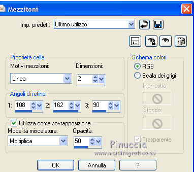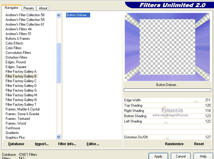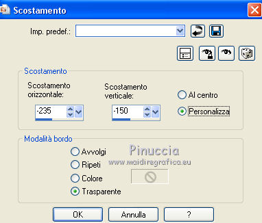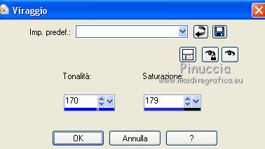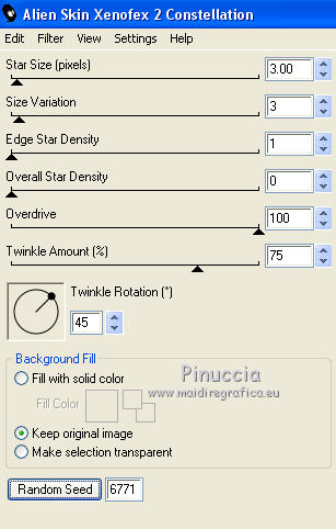 qui puoi trovare qualche risposta ai tuoi dubbi. Se l'argomento che ti interessa non è presente, ti prego di segnalarmelo. Questo tutorial è una creazione di ©Titoune e non può essere copiato su altri siti nè essere offerto per il download. Lo stesso vale per la mia traduzione. Il tutorial è stato creato con PSP X5, ma può essere eseguito anche con le altre versioni di PSP. Secondo la versione utilizzata (anteriore a PSP X) potresti ottenere dei risultati differenti. Vedi la mia scheda riguardante le funzioni Rifletti>Capovolgi in X4 e X5 qui Per tradure il tutorial ho usato PSP X. Occorrente: Un tube a scelta. Il resto del materiale qui Filtri Filters Unlimited 2.0 qui Filter Factory Gallery B - Buttom Deluxe qui Alien Skin Xenofex 2.0 - Constellation qui Animation Shop qui ![]() 1. Scegli un colore dal tuo tube e impostalo come colore di primo piano. Prendi nota dei valori di Tonalità (H) e Saturazione (S) di questo colore, che ti serviranno per colorizzare gli elementi dello scrap. Per l'esempio #5557e1. 2. Apri una nuova immagine trasparente 750 x 600 pixels. Selezione>Seleziona tutto. 3. Apri l'elemento paper 6 e vai a Modifica>Copia. Torna al tuo lavoro e vai a Modifica>Incolla nella selezione. Selezione>Modifica>Contrai - 45 pixels. Selezione>Inverti. Selezione>Innalza selezione a livello. 4. Effetti>Plugins>Filters Unlimited 2.0 - Filter Factory Gallery B - Buttom Deluxe, con i settaggi standard. ![]() Effetti>Effetti di bordo>Aumenta. 5. Effetti>Effetti 3D>Smusso a incasso. ![]() 6. Effetti>Effetti 3D>Sfalsa ombra - colore #263b9a. ![]() Mantieni selezionato. 7. Attiva il livello Raster 1. Effetti>Effetti artistici>Mezzitoni. ![]() Selezione>Deseleziona. 8. Apri l'elemento "element20" e vai a Modifica>Copia. Torna al tuo lavoro e vai a Modifica>Incolla come nuovo livello. Non spostarlo. Rinomina questo livello "animazione". 9. Attiva il livello superiore. Apri l'elemento "element 23" e vai a Modifica>Copia. Torna al tuo lavoro e vai a Modifica>Incolla come nuovo livello. 10. Regola>Tonalità e saturazione>Viraggio, e trascrivi nelle rispettive caselle i valori annotati del colore scelto. ![]() Immagine>Rifletti. 11. Effetti>Effetti di immagine>Scostamento. ![]() Effetti>Effetti 3D>Sfalsa ombra, con i settaggi precedenti. 12. Apri l'elemento "element 12" e vai a Modifica>Copia. Torna al tuo lavoro e vai a Modifica>Incolla come nuovo livello. Regola>Tonalità e saturazione>Viraggio, con i settaggi precedenti. 13. Effetti>Effetti di immagine>Scostamento. ![]() Effetti>Effetti 3D>Sfalsa ombra, con i settaggi precedenti. 14. Apri l'elemento "element 13" e vai a Modifica>Copia. Torna al tuo lavoro e vai a Modifica>Incolla come nuovo livello. Regola>Tonalità e saturazione>Viraggio, con i settaggi precedenti. 15. Effetti>Effetti di immagine>Scostamento. ![]() Effetti>Effetti 3D>Sfalsa ombra, con i settaggi precedenti. 16. Apri l'elemento "element 9" e vai a Modifica>Copia. Torna al tuo lavoro e vai a Modifica>Incolla come nuovo livello. Spostalo in basso.Vedi l'esempio finale. Effetti>Effetti 3D>Sfalsa ombra, con i settaggi precedenti. 17. Apri l'element "element 2" e vai a Modifica>Copia. Torna al tuo lavoro e vai a Modifica>Incolla come nuovo livello. Spostalo in basso a destra.Vedi l'esempio finale. Effetti>Effetti 3D>Sfalsa ombra, con i settaggi precedenti. 18. Apri l'elemento "element 5" e vai a Modifica>Copia. Torna al tuo lavoro e vai a Modifica>Incolla come nuovo livello. Regola>Tonalità e saturazione>viraggio, con i settaggi precedenti. Spostalo in alto a destra.Vedi l'esempio finale. Nessun Effetto Sfalsa ombra. 19. Apri l'elemento "element 1" e vai a Modifica>Copia. Torna al tuo lavoro e vai a Modifica>Incolla come nuovo livello. Spostalo in alto a sinistra.Vedi l'esempio finale. Effetti>Effetti 3D>Sfalsa ombra, con i settaggi precedenti. 20. Apri l'elemento "element 21" e vai a Modifica>Copia. Torna al tuo lavoro e vai a Modifica>Incolla come nuovo livello. Spostalo a sinistra.Vedi l'esempio finale. Effetti>Effetti 3D>Sfalsa ombra, con i settaggi precedenti. 21. Apri l'elemento "element 14" e vai a Modifica>Copia. Torna al tuo lavoro e vai a Modifica>Incolla come nuovo livello. Sposta l'elemento in basso a sinistra.Vedi l'esempio finale. Effetti>Effetti 3D>Sfalsa ombra, con i settaggi precedenti. 22. Apri il tuo tube e vai a Modifica>Copia. Torna al tuo lavoro e vai a Modifica>Incolla come nuovo livello. Immagine>Ridimensiona, se e quanto necessario, tutti i livelli non selezionato. Spostalo dove preferisci,o vedi il mio esempio. Effetti>Effetti 3D>Sfalsa ombra, con i settaggi precedenti. Firma il tuo lavoro. 23. Animazione. Attiva il livello "animazione". Livelli>Duplica - 2 volte e rimani posizionato sul livello della seconda copia. Effetti>Plugins>Alien Skin Xenofex 2.0 - Constellation. ![]() Chiudi questo livello e attiva il livello sottostante della prima copia. Effetti>Plugins>Alien Skin Xenofex 2.0 - Constellation, clicca su Random Seed e ok. Chiudi questo livello e attiva il livello "animazione". Effetti>Plugins>Alien Skin Xenofex 2.0 - Constellation, clicca su Random Seed e ok. Lascia il livello visibile. 24. Modifica>Copia Unione. Apri Animation Shop e vai a Modifica>Incolla>Incolla come nuova animazione. 25. Torna in PSP. Chiudi il livello "animazione" e apri il livello della prima copia. Modifica>Copia Unione. Torna in Animation Shop e vai a Modifica>Incolla>Incolla dopo il fotogramma corrente. 26. Di nuovo in PSP. Chiudi il livello della prima copia e apri il livello della seconda copia. Modifica>Copia Unione. In Animation Shop: Modifica>Incolla>Incolla dopo il fotogramma corrente. Controlla il risultato cliccando su Visualizza e salva in formato gif