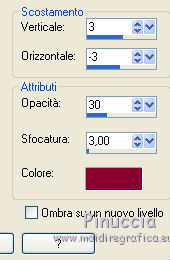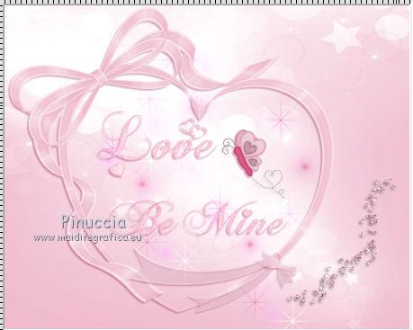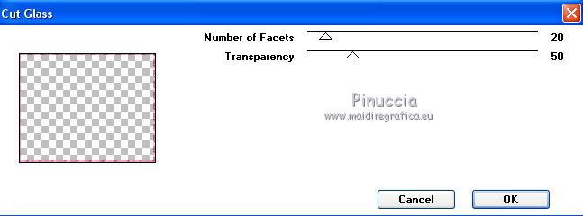 qui puoi trovare qualche risposta ai tuoi dubbi. Se l'argomento che ti interessa non è presente, ti prego di segnalarmelo. Questo tutorial è una creazione di ©Titoune e non può essere copiato su altri siti nè essere offerto per il download. Lo stesso vale per la mia traduzione. Il tutorial è stato creato con PSP X5, ma può essere eseguito anche con le altre versioni di PSP. Secondo la versione utilizzata (anteriore a PSP X) potresti ottenere dei risultati differenti. Dalla versione X4, il comando Immagine>Rifletti è stato sostituito con Immagine>Capovolgi in orizzontale, e il comando Immagine>Capovolgi con Immagine>Capovolgi in verticale. Nelle versioni X5 e X6, le funzioni sono state migliorate rendendo disponibile il menu Oggetti. Con il nuovo X7 sono tornati i comandi Rifletti/Capovolgi, ma con nuove differenze. Vedi la scheda sull'argomento qui Per tradurre il tutorial ho usato PSP X. Occorrente: Un tube a scelta. Il resto del materiale qui Gli elementi scrap sono una creazione "ZaZa Scrap and Tubes". Filtri in caso di dubbi, ricorda di consultare la mia sezione filtri qui Graphics Plus - Cut Glass qui Filters Unlimited 2.0 qui I filtri Graphics Plus si possono usare da soli o importati in Filters Unlimited (come fare vedi qui) Se un filtro fornito appare con questa icona ![]() Metti la trama Tilerose nella cartella Trame. 1. Apri una nuova immagine trasparente 750 x 600 pixels. Selezione>Seleziona tutto. 2. Apri l'elemento Love is in the air_Paper 3_Scrap and Tubes, e vai a Modifica>Copia. Torna al tuo lavoro e vai a Modifica>Incolla nella selezione. Selezione>Deseleziona. 3. Apri l'elemento Love is in the air_Lace Heart 1_Scrap and Tubes, e vai a Modifica>Copia. Torna al tuo lavoro e vai a Modifica>Incolla come nuovo livello. Spostalo in alto a sinistra.Vedi l'esempio finale. 4. Effetti>Effetti 3D>Sfalsa ombra, colore #890030. ![]() 5. Apri l'elemento Love is in the air_Sparkles_Scrap and Tubes, e vai a Modifica>Copia. Torna al tuo lavoro e vai a Modifica>Incolla come nuovo livello. Lascialo come sta. Porta questo livello sotto il livello della cornice. Nessun Effetto Sfalsa ombra. 6. Attiva il livello superiore della cornice. Apri l'elemento Love is in the air_Hearts Spill_Scrap and Tubes, e vai a Modifica>Copia. Torna al tuo lavoro e vai a Modifica>Incolla come nuovo livello. Immagine>Rifletti. Spostalo in basso a destra.Vedi l'esempio finale. Niente Sfalsa ombra. 7. Copia e incolla sul tuo lavoro gli elementi: Love is in the air_Wordart 1_Scrap and Tubes e Love is in the air_Wordart 2_Scrap and Tubes. Spostali al centro della cornice.![]() Effetti>Effetti 3D>Sfalsa ombra, con i settaggi precedenti. 8. Apri l'elemento Love is in the air_Butterfly_Scrap and Tubes, e vai a Modifica>Copia. Torna al tuo lavoro e vai a Modifica>Incolla come nuovo livello. Spostalo nella cornice.Vedi l'esempio finale. Effetti>Effetti 3D>Sfalsa ombra, con i settaggi precedenti. 9. Apri l'elemento Love is in the air_Ribbon 1_Scrap and Tubes, e vai a Modifica>Copia. Torna al tuo lavoro e vai a Modifica>Incolla come nuovo livello. Spostalo nella parte inferiore della cornice.![]() Effetti>Effetti 3D>Sfalsa ombra, con i settaggi precedenti. 10. Apri l'elemento Love is in the air_Rose 3_Scrap and Tubes, e vai a Modifica>Copia. Torna al tuo lavoro e vai a Modifica>Incolla come nuovo livello. Spostalo nella parte inferiore sinistra della cornice.Vedi l'esempio finale. Effetti>Effetti 3D>Sfalsa ombra, con i settaggi precedenti. 11. Apri l'elemento Love is in the air_Chocolate Box_Scrap and Tubes, e vai a Modifica>Copia. Torna al tuo lavoro e vai a Modifica>Incolla come nuovo livello. Spostalo nella parte inferiore sinistra della cornice.Vedi l'esempio finale. Effetti>Effetti 3D>Sfalsa ombra, con i settaggi precedenti. 12. Apri l'elemento Love is in the air_Hearts_Scrap and Tubes, e vai a Modifica>Copia. Torna al tuo lavoro e vai a Modifica>Incolla come nuovo livello. Spostalo nella parte superiore destra della cornice.Vedi l'esempio finale. Effetti>Effetti 3D>Sfalsa ombra, con i settaggi precedenti. 13. Apri l'elemento Love is in the air_Rose 5_Scrap and Tubes, e vai a Modifica>Copia. Torna al tuo lavoro e vai a Modifica>Incolla come nuovo livello. Spostalo nella parte sinistra della cornice.Vedi l'esempio finale. Effetti>Effetti 3D>Sfalsa ombra, con i settaggi precedenti. 14. Apri l'elemento Love is in the air_Rose 1_Scrap and Tubes, e vai a Modifica>Copia. Torna al tuo lavoro e vai a Modifica>Incolla come nuovo livello. Spostalo nella parte superiore sinistra della cornice.![]() Effetti>Effetti 3D>Sfalsa ombra, con i settaggi precedenti. 15. Apri il tuo tube, e vai a Modifica>Copia. Torna al tuo lavoro e vai a Modifica>Incolla come nuovo livello. Immagine>Ridimensiona, se e quanto necessario, tutti i livelli non selezionato. Spostalo dove preferisci o vedi il mio esempio.Effetti>Effetti 3D>Sfalsa ombra, con i settaggi precedenti. 16. Assicurati di essere posizionato sul livello superiore. Imposta il colore di primo piano con #d55d86. Livelli>Nuovo livello raster. Riempi con il colore di primo piano.17. Selezione>Seleziona tutto. Selezione>Modifica>Contrai - 3 pixels. Premi sulla tastiera il tasto CANC ![]() Selezione>Inverti. Effetti>Plugins>Graphics Plus - Cut Glass, con i settaggi standard. ![]() Selezione>Deseleziona. Effetti>Effetti 3D>Sfalsa ombra, con i settaggi precedenti. 18. Attiva il livello inferiore. Modifica>Copia. Selezione>Selezionato tutto. Immagine>Ritaglia la selezione. 19. Immagine>Dimensioni tela - 800 x 650 pixels. ![]() 20. Livelli>Nuovo livello raster. Livelli>Disponi>Sposta giù. Selezione>Seleziona tutto. Modifica>Incolla nella selezione. 21. Selezione>Modifica>Contrai - 25 pixels. Selezione>Inverti. Selezione>Innalza selezione a livello. 22. Effetti>Effetti di trama>Trama - seleziona la trama Tilerose. ![]() Selezione>Deseleziona. 23. Attiva il livello superiore. Apri l'elemento borders, e vai a Modifica>Copia. Torna al tuo lavoro e vai a Modifica>Incolla come nuovo livello. 