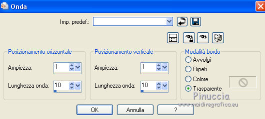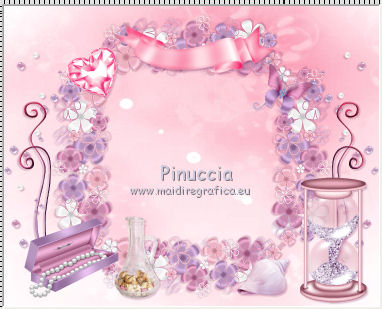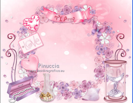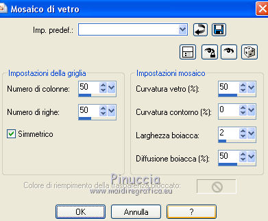 qui puoi trovare qualche risposta ai tuoi dubbi. Se l'argomento che ti interessa non è presente, ti prego di segnalarmelo. Questo tutorial è una creazione di ©Titoune e non può essere copiato su altri siti nè essere offerto per il download. Lo stesso vale per la mia traduzione. Il tutorial è stato creato con PSP X5, ma può essere eseguito anche con le altre versioni di PSP. Secondo la versione utilizzata (anteriore a PSP X) potresti ottenere dei risultati differenti. Dalla versione X4, il comando Immagine>Rifletti è stato sostituito con Immagine>Capovolgi in orizzontale, e il comando Immagine>Capovolgi con Immagine>Capovolgi in verticale. Nelle versioni X5 e X6, le funzioni sono state migliorate rendendo disponibile il menu Oggetti. Con il nuovo X7 sono tornati i comandi Rifletti/Capovolgi, ma con nuove differenze. Vedi la scheda sull'argomento qui Per tradurre il tutorial ho usato PSP X. Occorrente: Un tube a scelta. Il resto del materiale qui Filtri in caso di dubbi, ricorda di consultare la mia sezione filtri qui Filters Unlimited 2.0 qui Penta.com - Dot and Cross qui I filtri Penta.com si possono usare da soli o importati in Filters Unlimited (come fare vedi qui) Se un filtro fornito appare con questa icona ![]() 1. Apri una nuova immagine trasparente 750 x 600 pixels. Selezione>Seleziona tutto. 2. apri l'elemento hpd_P&P_P13 e vai a Modifica>Copia. Torna al tuo lavoro e vai a Modifica>Incolla nella selezione. Selezione>Deseleziona. 3. Apri l'elemento hpd_P&P_El45 e vai a Modifica>Copia. Torna al tuo lavoro e vai a Modifica>Incolla come nuovo livello. 4. Effetti>Effetti di immagine>Scostamento. ![]() Livelli>Duplica. Immagine>Rifletti. Livelli>Unisci>Unisci giù. 5. Livelli>Duplica. Immagine>Ruota per gradi - 90 gradi a sinistra. ![]() Livelli>Unisci>Unisci giù. 6. Immagine>Ridimensiona, all'85%, tutti i livelli non selezionato. Regola>Messa a fuoco>Metti a fuoco. 7. Effetti>Effetti 3D>Sfalsa ombra, colore #944672. ![]() Ripeti l'Effetto Sfalsa ombra, cambiando verticale e orizzontale con -3. 8. Attiva il livello Raster 1. Apri l'elemento hpd_P&P_El18 e vai a Modifica>Copia. Torna al tuo lavoro e vai a Modifica>Incolla come nuovo livello. Spostalo a sinistra.Vedi l'esempio finale. Effetti>Effetti 3D>Sfalsa ombra, colore #944672. ![]() Livelli>Duplica. Immagine>Rifletti. 9. Attiva il livello superiore. Apri l'elemento hpd_P&P_El61 e vai a Modifica>Copia. Torna al tuo lavoro e vai a Modifica>Incolla come nuovo livello. Spostalo a destra.![]() Effetti>Effetti 3D>Sfalsa ombra, con i settaggi precedenti. Livelli>Duplica. Immagine>Rifletti. 10. Apri l'elemento hpd_P&P_El50 e vai a Modifica>Copia. Torna al tuo lavoro e vai a Modifica>Incolla come nuovo livello. Spostalo in alto al centro.Vedi l'esempio finale. Effetti>Effetti 3D>Sfalsa ombra, con i settaggi precedenti. 11. Apri l'elemento hpd_P&P_El54 e vai a Modifica>Copia. Torna al tuo lavoro e vai a Modifica>Incolla come nuovo livello. Spostalo in alto a sinistra.Vedi l'esempio finale. Effetti>Effetti 3D>Sfalsa ombra, con i settaggi precedenti. 12. Apri l'elemento hpd_P&P_El1 e vai a Modifica>Copia. Torna al tuo lavoro e vai a Modifica>Incolla come nuovo livello. Spostalo in alto a destra.![]() Effetti>Effetti 3D>Sfalsa ombra, con i settaggi precedenti. 13. Apri l'elemento hpd_P&P_El14 e vai a Modifica>Copia. Torna al tuo lavoro e vai a Modifica>Incolla come nuovo livello. Spostalo in basso a destra.Vedi l'esempio finale. Effetti>Effetti 3D>Sfalsa ombra, con i settaggi precedenti. 14. Apri l'elemento hpd_P&P_El21 e vai a Modifica>Copia. Torna al tuo lavoro e vai a Modifica>Incolla come nuovo livello. Spostalo in basso a destra.Vedi l'esempio finale. Effetti>Effetti 3D>Sfalsa ombra, con i settaggi precedenti. 15. Apri l'elemento hpd_P&P_El20 e vai a Modifica>Copia. Torna al tuo lavoro e vai a Modifica>Incolla come nuovo livello. Spostalo in basso a sinistra.Vedi l'esempio finale. Effetti>Effetti 3D>Sfalsa ombra, con i settaggi precedenti. 16. Apri l'elemento hpd_P&P_El34 e vai a Modifica>Copia. Torna al tuo lavoro e vai a Modifica>Incolla come nuovo livello. Spostalo in basso a sinistra.![]() Effetti>Effetti 3D>Sfalsa ombra, con i settaggi precedenti. 17. Apri l'elemento hpd_P&P_El46 e vai a Modifica>Copia. Torna al tuo lavoro e vai a Modifica>Incolla come nuovo livello. Spostalo a sinistra.Vedi l'esempio finale. Effetti>Effetti 3D>Sfalsa ombra, con i settaggi precedenti. 18. Apri l'elemento wordart_love e vai a Modifica>Copia. Torna al tuo lavoro e vai a Modifica>Incolla come nuovo livello. Spostalo sull'elemento precedente.Vedi l'esempio finale. Effetti>Effetti 3D>Sfalsa ombra, con i settaggi precedenti. 19. Apri l'elemento wordart_tiamo e vai a Modifica>Copia. Torna al tuo lavoro e vai a Modifica>Incolla come nuovo livello. Spostalo in alto, sullo striscione.![]() Effetti>Effetti 3D>Sfalsa ombra, con i settaggi precedenti. 20. Apri il tuo tube e vai a Modifica>Copia. Torna al tuo lavoro e vai a Modifica>Incolla come nuovo livello. Immagine>Ridimensiona, se e quanto necessario, tutti i livelli non selezionato. Spostalo dove preferisci o vedi il mio esempio.Effetti>Effetti 3D>Sfalsa ombra, con i settaggi precedenti. 21. Attiva il livello inferiore. Selezione>Seleziona tutto. Selezione>Modifica>Contrai - 5 pixels. Selezione>Inverti. Livelli>Nuovo livello raster. 22. Apri l'elemento hpd_P&P_P15 e vai a Modifica>Copia. Torna al tuo lavoro e vai a Modifica>Incolla nella selezione. 23. Effetti>Plugins>Penta.com - Dot and Cross, con i settaggi standard. ![]() Selezione>Deseleziona. Effetti>Effetti di bordo>Aumenta. Effetti>Effetti 3D>Sfalsa ombra, con i settaggi precedenti. 24. Livelli>Duplica. Attiva il livello sottostante dell'originale. Immagine>Ridimensiona, al 95%, tutti i livelli non selezionato. 25. Effetti>Effetti di trama>mosaico di vetro. ![]() 26. Effetti>Effetti di distorsione>Onda. ![]() 27. Effetti>Effetti di riflesso>Specchio rotante. ![]() Effetti>Effetti 3D>Sfalsa ombra, con i settaggi precedenti. Abbassa l'opacità d