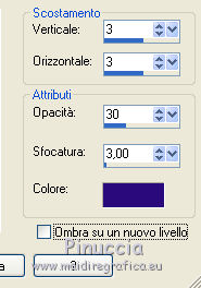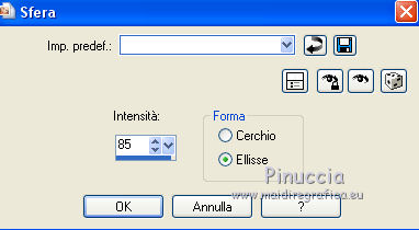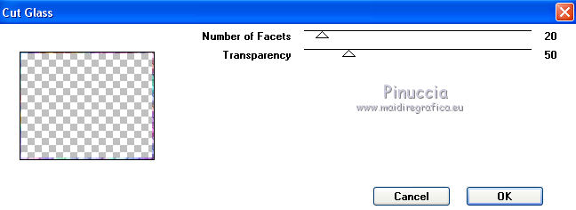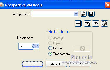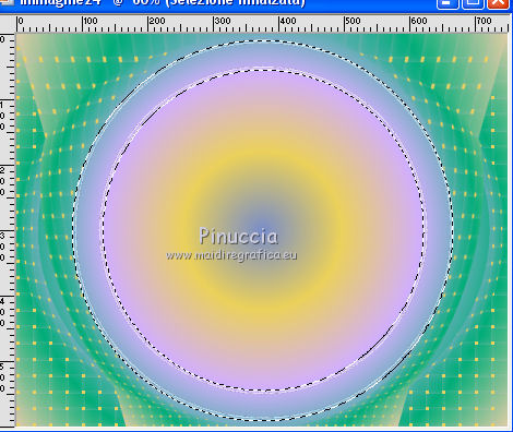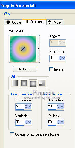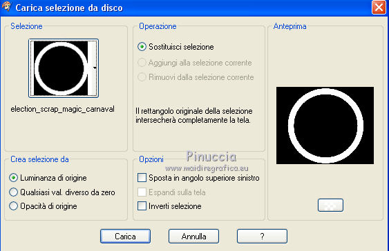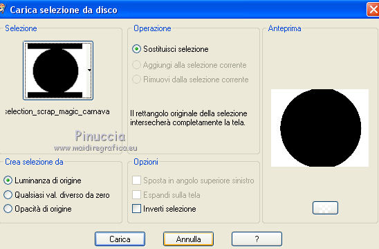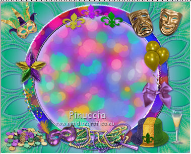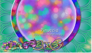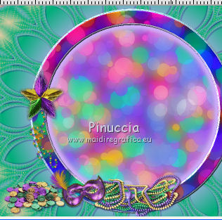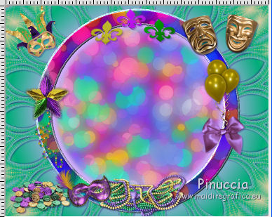 qui puoi trovare qualche risposta ai tuoi dubbi. Se l'argomento che ti interessa non è presente, ti prego di segnalarmelo. Questo tutorial è una creazione di ©Titoune e non può essere copiato su altri siti nè essere offerto per il download. Lo stesso vale per la mia traduzione. Il tutorial è stato creato con PSP X5, ma può essere eseguito anche con le altre versioni di PSP. Secondo la versione utilizzata (anteriore a PSP X) potresti ottenere dei risultati differenti. Dalla versione X4, il comando Immagine>Rifletti è stato sostituito con Immagine>Capovolgi in orizzontale, e il comando Immagine>Capovolgi con Immagine>Capovolgi in verticale. Nelle versioni X5 e X6, le funzioni sono state migliorate rendendo disponibile il menu Oggetti. Con il nuovo X7 sono tornati i comandi Rifletti/Capovolgi, ma con nuove differenze. Vedi la scheda sull'argomento qui Per tradurre il tutorial ho usato PSP X. Occorrente: Un tube a scelta. Il resto del materiale qui Filtri in caso di dubbi, ricorda di consultare la mia sezione filtri qui Graphics Plus - Cut Glass qui Adjust - Variations qui Filters Unlimited 2.0 qui I filtri Graphics Plus si possono usare da soli o importati in Filters Unlimited (come fare vedi qui) Se un filtro fornito appare con questa icona ![]() Metti le selezioni nella cartella Selezioni. Metti il gradiente nella cartella Grazienti. 1. Passa il colore di primo piano a Gradiente, e seleziona il gradiente carnaval2. ![]() 2. Apri una nuova immagine trasparente 750 x 600 pixels, e riempila con il gradiente.3. Selezione>Carica/Salva selezione>Carica selezione da disco. Cerca e carica la selezione "selection_scrap_magic_carnaval". ![]() Selezione>Innalza selezione a livello. 4. Effetti>Effetti di trama>Intessitura. colore intessitura #d9b9cc - colore spazio #ead05f. ![]() 5. Effetti>Effetti geometrici>Prospettiva verticale. ![]() Selezione>Deseleziona. 6. Effetti>Effetti geometrici>Sfera. ![]() Rinomina questo livello "intessitura". 7. Attiva il livello Raster 1. Selezione>Carica/Salva selezione>Carica selezione da disco. Cerca e carica la selezione "selection_scrap_magic_carnaval2". ![]() Selezione>Innalza selezione a livello. Livelli>Disponi>Porta in alto. 8. Attiva nuovamente il livello Raster 1. Selezione>Modifica>Seleziona bordature selezione. ![]() Selezione>Innalza selezione a livello. Livelli>Disponi>Porta in alto. 9. Regola>Aggiungi/Rimuovi disturbo>Aggiungi disturbo. ![]() Selezione>Deseleziona. Effetti>Effetti di bordo>Aumenta. 10. Attiva il livello sottostante. Attiva lo strumento Bacchetta magica ![]() imposta la tolleranza quanto necessario (20-30) e clicca nel bordo per selezionarlo ![]() 11. Livelli>Nuovo livello raster. Apri l'elemento nfbv0rk, e vai a Modifica>Copia. Torna al tuo lavoro e vai a Modifica>Incolla nella selezione. 12. Effetti>Plugins>Adjust - Variations un clic su Original per annullare eventuali precedenti settaggi memorizzati dal filtro, tre clic su Darker e ok. 13. Effetti>Effetti 3D>Smusso a incasso. ![]() Selezione>Deseleziona. 14. Attiva il livello superiore. Livelli>Unisci>Unisci giù - 2 volte. Effetti>Effetti 3D>Smusso a incasso, con i settaggi precedenti. 15. Clicca al centro della cornice con la bacchetta magica ![]() Selezione>Modifica>Contrai - 15 pixels. Selezione>Modifica>Sfuma - 15 pixels. 16. Livelli>Nuovo livello raster. Livelli>Disponi>Sposta giù. Modifica>Incolla nella selezione (l'elemento nfbv0rk è sempre in memoria). Selezione>Deseleziona. Abbassa l'opacità di questo livello al 50%. 17. Livelli>Duplica. Attiva il livello originale della cornice. Effetti>Effetti 3D>Sfalsa ombra, colore #2b0b7d. ![]() Ripeti l'Effetto Sfalsa ombra, cambiando verticale e orizzontale con -3. 18. Attiva il livello "intessitura". Effetti>Effetti di riflesso>Caleidoscopio. ![]() Effetti>Effetti 3D>Sfalsa ombra, con i settaggi precedenti. 19. Attiva lo strumento Selezione , rettangolo,o Selezione a mano libera ![]() e seleziona il cerchio visibile al centro della cornice. ![]() Premi sulla tastiera il tasto CANC ![]() Selezione>Deseleziona. 20. Attiva nuovamente il livello superiore. Apri l'elemento element3, e vai a Modifica>Copia. Torna al tuo lavoro e vai a Modifica>Incolla come nuovo livello. Spostalo nella parte inferiore della cornice.Vedi l'esempio finale. Effetti>Effetti 3D>Sfalsa ombra, colore #2b0b7d. ![]() 21. Apri element15, e vai a Modifica>Copia. Torna al tuo lavoro e vai a Modifica>Incolla come nuovo livello. Spostalo nella parte inferiore sinistra della cornice.Vedi l'esempio finale. Effetti>Effetti 3D>Sfalsa ombra, con i settaggi precedenti. 22. Apri element25, e vai a Modifica>Copia. Torna al tuo lavoro e vai a Modifica>Incolla come nuovo livello. Spostalo nella parte inferiore sinistra della cornice.![]() Effetti>Effetti 3D>Sfalsa ombra, con i settaggi precedenti. 23. Apri element9, e vai a Modifica>Copia. Torna al tuo lavoro e vai a Modifica>Incolla come nuovo livello. Spostalo nella parte sinistra della cornice.Vedi l'esempio finale. Effetti>Effetti 3D>Sfalsa ombra, con i settaggi precedenti. 24. Apri element20, e vai a Modifica>Copia. Torna al tuo lavoro e vai a Modifica>Incolla come nuovo livello. Spostalo nella parte sinistra della cornice.![]() Effetti>Effetti 3D>Sfalsa ombra, con i settaggi precedenti. 25. Apri element11, e vai a Modifica>Copia. Torna al tuo lavoro e vai a Modifica>Incolla come nuovo livello. Spostalo in alto a sinistra.Vedi l'esempio finale. Effetti>Effetti 3D>Sfalsa ombra, con i settaggi precedenti. 26. Apri element24, e vai a Modifica>Copia. Torna al tuo lavoro e vai a Modifica>Incolla come nuovo livello. Spostalo nella parte superiore della cornice.Vedi l'esempio finale. Effetti>Effetti 3D>Sfalsa ombra, con i settaggi precedenti. 27. Apri element17, e vai a Modifica>Copia. Torna al tuo lavoro e vai a Modifica>Incolla come nuovo livello. Spostalo nella parte superiore destra della cornice.Vedi l'esempio finale. Effetti>Effetti 3D>Sfalsa ombra, con i settaggi precedenti. 28. Apri element13, e vai a Modifica>