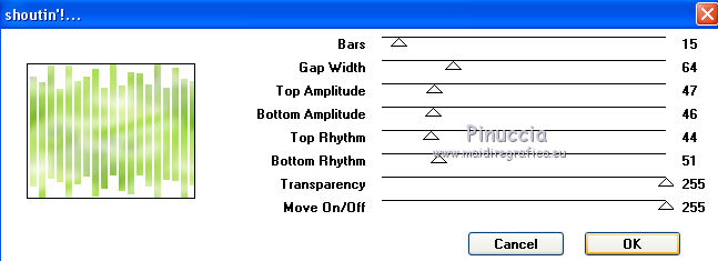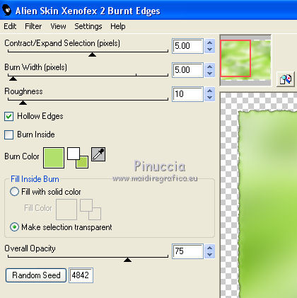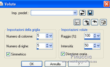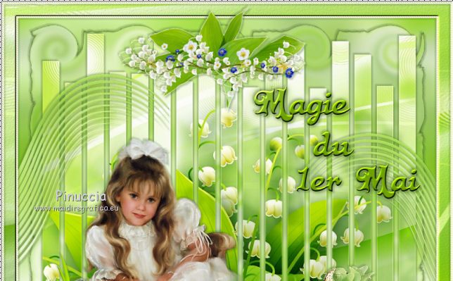 qui puoi trovare qualche risposta ai tuoi dubbi. Se l'argomento che ti interessa non è presente, ti prego di segnalarmelo. Questo tutorial è una creazione di ©Titoune e non può essere copiato su altri siti nè essere offerto per il download. Lo stesso vale per la mia traduzione. Il tutorial è stato creato con Corel17, ma può essere eseguito anche con le altre versioni di PSP. Secondo la versione utilizzata (anteriore a PSP X) potresti ottenere dei risultati differenti. Dalla versione X4, il comando Immagine>Rifletti è stato sostituito con Immagine>Capovolgi in orizzontale, e il comando Immagine>Capovolgi con Immagine>Capovolgi in verticale. Nelle versioni X5 e X6, le funzioni sono state migliorate rendendo disponibile il menu Oggetti. Con il nuovo X7 sono tornati i comandi Rifletti/Capovolgi, ma con nuove differenze. Vedi la scheda sull'argomento qui Per tradurre il tutorial ho usato PSP X. Occorrente: Un tube a scelta. Il resto del materiale qui Il tube utilizzato è di GranGran. Tube utilizzato "Martine_conseils" di Ded. Filtri in caso di dubbi, ricorda di consultare la mia sezione filtri qui VM Extravaganza - Shoutin qui Flaming Pear - Flood qui Alien Skin Xenofex 2 - Burnt Edges qui Penta.com - Jeans qui Filters Unlimited 2.0 qui I filtri VM Extravaganza e Penta.com si possono usare da soli o importati in Filters Unlimited (come fare vedi qui) Se un filtro fornito appare con questa icona ![]() Metti la trama nella cartella Trame. 1. Apri una nuova immagine trasparente 750 x 600 pixels. Selezione>Seleziona tutto. 2. Apri l'immagine tuile_depart e vai a Modifica>Copia. Torna al tuo lavoro e vai a Modifica>Incolla nella selezione. Selezione>Deseleziona. 3. Effetti>Effetti di immagine>Motivo unico, con i settaggi standard. ![]() 4. Regola>Sfocatura>Sfocatura gaussiana - raggio 15. ![]() Livelli>Duplica. Effetti>Plugins>VM Extravaganza - Shoutin, con i settaggi standard. ![]() 5. Attiva lo strumento Bacchetta magica ![]() e clicca nello spazio bianco per selezionarlo ![]() Premi sulla tastiera il tasto CANC ![]() Selezione>Inverti. 6. Apri l'immagine lilies-of-the-green-valley-48674 e vai a Modifica>Copia. Torna al tuo lavoro e vai a Modifica>Incolla nella selezione. Selezione>Deseleziona. 7. Immagine>Ridimensiona, al 90%, tutti i livelli non selezionato. Regola>Messa a fuoco>Metti a fuoco. 8. Livelli>Duplica. Attiva il livello sottostante dell'originale. Effetti>Plugins>Flaming Pear - Flood - colore #aed577. ![]() 9. Effetti>Effetti 3D>Sfalsa ombra, colore #3f6625. ![]() Ripeti l'Effetto Sfalsa ombra, cambiando verticale e orizzontale con -3. 10. Attiva il livello della copia, e cambia la modalità di miscelatura di questo livello in Luce diffusa. 11. Attiva il livello Raster 1. Selezione>Seleziona tutto. Selezione>Modifica>Contrai - 15 pixels. Selezione>Innalza selezione a livello. 12. Effetti>Plugins>Alien Skin Xenofex 2.0 - Burnt Edges colore #b1e06c. ![]() Selezione>Deseleziona. 13. Effetti>Effetti di distorsione>Volute. ![]() Effetti>Effetti 3D>Sfalsa ombra, con i settaggi precedenti. 14. Attiva il livello superiore. Apri l'elemento Doodles, e vai a Modifica>Copia. Torna al tuo lavoro e vai a Modifica>Incolla come nuovo livello. Lascialo come sta. Effetti>Effetti 3D>Sfalsa ombra, con i settaggi precedenti. 15. Apri l'elemento grass, e vai a Modifica>Copia. Torna al tuo lavoro e vai a Modifica>Incolla come nuovo livello. Spostalo in basso.Effetti>Effetti 3D>Sfalsa ombra, con i settaggi precedenti. 16. Apri l'elemento 03a12d72, e vai a Modifica>Copia. Torna al tuo lavoro e vai a Modifica>Incolla come nuovo livello. Spostalo in alto.Vedi l'esempio finale (alla fine del tutorial potrai posizionarlo meglio). Effetti>Effetti 3D>Sfalsa ombra, con i settaggi precedenti. 17. Apri l'elemento OBG_PROFUMO_16, e vai a Modifica>Copia. Torna al tuo lavoro e vai a Modifica>Incolla come nuovo livello. Immagine>Ridimensiona, al 35%, tutti i livelli non selezionato. Regola>Messa a fuoco>Metti a fuoco. Spostalo in basso.Vedi l'esempio finale. Effetti>Effetti 3D>Sfalsa ombra, con i settaggi precedenti. 18. Apri l'elemento Wordart_muguet, e vai a Modifica>Copia. Torna al tuo lavoro e vai a Modifica>Incolla come nuovo livello. Spostalo a destra.Vedi l'esempio finale. Effetti>Effetti 3D>Sfalsa ombra, con i settaggi precedenti. 19. Apri il tuo tube, e vai a Modifica>Copia. Torna al tuo lavoro e vai a Modifica>Incolla come nuovo livello. Immagine>Ridimensiona, se e quanto necessario, tutti i livelli non selezionato. Spostalo dove preferisci o vedi il mio esempio.Effetti>Effetti 3D>Sfalsa ombra, con i settaggi precedenti. 20. Imposta il colore di primo piano con #f4f5d4. Assicurati di essere posizionato sul livello superiore. Livelli>Nuovo livello raster. Riempi con il colore di primo piano #f4f5d4.21. Selezione>Seleziona tutto. Selezione>Modifica>Contrai - 3 pixels. Premi sulla tastiera il tasto CANC. Selezione>Deseleziona. Effetti>Plugins>Penta.com - Jeans, con i settaggi precedenti. ![]() Effetti>Effetti di bordo>Aumenta. Effetti>Effetti 3D>Sfalsa ombra, con i settaggi precedenti. 22. Attiva il livello inferiore. Selezione>Seleziona tutto. Immagine>Ritaglia la selezione. 23. Immagine>Dimensioni tela - 800 x 650 pixels. ![]() 24. Livelli>Nuovo livello raster. Livelli>Disponi>Sposta giù. Seleziona tutto. Apri nuovamente l'elemento tuile_depart, e vai a Modifica>Copia. Torna al tuo lavoro e vai a Modifica>Incolla nella selezione. 25. Selezione>Modifica>Contrai - 25 pixels. Selezione>Inverti. Selezione>Innalza selezione a livello. Selezione>Deseleziona. 26. Effetti>Effetti 3D>Smusso a incasso. ![]() 27. Effetti>Effetti di trama>Trama - seleziona la trama Tilerose, con i seguenti settaggi. ![]() 28. Attiva nuovamente il livello superiore. Livelli>Nuovo livello raster. Riempi con il colore di primo piano #f4f5d4.29. Selezione>Seleziona tutto. Selezione>Modifica>Contrai - 3 pixels. Premi sulla tastiera il tasto CANC. Selezione>Deseleziona. Effetti>Plugins>Penta.com - Jeans, con i settaggi standard. Effett