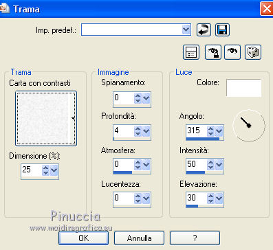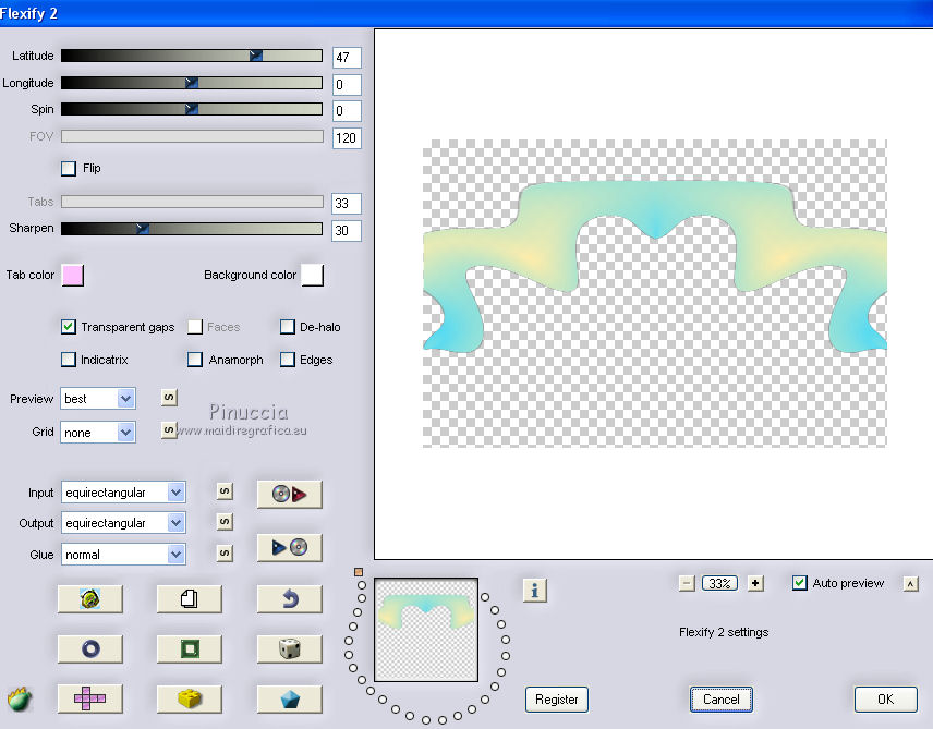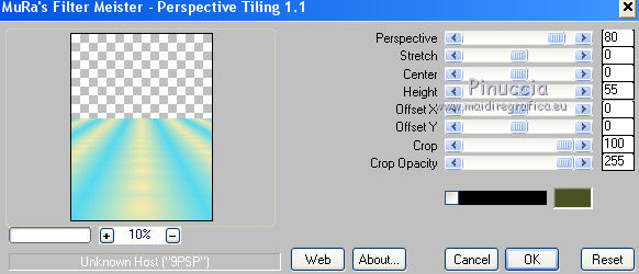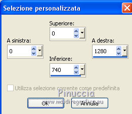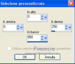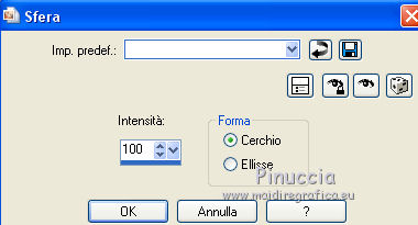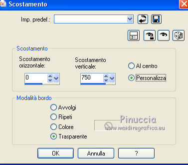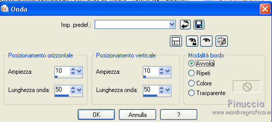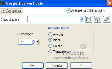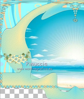 qui puoi trovare qualche risposta ai tuoi dubbi. Se l'argomento che ti interessa non è presente, ti prego di segnalarmelo. Questo tutorial è una creazione di ©Titoune e non può essere copiato su altri siti nè essere offerto per il download. Lo stesso vale per la mia traduzione. Il tutorial è stato creato con PSP X5, ma può essere eseguito anche con le altre versioni di PSP. Secondo la versione utilizzata (anteriore a PSP X) potresti ottenere dei risultati differenti. Dalla versione X4, il comando Immagine>Rifletti è stato sostituito con Immagine>Capovolgi in orizzontale, e il comando Immagine>Capovolgi con Immagine>Capovolgi in verticale. Nelle versioni X5 e X6, le funzioni sono state migliorate rendendo disponibile il menu Oggetti. Vedi la scheda sull'argomento qui Per tradurre il tutorial ho usato PSP X. Occorrente: Un tube a scelta. Il tube utilizzato è un poser di Medi. Il resto del materiale qui Gli elementi scrap sono una creazione Filtri in caso di dubbi, ricorda di consultare la mia sezione filtri qui Flaming Pear - Flexify 2 qui Mura's Meister - Perspective Tiling qui ![]() Apri la maschera in PSP e minimizzala con il resto del materiale. 1. Imposta il colore di primo piano con #ffedab, e il colore di sfondo con #56daf3. Passa il colore di primo piano a Gradiente di primo piano/sfondo, stile Sprazzo di luce. ![]() 2. Apri una nuova immagine trasparente 1280 x 850 pixels. Attiva lo strumento Selezione ![]() (non importa il tipo di selezione impostato, perchè con la selezione personalizzata si ottiene sempre un rettangolo) clicca sull'icona Selezione personalizzata ![]() e imposta i seguenti settaggi. ![]() Riempi la selezione con il gradiente.Selezione>Deseleziona. 3. Effetti>Effetti di distorsione>Onda. ![]() 4. Effetti>Effetti di riflesso>Specchio rotante. ![]() Effetti>Effetti di bordo>Aumenta. 5. Effetti>Plugins>Flaming Pear - Flexify 2. ![]() Immagine>Capovolgi. Sposta l'immagine in basso.Se stai usando CorelX15 o CorelX16: Oggetti>Allinea>Inferiore 6. Livelli>Duplica. Attiva il livello sottostante dell'originale. Effetti>Effetti di distorsione>Coordinate polari. ![]() Sposta l'immagine in alto.Se stai usando CorelX15 o CorelX16: Oggetti>Allinea>Superiore 7. Effetti>Effetti geometrici>Sfera. ![]() 8. Attiva il livello superiore. Effetti>Effetti geometrici>Prospettiva verticale. ![]() 9. Selezione personalizzata ![]() ![]() 10. Livelli>Nuovo livello raster. Livelli>Disponi>Porta sotto. 11. Apri l'elemento Paper 1 e vai a Modifica>Copia. Torna al tuo lavoro e vai a Modifica>Incolla nella selezione. Selezione>Deseleziona. 12. Attiva il livello superiore. Effetti>Effetti di trama>Trama - seleziona la trama Carta con contrasti, con i seguenti settaggi. ![]() Attiva il livello sottostante. Effetti>Effetti di trama>Trama, con i settaggi precedenti. 13. Assicurati di essere posizionato sul secondo livello dall'alto. Attiva lo strumento Bacchetta magica ![]() e clicca al centro dell'immagine. ![]() Livelli>Nuovo livello raster. Livelli>Disponi>Sposta giù. 14. Apri l'immagine imagesT2W5RGQ2 e vai a Modifica>Copia. Torna al tuo lavoro e vai a Modifica>Incolla nella selezione. Selezione>Deseleziona. 15. Sui livelli dei primi due elementi: Effetti>Effetti 3D>Sfalsa ombra, colore #175751. ![]() Ripeti l'Effetto Sfalsa ombra, cambiando verticale e orizzontale con -3. 16. Assicurati di essere posizionato sul livello superiore. Apri l'elemento pearls_border e vai a Modifica>Copia. Torna al tuo lavoro e vai a Modifica>Incolla come nuovo livello. Spostalo in alto.Se stai usando CorelX15 o CorelX16: Oggetti>Allinea>Superiore Effetti>Effetti 3D>Sfalsa ombra, con i settaggi precedenti. 17. Apri l'elemento Flower4 e vai a Modifica>Copia. Torna al tuo lavoro e vai a Modifica>Incolla come nuovo livello. Spostalo a sinistra.![]() Effetti>Effetti di riflesso>Specchio rotante. ![]() Effetti>Effetti 3D>Sfalsa ombra, colore #175751. ![]() 18. Apri l'elemento Flower3 e vai a Modifica>Copia. Torna al tuo lavoro e vai a Modifica>Incolla come nuovo livello. Spostalo in alto a sinistra.Vedi l'esempio finale. Effetti>Effetti 3D>Sfalsa ombra, con i settaggi precedenti. 19. Apri l'elemento Star1 e vai a Modifica>Copia. Torna al tuo lavoro e vai a Modifica>Incolla come nuovo livello. Spostalo a sinistra.Vedi l'esempio finale. Effetti>Effetti 3D>Sfalsa ombra, con i settaggi precedenti. 20. Apri l'elemento Flower 5 e vai a Modifica>Copia. Torna al tuo lavoro e vai a Modifica>Incolla come nuovo livello. Spostalo in basso a sinistra.Vedi l'esempio finale. Effetti>Effetti 3D>Sfalsa ombra, con i settaggi precedenti. 21. Apri l'elemento Sail e vai a Modifica>Copia. Torna al tuo lavoro e vai a Modifica>Incolla come nuovo livello. Spostalo a destra del decoro.Vedi l'esempio finale. Effetti>Effetti 3D>Sfalsa ombra, con i settaggi precedenti. 22. Apri l'elemento Bottle e vai a Modifica>Copia. Torna al tuo lavoro e vai a Modifica>Incolla come nuovo livello. Spostalo a sinistra del decoro.Vedi l'esempio finale. Effetti>Effetti 3D>Sfalsa ombra, con i settaggi precedenti. 23. Apri l'elemento Flower 1 e vai a Modifica>Copia. Torna al tuo lavoro e vai a Modifica>Incolla come nuovo livello. Spostalo in alto a destra.Vedi l'esempio finale. Effetti>Effetti 3D>Sfalsa ombra, con i settaggi precedenti. 24. Apri l'elemento Umbrella1 e vai a Modifica>Copia. Torna al tuo lavoro e vai a Modifica>Incolla come nuovo livello. Spostalo in basso a destra.Vedi l'esempio finale. Effetti>Effetti 3D>Sfalsa ombra, con i settaggi precedenti. 25. Attiva il livello inferiore. Selezione>Seleziona tutto. Immagine>Ritaglia la selezione. 26. Immagine>Dimensioni tela - 1280 x 1700 pixels. ![]() 27. Livelli>Nuovo livello raster. Livelli>Disponi>Sposta giù. 28. Selezione>Seleziona tutto. Attiva nuovamente l'elemento Paper1 e vai a Modifica>Copia. Torna al tuo lavoro e vai a Modifica>Incolla nella selezione. Selezione>Deseleziona. 29. Regola>Sfocatura>Sfocatura gaussiana - raggio 45. ![]() 30. Apri una nuova immagine trasparente 1280 x 350 pixels, 