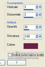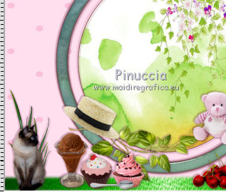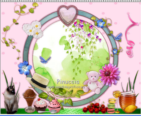 qui puoi trovare qualche risposta ai tuoi dubbi. Se l'argomento che ti interessa non è presente, ti prego di segnalarmelo. Questo tutorial è una creazione di ©Titoune e non può essere copiato su altri siti nè essere offerto per il download. Lo stesso vale per la mia traduzione. Il tutorial è stato creato con PSP X5, ma può essere eseguito anche con le altre versioni di PSP. Secondo la versione utilizzata (anteriore a PSP X) potresti ottenere dei risultati differenti. Dalla versione X4, il comando Immagine>Rifletti è stato sostituito con Immagine>Capovolgi in orizzontale, e il comando Immagine>Capovolgi con Immagine>Capovolgi in verticale. Nelle versioni X5 e X6, le funzioni sono state migliorate rendendo disponibile il menu Oggetti. Vedi la scheda sull'argomento qui Per tradure il tutorial ho usato PSP X. Occorrente: Un tube a scelta. Il resto del materiale qui Filtri in caso di dubbi, ricorda di consultare la mia sezione filtri qui Filters Unlimited 2.0 qui Graphics Plus - Cross Shadow qui Simple - Top Left Mirror qui I filtri Simple e Graphics Plus si possono usare da soli o importati in Filters Unlimited (come fare vedi qui) Se un filtro fornito appare con questa icona ![]() Metti la trama tilerose nella cartella Trame. 1. Apri una nuova immagine trasparente 750 x 600 pixels. Selezione>Seleziona tutto. 2. Apri l'elemento papier10 e vai a Modifica>Copia. Torna al tuo lavoro e vai a Modifica>Incolla nella selezione. Selezione>Deseleziona. 3. Apri l'elemento cadre1 e vai a Modifica>Copia. Torna al tuo lavoro e vai a Modifica>Incolla come nuovo livello. Non spostarlo. 4. Attiva lo strumento Bacchetta magica ![]() e clicca al centro della cornice per selezionarla. Selezione>Modifica>Espandi - 1 pixel. Livelli>Nuovo livello raster. Livelli>Disponi>Sposta giù. 5. Apri l'immagine Activer l'image Design_art_flower_artistic_flower_illustration_PSD_HCHH_1006. Modifica>Copia. Torna al tuo lavoro e vai a Modifica>Incolla nella selezione. Selezione>Deseleziona. 6. Attiva il livello della cornice. Effetti>Effetti 3D>Sfalsa ombra, colore #6b2143. ![]() Ripeti l'Effetto Sfalsa ombra, cambiando verticale e orizzontale con -3. 7. Apri l'elemento gazon e vai a Modifica>Copia. Torna al tuo lavoro e vai a Modifica>Incolla come nuovo livello. Spostalo in basso.Vedi l'esempio finale. Porta questo livello sotto il livello della cornice. 8. Attiva nuovamente il livello superiore. Apri l'elemento coeur1, e vai a Modifica>Copia. Torna al tuo lavoro e vai a Modifica>Incolla come nuovo livello. Spostalo nella parte superiore della cornice.Vedi l'esempio finale. Effetti>Effetti 3D>Sfalsa ombra, con i settaggi precedenti. 9. Apri l'elemento feuille5, e vai a Modifica>Copia. Torna al tuo lavoro e vai a Modifica>Incolla come nuovo livello. Spostalo in alto a destra.Vedi l'esempio finale. Effetti>Effetti 3D>Sfalsa ombra, con i settaggi precedenti. 10. Apri l'elemento ruban, e vai a Modifica>Copia. Torna al tuo lavoro e vai a Modifica>Incolla come nuovo livello. Spostalo nella parte superiore destra.Vedi l'esempio finale. Effetti>Effetti 3D>Sfalsa ombra, con i settaggi precedenti. 11. Apri l'elemento fleur2, e vai a Modifica>Copia. Torna al tuo lavoro e vai a Modifica>Incolla come nuovo livello. Spostalo in basso a destra.Vedi l'esempio finale. Effetti>Effetti 3D>Sfalsa ombra, con i settaggi precedenti. 12. Apri l'elemento feuille3, e vai a Modifica>Copia. Torna al tuo lavoro e vai a Modifica>Incolla come nuovo livello. Spostalo in basso a sinistra.Vedi l'esempio finale. Effetti>Effetti 3D>Sfalsa ombra, con i settaggi precedenti. Livelli>Duplica. Immagine>Rifletti. 13. Apri l'elemento miel, e vai a Modifica>Copia. Torna al tuo lavoro e vai a Modifica>Incolla come nuovo livello. Spostalo in basso a destra.Vedi l'esempio finale. Effetti>Effetti 3D>Sfalsa ombra, con i settaggi precedenti. 14. Apri l'elemento madeleine, e vai a Modifica>Copia. Torna al tuo lavoro e vai a Modifica>Incolla come nuovo livello. Sposta anche questo elemento in basso a destra.Vedi l'esempio finale. Effetti>Effetti 3D>Sfalsa ombra, con i settaggi precedenti. 15. Apri l'elemento cerises, e vai a Modifica>Copia. Torna al tuo lavoro e vai a Modifica>Incolla come nuovo livello. Spostalo in basso a destra.Vedi l'esempio finale. Effetti>Effetti 3D>Sfalsa ombra, con i settaggi precedenti. 16. Apri l'elemento macarons, e vai a Modifica>Copia. Torna al tuo lavoro e vai a Modifica>Incolla come nuovo livello. Spostalo nella parte inferiore.![]() Effetti>Effetti 3D>Sfalsa ombra, con i settaggi precedenti. 17. Apri l'elemento feuille 1, e vai a Modifica>Copia. Torna al tuo lavoro e vai a Modifica>Incolla come nuovo livello. Spostalo nella parte inferiore della cornice.Vedi l'esempio finale. Effetti>Effetti 3D>Sfalsa ombra, con i settaggi precedenti. 18. Apri l'elemento ourson, e vai a Modifica>Copia. Torna al tuo lavoro e vai a Modifica>Incolla come nuovo livello. Spostalo nella parte inferiore della cornice.Vedi l'esempio finale. Effetti>Effetti 3D>Sfalsa ombra, con i settaggi precedenti. 19. Apri l'elemento canotier, e vai a Modifica>Copia. Torna al tuo lavoro e vai a Modifica>Incolla come nuovo livello. Spostalo nella parte inferiore sinistra della cornice.![]() Effetti>Effetti 3D>Sfalsa ombra, con i settaggi precedenti. 20. Apri l'elemento coupe glace 1, e vai a Modifica>Copia. Torna al tuo lavoro e vai a Modifica>Incolla come nuovo livello. Spostalo nella parte inferiore sinistra della cornice.Vedi l'esempio finale. Effetti>Effetti 3D>Sfalsa ombra, con i settaggi precedenti. 21. Apri l'elemento cupcake 2, e vai a Modifica>Copia. Torna al tuo lavoro e vai a Modifica>Incolla come nuovo livello. Spostalo in basso a sinistra.Vedi l'esempio finale. Effetti>Effetti 3D>Sfalsa ombra, con i settaggi precedenti. 22. Apri l'elemento cupcake 1, e vai a Modifica>Copia. Torna al tuo lavoro e vai a Modifica>Incolla come nuovo livello. Spostalo nella parte inferiore sinistra della cornice.Vedi l'esempio finale. Effetti>Effetti 3D>Sfalsa ombra, con i settaggi pre