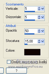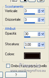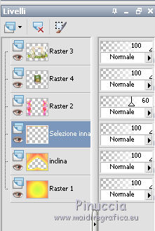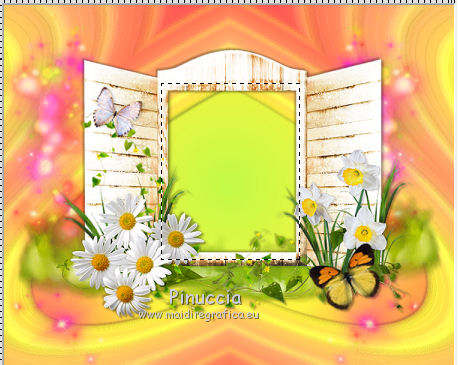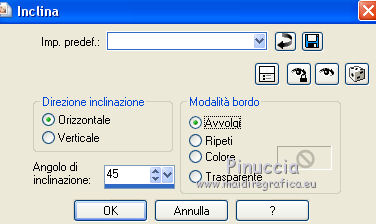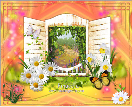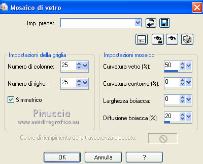 qui puoi trovare qualche risposta ai tuoi dubbi. Se l'argomento che ti interessa non è presente, ti prego di segnalarmelo. Questo tutorial è una creazione di ©Titoune e non può essere copiato su altri siti nè essere offerto per il download. Lo stesso vale per la mia traduzione. Il tutorial è stato creato con PSP X5, ma può essere eseguito anche con le altre versioni di PSP. Secondo la versione utilizzata (anteriore a PSP X) potresti ottenere dei risultati differenti. Dalla versione X4, il comando Immagine>Rifletti è stato sostituito con Immagine>Capovolgi in orizzontale, e il comando Immagine>Capovolgi con Immagine>Capovolgi in verticale. Nelle versioni X5 e X6, le funzioni sono state migliorate rendendo disponibile il menu Oggetti. Vedi la scheda sull'argomento qui Per tradure il tutorial ho usato PSP X. Occorrente: Un tube a scelta. Il resto del materiale qui ![]() Metti il gradiente nella cartella gradienti. 1. Passa il colore di primo piano a Gradiente e seleziona il gradiente winterchaos_gradient010. ![]() 2. Apri una nuova immagine trasparente 750 x 600 pixels, e riempila con il gradiente.3. Attiva lo strumento Bacchetta magica , tolleranza 20,e clicca al centro del gradiente. (clicca due volte per selezionare bene). ![]() Selezione>Inverti. Selezione>Innalza selezione a livello. 4. Effetti>Effetti di trama>Plastica morbida. ![]() Selezione>Deseleziona. 5. Effetti>Effetti geometrici>Inclina. ![]() 6. Effetti>Effetti di riflesso>Specchio rotante. ![]() 7. Effetti>Effetti 3D>Sfalsa ombra, colore #130502. ![]() Ripeti l'Effetto Sfalsa ombra, cambiando verticale e orizzontale con -3. Rinomina questo livello "inclina". 8. Apri l'elemento misc, e vai a Modifica>Copia. Torna al tuo lavoro e vai a Modifica>Incolla come nuovo livello. Spostalo a sinistra.Vedi l'esempio finale. Effetti>Effetti di riflesso>Specchio rotante, con i settaggi precedenti. Abbassa l'opacità di questo livello al 60%. 9. Apri l'elemento AOF_SKDSdaisiesanddaffiescluster2, e vai a Modifica>Copia. Torna al tuo lavoro e vai a Modifica>Incolla come nuovo livello. 10. Immagine>Ridimensiona, al 110%, tutti i livelli non selezionato. Regola>Messa a fuoco>Metti a fuoco. Effetti>Effetti 3D>Sfalsa ombra, con i settaggi precedenti. 11. Attiva lo strumento Selezione , rettangolo,e traccia una selezione intorno alla finestra, come nell'esempio. ![]() Livelli>Nuovo livello raster. livelli>Disponi>Sposta giù. 12. Apri l'elemento Leaf_gate, e vai a Modifica>Copia. Torna al tuo lavoro e vai a Modifica>Incolla nella selezione. Selezione>Deseleziona. 13. Attiva il livello inferiore. Selezione>Seleziona tutto. Selezione>Modifica>Contrai - 15 pixels. Selezione>Inverti. Selezione>Innalza selezione a livello. 14. Effetti>Effetti 3D>Smusso a incasso. ![]() 15. Porta questo livello sopra il livello "inclina". ![]() Selezione>Deseleziona. Immagine>Ridimensiona, al 98%, tutti i livelli non selezionato. 16. Effetti>Effetti di trama>Mosaico di vetro. ![]() 17. Effetti>Effetti geometrici>Sfera. ![]() Effetti>Effetti 3D>Sfalsa ombra, colore #130502. ![]() 18. Attiva il livello superiore. Apri l'elemento green_flowers, e vai a Modifica>Copia. Torna al tuo lavoro e vai a Modifica>Incolla come nuovo livello. Spostalo in basso a sinistra.Vedi l'esempio finale. Effetti>Effetti 3D>Sfalsa ombra, con i settaggi precedenti. 19. Apri l'elemento 0_a4957_e733c704_XL, e vai a Modifica>Copia. Torna al tuo lavoro e vai a Modifica>Incolla come nuovo livello. Spostalo in basso a destra.![]() Effetti>Effetti 3D>Sfalsa ombra, con i settaggi precedenti. 20. Apri l'elemento decor_16, e vai a Modifica>Copia. Torna al tuo lavoro e vai a Modifica>Incolla come nuovo livello. Spostalo in alto a sinistra.Vedi l'esempio finale. Effetti>Effetti 3D>Sfalsa ombra, con i settaggi precedenti. Effetti>Effetti di riflesso>Specchio rotante, con i settaggi precedenti. 21. Apri il tuo tube, e vai a Modifica>Copia. Torna al tuo lavoro e vai a Modifica>Incolla come nuovo livello. Immagine>Ridimensiona, se e quanto necessario, tutti i livelli non selezionato. Spostalo dove preferisci,o vedi il mio esempio. Effetti>Effetti 3D>Sfalsa ombra, colore #130502. ![]() 22. Attiva il livello inferiore. Selezione>Seleziona tutto. Selezione>Modifica>Contrai - 2 pixels. Selezione>Inverti. Selezione>Innalza selezione a livello. Porta questo livello sopra il livello "inclina". 23. Effetti>Effetti 3D>Smusso a incasso, con i settaggi precedenti. ![]() Selezione>Deseleziona. 24. Attiva nuovamente il livello inferiore. Modifica>Copia. Selezione>Seleziona tutto. Immagine>Ritaglia la selezione. 25. Immagine>Dimensioni tela - 800 x 650 pixels. ![]() 26. Livelli>Nuovo livello raster. Livelli>Disponi>Sposta giù. Selezione>Seleziona tutto. Modifica>Incolla nella selezione. Selezione>Deseleziona. 27. Attiva il livello superiore. Apri l'elemento titoune_frame, e vai a Modifica>Copia. Torna al tuo lavoro e vai a Modifica>Incolla come nuovo livello. 28. Firma il tuo lavoro e salva in formato jpg. ![]() Se hai problemi o dubbi, o trovi un link non funzionante, scrivimi. 15 Agosto 2014 |