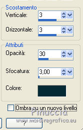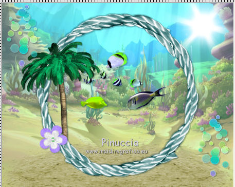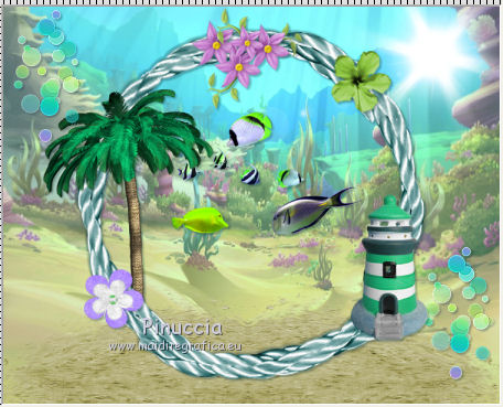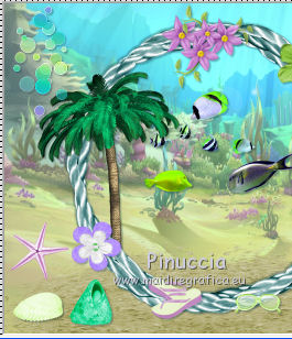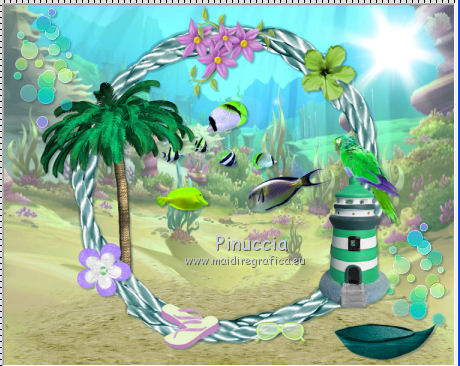 qui puoi trovare qualche risposta ai tuoi dubbi. Se l'argomento che ti interessa non è presente, ti prego di segnalarmelo. Questo tutorial è una creazione di ©Titoune e non può essere copiato su altri siti nè essere offerto per il download. Lo stesso vale per la mia traduzione. Il tutorial è stato creato con PSP X5, ma può essere eseguito anche con le altre versioni di PSP. Secondo la versione utilizzata (anteriore a PSP X) potresti ottenere dei risultati differenti. Dalla versione X4, il comando Immagine>Rifletti è stato sostituito con Immagine>Capovolgi in orizzontale, e il comando Immagine>Capovolgi con Immagine>Capovolgi in verticale. Nelle versioni X5 e X6, le funzioni sono state migliorate rendendo disponibile il menu Oggetti. Vedi la scheda sull'argomento qui Per tradure il tutorial ho usato PSP X. Occorrente: Un tube a scelta. Il resto del materiale qui ![]() 1. Apri una nuova immagine trasparente 750 x 600 pixels. 2. Apri l'elemento frame3 e vai a Modifica>Copia. Torna al tuo lavoro e vai a Modifica>Incolla come nuovo livello. Non spostarlo. 2. Attiva lo strumento Bacchetta magica ![]() e clicca al centro della cornice per selezionarla. Selezione>Inverti. 3. Attiva il livello inferiore. Apri l'immagine decors-winx-club-saison-5-fonds-marins_3844656-L, e vai a Modifica>Copia. Torna al tuo lavoro e vai a Modifica>Incolla nella selezione. 4. Selezione>Inverti. Livelli>Nuovo livello raster. Modifica>Incolla nella selezione (l'immagine è ancora in memoria). Selezione>Deseleziona. 5. Attiva il livello superiore della cornice. ![]() Effetti>Effetti 3D>Sfalsa ombra, colore #062b34. ![]() Ripeti l'Effetto Sfalsa ombra, cambiando verticale e orizzontale con -3. 6. Apri l'elemento sand e vai a Modifica>Copia. Torna al tuo lavoro e vai a Modifica>Incolla come nuovo livello. Spostalo in basso.Se stai usando CorelX15 o CorelX16: Oggetti>Allinea>Inferiore Porta questo livello sotto il livello della cornice. ![]() 7. Attiva nuovamente il livello superiore. Apri l'elemento dots e vai a Modifica>Copia. Torna al tuo lavoro e vai a Modifica>Incolla come nuovo livello. Spostalo in alto a sinistra.Vedi l'esempio finale. Effetti>Effetti 3D>Sfalsa ombra, colore #062b34. ![]() Livelli>Duplica. Sposta questo elemento in basso a destra.![]() 8. Apri l'elemento sun glare, e vai a Modifica>Copia. Torna al tuo lavoro e vai a Modifica>Incolla come nuovo livello. Spostalo in alto a destra.Vedi l'esempio finale. Niente Sfalsa ombra. 9. Apri l'elemento palm tree, e vai a Modifica>Copia. Torna al tuo lavoro e vai a Modifica>Incolla come nuovo livello. Spostalo nella parte sinistra della cornice.Vedi l'esempio finale. Porta questo livello sotto il livello della cornice. 10. Livelli>Duplica. Livelli>Disponi>Sposta su (sopra il livello della cornice). Attiva lo strumento Gomma ![]() e cancella la base del tronco che deborda sulla cornice. ![]() Attiva il livello originale dell'elemento. Effetti>Effetti 3D>Sfalsa ombra, colore #062b34. ![]() 11. Attiva il livello superiore. Apri l'elemento flower1, e vai a Modifica>Copia. Torna al tuo lavoro e vai a Modifica>Incolla come nuovo livello. Spostalo nella parte inferiore sinistra della cornice.Vedi l'esempio finale. Effetti>Effetti 3D>Sfalsa ombra, con i settaggi precedenti. 12. Apri l'elemento fish, e vai a Modifica>Copia. Torna al tuo lavoro e vai a Modifica>Incolla come nuovo livello. Spostalo al centro della cornice.Porta questo livello sotto il livello della cornice. ![]() Effetti>Effetti 3D>Sfalsa ombra, con i settaggi precedenti. 13. Attiva il livello della cornice. Apri l'elemento element37, e vai a Modifica>Copia. Torna al tuo lavoro e vai a Modifica>Incolla come nuovo livello. Spostalo nella parte superiore della cornice.Vedi l'esempio finale. Effetti>Effetti 3D>Sfalsa ombra, con i settaggi precedenti. 14. Apri l'elemento hibiscus, e vai a Modifica>Copia. Torna al tuo lavoro e vai a Modifica>Incolla come nuovo livello. Spostalo nella parte superiore destra della cornice.Vedi l'esempio finale. Effetti>Effetti 3D>Sfalsa ombra, con i settaggi precedenti. 15. Apri l'elemento lighthouse, e vai a Modifica>Copia. Torna al tuo lavoro e vai a Modifica>Incolla come nuovo livello. Spostalo nella parte inferiore destra della cornice.![]() Effetti>Effetti 3D>Sfalsa ombra, con i settaggi precedenti. 16. Apri l'elemento bird, e vai a Modifica>Copia. Torna al tuo lavoro e vai a Modifica>Incolla come nuovo livello. Spostalo nella parte destra della cornice.Vedi l'esempio finale. Effetti>Effetti 3D>Sfalsa ombra, con i settaggi precedenti. 17. Apri l'elemento boat, e vai a Modifica>Copia. Torna al tuo lavoro e vai a Modifica>Incolla come nuovo livello. Spostalo in basso a destra.Vedi l'esempio finale. Effetti>Effetti 3D>Sfalsa ombra, con i settaggi precedenti. 18. Apri l'elemento glasses, e vai a Modifica>Copia. Torna al tuo lavoro e vai a Modifica>Incolla come nuovo livello. Spostalo in basso.Vedi l'esempio finale. Effetti>Effetti 3D>Sfalsa ombra, con i settaggi precedenti. 19. Apri l'elemento flip flops, e vai a Modifica>Copia. Torna al tuo lavoro e vai a Modifica>Incolla come nuovo livello. Sposta anche questo elemento in basso.![]() Effetti>Effetti 3D>Sfalsa ombra, con i settaggi precedenti. 20. Apri l'elemento shell2, e vai a Modifica>Copia. Torna al tuo lavoro e vai a Modifica>Incolla come nuovo livello. Spostalo in basso a sinistra.Vedi l'esempio finale. Effetti>Effetti 3D>Sfalsa ombra, con i settaggi precedenti. 21. Apri l'elemento shell1, e vai a Modifica>Copia. Torna al tuo lavoro e vai a Modifica>Incolla come nuovo livello. Sposta anche questo elemento in basso a sinistra.Vedi l'esempio finale. Effetti>Effetti 3D>Sfalsa ombra, con i settaggi precedenti. 22. Apri l'elemento starfish, e vai a Modifica>Copia. Torna al tuo lavoro e vai a Modifica>Incolla come nuovo livello. Spostalo in basso a sinistra.![]() Effetti>Effetti 3D>Sfalsa ombra, con i settaggi precedenti. 23. Apri il tuo tube, e vai a Modifica>Copia. Torna al tuo lavoro e vai a Modifica>Incolla come nuo