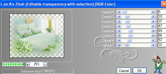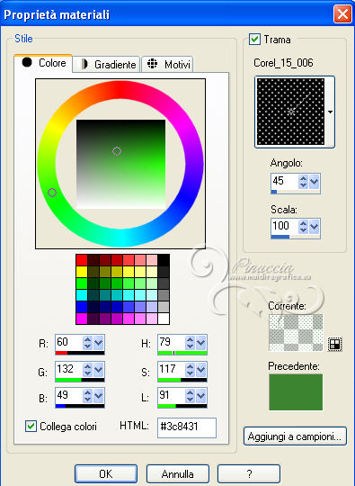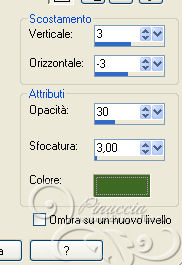 qui puoi trovare qualche risposta ai tuoi dubbi. Se l'argomento che ti interessa non è presente, ti prego di segnalarmelo. Questo tutorial è una creazione di ©Titoune e non può essere copiato su altri siti nè essere offerto per il download. Lo stesso vale per la mia traduzione. Il tutorial è stato creato con PSP X5, ma può essere eseguito anche con le altre versioni di PSP. Secondo la versione utilizzata (anteriore a PSP X) potresti ottenere dei risultati differenti. Per tradurlo, ho usato PSP X. Grazie ai creatori dei tubes che mettono a disposizione il loro lavoro in vari gruppi di condivisione. Rispetta il lavoro degli autori, non cambiare il nome del file e non cancellare il watermark. Occorrente: Un tube a scelta. Il resto del materiale qui Tubes ed elementi di Zezette2 Filtri: L&K - L&K Zitah qui Animation Shop qui ![]() Metti la selezione nella cartella Selezioni. 1. Imposta il colore di primo piano con #3c8431. 2. Apri una nuova immagine trasparente 750 x 600 pixels. Selezione>Seleziona tutto. 3. Apri vetochka_landysha_1920x1080 e vai a Modifica>Copia. Torna al tuo lavoro e vai a Modifica>Incolla nella selezione. 4. Effetti>Effetti di riflesso>Specchio rotante. ![]() 5. Selezione>Modifica>Contrai - 35 pixels. Selezione>Inverti. 6. Livelli>Nuovo livello raster. Attiva nuovamente l'immagine "vetochka_landysha_1920x1080". Su questa immagine: 7. Effetti>Effetti di immagine>Motivo unico, con i settaggi standard. ![]() Modifica>Copia. Torna al tuo lavoro con la selezione ancora attiva. Modifica>Incolla nella selezione. 8. Regola>Sfocatura>Sfocatura gaussiana - raggio 45. ![]() 9. Effetti>Effetti 3D>Smusso a incasso. ![]() 10. Livelli>Nuovo livello raster. Apri la paletta del colore di primo piano #3c8431. Seleziona la trama Griglia (nelle versioni più recenti Corel_15_006) con i seguenti settaggi. ![]() Riempi il livello con questo colore+trama.Selezione>Inverti. 11. Livelli>Nuovo livello raster. Apri "landishi_enl" e vai a Modifica>Copia. Torna al tuo lavoro e vai a Modifica>Incolla nella selezione. Selezione>Modifica>Contrai - 45 pixels. Selezione>Inverti. Regola>Sfocatura>Sfocatura gaussiana - raggio 45. ![]() 12. Effetti>Plugins>L&K - L&K Zitah, con i settaggi standard. ![]() Effetti>Effetti di bordo>Aumenta. Selezione>Inverti. Selezione>Innalza selezione a livello. Selezione>Deseleziona. 13. Effetti>Effetti 3D>Sfalsa ombra, con il colore #3f6923. ![]() Ripeti l'Effetto Sfalsa ombra, cambiando verticale e orizzontale con -3. 14. Apri l'elemento "titoune_bordure" e vai a Modifica>Copia. Torna al tuo lavoro e vai a Modifica>Incolla come nuovo livello. Effetti>Effetti 3D>Sfalsa ombra, con i settaggi precedenti. 15. Selezione>Carica/Salva selezione>Carica selezione da disco. Cerca e carica la selezione "selection_tag_muguet_style". ![]() Livelli>Nuovo livello raster. Deseleziona la trama dal colore di primo piano, clicca sull'icona al centro ![]() Riempi la selezione con il colore di primo piano.Selezione>Deseleziona. 16. Effetti>Effetti 3D>Sfalsa ombra, con i settaggi precedenti. 17. Apri l'elemento flower2-a651_L e vai a Modifica>Copia. Torna al tuo lavoro e vai a Modifica>Incolla come nuovo livello. Spostalo in alto a sinistra.![]() 18. Effetti>Effetti di riflesso>Specchio rotante. ![]() 19. Effetti>Effetti 3D>Sfalsa ombra, con il colore #3f6923. ![]() 20. Apri l'elemento SviDen e vai a Modifica>Copia. Torna al tuo lavoro e vai a Modifica>Incolla come nuovo livello. Spostalo in basso a sinistra.![]() Effetti>Effetti di riflesso>Specchio rotante, con i settaggi precedenti. Effetti>Effetti 3D>Sfalsa ombra, con i settaggi precedenti. 21. Apri l'elemento SviDen.RU__spring-flowers (13) e vai a Modifica>Copia. Torna al tuo lavoro e vai a Modifica>Incolla come nuovo livello. Spostalo sul letto.Vedi l'esempio finale. Effetti>Effetti 3D>Sfalsa ombra, con i settaggi precedenti. 22. Apri l'elemento coins_muguet e vai a Modifica>Copia. Torna al tuo lavoro e vai a Modifica>Incolla come nuovo livello. Spostalo in alto.Vedi l'esempio finale. Effetti>Effetti 3D>Sfalsa ombra, con i settaggi precedenti. 23. Apri l'elemento wordart_muguet_style e vai a Modifica>Copia. Torna al tuo lavoro e vai a Modifica>Incolla come nuovo livello. Spostalo in alto a sinistra.Nessun effetto Sfalsa ombra. 24. Apri il tuo tube e vai a Modifica>Copia. Torna al tuo lavoro e vai a Modifica>Incolla come nuovo livello. Immagine>Ridimensiona, se e quanto necessario, tutti i livelli non selezionato. Spostalo dove preferisci,o vedi il mio esempio. Effetti>Effetti 3D>Sfalsa ombra, con il colore #3f6923. ![]() Ripeti l'Effetto Sfalsa ombra, cambiando verticale e orizzontale con -3/3. Firma il tuo lavoro. 25. Animazione. Modifica>Copia Unione. Apri Animation Shop e vai a Modifica>Incolla>Incolla come nuova animazione. 26. Modifica>Duplica, e ripeti finchè non avrai 6 fotogrammi. Clicca sul primo fotogramma per selezionarlo e vai a Modifica>Seleziona tutto. 27. Apri la gif 1ba47f73, anche questa composta da 6 fotogrammi. Modifica>Seleziona tutto. Modifica>Copia. Attiva il tuo lavoro e vai a Modifica>Incolla>Incolla nel fotogramma selezionato. Posiziona la gif in basso a destra. 28. Animazione>Proprietà fotogramma, e imposta la velocità a 15. ![]() Controlla il risultato cliccando su Visualizza e salva in formato gif.![]() Se hai problemi o dubbi, o trovi un link non funzionante, scrivimi. 27 Aprile 2013 |