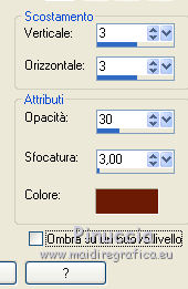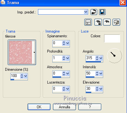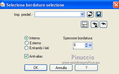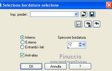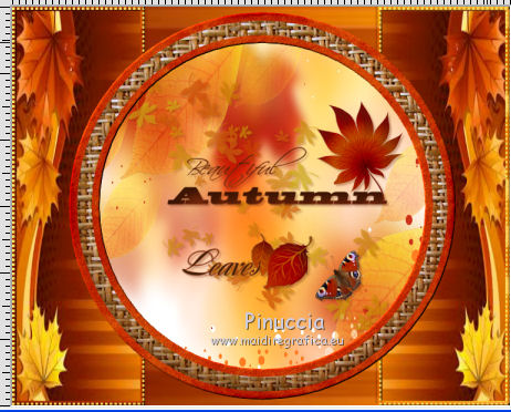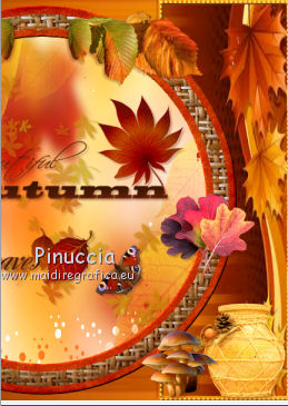 qui puoi trovare qualche risposta ai tuoi dubbi. Se l'argomento che ti interessa non è presente, ti prego di segnalarmelo. Questo tutorial è una creazione di ©Titoune e non può essere copiato su altri siti nè essere offerto per il download. Lo stesso vale per la mia traduzione. Il tutorial è stato creato con Corel17, ma può essere eseguito anche con le altre versioni di PSP. Secondo la versione utilizzata (anteriore a PSP X) potresti ottenere dei risultati differenti. Dalla versione X4, il comando Immagine>Rifletti è stato sostituito con Immagine>Capovolgi in orizzontale, e il comando Immagine>Capovolgi con Immagine>Capovolgi in verticale. Nelle versioni X5 e X6, le funzioni sono state migliorate rendendo disponibile il menu Oggetti. Con il nuovo X7 sono tornati i comandi Rifletti/Capovolgi, ma con nuove differenze. Vedi la scheda sull'argomento qui Per tradurre il tutorial ho usato PSP X. Occorrente: Un tube a scelta. Il resto del materiale qui Il tube utilizzato è di Azalée. ![]() Metti la selezione nella cartella Selezioni. Metti la trama tilerose nella cartella Trame. 1. Apri una nuova immagine trasparente 750 x 600 pixels. Selezione>Seleziona tutto. 2. Apri l'elemento tuile, e vai a Modifica>Copia. Torna al tuo lavoro e vai a Modifica>Incolla nella selezione. Selezione>Deseleziona. 3. Attiva lo strumento Selezione ![]() (non importa il tipo di selezione impostato, perchè con la selezione personalizzata si ottiene sempre un rettangolo) clicca sull'icona Selezione personalizzata ![]() e imposta i seguenti settaggi. ![]() 4. Livelli>Nuovo livello raster. Apri l'immagine "imagesU3F726C3" e vai a Modifica>Copia. Torna al tuo lavoro e vai a Modifica>Incolla nella selezione. Selezione>Deseleziona. 5. Effetti>Effetti di riflesso>Specchio rotante. ![]() 6. Selezione>Seleziona tutto. Selezione>Mobile. Selezione>Immobilizza. 7. Selezione>Modifica>Seleziona bordature selezione. ![]() 8. Attiva il livello inferiore. Selezione>Innalza selezione a livello. Livelli>Disponi>Porta in alto. 9. Effetti>Effetti di trama>Intessitura. colore intessitura #5e1100; colore spazio #fad557. ![]() 10. Effetti>Effetti 3D>Smusso a incasso. ![]() Selezione>Deseleziona. Livelli>Unisci>Unisci giù. 11. Effetti>Effetti 3D>Sfalsa ombra, colore #6c1b06. ![]() Ripeti l'Effetto Sfalsa ombra, cambiando verticale e orizzontale con -3. 12. Livelli>Nuovo livello raster. Selezione>Carica/Salva selezione>Carica selezione da disco. Cerca e carica la selezione "selection_scrap_my_happy_autumn". ![]() 13. Attiva l'elemento frame round, e vai a Modifica>Copia. Torna al tuo lavoro e vai a Modifica>Incolla nella selezione. 14. Selezione>Modifica>Seleziona bordature selezione. ![]() 15. Livelli>Nuovo livello raster. Apri l'elemento paper6, e vai a Modifica>Copia. Torna al tuo lavoro e vai a Modifica>Incolla nella selezione 16. Effetti>Effetti di trama>Trama. ![]() Selezione>Deseleziona. 17. Livelli>Unisci>Unisci giù. Effetti>Effetti 3D>Smusso a incasso, con i settaggi precedenti. 18. Attiva lo strumento Bacchetta magica ![]() e clicca al centro della cornice per selezionarla. Selezione>Modifica>Espandi - 5 pixels. 19. Livelli>Nuovo livello raster. Livelli>Disponi>Sposta giù. 20. Apri l'immagine Autum-Fall-Background, e vai a Modifica>Copia. Torna al tuo lavoro e vai a Modifica>Incolla nella selezione Selezione>Deseleziona. 21. Apri l'elemento leaves yellow red, e vai a Modifica>Copia. Torna al tuo lavoro e vai a Modifica>Incolla come nuovo livello. Non spostarlo. 22. Apri l'elemento autumn_beautifulautumn_wordart_rainy, e vai a Modifica>Copia. Torna al tuo lavoro e vai a Modifica>Incolla come nuovo livello. Spostalo nella cornice.Vedi l'esempio finale. 23. Effetti>Effetti 3D>Sfalsa ombra, colore #6c1b06. ![]() 24. Apri l'elemento autumn_leaves_wordart_rainy, e vai a Modifica>Copia. Torna al tuo lavoro e vai a Modifica>Incolla come nuovo livello. Posiziona anche questo elemento nella cornice.Vedi l'esempio finale. Effetti>Effetti 3D>Sfalsa ombra, con i settaggi precedenti. 25. Apri l'elemento butterfly, e vai a Modifica>Copia. Torna al tuo lavoro e vai a Modifica>Incolla come nuovo livello. Spostalo nel paesaggio.![]() Effetti>Effetti 3D>Sfalsa ombra, con i settaggi precedenti. 26. Attiva il livello superiore. Apri l'elemento leaves, e vai a Modifica>Copia. Torna al tuo lavoro e vai a Modifica>Incolla come nuovo livello. Spostalo nella parte superiore della cornice.Vedi l'esempio finale. Effetti>Effetti 3D>Sfalsa ombra, con i settaggi precedenti. Livelli>Duplica. Immagine>Rifletti. 27. Apri l'elemento leaves1, e vai a Modifica>Copia. Torna al tuo lavoro e vai a Modifica>Incolla come nuovo livello. Spostalo nella parte inferiore destra della cornice.Vedi l'esempio finale. Effetti>Effetti 3D>Sfalsa ombra, con i settaggi precedenti. 28. Apri l'elemento vase, e vai a Modifica>Copia. Torna al tuo lavoro e vai a Modifica>Incolla come nuovo livello. Spostalo nella parte inferiore destra della cornice.Vedi l'esempio finale. Effetti>Effetti 3D>Sfalsa ombra, con i settaggi precedenti. 29. Apri l'elemento mushrooms, e vai a Modifica>Copia. Torna al tuo lavoro e vai a Modifica>Incolla come nuovo livello. Sposta l'elemento accanto al vaso.![]() Effetti>Effetti 3D>Sfalsa ombra, con i settaggi precedenti. 30. Apri l'elemento umbrella, e vai a Modifica>Copia. Torna al tuo lavoro e vai a Modifica>Incolla come nuovo livello. Spostalo nella parte inferiore della cornice.Vedi l'esempio finale. Effetti>Effetti 3D>Sfalsa ombra, con i settaggi precedenti. 31. Apri l'elemento CUHtORt7MXNLbBQrPro-Jjk-IzM, e vai a Modifica>Copia. Torna al tuo lavoro e vai a Modifica>Incolla come nuovo livello. Spostalo nella parte inferiore sinistra della cornice.Vedi l'esempio finale. Effetti>Effetti 3D>Sfalsa ombra, con i settaggi precedenti. 32. Apri l'elemento cones1, e vai a Modifica>Copia. Torna al tuo lavoro e vai a Modifica>Incolla come nuovo livello. Spostalo nella parte sinistra della cornice.![]() Effetti>Effetti 3D>Sfalsa ombra, con i settaggi precedent