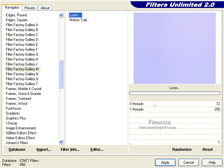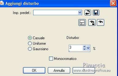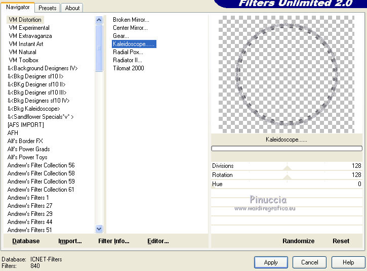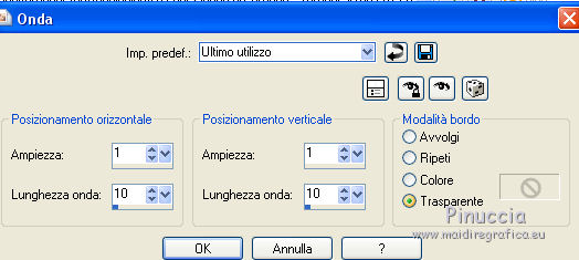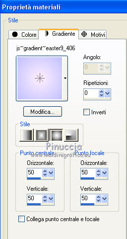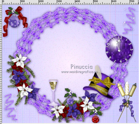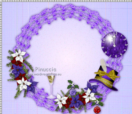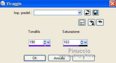 qui puoi trovare qualche risposta ai tuoi dubbi. Se l'argomento che ti interessa non è presente, ti prego di segnalarmelo. Questo tutorial è una creazione di ©Titoune e non può essere copiato su altri siti nè essere offerto per il download. Lo stesso vale per la mia traduzione. Il tutorial è stato creato con PSP X5, ma può essere eseguito anche con le altre versioni di PSP. Secondo la versione utilizzata (anteriore a PSP X) potresti ottenere dei risultati differenti. Vedi la mia scheda riguardante le funzioni Rifletti>Capovolgi in X4 e X5 qui Per tradure il tutorial ho usato PSP X. Occorrente: Un tube a scelta. Il resto del materiale qui Il tube utilizzato è di Libellule. Filtri in caso di dubbi, ricorda di consultare la mia sezione filtri qui Filters Unlimited 2.0 qui Filter Factory Gallery M - Loom qui Penta.com - Jeans qui VM Distortion - Kaleidoscope qui I filtri Factory Gallery, Penta e VM Distortion si possono usare da soli o importati in Filters Unlimited (come fare vedi qui) Se un filtro fornito appare con questa icona Animation Shop qui ![]() Metti il gradiente nella cartella gradienti. Metti la selezione nella cartella Selezioni. 1. Passa il colore di primo piano a Gradiente, e seleziona il gradiente "js-gradient-easter9_406", con i seguenti settaggi. ![]() Scegli un colore per colorizzare i tuoi elementi, e impostalo come colore di sfondo. Per l'esempio ho scelto #562091. Prendi nota dei valori di tonalità (H) e Saturazione (S) ti serviranno per le impostazioni del Viraggio. Regola>Tonalità e saturazione>Viraggio ![]() 2. Apri una nuova immagine trasparente 750 x 650 pixels, e riempila con il gradiente.3. Regola>Aggiungi/Rimuovi disturbo>Aggiungi disturbo. ![]() 4. Livelli>Nuovo livello raster. Selezione>Seleziona tutto. Apri l'elemento SophisticatSimone_A_New_Beginning_Frame_18 e vai a Modifica>Copia. Torna al tuo lavoro e vai a Modifica>Incolla nella selezione. Selezione>Deseleziona. 5. Immagine>Ridimensiona, al 75%, tutti i livelli non selezionato. Effetti>Plugins>Filters Unlimited 2.0 - VM Distortion - Kaleidoscope, con i settaggi standard. ![]() 6. Livelli>Duplica. Immagine>Ridimensiona, al 110%, tutti i livelli non selezionato. 7. Effetti>Effetti di distorsione>Onda. ![]() 8. Ritorna sul livello originale. Livelli>Duplica, 9. Attiva il livello sottostante. Effetti>Effetti di distorsione>Onda, con i settaggi precedenti. 10. Attiva il livello superiore. Livelli>Unisci>Unisci giù - 2 volte. Regola>Tonalità e saturazione>Viraggio. ![]() 11. Attiva lo strumento Bacchetta magica ![]() e clicca al centro della cornice per selezionarla. Selezione>Inverti. Attiva il livello Raster 1. 12. Effetti>Plugins>Filters Unlimited 2.0 - Filter Factory Gallery M - Loom. ![]() Selezione>Innalza selezione a livello. Selezione>Deseleziona. 13. Attiva il livello della cornice. Effetti>Effetti 3D>Sfalsa ombra, colore #2d0c55. ![]() Ripeti l'Effetto Sfalsa ombra, cambiando verticale e orizzontale con -3. 14. Apri l'elemento SophisticatSimone_A_New_Beginning_Element_70 e vai a Modifica>Copia. Torna al tuo lavoro e vai a Modifica>Incolla come nuovo livello. Spostalo nella parte inferiore sinistra della cornice.Vedi l'esempio finale. 15. Effetti>Effetti 3D>Sfalsa ombra, colore #2d0c55. ![]() 16. Apri l'elemento SophisticatSimone_A_New_Beginning_Element_71 e vai a Modifica>Copia. Torna al tuo lavoro e vai a Modifica>Incolla come nuovo livello. Spostalo nella parte inferiore della cornice.Vedi l'esempio finale. Effetti>Effetti 3D>Sfalsa ombra, con i settaggi precedenti. 17. Apri l'elemento SophisticatSimone_A_New_Beginning_Element_75 e vai a Modifica>Copia. Torna al tuo lavoro e vai a Modifica>Incolla come nuovo livello. Sposta anche questo elemento nella parte inferiore della cornice.![]() Effetti>Effetti 3D>Sfalsa ombra, con i settaggi precedenti. 18. Apri l'elemento SophisticatSimone_A_New_Beginning_Element_66 e vai a Modifica>Copia. Torna al tuo lavoro e vai a Modifica>Incolla come nuovo livello. Spostalo nella parte inferiore destra della cornice.Vedi l'esempio finale. Effetti>Effetti 3D>Sfalsa ombra, con i settaggi precedenti. 19. Apri l'elemento SophisticatSimone_A_New_Beginning_Element_74 e vai a Modifica>Copia. Torna al tuo lavoro e vai a Modifica>Incolla come nuovo livello. Spostalo nella parte superiore destra della cornice.![]() Effetti>Effetti 3D>Sfalsa ombra, con i settaggi precedenti. 20. Apri l'elemento SophisticatSimone_A_New_Beginning_Element_68 e vai a Modifica>Copia. Torna al tuo lavoro e vai a Modifica>Incolla come nuovo livello. Regola>Tonalità e saturazione>Viraggio. ![]() Spostalo nell'angolo in alto a destra.Vedi l'esempio finale. Effetti>Effetti 3D>Sfalsa ombra, con i settaggi precedenti. Livelli>Duplica. Immagine>Rifletti. Posiziona questo elemento nell'angolo in basso a sinistra.![]() 21. Apri l'elemento SophisticatSimone_A_New_Beginning_Element_73 e vai a Modifica>Copia. Torna al tuo lavoro e vai a Modifica>Incolla come nuovo livello. Spostalo nell'angolo in alto a sinistra.Vedi l'esempio finale. Effetti>Effetti 3D>Sfalsa ombra, con i settaggi precedenti. 22. Apri l'elemento SophisticatSimone_A_New_Beginning_Element_35 e vai a Modifica>Copia. Torna al tuo lavoro e vai a Modifica>Incolla come nuovo livello. Regola>Tonalità e saturazione>Viraggio, con i settaggi precedenti. Spostalo in basso a destra.![]() Effetti>Effetti 3D>Sfalsa ombra, con i settaggi precedenti. 23. Apri l'elemento SophisticatSimone_A_New_Beginning_WordArt e vai a Modifica>Copia. Torna al tuo lavoro e vai a Modifica>Incolla come nuovo livello. Spostalo in alto.Vedi l'esempio finale. Effetti>Effetti 3D>Sfalsa ombra, con i settaggi precedenti. 24. Apri l'elemento SophisticatSimone_A_New_Beginning_Element_10 e vai a Modifica>Copia. Torna al tuo lavoro e vai a Modifica>Incolla come nuovo livello. Regola>Tonalità e saturazione>Viraggio, con i settaggi precedenti. Spostalo in alto.Vedi l'esempio finale. Effetti>Effetti 3D>Sfalsa ombra, con i settaggi precedenti. Porta questo livello sotto il live