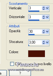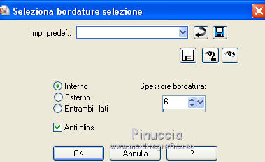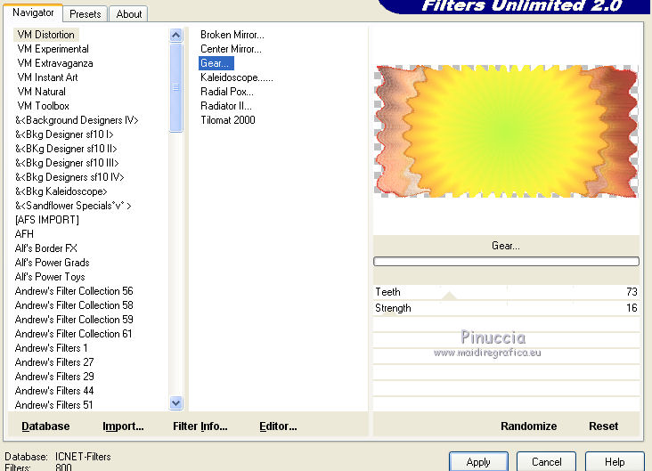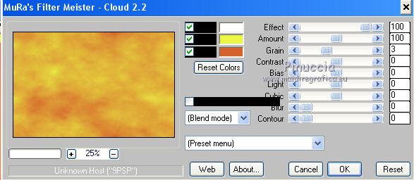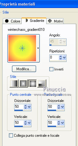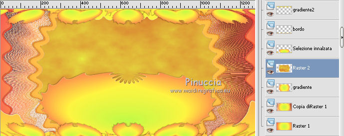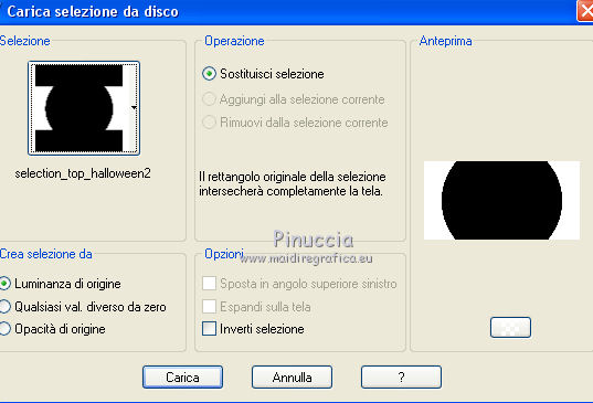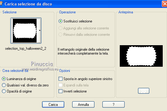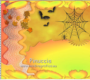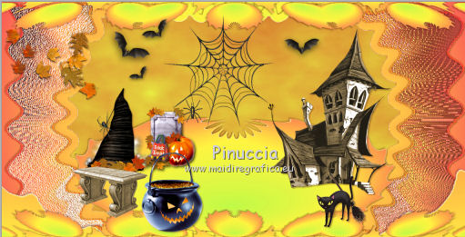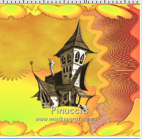 qui puoi trovare qualche risposta ai tuoi dubbi. Se l'argomento che ti interessa non è presente, ti prego di segnalarmelo. Questo tutorial è una creazione di ©Titoune e non può essere copiato su altri siti nè essere offerto per il download. Lo stesso vale per la mia traduzione. Il tutorial è stato creato con PSP X5, ma può essere eseguito anche con le altre versioni di PSP. Secondo la versione utilizzata (anteriore a PSP X) potresti ottenere dei risultati differenti. Vedi la mia scheda riguardante le funzioni Rifletti>Capovolgi in X4, X5 e X6 qui Per tradure il tutorial ho usato PSP X. Occorrente: Un tube a scelta. Il resto del materiale qui Filtri in caso di dubbi, ricorda di consultare la mia sezione filtri qui Filters Unlimited 2.0 qui Mura's Meister - Cloud qui VM Distortion - Gear qui Filter Factory Gallery M - Loom qui Graphics Plus - Cross Shadow qui ![]() Metti le selezioni nella cartella Selezioni. 1. Passa il colore di primo piano a Gradiente, e seleziona il gradiente "winterchaos_gradient10", stile Sprazzo di luce: ![]() Imposta il colore di sfondo con #f28d4a. 2. Apri una nuova immagine trasparente 1280 x 650 pixels, e riempila con il gradiente.3. Selezione>Carica/Salva selezione>Carica selezione da disco. Cerca e carica la selezione "selection_top_halloween2". ![]() Selezione>Innalza selezione a livello. Effetti>Plugins>Graphics plus - Cross Shadow. con i settaggi standard. ![]() 4. Effetti>Plugins>Filters Unlimited 2.0 - Filter Factory Gallery M - Loom, con i settaggi standard. ![]() 5. Selezione>Modifica>Seleziona bordature selezione. ![]() 6. Attiva il livello inferiore. Selezione>Innalza selezione a livello. Livelli>Disponi>Porta in alto. 7. Effetti>Effetti artistici>Mezzitoni. ![]() 8. Effetti>Effetti 3D>Smusso a incasso. ![]() Selezione>Deseleziona. 9. Effetti>Effetti 3D>Sfalsa ombra, colore #4e1306. ![]() Ripeti l'Effetto Sfalsa ombra, cambiando verticale e orizzontale con -3. Rinomina questo livello "bordo". 10. Attiva il livello Raster 1. Livelli>Duplica. Attiva nuovamente il livello superiore "bordo". Livelli>Unisci>Unisci giù - 2 volte. 11. Immagine>Ridimensiona, al 95%, tutti i livelli non selezionato. Effetti>Plugins>Filters Unlimited 2.0 - VM Distorsion - Gear, con i settaggi standard. ![]() Regola>Messa a fuoco>Metti a fuoco. Effetti>Effetti 3D>Sfalsa ombra, con i settaggi precedenti. 12. Selezione>Carica/Salva selezione>Carica selezione da disco. Cerca e carica la selezione "selection_top_halloween2_2". ![]() 13. Livelli>Nuovo livello raster. Riempi con il gradiente.Effetti>Effetti di bordo>Aumenta di più. Rinomina questo livello "gradiente". 14. Effetti>Effetti geometrici>Prospettiva verticale. ![]() Selezione>Innalza selezione a livello. Selezione>Deseleziona. 15. Effetti>Effetti di distorsione>Coordinate polari. ![]() Effetti>Effetti 3D>Sfalsa ombra, con i settaggi precedenti. Livelli>Duplica. 16. Effetti>Effetti geometrici>Prospettiva verticale - 2 volte con i seguenti settaggi. ![]() Effetti>Effetti 3D>Sfalsa ombra, con i settaggi precedenti. Rinomina questo livello "bordo". Modifica>Copia. Modifica>Incolla come nuova immagine. Immagine>Capovolgi. Rinomina questa immagine "bordo 2" e minimizzala: la userai più tardi. 17. Torna al tuo lavoro e rimani posizionato sul livello "bordo". Livelli>Duplica. Immagine>Capovolgi. Rinomina questo livello "gradiente. Selezione>Carica/Salva selezione>Carica selezione da disco. Carica nuovamente la selezione "selection_top_halloween2". ![]() Selezione>Modifica>Contrai - 2 pixels. 18. Imposta il colore di primo piano con #eaf643, e il colore di sfondo con #d5622d. Livelli>Nuovo livello raster. 19. Effetti>Plugins>Mura's Meister - Cloud, con i settaggi standard. ![]() Selezione>Deseleziona. Porta questo livello sotto il livello "bordo" ![]() 20. Attiva nuovamente il livello superiore. Apri l'elemento element2NEF e vai a Modifica>Copia. Torna al tuo lavoro e vai a Modifica>Incolla come nuovo livello. Spostalo a destra.![]() Effetti>Effetti 3D>Sfalsa ombra, colore #4e1306. ![]() 21. Apri l'elemento element8NEF e vai a Modifica>Copia. Torna al tuo lavoro e vai a Modifica>Incolla come nuovo livello. Spostalo a destra, sopra la casa.Vedi l'esempio finale. Niente Sfalsa ombra. 22. Apri l'elemento element13NEF e vai a Modifica>Copia. Torna al tuo lavoro e vai a Modifica>Incolla come nuovo livello. Spostalo al centro.![]() Effetti>Effetti 3D>Sfalsa ombra, con i settaggi precedenti. 23. Apri l'elemento element9NEF e vai a Modifica>Copia. Torna al tuo lavoro e vai a Modifica>Incolla come nuovo livello. Spostalo in alto a sinistra.![]() Niente Sfalsa ombra. 24. Apri l'elemento element11NEF e vai a Modifica>Copia. Torna al tuo lavoro e vai a Modifica>Incolla come nuovo livello. Spostalo in alto a sinistra.![]() Effetti>Effetti 3D>Sfalsa ombra, con i settaggi precedenti. 25. Apri l'elemento element12NEF e vai a Modifica>Copia. Torna al tuo lavoro e vai a Modifica>Incolla come nuovo livello. Spostalo a sinistra.![]() Effetti>Effetti 3D>Sfalsa ombra, con i settaggi precedenti. 26. Apri l'elemento element14NEF e vai a Modifica>Copia. Torna al tuo lavoro e vai a Modifica>Incolla come nuovo livello. Spostalo a sinistra.Vedi l'esempio finale. Niente Sfalsa ombra. 27. Apri l'elemento elementNEF e vai a Modifica>Copia. Torna al tuo lavoro e vai a Modifica>Incolla come nuovo livello. Spostalo in basso a sinistra,davanti al cappello. ![]() Effetti>Effetti 3D>Sfalsa ombra, con i settaggi precedenti. 28. Apri l'elemento element3NEF e vai a Modifica>Copia. Torna al tuo lavoro e vai a Modifica>Incolla come nuovo livello. Spostalo in basso a sinistra.Vedi l'esempio finale. Effetti>Effetti 3D>Sfalsa ombra, con i settaggi precedenti. 29. Apri l'elemento element10NEF e vai a Modifica>Copia. Torna al tuo lavoro e vai a Modifica>Incolla come nuovo livello. Spostalo in basso a destra.![]() Effetti>Effetti 3D>Sfalsa ombra, con i settaggi precedenti. 30. Apri l'elemento element4NEF e vai a Modifica>Copia. Torna al tuo lavoro e vai a Modifica>Incol