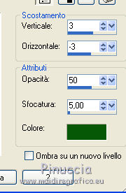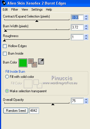 qui puoi trovare qualche risposta ai tuoi dubbi. Se l'argomento che ti interessa non è presente, ti prego di segnalarmelo. Questo tutorial è una creazione di ©Titoune e non può essere copiato su altri siti nè essere offerto per il download. Lo stesso vale per la mia traduzione. Il tutorial è stato creato con PSP X5, ma può essere eseguito anche con le altre versioni di PSP. Secondo la versione utilizzata (anteriore a PSP X) potresti ottenere dei risultati differenti. Vedi la mia scheda riguardante le funzioni Rifletti>Capovolgi in X4 e X5 qui Per tradure il tutorial ho usato PSP X. Occorrente: Un tube a scelta. Il resto del materiale qui Filtri Alien Skin Xenofex 2.0 - Burnt Edges qui Penta.com - Jeans qui ![]() se non vuoi sentire la musica premi il tasto ESC 1. Apri una nuova immagine trasparente 750 x 600 pixels. Selezione>Seleziona tutto. 2. Apri l'elemento otr paper 10, e vai a Modifica>Copia. Torna al tuo lavoro e vai a Modifica>Incolla nella selezione. Selezione>Deseleziona. 3. Attiva lo strumento Bacchetta magica ![]() e clicca al centro della cornice per selezionarla. ![]() 4. Selezione>Modifica>Contrai - 15 pixels. Selezione>Innalza selezione a livello. 5. Effetti>Plugins>Alien Skin Xenofex 2.0 - Burnt Edges - colore #08bf0e. ![]() Selezione>Deseleziona. 6. Effetti>Effetti 3D>Sfalsa ombra, colore #075707. ![]() 7. Apri l'elemento otr frame 2, e vai a Modifica>Copia. Torna al tuo lavoro e vai a Modifica>Incolla nella selezione. Non spostarlo. Rinomina questo livello "cornice". 8. Clicca al centro della cornice con la bacchetta magica ![]() Selezione>Modifica>Sfuma - 15 pixels. ![]() 9. Livelli>Nuovo livello raster. Livelli>Disponi>Sposta giù. 10. Apri l'elemento otrpaper 1 e vai a Modifica>Copia. Torna al tuo lavoro e vai a Modifica>Incolla nella selezione. Selezione>Deseleziona. 11. Attiva nuovamente il livello "cornice". Effetti>Effetti 3D>Sfalsa ombra, colore #075707. ![]() 12. Apri l'elemento otr 7 e vai a Modifica>Copia. Torna al tuo lavoro e vai a Modifica>Incolla come nuovo livello. Spostalo in basso.Vedi l'esempio finale. Effetti>Effetti 3D>Sfalsa ombra, con i settaggi precedenti. Porta il livello sotto quello della cornice. Rimani posizionato su questo livello. 13. Apri l'elemento otr 10 e vai a Modifica>Copia. Torna al tuo lavoro e vai a Modifica>Incolla come nuovo livello. Spostalo in basso a destra.![]() Livelli>Duplica. Livelli>Disponi>Porta in alto. 14. Attiva lo strumento Gomma ![]() e cancella la parte che deborda la cornice. ![]() 15, Apri l'elemento otr 26, e vai a Modifica>Copia. Torna al tuo lavoro e vai a Modifica>Incolla come nuovo livello. Spostalo in alto a sinistra.Vedi l'esempio finale. Effetti>Effetti 3D>Sfalsa ombra, con i settaggi precedenti. 16. Apri l'elemento otr 14, e vai a Modifica>Copia. Torna al tuo lavoro e vai a Modifica>Incolla come nuovo livello. Spostalo in alto.![]() Effetti>Effetti 3D>Sfalsa ombra, con i settaggi precedenti. 17. Apri l'elemento otr 19 e vai a Modifica>Copia. Torna al tuo lavoro e vai a Modifica>Incolla come nuovo livello. Spostalo a sinistra.Vedi l'esempio finale. Effetti>Effetti 3D>Sfalsa ombra, con i settaggi precedenti. 18, Attiva il livello superiore. Apri l'elemento otr 28 e vai a Modifica>Copia. Torna al tuo lavoro e vai a Modifica>Incolla come nuovo livello. Spostalo dove preferisci,o vedi il mio esempio. Effetti>Effetti 3D>Sfalsa ombra, con i settaggi precedenti. 19. Apri l'elemento otr 9, e vai a Modifica>Copia. Torna al tuo lavoro e vai a Modifica>Incolla come nuovo livello. Spostalo in basso a sinistra.![]() Effetti>Effetti 3D>Sfalsa ombra, con i settaggi precedenti. 20. Apri l'elemento otr 20, e vai a Modifica>Copia. Torna al tuo lavoro e vai a Modifica>Incolla come nuovo livello. Spostalo in alto.Vedi l'esempio finale. Effetti>Effetti 3D>Sfalsa ombra, con i settaggi precedenti. 21. Apri 0_927d9_26c60885_L e vai a Modifica>Copia. Torna al tuo lavoro e vai a Modifica>Incolla come nuovo livello. Spostalo in basso.Vedi l'esempio finale. Effetti>Effetti 3D>Sfalsa ombra, con i settaggi precedenti. 22. Apri il tuo tube e vai a Modifica>Copia. Torna al tuo lavoro e vai a Modifica>Incolla come nuovo livello. Immagine>Ridimensiona, se e quanto necessario, tutti i livelli non selezionato. Spostalo dove preferisci,o vedi il mio esempio. Effetti>Effetti 3D>Sfalsa ombra, con i settaggi precedenti. 23. Livelli>Nuovo livello raster. Selezione>Seleziona tutto. Riempi con il colore #08bf0e.Selezione>Modifica>Contrai - 2 pixels. Premi sulla tastiera il tasto CANC. Selezione>Inverti. Effetti>Plugins>Penta.com - Jeans, con i settaggi standard. ![]() Selezione>Deseleziona. Effetti>Effetti 3D>Sfalsa ombra, con i settaggi precedenti. Firma il tuo lavoro. Livelli>Unisci>Unisci tutto e salva in formato jpg. ![]() Se hai problemi o dubbi, o trovi un link non funzionante, scrivimi. 16 Agosto 2013 |