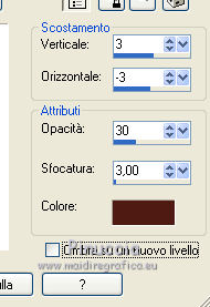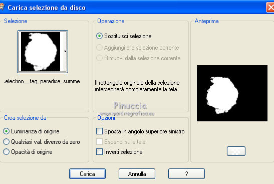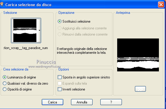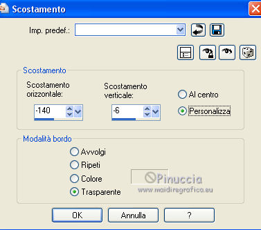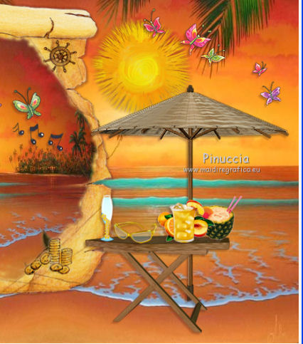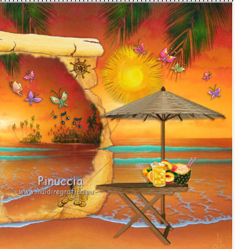 qui puoi trovare qualche risposta ai tuoi dubbi. Se l'argomento che ti interessa non è presente, ti prego di segnalarmelo. Questo tutorial è una creazione di ©Titoune e non può essere copiato su altri siti nè essere offerto per il download. Lo stesso vale per la mia traduzione. Il tutorial è stato creato con PSP X5, ma può essere eseguito anche con le altre versioni di PSP. Secondo la versione utilizzata (anteriore a PSP X) potresti ottenere dei risultati differenti. Vedi la mia scheda riguardante le funzioni Rifletti>Capovolgi in X4 e X5 qui Per tradure il tutorial ho usato PSP X. Occorrente: Un tube a scelta. Il resto del materiale qui Filtri: se hai problemi con i filtri consulta la mia sezione filtri qui Eye Candy 4000 - Jiggle qui Animation Shop qui ![]() Metti le selezioni nella cartella Selezioni. 1. Apri una nuova immagine trasparente 750 x 600 pixels. Selezione>Seleziona tutto. 2. Apri l'immagine 29_06_2008_0635603001214749906_david_miller. Duplicala 2 volte usando la combinazione di tasti maiuscola+D. Chiudi l'originale. 3. Attiva la prima copia. Effetti>Effetti di riflesso>Specchio rotante. ![]() Modifica>Copia (e puoi chiudere questa copia perchè non ti servirà più). Torna al tuo lavoro e vai a Modifica>Incolla nella selezione. Selezione>Deseleziona. 4. Apri l'elemento 91d8f7e2 e vai a Modifica>Copia. Torna al tuo lavoro e vai a Modifica>Incolla come nuovo livello. 5. Effetti>Effetti di immagine>Scostamento. ![]() 6. Selezione>Carica/Salva selezione>Carica selezione da disco. Cerca e carica la selezione "selection_tag_paradise_summer". ![]() Livelli>Nuovo livello raster. Attiva la seconda copia dell'immagine e vai a Modifica>Copia. Torna al tuo lavoro e vai a Modifica>Incolla nella selezione. Selezione>Deseleziona. 7. Attiva il livello della pergamena. Effetti>Effetti 3D>Sfalsa ombra, con il colore #4f1c13. ![]() Ripeti l'Effetto Sfalsa ombra, cambiando verticale e orizzontale con -3. 8. Attiva il livello superiore. Apri l'elemento Sun e vai a Modifica>Copia. Torna al tuo lavoro e vai a Modifica>Incolla come nuovo livello. Spostalo in alto a destra.Vedi l'esempio finale. Effetti>Effetti 3D>Sfalsa ombra, con i settaggi precedenti. 9. Apri il tube ME_butterflies, che è composto da due livelli. Copia e incolla sul tuo lavoro entrambi i livelli, e posiziona gli elementi come preferisci,o vedi il mio esempio. ![]() Su entrambi i livelli: Effetti>Effetti 3D>Sfalsa ombra, colore #4f1c13. ![]() 11. Apri l'elemento Umbrella e vai a Modifica>Copia. Torna al tuo lavoro e vai a Modifica>Incolla come nuovo livello. Spostalo in basso a destra.Vedi l'esempio finale. Effetti>Effetti 3D>Sfalsa ombra, con i settaggi precedenti. 12. Apri l'elemento Table e vai a Modifica>Copia. Torna al tuo lavoro e vai a Modifica>Incolla come nuovo livello. Spostalo in basso davanti all'ombrello.![]() Effetti>Effetti 3D>Sfalsa ombra, con i settaggi precedenti. 13. Apri l'elemento Drink2 e vai a Modifica>Copia. Torna al tuo lavoro e vai a Modifica>Incolla come nuovo livello. Spostalo sul tavolo come nel mio esempio.Effetti>Effetti 3D>Sfalsa ombra, con i settaggi precedenti. Apri l'elemento orangepeachjuic e vai a Modifica>Copia. Torna al tuo lavoro e vai a Modifica>Incolla come nuovo livello. Sposta anche questo elemento sul tavolo.![]() Effetti>Effetti 3D>Sfalsa ombra, con i settaggi precedenti. 14. Apri l'elemento Sunglasses e vai a Modifica>Copia. Torna al tuo lavoro e vai a Modifica>Incolla come nuovo livello. Spostalo sul tavolo.Vedi l'esempio finale. Effetti>Effetti 3D>Sfalsa ombra, con i settaggi precedenti. 15. Apri l'elemento Drink e vai a Modifica>Copia. Torna al tuo lavoro e vai a Modifica>Incolla come nuovo livello. Spostalo accanto agli occhiali.![]() Effetti>Effetti 3D>Sfalsa ombra, con i settaggi precedenti. 16. Apri l'elemento shell_pearls e vai a Modifica>Copia. Torna al tuo lavoro e vai a Modifica>Incolla come nuovo livello. Spostalo in basso a destra.Vedi l'esempio finale. Effetti>Effetti 3D>Sfalsa ombra, con i settaggi precedenti. 17. Apri l'elemento shells e vai a Modifica>Copia. Torna al tuo lavoro e vai a Modifica>Incolla come nuovo livello. Sposta anche questo elemento in basso.![]() Effetti>Effetti 3D>Sfalsa ombra, con i settaggi precedenti. 18. Apri l'elemento Shell e vai a Modifica>Copia. Torna al tuo lavoro e vai a Modifica>Incolla come nuovo livello. Spostalo nell'angolo in basso a sinistra.Vedi l'esempio finale. Effetti>Effetti 3D>Sfalsa ombra, con i settaggi precedenti. 19. Apri il tuo tube e vai a Modifica>Copia. Torna al tuo lavoro e vai a Modifica>Incolla come nuovo livello. Immagine>Ridimensiona, se e quanto necessario, tutti i livelli non selezionato. Spostalo dove preferisci,o vedi il mio esempio. Effetti>Effetti 3D>Sfalsa ombra, con i settaggi precedenti. 20. Attiva il livello Raster 1. Livelli>Duplica, e rinomina questo livello "animazione". 21. Apri l'elemento sable vai a Modifica>Copia. Torna al tuo lavoro e vai a Modifica>Incolla come nuovo livello. Spostalo in basso.Vedi l'esempio finale. 22. Apri l'elemento titoune_frame vai a Modifica>Copia. Torna al tuo lavoro e vai a Modifica>Incolla come nuovo livello. Firma il tuo lavoro. 23. Animazione. Attiva il livello "animazione". Selezione>Carica/Salva selezione>Carica selezione da disco. Cerca e carica la selezione "selection_tag_paradise_summer2". ![]() Selezione>Innalza selezione a livello. Livelli>Duplica - 2 volte. 24. Rimani posizionato sul livello della seconda copia. Effetti>Plugins>Eye Candy 4000 - Jiggle. ![]() 25. Attiva il livello della prima copia. Effetti>Plugins>Eye Candy 4000 - Jiggle, clicca su Random Seed e ok. Chiudi questo livello e mantieni selezionato. 26. Attiva il livello "animazione". Effetti>Plugins>Eye Candy 4000 - Jiggle, clicca su Random Seed e ok. Selezione>Deseleziona. Lascia il livello visibile. 27. Modifica>Copia Unione. Apri Animation Shop e vai a Modifica>Incolla>Incolla come nuova animazione. Torna in PSP. Chiudi il livello "animazione" e apri il livello della prima copia. Modi