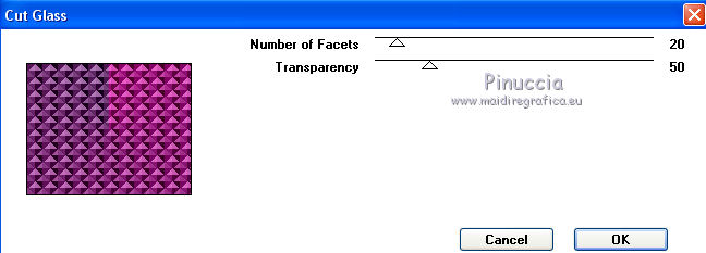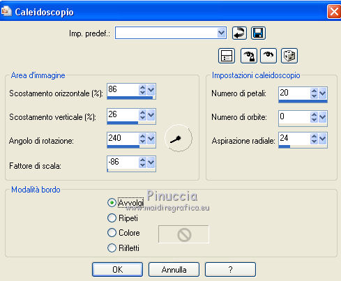 Selezione>Deseleziona.Effetti>Effetti 3D>Smusso a incasso, con i settaggi precedenti. 25. Attiva il livello Raster 1. Selezione>Seleziona tutto. Immagine>Ritaglia la selezione. Immagine>Dimensioni tela - 800 x 650 pixels. ![]() Livelli>Nuovo livello raster. Livelli>Disponi>Sposta giù. 26. Selezione>Seleziona tutto. Attiva nuovamente l'elemento paper 3, e vai a Modifica>Copia. Torna al tuo lavoro e vai a Modifica>Incolla nella selezione. Selezione>Modifica>Contrai - 25 pixels. Selezione>Inverti. Regola>Sfocatura>Sfocatura gaussiana - raggio 50. ![]() Selezione>Innalza selezione a livello. 27. Effetti>Effetti di trama>Plastica morbida. ![]() Effetti>Effetti 3D>Smusso a incasso, con i settaggi precedenti. Mantieni selezionato. 28. Attiva nuovamente il livello superiore (bordo). Effetti>Effetti di riflesso>Caleidoscopio. ![]() Selezione>Deseleziona. Effetti>Effetti 3D>Sfalsa ombra, colore #623871. ![]() Ripeti l'Effetto Sfalsa ombra, cambiando verticale e orizzontale -3/3. 29. Rimani posizionato sul livello superiore. Livelli>Nuovo livello raster. Riempi con il gradiente.Effetti>Plugins>Graphics Plus - Cut Glass, con i settaggi standard. Effetti>Effetti di riflesso>Specchio rotante, con i settaggi precedenti. Selezione>Seleziona tutto. Selezione>Modifica>Contrai - 3 pixels. Premi sulla tastiera il tasto CANC. Selezione>Deseleziona. Effetti>Effetti 3D>Smusso a incasso, con i settaggi precedenti. Firma il tuo lavoro. Livelli>Unisci>Unisci tutto e salva in formato jpg. ![]() Se hai problemi o dubbi, o trovi un link non funzionante, scrivimi. 13 Giugno 2015 |