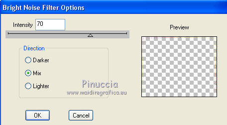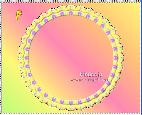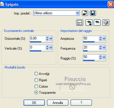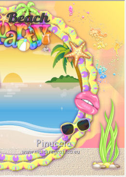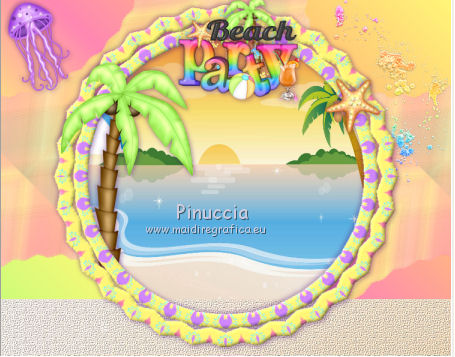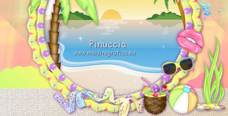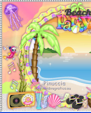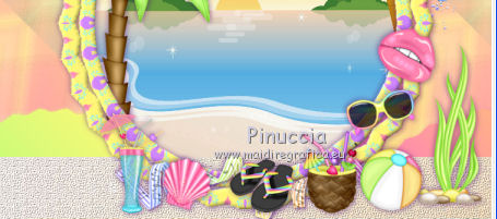 qui puoi trovare qualche risposta ai tuoi dubbi. Se l'argomento che ti interessa non è presente, ti prego di segnalarmelo. Questo tutorial è una creazione di ©Titoune e non può essere copiato su altri siti nè essere offerto per il download. Lo stesso vale per la mia traduzione. Il tutorial è stato creato con PSP X5, ma può essere eseguito anche con le altre versioni di PSP. Secondo la versione utilizzata (anteriore a PSP X) potresti ottenere dei risultati differenti. Dalla versione X4, il comando Immagine>Rifletti è stato sostituito con Immagine>Capovolgi in orizzontale, e il comando Immagine>Capovolgi con Immagine>Capovolgi in verticale. Nelle versioni X5 e X6, le funzioni sono state migliorate rendendo disponibile il menu Oggetti. Vedi la scheda sull'argomento qui Per tradure il tutorial ho usato PSP X. Occorrente: Un tube a scelta. Il resto del materiale qui Filtri in caso di dubbi, ricorda di consultare la mia sezione filtri qui DSB Flux - Bright Noise qui Simple - Diamonds qui Animation Shop qui ![]() Metti il gradiente nella cartella Gradienti. 1. Passa il colore di primo piano a Gradiente, e seleziona il gradiente "gradient_pastel_sea", con i seguenti settaggi. ![]() 2. Apri una nuova immagine trasparente 750 x 600 pixels, e riempila con il gradiente.3. Apri l'elemento Frame, e vai a Modifica>Copia. Torna al tuo lavoro e vai a Modifica>Incolla come nuovo livello. 4. Attiva lo strumento Bacchetta magica ![]() e clicca all'esterno della cornice per selezionarlo. ![]() Attiva il livello Raster 1. Selezione>Innalza selezione a livello. 5. Effetti>Effetti di trama>Plastica morbida. ![]() Selezione>Deseleziona. 6. Livelli>Duplica. Immagine>Rifletti. Abbassa l'opacità di questo livello al 50%. Livelli>Unisci>Unisci giù. 7. Di nuovo attiva il livello della cornice, e clicca all'esterno della cornice con la bacchetta magica ![]() 8. Attiva il livello della selezione innalzata. Effetti>Plugins>Simple - Diamonds. Selezione>Deseleziona. 9. Ritorna sul livello della cornice. Clicca al centro della cornice per selezionarla con la bacchetta magica ![]() Selezione>Modifica>Espandi - 5 pixels. Livelli>Nuovo livello raster. Livelli>Disponi>Sposta giù. 10. Apri l'immagine Vector Beach Wallpapers e vai a Modifica>Copia. Torna al tuo lavoro e vai a Modifica>Incolla nella selezione. Selezione>Deseleziona. 11. Ritorna sul livello della cornice. Effetti>Effetti 3D>Sfalsa ombra, colore #44016d. ![]() Ripeti l'Effetto Sfalsa ombra, cambiando verticale e orizzontale con -3. 12. Apri l'elemento sable e vai a Modifica>Copia. Torna al tuo lavoro e vai a Modifica>Incolla come nuovo livello. Spostalo sotto la cornice.Vedi l'esempio finale. Porta questo livello sotto il livello della cornice. Rimani su questo livello. 13. Apri l'elemento MC_BeachParty_E07. e vai a Modifica>Copia. Torna al tuo lavoro e vai a Modifica>Incolla come nuovo livello. Spostalo nella cornice, a sinistra.Vedi l'esempio finale. Livelli>Duplica. Livelli>Disponi>Sposta su (sopra il livello della cornice). 14. Attiva lo strumento Gomma ![]() e cancella la parte del tronco che deborda sulla cornice. ![]() Attiva il livello originale. Effetti>Effetti 3D>Sfalsa ombra, con i settaggi precedenti. 15. Attiva il livello superiore. Apri l'elemento l'élément MC_BeachParty_E01, e vai a Modifica>Copia. Torna al tuo lavoro e vai a Modifica>Incolla come nuovo livello. Spostalo nella parte superiore della cornice.Vedi l'esempio finale. Effetti>Effetti 3D>Sfalsa ombra, con i settaggi precedenti. 16. Apri l'elemento MC_BeachParty_E14, e vai a Modifica>Copia. Torna al tuo lavoro e vai a Modifica>Incolla come nuovo livello. Spostalo nell'angolo in alto a sinistra.Vedi l'esempio finale. Effetti>Effetti 3D>Sfalsa ombra, con i settaggi precedenti. 17. Apri l'elemento MC_BeachParty_E17, e vai a Modifica>Copia. Torna al tuo lavoro e vai a Modifica>Incolla come nuovo livello. Spostalo nella parte superiore destra della cornice.Vedi l'esempio finale. Effetti>Effetti 3D>Sfalsa ombra, con i settaggi precedenti. 18. Apri l'elemento MC_BeachParty_E15, e vai a Modifica>Copia. Torna al tuo lavoro e vai a Modifica>Incolla come nuovo livello. Spostalo a destra.Vedi l'esempio finale. Porta questo livello sotto il livello della cornice. Niente Sfalsa ombra. ![]() 19. Attiva nuovamente il livello superiore. Apri l'elemento MC_BeachParty_E35, e vai a Modifica>Copia. Torna al tuo lavoro e vai a Modifica>Incolla come nuovo livello. Spostalo sulla parte superiore destra della cornice.Vedi l'esempio finale. Effetti>Effetti 3D>Sfalsa ombra, con i settaggi precedenti. 20. Apri l'elemento MC_BeachParty_E34, e vai a Modifica>Copia. Torna al tuo lavoro e vai a Modifica>Incolla come nuovo livello. Spostalo sotto l'elemento precedente.Vedi l'esempio finale. Effetti>Effetti 3D>Sfalsa ombra, con i settaggi precedenti. 21. Apri l'elemento MC_BeachParty_E18, e vai a Modifica>Copia. Torna al tuo lavoro e vai a Modifica>Incolla come nuovo livello. Spostalo nell'angolo in basso a destra.![]() Effetti>Effetti 3D>Sfalsa ombra, con i settaggi precedenti. 22. Apri l'elemento MC_BeachParty_E24, e vai a Modifica>Copia. Torna al tuo lavoro e vai a Modifica>Incolla come nuovo livello. Spostalo sotto la cornice.Vedi l'esempio finale. Effetti>Effetti 3D>Sfalsa ombra, con i settaggi precedenti. 23. Apri l'elemento MC_BeachParty_E19, e vai a Modifica>Copia. Torna al tuo lavoro e vai a Modifica>Incolla come nuovo livello. Spostalo in basso a destra.Vedi l'esempio finale. Effetti>Effetti 3D>Sfalsa ombra, con i settaggi precedenti. 24. Apri l'elemento MC_BeachParty_E23, e vai a Modifica>Copia. Torna al tuo lavoro e vai a Modifica>Incolla come nuovo livello. Sposta anche questo elemento in basso a destra.![]() Effetti>Effetti 3D>Sfalsa ombra, con i settaggi precedenti. 25. Apri l'elemento MC_BeachParty_E32, e vai a Modifica>Copia. Torna al tuo lavoro e vai a Modifica>Incolla come nuovo livello. Spostalo sotto la cornice.Vedi l'esempio finale. Effetti>Effetti 3D>Sfalsa ombra, con i settaggi precedenti