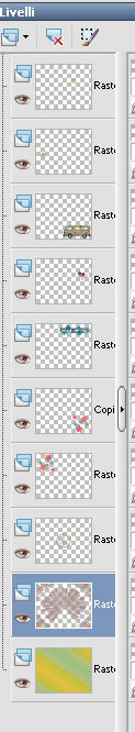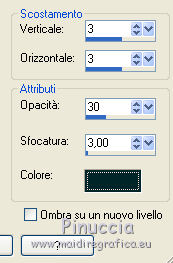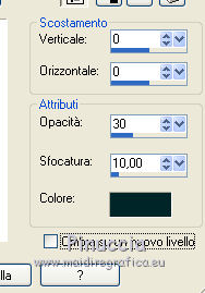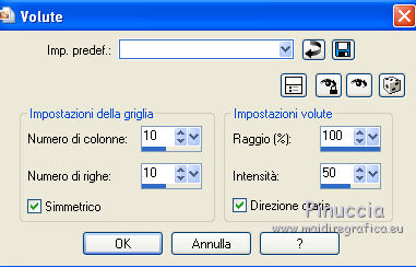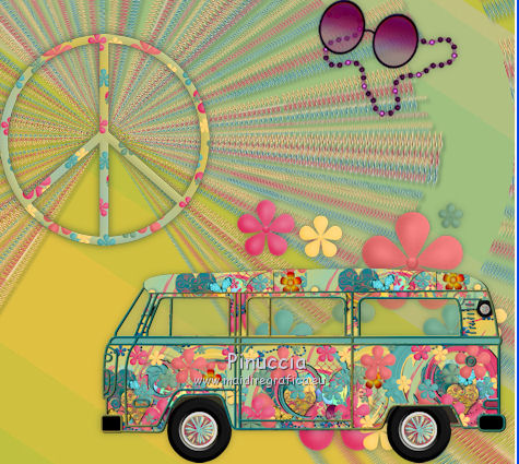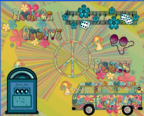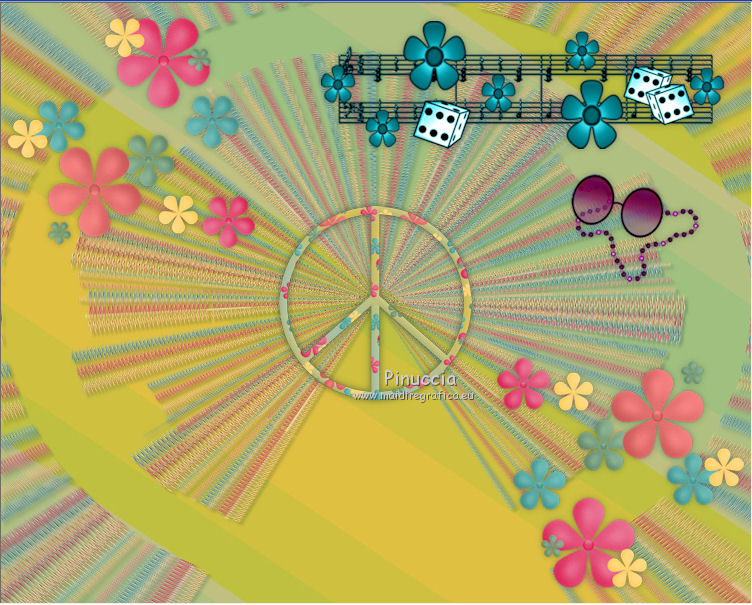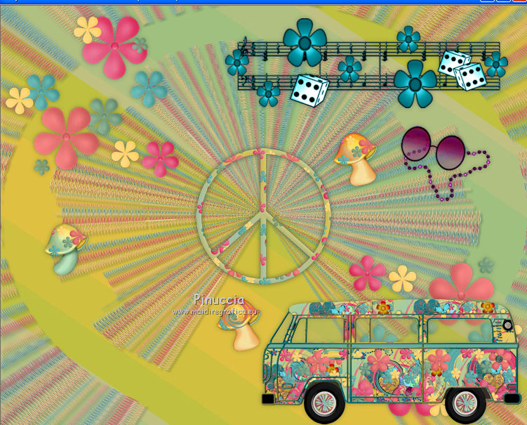 qui puoi trovare qualche risposta ai tuoi dubbi. Se l'argomento che ti interessa non è presente, ti prego di segnalarmelo. Questo tutorial è una creazione di ©Titoune e non può essere copiato su altri siti nè essere offerto per il download. Lo stesso vale per la mia traduzione. Il tutorial è stato creato con PSP X5, ma può essere eseguito anche con le altre versioni di PSP. Secondo la versione utilizzata (anteriore a PSP X) potresti ottenere dei risultati differenti. Vedi la mia scheda riguardante le funzioni Rifletti>Capovolgi in X4 e X5 qui Per tradure il tutorial ho usato PSP X. Occorrente: Un tube a scelta. Il resto del materiale qui Filtri: Simple - Left Right Wrap (bonus) qui ![]() 1. Apri una nuova immagine trasparente 750 x 600 pixels. Selezione>Seleziona tutto. 2. Apri l'elemento TP_Paper_01 e vai a Modifica>Copia. Torna al tuo lavoro e vai a Modifica>Incolla nella selezione. Mantieni selezionato. 3. Livelli>Nuovo livello raster. Apri l'elemento TP_Beads_02 e vai a Modifica>Copia. Torna al tuo lavoro e vai a Modifica>Incolla nella selezione. Selezione>Deseleziona. 4. Immagine>Ridimensiona, all'85%, tutti i livelli non selezionato. Sposta l'immagine in alto, come nell'esempio.![]() 5. Effetti>Plugins>Simple - Left Right Wrap. 6. Effetti>Effetti di distorsione>Coordinate polari. ![]() Abbassa l'opacità di questo livello al 70%. 7. Effetti>Effetti 3D>Sfalsa ombra, colore #012629. ![]() Ripeti l'Effetto Sfalsa ombra, cambiando verticale e orizzontale con -3. 8. Apri l'elemento TP_PeaceSign_03 e vai a Modifica>Copia. Torna al tuo lavoro e vai a Modifica>Incolla come nuovo livello. Non spostarlo. 9. Effetti>Effetti 3D>Sfalsa ombra, colore #012629. ![]() 10. Apri l'elemento TP_FlowerDeco_01 e vai a Modifica>Copia. Torna al tuo lavoro e vai a Modifica>Incolla come nuovo livello. Spostalo in alto a sinistra.Vedi l'esempio finale. Effetti>Effetti 3D>Sfalsa ombra, con i settaggi precedenti. Livelli>Duplica. Immagine>Rifletti. Immagine>Capovolgi. 11. Apri l'elemento TP_Music_02 e vai a Modifica>Copia. Torna al tuo lavoro e vai a Modifica>Incolla come nuovo livello. Spostalo in alto a destra.Vedi l'esempio finale. Effetti>Effetti 3D>Sfalsa ombra, con i settaggi precedenti. 12. Apri l'elemento TP_GroovySpecks e vai a Modifica>Copia. Torna al tuo lavoro e vai a Modifica>Incolla come nuovo livello. Spostalo a destra.![]() Effetti>Effetti 3D>Sfalsa ombra, con i settaggi precedenti. 13. Apri l'elemento TP_Volkwagen_04 e vai a Modifica>Copia. Torna al tuo lavoro e vai a Modifica>Incolla come nuovo livello. Spostalo in basso a destra.![]() Effetti>Effetti 3D>Sfalsa ombra, con i settaggi precedenti. 14. Copia e incolla sul tuo lavoro uno alla volta gli elementi TP_Shroom_02, TP_Shroom_05, TP_Shroom_06, e posizionali come preferisci,o vedi il mio esempio. ![]() Effetti>Effetti 3D>Sfalsa ombra, con i settaggi precedenti. 15. Apri l'elemento _JukeBox e vai a Modifica>Copia. Torna al tuo lavoro e vai a Modifica>Incolla come nuovo livello. Spostalo in basso a sinistra.Vedi l'esempio finale. Effetti>Effetti 3D>Sfalsa ombra, con i settaggi precedenti. 16. Uno alla volta copia e incolla sul tuo lavoro gli elementi TP_Wordart_01, TP_Wordart_02, TP_Wordart_03 e posizionali come preferisci,o vedi il mio esempio. ![]() Effetti>Effetti 3D>Sfalsa ombra, colore #012629. ![]() Ripeti l'Effetto Sfalsa ombra, cambiando verticale e orizzontale con -3. 17. Apri il tuo tube e vai a Modifica>Copia. Torna al tuo lavoro e vai a Modifica>Incolla come nuovo livello. Immagine>Ridimensiona, se e quanto necessario, tutti i livelli non selezionato. Spostalo dove preferisci,o vedi il mio esempio. Effetti>Effetti 3D>Sfalsa ombra, colore #012629. ![]() 18. Attiva il secondo livello dal basso. ![]() Livelli>Nuovo livello raster. Selezione>Seleziona tutto. 19. Apri l'elemento TP_Paper_03 e vai a Modifica>Copia. Torna al tuo lavoro e vai a Modifica>Incolla nella selezione. Selezione>Modifica>Contrai - 3 pixels. Premi sulla tastiera il tasto CANC ![]() 20. Effetti>Effetti 3D>Smusso a incasso. ![]() Selezione>Deseleziona. Livelli>Duplica. 21. Attiva il livello sottostante dell'originale. Immagine>Ridimensiona, al 95%, tutti i livelli non selezionato. 22. Effetti>Effetti di distorsione>Volute. ![]() 23. Attiva il livello della copia. Livelli>Unisci>Unisci giù. Effetti>Effetti 3D>Sfalsa ombra, colore #012629. ![]() Ripeti l'Effetto Sfalsa ombra, cambiando verticale e orizzontale con -3. Firma il tuo lavoro. Livelli>Unisci>Unisci tutto e salva in formato jpg. ![]() Se hai problemi o dubbi, o trovi un link non funzionante, scrivimi. 9 Luglio 2013 |