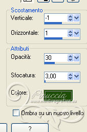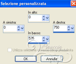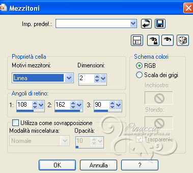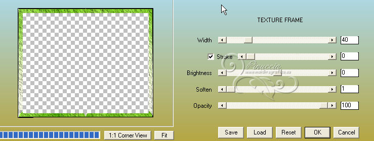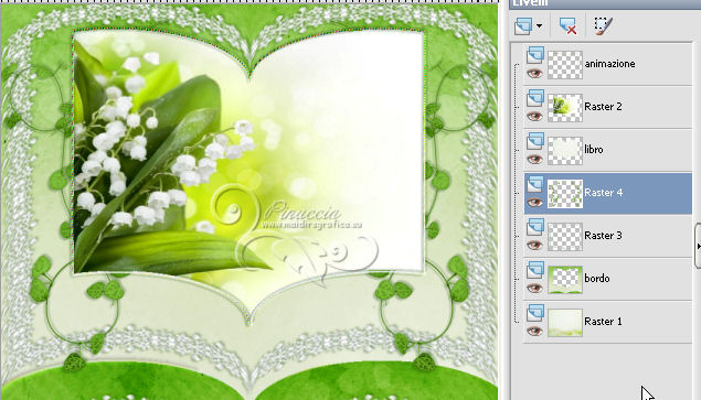 qui puoi trovare qualche risposta ai tuoi dubbi. Se l'argomento che ti interessa non è presente, ti prego di segnalarmelo. Questo tutorial è una creazione di ©Titoune e non può essere copiato su altri siti nè essere offerto per il download. Lo stesso vale per la mia traduzione. Il tutorial è stato creato con PSP X5, ma può essere eseguito anche con le altre versioni di PSP. Secondo la versione utilizzata (anteriore a PSP X) potresti ottenere dei risultati differenti. Per tradurlo, ho usato PSP X. Grazie ai creatori dei tubes che mettono a disposizione il loro lavoro in vari gruppi di condivisione. Rispetta il lavoro degli autori, non cambiare il nome del file e non cancellare il watermark. Occorrente: Un tube a scelta. Il resto del materiale qui Tubes ed elementi di Zezette2 Filtri: Mura's Seamless - Shift at Arch qui AAA Frames - Texture Frame qui Eye Candy 4000 - HSB Noise qui Animation Shop qui ![]() 1. Apri una nuova immagine trasparente 750 x 600 pixels. Selezione>Seleziona tutto. 2. Apri l'immagine "paper2" e vai a Modifica>Copia. Torna al tuo lavoro e vai a Modifica>Incolla nella selezione. Selezione>Deseleziona. 3. Apri l'elemento "element2" e vai a Modifica>Copia. Torna al tuo lavoro e vai a Modifica>Incolla come nuovo livello. 4. Effetti>Plugins>Mura's Seamless - Shift at Arch, con i settaggi standard. ![]() Immagine>Capovolgi. 5. Effetti>Effetti 3D>Smusso a incasso. ![]() Rinomina questo livello "bordo". 6. Attiva lo strumento Bacchetta magica , tolleranza 25e clicca al centro dell'immagine per selezionarla. ![]() Attiva il livello inferiore. Selezione>Innalza selezione a livello. Rinomina questo livello "libro". Livelli>Disponi>Porta in alto. ![]() 7. Livelli>Nuovo livello raster. Apri l'immagine odo9e981 e vai a Modifica>Copia. Torna al tuo lavoro e vai a Modifica>Incolla nella selezione. 8. Selezione>Modifica>Seleziona bordature selezione. ![]() 9. Attiva il livello "bordo". Selezione>Innalza selezione a livello. Livelli>Disponi>Porta in alto. 10. Effetti>Effetti artistici>Mezzitoni. ![]() Selezione>Deseleziona. 11. Effetti>Effetti 3D>Sfalsa ombra, con il colore #1e4e06. ![]() Ripeti l'Effetto Sfalsa ombra, cambiando verticale e orizzontale con -3/3. ![]() Rinomina questo livello "animazione". 12. Attiva il livello "bordo". Attiva lo strumento Selezione ![]() clicca sull'icona Selezione personalizzata ![]() e imposta i seguenti settaggi. ![]() 13. Livelli>Nuovo livello raster. Apri l'elemento "lace_frame" e vai a Modifica>Copia. Torna al tuo lavoro e vai a Modifica>Incolla nella selezione. Selezione>Deseleziona. Effetti>Plugins>Mura's Seamless - Shift At Arch, con i settaggi precedenti. Immagine>Capovolgi. Effetti>Effetti 3D>Sfalsa ombra, con i settaggi precedenti. 14. Apri l'elemento "element3" e vai a Modifica>Copia. Torna al tuo lavoro e vai a Modifica>Incolla come nuovo livello. Spostalo a sinistra.L'elemento è coperto dal livello del libro. Premi il tasto D per attivare lo strumento Deformazione ![]() che "ingabbierà" il tube e potrai spostarlo più facilmente. ![]() Livelli>Duplica. Immagine>Rifletti. Livelli>Unisci>Unisci giù. Effetti>Effetti 3D>Sfalsa ombra, con i settaggi precedenti. Lascia il livello sotto il livello "libro". ![]() 15. Attiva il livello superiore. Apri l'elemento ca2a8d3a (vaso con i mughetti) e vai a Modifica>Copia. Torna al tuo lavoro e vai a Modifica>Incolla come nuovo livello. Spostalo in basso a destra.Vedi l'esempio finale. Effetti>Effetti 3D>Sfalsa ombra, con i settaggi precedenti. 16. Apri l'elemento 5724ed80 (mazzetto di mughetti) e vai a Modifica>Copia. Torna al tuo lavoro e vai a Modifica>Incolla come nuovo livello. Spostalo in basso a sinistra.![]() Nessun Effetto Sfalsa ombra. 17. Apri gli elementi titoune_wordart_muguet e titoune_wordart_porte_bonheur. Modifica>Copia. Torna al tuo lavoro e vai a Modifica>Incolla come nuovo livello. Sposta i testi come nel mio esempio.Su entrambi i livelli: Effetti>Effetti 3D>Sfalsa ombra, con i settaggi precedenti. 18. Apri l'elemento "brins_muguets" e vai a Modifica>Copia. Torna al tuo lavoro e vai a Modifica>Incolla come nuovo livello. Spostalo a destra.Vedi l'esempio finale. 19. Effetti>Effetti 3D>Sfalsa ombra, con il colore #1e4e06. ![]() Ripeti l'Effetto Sfalsa ombra, cambiando verticale e orizzontale con -1/1. ![]() 20. Apri l'elemento ptitesouris element 50 OISEAU e vai a Modifica>Copia. Torna al tuo lavoro e vai a Modifica>Incolla come nuovo livello. Spostalo dove preferisci o vedi il mio esempio.![]() Effetti>Effetti 3D>Sfalsa ombra, con i settaggi precedenti. 21. Apri il tuo tube e vai a Modifica>Copia. Torna al tuo lavoro e vai a Modifica>Incolla come nuovo livello. Immagine>Ridimensiona, se e quanto necessario, tutti i livelli non selezionato. Spostalo dove preferisci o vedi il mio esempio.22. Effetti>Effetti 3D>Sfalsa ombra, con il colore #1e4e06. ![]() Ripeti l'Effetto Sfalsa ombra, cambiando verticale e orizzontale con -3/3. 23. Attiva il livello superiore. Livelli>Nuovo livello raster. Imposta il colore di primo piano con il colore bianco #ffffff. Riempi il livello con il colore bianco.24. Selezione>Seleziona tutto. Selezione>Modifica>Contrai - 2 pixels. Premi sulla tastiera il tasto CANC ![]() Selezione>Deseleziona. 25. Attiva il livello "bordo". Modifica>Copia. 26. Attiva il livello Raster 1. Selezione>Seleziona tutto. Immagine>Ritaglia la selezione. 27. Immagine>Dimensioni tela - 800 x 650 pixels. ![]() 28. Livelli>Nuovo livello raster. Livelli>Disponi>Sposta giù. Selezione>Seleziona tutto. Modifica>Incolla nella selezione. 29. Selezione>Modifica>Contrai - 25 pixels. Selezione>Inverti. Selezione>Innalza selezione a livello. 30. Effetti>Plugins>AAA Frames - Texture Frame. ![]() Effetti>Effetti 3D>Smusso a incasso, con i settaggi precedenti. 31. Attiva il livello superiore. Selezione>Seleziona tutto. Livelli>Nuovo livello raster. Riempi il livello con il colore bianco.32. Selezione>Modifica>Contrai - 2 pixels. Premi sulla tastiera il tasto CANC ![]() Selezione>Deseleziona.