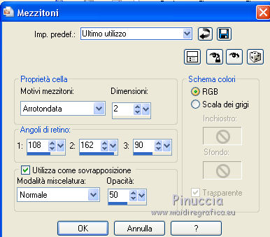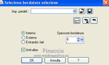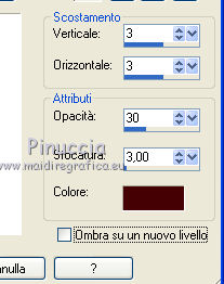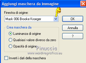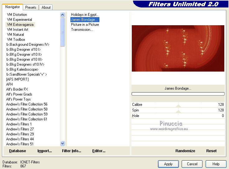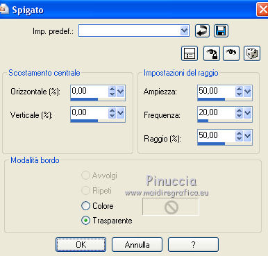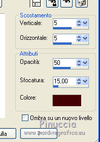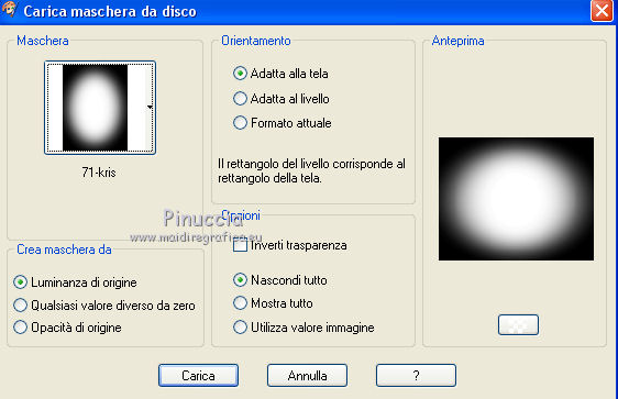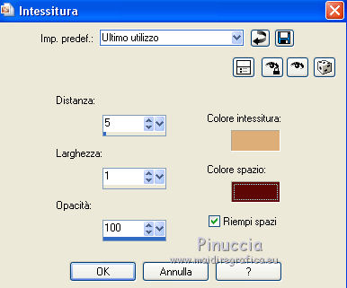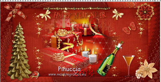 qui puoi trovare qualche risposta ai tuoi dubbi. Se l'argomento che ti interessa non è presente, ti prego di segnalarmelo. Questo tutorial è una creazione di ©Titoune e non può essere copiato su altri siti nè essere offerto per il download. Lo stesso vale per la mia traduzione. Il tutorial è stato creato con PSP X5, ma può essere eseguito anche con le altre versioni di PSP. Secondo la versione utilizzata (anteriore a PSP X) potresti ottenere dei risultati differenti. Vedi la mia scheda riguardante le funzioni Rifletti>Capovolgi in X4 e X5 qui Per tradurre il tutorial ho usato PSP X. Occorrente: Un tube a scelta. Il resto del materiale qui Il tube utilizzato è di Hellonlegs. Filtri in caso di dubbi, ricorda di consultare la mia sezione filtri qui Filters Unlimited 2.0 qui VM Extravaganza - James Bondage qui ![]() Metti la maschera 71-kris nella cartella Maschere. Apri la seconda maschera in PSP e minimizzala con il resto del materiale. 1. Imposta il colore di primo piano con #af2b19, e il colore di sfondo con #5f0906. Passa il colore di primo piano a Gradiente di primo piano/sfondo, stile Sprazzo di luce. ![]() 2. Apri una nuova immagine trasparente 1280 x 650 pixels. Selezione>Seleziona tutto. 3. Apri l'element GGS_Paper 2 e vai a Modifica>Copia. Torna al tuo lavoro e vai a Modifica>Incolla nella selezione. Selezione>Deseleziona. Livelli>Duplica. 4. Immagine>Ridimensiona, all'85%, tutti i livelli non selezionato. Rinomina questo livello "centro". Selezione>Seleziona tutto. Selezione>Mobile. Selezione>Immobilizza. Selezione>Inverti. 5. Attiva il livello Raster 1. Regola>Sfocatura>Sfocatura gaussiana - raggio 25. ![]() 6. Effetti>Effetti di trama>Intessitura. colore intessitura #deae78 colore spazio #5e0906. ![]() 7. Effetti>Plugins>Filters Unlimited 2.0 - VM Extravaganza - James Bondage, con i settaggi standard. ![]() Selezione>Innalza selezione a livello. 8. Effetti>Effetti 3D>Smusso a incasso. ![]() 9. Effetti>Effetti di distorsione>Spigato. ![]() 10. Effetti>Effetti 3D>Sfalsa ombra, colore #450206. ![]() Selezione>Deseleziona. 11. Attiva il livello superiore (centro). Selezione>Seleziona tutto. Selezione>Mobile. Selezione>Immobilizza. 12. Selezione>Modifica>Seleziona bordature selezione. ![]() Selezione>Innalza selezione a livello. 13. Effetti>Effetti artistici>Mezzitoni. ![]() Effetti>Effetti 3D>Smusso a incasso, con i settaggi precedenti. Selezione>Deseleziona. 14. Effetti>Effetti 3D>Sfalsa ombra, con i settaggi precedenti. 16. Apri l'immagine 2416_4. Su questa immagine. Livelli>Carica/Salva maschera>Carica maschera da disco. Cerca e carica la maschera "71-kris". ![]() Livelli>Unisci>Unisci gruppo. Modifica>Copia. Torna al tuo top e vai a Modifica>Incolla come nuovo livello. 16. Immagine>Ridimensiona, al 50%, tutti i livelli non selezionato. Regola>Messa a fuoco>Metti a fuoco. Non spostarlo. 17. Apri l'elemento GGS_Beads e vai a Modifica>Copia. Torna al tuo lavoro e vai a Modifica>Incolla come nuovo livello. Spostalo contro il bordo superiore.Vedi l'esempio finale. 18. Effetti>Effetti 3D>Sfalsa ombra, colore #450206. ![]() 19. Apri l'elemento GGS_Banner e vai a Modifica>Copia. Torna al tuo lavoro e vai a Modifica>Incolla come nuovo livello. Spostalo in alto.Vedi l'esempio finale. Effetti>Effetti 3D>Sfalsa ombra, con i settaggi precedenti. 20. Apri l'elemento GGS_Sparkly Edge Bow e vai a Modifica>Copia. Torna al tuo lavoro e vai a Modifica>Incolla come nuovo livello. Spostalo in alto a sinistra.Vedi l'esempio finale. Effetti>Effetti 3D>Sfalsa ombra, con i settaggi precedenti. 21. Apri l'elemento GGS_Glitter Flower e vai a Modifica>Copia. Torna al tuo lavoro e vai a Modifica>Incolla come nuovo livello. Spostalo in alto a destra.Vedi l'esempio finale. Effetti>Effetti 3D>Sfalsa ombra, con i settaggi precedenti. 22. Apri l'elemento GGS_Butterfly e vai a Modifica>Copia. Torna al tuo lavoro e vai a Modifica>Incolla come nuovo livello. Spostalo a destra.Vedi l'esempio finale. Effetti>Effetti 3D>Sfalsa ombra, con i settaggi precedenti. 23. Apri l'elemento GGS_Winter Flower Deco e vai a Modifica>Copia. Torna al tuo lavoro e vai a Modifica>Incolla come nuovo livello. Spostalo in basso a destra.![]() Effetti>Effetti 3D>Sfalsa ombra, con i settaggi precedenti. 24. Apri l'elemento GGS_Wine Glass e vai a Modifica>Copia. Torna al tuo lavoro e vai a Modifica>Incolla come nuovo livello. Spostalo in basso.Vedi l'esempio finale. Effetti>Effetti 3D>Sfalsa ombra, con i settaggi precedenti. 25. Apri l'elemento GGS_Champagne Bottle e vai a Modifica>Copia. Torna al tuo lavoro e vai a Modifica>Incolla come nuovo livello. Spostalo in basso.Vedi l'esempio finale. Effetti>Effetti 3D>Sfalsa ombra, con i settaggi precedenti. 26. Apri l'elemento wordart2014 e vai a Modifica>Copia. Torna al tuo lavoro e vai a Modifica>Incolla come nuovo livello. Spostalo in basso.Vedi l'esempio finale. Effetti>Effetti 3D>Sfalsa ombra, con i settaggi precedenti. 27. Apri l'elemento GGS_Lady Bug Brooch e vai a Modifica>Copia. Torna al tuo lavoro e vai a Modifica>Incolla come nuovo livello. Spostalo nella parte inferiore.Vedi l'esempio finale. Effetti>Effetti 3D>Sfalsa ombra, con i settaggi precedenti. 28. Apri l'elemento GGS_Tree e vai a Modifica>Copia. Torna al tuo lavoro e vai a Modifica>Incolla come nuovo livello. Spostalo in basso a sinistra.![]() Effetti>Effetti 3D>Sfalsa ombra, con i settaggi precedenti. 29. Apri il tuo tube e vai a Modifica>Copia. Torna al tuo lavoro e vai a Modifica>Incolla come nuovo livello. Immagine>Ridimensiona, se e quanto necessario, tutti i livelli non selezionato. Regola>Messa a fuoco>Metti a fuoco. Spostalo dove preferisci,o vedi il mio esempio. Effetti>Effetti 3D>Sfalsa ombra, con i settaggi precedenti. 30. Attiva il livello inferiore. Selezione>Seleziona tutto. Immagine>Ritaglia la selezione. 31. Immagine>Dimensioni tela - 1280 x 1500 pixels. ![]() 32. Livelli>Nuovo livello raster. Livelli>Disponi>Sposta giù. Riempi con il gradiente.33. Apri una nuova immagine trasparente 1280 x 350 pixels.