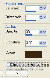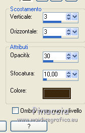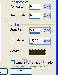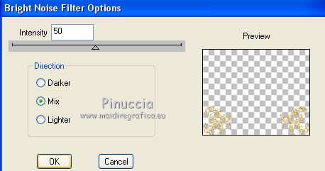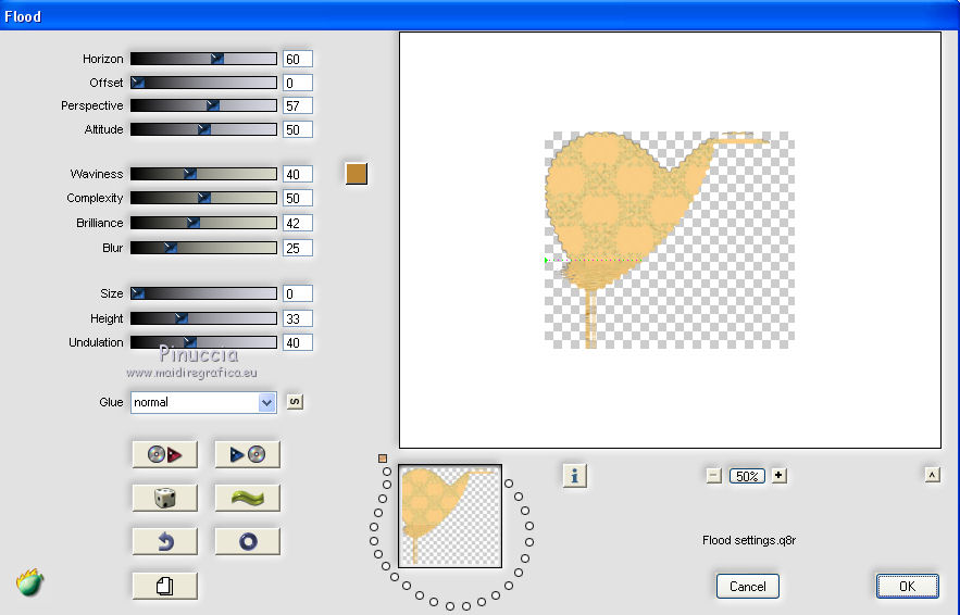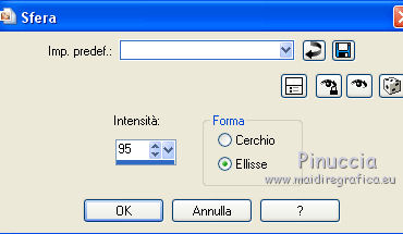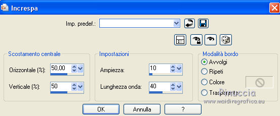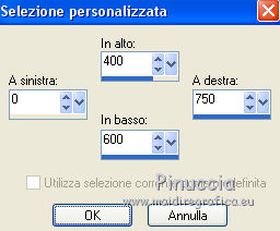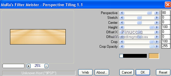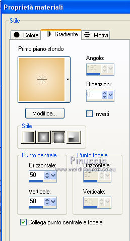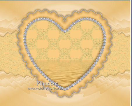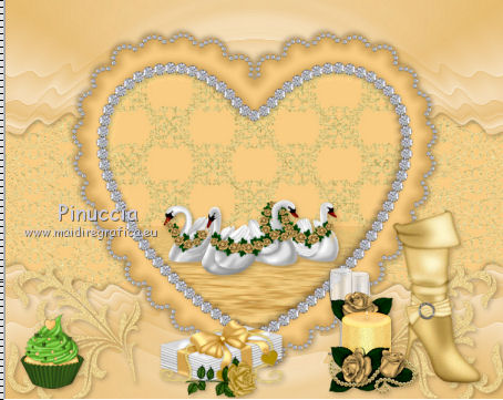 qui puoi trovare qualche risposta ai tuoi dubbi. Se l'argomento che ti interessa non è presente, ti prego di segnalarmelo. Questo tutorial è una creazione di ©Titoune e non può essere copiato su altri siti nè essere offerto per il download. Lo stesso vale per la mia traduzione. Il tutorial è stato creato con PSP X5, ma può essere eseguito anche con le altre versioni di PSP. Secondo la versione utilizzata (anteriore a PSP X) potresti ottenere dei risultati differenti. Dalla versione X4, il comando Immagine>Rifletti è stato sostituito con Immagine>Capovolgi in orizzontale, e il comando Immagine>Capovolgi con Immagine>Capovolgi in verticale. Nelle versioni X5 e X6, le funzioni sono state migliorate rendendo disponibile il menu Oggetti. Con il nuovo X7 sono tornati i comandi Rifletti/Capovolgi, ma con nuove differenze. Vedi la scheda sull'argomento qui Per tradure il tutorial ho usato PSP X. Occorrente: Un tube a scelta. Il resto del materiale qui Il tube utilizzato è di Radi . Filtri in caso di dubbi, ricorda di consultare la mia sezione filtri qui Filters Unlimited 2.0 qui Flaming Pear - Flood qui DSB Flux - Bright Noise qui Mura's Meister - Perspective Tiling qui Penta.com - Jeans qui I filtri Penta.com si possono usare da soli o importati in Filters Unlimited (come fare vedi qui) Se un filtro fornito appare con questa icona Animation Shop qui ![]() 1. Imposta il colore di primo piano con #fbeed9, e il colore di sfondo con #e7bc72. Passa il colore di primo piano a Gradiente di primo piano/sfondo, stile Sprazzo di luce. ![]() 2. Apri una nuova immagine trasparente 750 x 600 pixels, e riempila con il gradiente.3. Attiva lo strumento Selezione ![]() (non importa il tipo di selezione impostato, perchè con la selezione personalizzata si ottiene sempre un rettangolo) clicca sull'icona Selezione personalizzata ![]() e imposta i seguenti settaggi. ![]() Selezione>Innalza selezione a livello. 4. Effetti>Plugins>Mura's Meister - Perspective Tiling, con i settaggi standard. Clicca su Reset per assicurarti di avere impostati i settaggi standard. ![]() Effetti>Effetti di bordo>Aumenta. Selezione>Deseleziona. 5. Effetti>Effetti geometrici>Sfera. ![]() Livelli>Duplica. Immagine>Capovolgi. Livelli>Unisci>Unisci giù. 6. Effetti>Effetti di distorsione>Increspa. ![]() Rinomina questo livello "increspa". 7. Attiva lo strumento Bacchetta magica ![]() e clicca al centro dell'immagine. ![]() Selezione>Modifica>Espandi - 5 pixels. Livelli>Nuovo livello raster. Livelli>Disponi>Sposta giù. 8. Apri l'elemento Paper 6 e vai a Modifica>Copia. Torna al tuo lavoro e vai a Modifica>Incolla nella selezione. Selezione>Deseleziona. 9. Attiva il livello "increspa". Effetti>Effetti 3D>Sfalsa ombra, colore #3a280e. ![]() Ripeti l'Effetto Sfalsa ombra, cambiando verticale e orizzontale con -3. 10. Apri l'elemento Frame 3 e vai a Modifica>Copia. Torna al tuo lavoro e vai a Modifica>Incolla come nuovo livello. Non spostarlo. 11. Attiva lo strumento Bacchetta magica e clicca al centro della cornice per selezionara. Selezione>Modifica>Espandi - 5 pixels. Livelli>Nuovo livello raster. Livelli>Disponi>Sposta giù. 12. Apri l'elemento Paper 9 e vai a Modifica>Copia. Torna al tuo lavoro e vai a Modifica>Incolla nella selezione. Mantieni selezionato. 13. Effetti>Plugins>Flaming Pear - Flood - colore #bd8733. ![]() 14. Effetti>Effetti 3D>Smusso a incasso. ![]() Selezione>Deseleziona. Risultato ![]() 15. Attiva nuovamente il livello della cornice. Effetti>Effetti 3D>Sfalsa ombra, con i settaggi precedenti. 16. Apri l'elemento Swans 3 e vai a Modifica>Copia. Torna al tuo lavoro e vai a Modifica>Incolla come nuovo livello. Spostalo al centro del cuore.Vedi il risultato finale. Effetti>Effetti 3D>Sfalsa ombra, colore #3a280e. ![]() 17. Apri l'elemento Doodle 3 e vai a Modifica>Copia. Torna al tuo lavoro e vai a Modifica>Incolla come nuovo livello. Spostalo in basso a sinistra.Vedi il risultato finale. 18. Effetti>Effetti di riflesso>Specchio rotante. ![]() Effetti>Effetti 3D>Sfalsa ombra, con i settaggi precedenti. Rinomina questo livello "animazione". 19. Apri l'elemento Cupcake 2 e vai a Modifica>Copia. Torna al tuo lavoro e vai a Modifica>Incolla come nuovo livello. Spostalo in basso a sinistra.Vedi il risultato finale. Effetti>Effetti 3D>Sfalsa ombra, con i settaggi precedenti. 20. Apri l'elemento "Element 6" e vai a Modifica>Copia. Torna al tuo lavoro e vai a Modifica>Incolla come nuovo livello. Spostalo in basso al centro.Vedi il risultato finale. Effetti>Effetti 3D>Sfalsa ombra, con i settaggi precedenti. 21. Apri l'elemento "boot 3" e vai a Modifica>Copia. Torna al tuo lavoro e vai a Modifica>Incolla come nuovo livello. Spostalo in basso a destra.Vedi il risultato finale. Effetti>Effetti 3D>Sfalsa ombra, con i settaggi precedenti. 22. Apri l'elemento "Element 3" e vai a Modifica>Copia. Torna al tuo lavoro e vai a Modifica>Incolla come nuovo livello. Spostalo in basso a destra.![]() Effetti>Effetti 3D>Sfalsa ombra, con i settaggi precedenti. 23. Apri l'elemento "Butterfly 2" e vai a Modifica>Copia. Torna al tuo lavoro e vai a Modifica>Incolla come nuovo livello. Spostalo in alto a destra.Vedi il risultato finale. Effetti>Effetti 3D>Sfalsa ombra, con i settaggi precedenti. 24. Apri l'elemento "Bow 3" e vai a Modifica>Copia. Torna al tuo lavoro e vai a Modifica>Incolla come nuovo livello. Spostalo nell'angolo in alto a destra.Vedi il risultato finale. Effetti>Effetti 3D>Sfalsa ombra, con i settaggi precedenti. 25. Apri l'elemento "Beads 1" e vai a Modifica>Copia. Torna al tuo lavoro e vai a Modifica>Incolla come nuovo livello. Spostalo nell'angolo in alto a sinistra.![]() Effetti>Effetti 3D>Sfalsa ombra, con i settaggi precedenti. 26. Apri l'elemento wordart e vai a Modifica>Copia. Torna al tuo lavoro e vai a Modifica>Incolla come nuovo livello. Spostalo dove preferisci,o vedi il mio esempio. Effetti>Effetti 3D>Sfalsa ombra, colore #3a280e. ![]() 27. Apri il tuo tube e vai a Modifica>Copia. Torna al tuo lavoro e vai a Modif