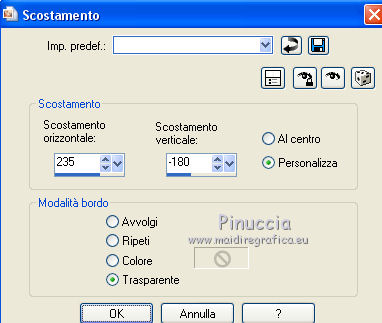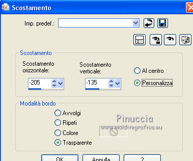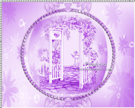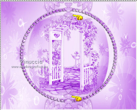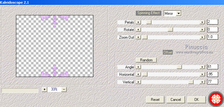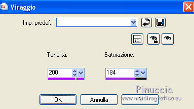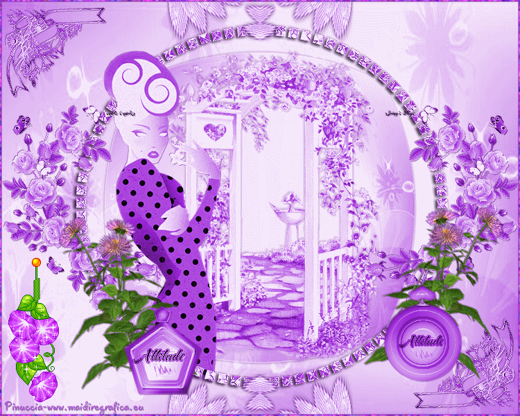 qui puoi trovare qualche risposta ai tuoi dubbi. Se l'argomento che ti interessa non è presente, ti prego di segnalarmelo. Questo tutorial è una creazione di ©Titoune e non può essere copiato su altri siti nè essere offerto per il download. Lo stesso vale per la mia traduzione. Il tutorial è stato creato con Corel17, ma può essere eseguito anche con le altre versioni di PSP. Secondo la versione utilizzata (anteriore a PSP X) potresti ottenere dei risultati differenti. Dalla versione X4, il comando Immagine>Rifletti è stato sostituito con Immagine>Capovolgi in orizzontale, e il comando Immagine>Capovolgi con Immagine>Capovolgi in verticale. Nelle versioni X5 e X6, le funzioni sono state migliorate rendendo disponibile il menu Oggetti. Con il nuovo X7 sono tornati i comandi Rifletti/Capovolgi, ma con nuove differenze. Vedi la scheda sull'argomento qui Per tradurre il tutorial ho usato PSP X. Occorrente: Un tube a scelta. Il resto del materiale qui Il tube utilizzato è di Odette. Filtri in caso di dubbi, ricorda di consultare la mia sezione filtri qui Mehdi - Kaleidoscope 2-1 qui Eye Candy 4000 - HSB Noise qui Animation Shop qui ![]() 1. Scegli un colore che ti servirà per colorizzare gli elementi, per l'esempio #b249e1. 2. Prendi nota dei valori di Tonalità (H) e Saturazione (S) che ti serviranno per il viraggio. 3. Apri una nuova immagine trasparente 750 x 600 pixels. Selezione>Seleziona tutto. 4. Apri l'immagine "abstract-dream-background" e vai a Modifica>Copia. Torna al tuo lavoro e vai a Modifica>Incolla nella selezione. Selezione>Deseleziona. 5. Regola>Tonalità e saturazione>Viraggio, e trascrivi i valori annotati nelle rispettive caselle. ![]() 6. Livelli>Duplica. Immagine>Ridimensiona, al 75%, tutti i livelli non selezionato. 7. Effetti>Effetti geometrici>Cerchio. ![]() 8. Effetti>Effetti 3D>Sfalsa ombra, colore #641f87. ![]() Ripeti l'Effetto Sfalsa ombra, cambiando verticale e orizzontale con -2. 9. Apri lo scrap "attitudemimi". Attiva il livello cirkleframe, e vai a Modifica>Copia. Torna al tuo lavoro e vai a Modifica>Incolla come nuovo livello. Non spostarlo. 10. Effetti>Effetti 3D>Sfalsa ombra, con i settaggi precedenti. 11. Apri il tube !22RoseArborsm_SLC_6-04~pjsf, e vai a Modifica>Copia. Torna al tuo lavoro e vai a Modifica>Incolla come nuovo livello. Non spostarlo. 12. Immagine>Ridimensiona, al 90%, tutti i livelli non selezionato. 13. Regola>Tonalità e saturazione>Viraggio, con i settaggi precedenti. 14. Effetti>Effetti 3D>Sfalsa ombra, con i settaggi precedenti. Livelli>Disponi>Sposta giù. 15. Attiva lo scrap "attitudemimi". Attiva il livello "feather pink", e vai a Modifica>Copia. Torna al tuo lavoro e vai a Modifica>Incolla come nuovo livello. Livelli>Disponi>Porta in alto. 16. Regola>Tonalità e saturazione>Viraggio, con i settaggi precedenti. 17. Effetti>Effetti di immagine>Scostamento. ![]() 18. Livelli>Duplica. Immagine>Capovolgi. Livelli>Unisci>Unisci giù. 19. Effetti>Plugins>Mehdi - Kaleidoscope 2.1. ![]() 20. Attiva lo strumento Gomma , dimensione 20,e cancella le parti indicate ![]() Dovresti avere questo. ![]() 21. Effetti>Effetti 3D>Sfalsa ombra, con i settaggi precedenti. 22. Apri il tube " m 042611", cancella la firma, e vai a Modifica>Copia. Torna al tuo lavoro e vai a Modifica>Incolla come nuovo livello. Immagine>Rifletti. 23. Immagine>Ridimensiona, al 25%, tutti i livelli non selezionato. 24. Regola>Tonalità e saturazione>Viraggio, con i settaggi precedenti. 25. Effetti>Effetti di immagine>Scostamento. ![]() 26. Effetti>Effetti di riflesso>Specchio rotante. ![]() 27. Effetti>Effetti 3D>Sfalsa ombra, stesso colore. ![]() Ripeti l'Effetto Sfalsa ombra, cambiando verticale e orizzontale con -1. 28. Apri lo scrap "attitudemimi" e copia il livello "flower". Torna al tuo lavoro e vai a Modifica>Incolla come nuovo livello. 29. Immagine>Ridimensiona, al 50%, tutti i livelli non selezionato. 30. Immagine>Ruota per gradi - 15 gradi a sinistra. ![]() 31. Effetti>Effetti di immagine>Scostamento. ![]() Livelli>Duplica. Immagine>Rifletti. 32. Effetti>Effetti di immagine>Scostamento. ![]() 33. Sui due livelli dei fiori: Effetti>Effetti 3D>Sfalsa ombra, con i settaggi precedenti. 34. Attiva lo scrap "attitudemimi" e copia il livello "Raster 12". Torna al tuo lavoro e vai a Modifica>Incolla come nuovo livello. 35. Immagine>Ridimensiona, al 75%, tutti i livelli non selezionato. 36. Regola>Tonalità e saturazione>Viraggio, con i settaggi precedenti. 37. Effetti>Effetti di immagine>Scostamento. ![]() 38. Effetti>Effetti 3D>Sfalsa ombra, con i settaggi precedenti. 39. Attiva lo scrap "attitudemimi" e copia il livello "bottle1". Torna al tuo lavoro e vai a Modifica>Incolla come nuovo livello. 40. Immagine>Ridimensiona, al 75%, tutti i livelli non selezionato. 41. Regola>Tonalità e saturazione>Viraggio, con i settaggi precedenti. 42. Effetti>Effetti di immagine>Scostamento. ![]() 43. Effetti>Effetti 3D>Sfalsa ombra, con i settaggi precedenti. 44. Attiva lo scrap "attitudemimi" e copia il livello "corner2". Torna al tuo lavoro e vai a Modifica>Incolla come nuovo livello. 45. Immagine>Ridimensiona, al 75%, tutti i livelli non selezionato. Immagine>Rifletti. 46. Regola>Tonalità e saturazione>Viraggio, con i settaggi precedenti. 47. Effetti>Effetti di immagine>Scostamento. ![]() Porta questo livello sopra il livello Raster 1. 48. Effetti>Effetti 3D>Sfalsa ombra, con i settaggi precedenti. Livelli>Duplica. Immagine>Rifletti. Immagine>Capovolgi. 49. Attiva il livello superiore. Apri il tuo tube e vai a Modifica>Copia. Torna al tuo lavoro e vai a Modifica>Incolla come nuovo livello. Immagine>Ridimensiona, se e quanto necessario, tutti i livelli non selezionato. 51. Effetti>Effetti 3D>Sfalsa ombra, con i settaggi precedenti. Sposta il tube a sinistra.Porta questo livello sotto il livello della cornice. 52. Livelli>Nuovo livello raster. Livelli>Disponi>Porta in alto. 53. Riempi con il colore di partenza.54. Selezione>Seleziona tutto. Selezione>Modifica>Contrai - 2 pix