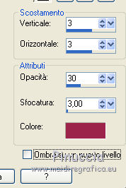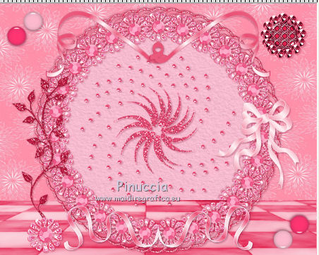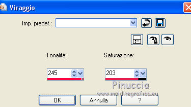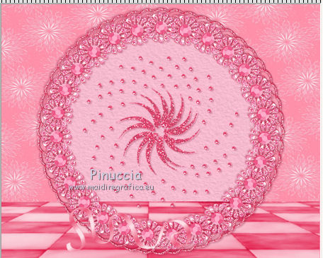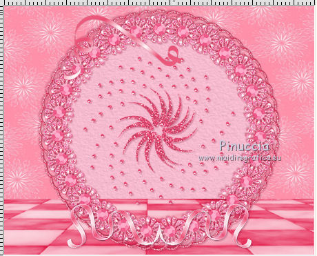 qui puoi trovare qualche risposta ai tuoi dubbi. Se l'argomento che ti interessa non è presente, ti prego di segnalarmelo. Questo tutorial è una creazione di ©Titoune e non può essere copiato su altri siti nè essere offerto per il download. Lo stesso vale per la mia traduzione. Il tutorial è stato creato con PSP X5, ma può essere eseguito anche con le altre versioni di PSP. Secondo la versione utilizzata (anteriore a PSP X) potresti ottenere dei risultati differenti. Dalla versione X4, il comando Immagine>Rifletti è stato sostituito con Immagine>Capovolgi in orizzontale, e il comando Immagine>Capovolgi con Immagine>Capovolgi in verticale. Nelle versioni X5 e X6, le funzioni sono state migliorate rendendo disponibile il menu Oggetti. Vedi la scheda sull'argomento qui Per tradure il tutorial ho usato PSP X. Occorrente: Un tube a scelta. Il resto del materiale qui Tube utilizzato Th.J-28-04-2013 di Resy. Filtri in caso di dubbi, ricorda di consultare la mia sezione filtri qui Penta.com - Color dot qui ![]() 1, Apri una nuova immagine trasparente 750 x 600 pixels. Selezione>Seleziona tutto. 2. Apri l'elemento bc-tile6, e vai a Modifica>Copia. Torna al tuo lavoro e vai a Modifica>Incolla nella selezione. Selezione>Deseleziona. 3. Apri l'elemento cro9-frame6, e vai a Modifica>Copia. Torna al tuo lavoro e vai a Modifica>Incolla come nuovo livello. Lascialo come sta. 4. Regola>Tonalità e saturazione>Viraggio. ![]() 5. Effetti>Effetti 3D>Sfalsa ombra, colore #9c244b. ![]() Ripeti l'Effetto Sfalsa ombra, cambiando verticale e orizzontale con -3. 6. Apri l'elemento cro9-frame4, e vai a Modifica>Copia. Torna al tuo lavoro e vai a Modifica>Incolla come nuovo livello. 7. Attiva lo strumento Bacchetta magica ![]() e clicca al centro della cornice per selezionarla. Selezione>Modifica>Espandi - 5 pixels. Selezione>Inverti. 8. Attiva il livello Raster 1. Livelli>Nuovo livello raster. Apri l'elemento bc-tile4 e vai a Modifica>Copia. Torna al tuo lavoro e vai a Modifica>Incolla nella selezione. Selezione>Deseleziona. 9. Attiva nuovamente il livello superiore della seconda cornice. Effetti>Effetti 3D>Sfalsa ombra, colore #9c244b. ![]() Ripeti l'Effetto Sfalsa ombra, cambiando verticale e orizzontale con -3. 10. Apri l'elemento Floor e vai a Modifica>Copia. Torna al tuo lavoro e vai a Modifica>Incolla come nuovo livello. Spostalo in basso.Porta questo livello sotto i livelli delle cornici. ![]() 11. Apri l'elemento Dd00252_, e vai a Modifica>Copia. Torna al tuo lavoro e vai a Modifica>Incolla come nuovo livello. Lascialo come sta. 12. Effetti>Effetti 3D>Sfalsa ombra, colore #9c244b. ![]() 13. Attiva il livello superiore. Apri l'elemento cr09-vribbon, e vai a Modifica>Copia. Torna al tuo lavoro e vai a Modifica>Incolla come nuovo livello. Spostalo in basso come nell'esempio.![]() 14. Effetti>Effetti di riflesso>Specchio rotante. ![]() Effetti>Effetti 3D>Sfalsa ombra, con i settaggi precedenti. Effetti>Effetti di bordo>Aumenta. 15. Apri l'elemento cr09ribbon3, e vai a Modifica>Copia. Torna al tuo lavoro e vai a Modifica>Incolla come nuovo livello. Spostalo in alto.![]() Effetti>Effetti 3D>Sfalsa ombra, con i settaggi precedenti. Livelli>Duplica. Immagine>Rifletti. 16. Apri l'elemento cr09-beads2, e vai a Modifica>Copia. Torna al tuo lavoro e vai a Modifica>Incolla come nuovo livello. Spostalo in alto a sinistra.Vedi l'esempio finale. Effetti>Effetti 3D>Sfalsa ombra, con i settaggi precedenti. Livelli>Duplica. Immagine>Rifletti. Immagine>Capovolgi. 17. Apri l'elemento cr09-gem2, e vai a Modifica>Copia. Torna al tuo lavoro e vai a Modifica>Incolla come nuovo livello. Regola>Tonalità e saturazione>Viraggio, con i settaggi precedenti. Spostalo in alto a destra.Vedi l'esempio finale. Effetti>Effetti 3D>Sfalsa ombra, con i settaggi precedenti. 18. Apri l'elemento cr09-ribbon, e vai a Modifica>Copia. Torna al tuo lavoro e vai a Modifica>Incolla come nuovo livello. Spostalo a destra.![]() Effetti>Effetti 3D>Sfalsa ombra, con i settaggi precedenti. 19. Apri l'elemento cr-leaves, e vai a Modifica>Copia. Torna al tuo lavoro e vai a Modifica>Incolla come nuovo livello. Spostalo a sinistra.Vedi l'esempio finale. Regola>Tonalità e saturazione>Viraggio, con i settaggi precedenti. Effetti>Effetti 3D>Sfalsa ombra, con i settaggi precedenti. 20. Apri l'elemento Image4, e vai a Modifica>Copia. Torna al tuo lavoro e vai a Modifica>Incolla come nuovo livello. Spostalo sotto le foglie.![]() Effetti>Effetti 3D>Sfalsa ombra, con i settaggi precedenti. 21. Apri il tuo tube , e vai a Modifica>Copia. Torna al tuo lavoro e vai a Modifica>Incolla come nuovo livello. Immagine>Ridimensiona, se e quanto necessario, tutti i livelli non selezionato. Spostalo dove preferisci,o vedi il mio esempio. Effetti>Effetti 3D>Sfalsa ombra, con i settaggi precedenti. 22. Attiva il livello inferiore. Selezione>Seleziona tutto. Selezione>Modifica>Contrai - 3 pixels. Selezione>Inverti. Selezione>Innalza selezione a livello. Livelli>Disponi>Porta in alto. 23. Effetti>Effetti 3D>Smusso a incasso. ![]() Selezione>Deseleziona. Effetti>Plugins>Penta.com - Color Dot, con i settaggi standard. ![]() Effetti>Effetti 3D>Sfalsa ombra, con i settaggi precedenti. Firma il tuo lavoro. Livelli>Unisci>Unisci tutto e salva in formato jpg. ![]() Se hai problemi o dubbi, o trovi un link non funzionante, scrivimi. 5 Luglio 2014 |