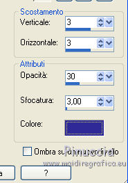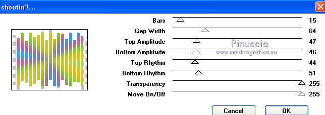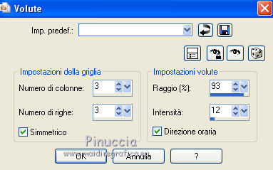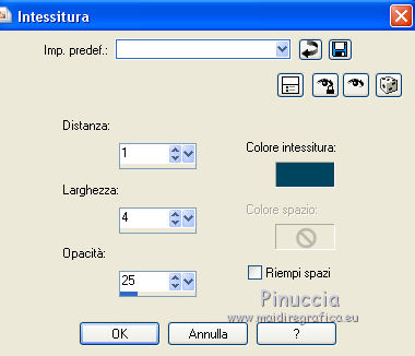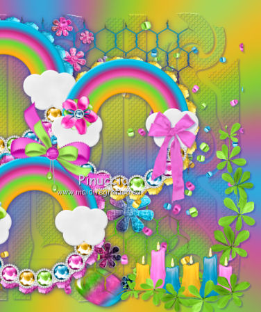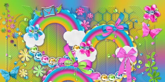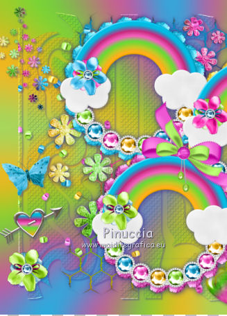 qui puoi trovare qualche risposta ai tuoi dubbi. Se l'argomento che ti interessa non è presente, ti prego di segnalarmelo. Questo tutorial è una creazione di ©Titoune e non può essere copiato su altri siti nè essere offerto per il download. Lo stesso vale per la mia traduzione. Il tutorial è stato creato con PSP X5, ma può essere eseguito anche con le altre versioni di PSP. Secondo la versione utilizzata (anteriore a PSP X) potresti ottenere dei risultati differenti. Dalla versione X4, il comando Immagine>Rifletti è stato sostituito con Immagine>Capovolgi in orizzontale, e il comando Immagine>Capovolgi con Immagine>Capovolgi in verticale. Nelle versioni X5 e X6, le funzioni sono state migliorate rendendo disponibile il menu Oggetti. Vedi la scheda sull'argomento qui Per tradure il tutorial ho usato PSP X. Occorrente: Un tube a scelta. Il resto del materiale qui Il tube utilizzato è di Macha. Filtri in caso di dubbi, ricorda di consultare la mia sezione filtri qui Filters Unlimited 2.0 qui VM Extravaganza - Shoutin' qui Simple - Top Left Mirror qui I filtri VM Extravaganza e Simple si possono usare da soli o importati in Filters Unlimited (come fare vedi qui) Se un filtro fornito appare con questa icona ![]() Metti il gradiente nella cartella gradienti. 1. Passa il colore di primo piano a Gradiente e seleziona il gradiente "arc-en-ciel2", stile Radiale. ![]() 2. Apri una nuova immagine trasparente 750 x 600 pixels, e riempila con il gradiente.3. Regola>Sfocatura>Sfocatura gaussiana - raggio 25. ![]() 4. Livelli>Duplica. Immagine>Ridimensiona, al 90%, tutti i livelli non selezionato. Effetti>Effetti di bordo>Aumenta. 5. Effetti>Plugins>VM Extravaganza - Shoutin, con i settaggi standard. ![]() 6. Attiva lo strumento Bacchetta magica ![]() e clicca nella parte bianca per selezionarla. ![]() Premi sulla tastiera il tasto CANC ![]() Selezione>Deseleziona. 7. Effetti>Effetti di distorsione>Volute. ![]() 8. Effetti>Effetti di trama>Intessitura. colore intessitura #004660. ![]() 9. Effetti>Effetti 3D>Sfalsa ombra, colore #2f2997. ![]() 10. Apri l'elemento DBV Rainbow Fling Element (45), e vai a Modifica>Copia. Torna al tuo lavoro e vai a Modifica>Incolla come nuovo livello. Effetti>Effetti 3D>Sfalsa ombra, con i settaggi precedenti. 11. Apri l'elemento 102Kim, e vai a Modifica>Copia. Torna al tuo lavoro e vai a Modifica>Incolla come nuovo livello. Cancella la firma.Niente Sfalsa ombra. 12. Apri l'elemento DBV Rainbow Fling Element (5), e vai a Modifica>Copia. Torna al tuo lavoro e vai a Modifica>Incolla come nuovo livello. Spostalo in alto a sinistra.Vedi l'esempio finale. Effetti>Effetti 3D>Sfalsa ombra, con i settaggi precedenti. 13. Apri l'elemento DBV Rainbow Fling Element (6), e vai a Modifica>Copia. Torna al tuo lavoro e vai a Modifica>Incolla come nuovo livello. Spostalo a sinistra.Vedi l'esempio finale. Effetti>Effetti 3D>Sfalsa ombra, con i settaggi precedenti. 14. Apri l'elemento DBV Rainbow Fling Element (52), e vai a Modifica>Copia. Torna al tuo lavoro e vai a Modifica>Incolla come nuovo livello. Spostalo a sinistra.Vedi l'esempio finale. Effetti>Effetti 3D>Sfalsa ombra, con i settaggi precedenti. 15. Apri l'elemento DBV Rainbow Fling Element (54), e vai a Modifica>Copia. Torna al tuo lavoro e vai a Modifica>Incolla come nuovo livello. Spostalo in basso a sinistra.![]() Effetti>Effetti 3D>Sfalsa ombra, con i settaggi precedenti. 16. Apri l'elemento DBV Rainbow Fling Element (27), e vai a Modifica>Copia. Torna al tuo lavoro e vai a Modifica>Incolla come nuovo livello. Spostalo in basso.Vedi l'esempio finale. Effetti>Effetti 3D>Sfalsa ombra, con i settaggi precedenti. Porta questo livello sotto il livello della cornice. 17. Attiva nuovamente il livello superiore. Apri l'elemento DBV Rainbow Fling Element (22), e vai a Modifica>Copia. Torna al tuo lavoro e vai a Modifica>Incolla come nuovo livello. Spostalo in basso a destra.Vedi l'esempio finale. Effetti>Effetti 3D>Sfalsa ombra, con i settaggi precedenti. 18. Apri l'elemento DBV Rainbow Fling Element (21), e vai a Modifica>Copia. Torna al tuo lavoro e vai a Modifica>Incolla come nuovo livello. Spostalo in basso a destra.Vedi l'esempio finale. Effetti>Effetti 3D>Sfalsa ombra, con i settaggi precedenti. 19. Apri l'elemento DBV Rainbow Fling Element (34), e vai a Modifica>Copia. Torna al tuo lavoro e vai a Modifica>Incolla come nuovo livello. Spostalo a destra.![]() Effetti>Effetti 3D>Sfalsa ombra, con i settaggi precedenti. 20. Apri l'elemento DBV Rainbow Fling Element (7), e vai a Modifica>Copia. Torna al tuo lavoro e vai a Modifica>Incolla come nuovo livello. Spostalo in alto a destra.Vedi l'esempio finale. Effetti>Effetti 3D>Sfalsa ombra, con i settaggi precedenti. 21. Apri l'elemento DBV Rainbow Fling Element (55), e vai a Modifica>Copia. Torna al tuo lavoro e vai a Modifica>Incolla come nuovo livello. Spostalo in alto a destra.Vedi l'esempio finale. Effetti>Effetti 3D>Sfalsa ombra, con i settaggi precedenti. 22. Apri l'elemento DBV Rainbow Fling Element (15), e vai a Modifica>Copia. Torna al tuo lavoro e vai a Modifica>Incolla come nuovo livello. Spostalo nella parte superiore destra della cornice.Vedi l'esempio finale. Effetti>Effetti 3D>Sfalsa ombra, con i settaggi precedenti. 23. Apri l'elemento DBV Rainbow Fling Element (26), e vai a Modifica>Copia. Torna al tuo lavoro e vai a Modifica>Incolla come nuovo livello. Spostalo nella parte superiore sinistra della cornice.![]() Effetti>Effetti 3D>Sfalsa ombra, con i settaggi precedenti. 24. Apri il tuo tube, e vai a Modifica>Copia. Torna al tuo lavoro e vai a Modifica>Incolla come nuovo livello. Immagine>Ridimensiona, se e quanto necessario, tutti i livelli non selezionato. Spostalo dove preferisci,o vedi il mio esempio. Effetti>Effetti 3D>Sfalsa ombra, con i settaggi precedenti. 25. Assicurati di essere posizionato sul livello superiore. Livelli>Nuovo livello raster. Selezione>Seleziona tutto. Apri l'elemento DBV Rainbow Fling Paper (16), e vai a Modifica>Copia. Torna al tuo 