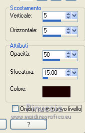 qui puoi trovare qualche risposta ai tuoi dubbi. Se l'argomento che ti interessa non è presente, ti prego di segnalarmelo. Questo tutorial è una creazione di ©Titoune e non può essere copiato su altri siti nè essere offerto per il download. Lo stesso vale per la mia traduzione. Il tutorial è stato creato con PSP X5, ma può essere eseguito anche con le altre versioni di PSP. Secondo la versione utilizzata (anteriore a PSP X) potresti ottenere dei risultati differenti. Dalla versione X4, il comando Immagine>Rifletti è stato sostituito con Immagine>Capovolgi in orizzontale, e il comando Immagine>Capovolgi con Immagine>Capovolgi in verticale. Nelle versioni X5 e X6, le funzioni sono state migliorate rendendo disponibile il menu Oggetti. Con il nuovo X7 sono tornati i comandi Rifletti/Capovolgi, ma con nuove differenze. Vedi la scheda sull'argomento qui Per tradure il tutorial ho usato PSP X. Occorrente: Un tube a scelta. Il resto del materiale qui Il tube utilizzato è di K@rine Filtri in caso di dubbi, ricorda di consultare la mia sezione filtri qui Filters Unlimited 2.0 qui Penta.com - Jeans qui I filtri Penta.com si possono usare da soli o importati in Filters Unlimited (come fare vedi qui) Se un filtro fornito appare con questa icona ![]() 1. Apri una nuova immagine trasparente 750 x 600 pixels. Selezione>Seleziona tutto. 2. Apri l'elemento CCC Vintage Vixen PU (48), e vai a Modifica>Copia. Torna al tuo lavoro e vai a Modifica>Incolla nella selezione. Selezione>Deseleziona. 3. Apri l'elemento CCC Vintage Vixen PU (8), e vai a Modifica>Copia. Torna al tuo lavoro e vai a Modifica>Incolla come nuovo livello. Non spostarlo. 4. Effetti>Effetti 3D>Sfalsa ombra, colore #200000. ![]() Ripeti l'Effetto Sfalsa ombra, cambiando verticale e orizzontale con -5. 5. Apri l'elemento CCC Vintage Vixen PU (51), e vai a Modifica>Copia. Torna al tuo lavoro e vai a Modifica>Incolla come nuovo livello. Spostalo un po' più in basso e a destra.![]() Effetti>Effetti 3D>Sfalsa ombra, con i settaggi precedenti. 6. Apri l'elemento CCC Vintage Vixen PU (2), e vai a Modifica>Copia. Torna al tuo lavoro e vai a Modifica>Incolla come nuovo livello. Spostalo nella parte superiore sinistra della cornice.Vedi il risultato finale. Porta questo livello sotto il livello della cornice. ![]() Effetti>Effetti 3D>Sfalsa ombra, con i settaggi precedenti. Attiva nuovamente il livello superiore. 7. Apri l'elemento CCC Vintage Vixen PU (11), e vai a Modifica>Copia. Torna al tuo lavoro e vai a Modifica>Incolla come nuovo livello. Spostalo nella parte superiore sinistra della cornice.Vedi il risultato finale. Effetti>Effetti 3D>Sfalsa ombra, con i settaggi precedenti. 8. Apri l'elemento CCC Vintage Vixen PU (35), e vai a Modifica>Copia. Torna al tuo lavoro e vai a Modifica>Incolla come nuovo livello. Spostalo nella parte superiore destra della cornice.Vedi il risultato finale. Effetti>Effetti 3D>Sfalsa ombra, con i settaggi precedenti. 9. Apri l'elemento CCC Vintage Vixen PU (23), e vai a Modifica>Copia. Torna al tuo lavoro e vai a Modifica>Incolla come nuovo livello. Spostalo a destra.![]() Effetti>Effetti 3D>Sfalsa ombra, con i settaggi precedenti. 10. Apri l'elemento CCC Vintage Vixen PU (40), e vai a Modifica>Copia. Torna al tuo lavoro e vai a Modifica>Incolla come nuovo livello. Spostalo nella parte inferiore destra della cornice.Vedi il risultato finale. Effetti>Effetti 3D>Sfalsa ombra, con i settaggi precedenti. 11. Apri l'elemento CCC Vintage Vixen PU (31), e vai a Modifica>Copia. Torna al tuo lavoro e vai a Modifica>Incolla come nuovo livello. Spostalo nella parte inferiore destra della cornice.Vedi il risultato finale. Effetti>Effetti 3D>Sfalsa ombra, con i settaggi precedenti. 12. Apri l'elemento CCC Vintage Vixen PU (14), e vai a Modifica>Copia. Torna al tuo lavoro e vai a Modifica>Incolla come nuovo livello. Spostalo in basso a destra.![]() Effetti>Effetti 3D>Sfalsa ombra, con i settaggi precedenti. 13. Apri l'elemento CCC Vintage Vixen PU (24), e vai a Modifica>Copia. Torna al tuo lavoro e vai a Modifica>Incolla come nuovo livello. Spostalo nella parte inferiore della cornice.Vedi il risultato finale. Effetti>Effetti 3D>Sfalsa ombra, con i settaggi precedenti. 14. Apri l'elemento CCC Vintage Vixen PU (10), e vai a Modifica>Copia. Torna al tuo lavoro e vai a Modifica>Incolla come nuovo livello. Spostalo nella parte inferiore della cornice.Vedi il risultato finale. Effetti>Effetti 3D>Sfalsa ombra, con i settaggi precedenti. 15. Apri l'elemento CCC Vintage Vixen PU (39), e vai a Modifica>Copia. Torna al tuo lavoro e vai a Modifica>Incolla come nuovo livello. Spostalo in basso a sinistra.![]() Effetti>Effetti 3D>Sfalsa ombra, con i settaggi precedenti. 16. Apri l'elemento CCC Vintage Vixen PU (49), e vai a Modifica>Copia. Torna al tuo lavoro e vai a Modifica>Incolla come nuovo livello. Spostalo in basso a sinistra.Vedi l'esempio finale. Effetti>Effetti 3D>Sfalsa ombra, con i settaggi precedenti. 17. Apri l'elemento CCC Vintage Vixen PU (38), e vai a Modifica>Copia. Torna al tuo lavoro e vai a Modifica>Incolla come nuovo livello. Spostalo in basso a sinistra.Vedi l'esempio finale. Effetti>Effetti 3D>Sfalsa ombra, con i settaggi precedenti. 18. Apri l'elemento CCC Vintage Vixen PU (55), e vai a Modifica>Copia. Torna al tuo lavoro e vai a Modifica>Incolla come nuovo livello. Sposta anche questo elemento in basso a sinistra.![]() Effetti>Effetti 3D>Sfalsa ombra, con i settaggi precedenti. 19. Apri l'elemento CCC Vintage Vixen PU (13), e vai a Modifica>Copia. Torna al tuo lavoro e vai a Modifica>Incolla come nuovo livello. Spostalo in basso a sinistra.Vedi l'esempio finale. Effetti>Effetti 3D>Sfalsa ombra, con i settaggi precedenti. 20. Apri l'elemento CCC Vintage Vixen PU (6) , e vai a Modifica>Copia. Torna al tuo lavoro e vai a Modifica>Incolla come nuovo livello. Spostalo nella parte sinistra della cornice.Vedi il risultato finale. Effetti>Effetti 3D>Sfalsa ombra, con i settaggi precedenti. 21. Apri l'elemento CCC Vint