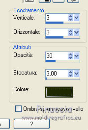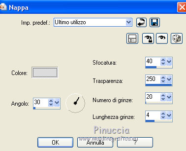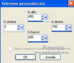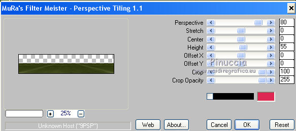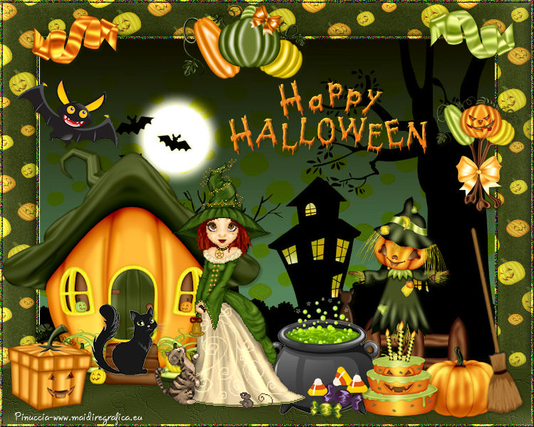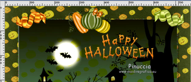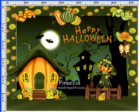 qui puoi trovare qualche risposta ai tuoi dubbi. Se l'argomento che ti interessa non è presente, ti prego di segnalarmelo. Questo tutorial è una creazione di ©Titoune e non può essere copiato su altri siti nè essere offerto per il download. Lo stesso vale per la mia traduzione. Il tutorial è stato creato con Corel17, ma può essere eseguito anche con le altre versioni di PSP. Secondo la versione utilizzata (anteriore a PSP X) potresti ottenere dei risultati differenti. Dalla versione X4, il comando Immagine>Rifletti è stato sostituito con Immagine>Capovolgi in orizzontale, e il comando Immagine>Capovolgi con Immagine>Capovolgi in verticale. Nelle versioni X5 e X6, le funzioni sono state migliorate rendendo disponibile il menu Oggetti. Con il nuovo X7 sono tornati i comandi Rifletti/Capovolgi, ma con nuove differenze. Vedi la scheda sull'argomento qui Per tradurre il tutorial ho usato PSP X. Occorrente: Un tube a scelta. Il resto del materiale qui Filtri in caso di dubbi, ricorda di consultare la mia sezione filtri qui Mura's Meister - Perspective Tiling qui ![]() 1. Apri una nuova immagine trasparente 750 x 600 pixels. Selezione>Seleziona tutto. 2. Apri l'immagine PPS_PP_P7, e vai a Modifica>Copia. Torna al tuo lavoro e vai a Modifica>Incolla nella selezione. Selezione>Deseleziona. 3. Attiva lo strumento Selezione ![]() (non importa il tipo di selezione impostato, perchè con la selezione personalizzata si ottiene sempre un rettangolo) clicca sull'icona Selezione personalizzata ![]() e imposta i seguenti settaggi. ![]() 4. Livelli>Nuovo livello raster. Apri l'elemento PPS_PP_P5 e vai a Modifica>Copia. Torna al tuo lavoro e vai a Modifica>Incolla nella selezione. 5. Effetti>Plugins>Mura's Meister - Perspective Tiling. ![]() Selezione>Deseleziona. 6. Livelli>Duplica. Effetti>Effetti di trama>Nappa. ![]() 7. Attiva il livello inferiore. Selezione>Seleziona tutto. Selezione>Modifica>Contrai - 55 pixels. 8. Livelli>Nuovo livello raster. Apri l'immagine Haunted-House-halloween-250822_1024_768, e vai a Modifica>Copia. Torna al tuo lavoro e vai a Modifica>Incolla nella selezione. Cambia la modalità di miscelatura di questo livello in Luminanza (esistente). Livelli>Duplica. Cambia la modalità di miscelatura di questo livello in Scurisci (o secondo l'immagine utilizzata). 9. Selezione>Modifica>Seleziona bordature selezione. ![]() 10. Attiva il livello Raster 1. Selezione>Innalza selezione a livello. 11. Effetti>Effetti 3D>Smusso a incasso. ![]() 12. Regola>Aggiungi/Rimuovi disturbo>Aggiungi disturbo. ![]() Selezione>Deseleziona. 13. Effetti>Effetti 3D>Sfalsa ombra, colore #202a00. ![]() Ripeti l'Effetto Sfalsa ombra, cambiando verticale e orizzontale con -3. 14. Attiva il livello superiore. Apri l'elemento halloweenwordart13yez, e vai a Modifica>Copia. Torna al tuo lavoro e vai a Modifica>Incolla come nuovo livello. Spostalo nella parte destra del paesaggio.Vedi l'esempio finale. Effetti>Effetti 3D>Sfalsa ombra, colore #202a00. ![]() 15. Apri l'elemento PPS_Ribbon 1, e vai a Modifica>Copia. Torna al tuo lavoro e vai a Modifica>Incolla come nuovo livello. Spostalo in alto a sinistra.Vedi l'esempio finale. Effetti>Effetti 3D>Sfalsa ombra, con i settaggi precedenti. 16. Apri l'elemento PPS_Pumpkins, e vai a Modifica>Copia. Torna al tuo lavoro e vai a Modifica>Incolla come nuovo livello. Spostalo in alto.Vedi l'esempio finale. Effetti>Effetti 3D>Sfalsa ombra, con i settaggi precedenti. 17. Apri l'elemento PPS_Ribbon 2, e vai a Modifica>Copia. Torna al tuo lavoro e vai a Modifica>Incolla come nuovo livello. Immagine>Capovolgi. Spostalo in alto a destra.![]() Effetti>Effetti 3D>Sfalsa ombra, con i settaggi precedenti. 18. Apri l'elemento PPS_Pumpy Pops, e vai a Modifica>Copia. Torna al tuo lavoro e vai a Modifica>Incolla come nuovo livello. Spostalo a destra.Vedi l'esempio finale. Effetti>Effetti 3D>Sfalsa ombra, con i settaggi precedenti. 19. Apri l'elemento PPS_Pumpkin House, e vai a Modifica>Copia. Torna al tuo lavoro e vai a Modifica>Incolla come nuovo livello. Spostalo in basso a sinistra.Vedi l'esempio finale. Effetti>Effetti 3D>Sfalsa ombra, con i settaggi precedenti. 20. Apri l'elemento PPS_Pumpkin Crow, e vai a Modifica>Copia. Torna al tuo lavoro e vai a Modifica>Incolla come nuovo livello. Spostalo in basso a destra.![]() Effetti>Effetti 3D>Sfalsa ombra, con i settaggi precedenti. 21. Apri l'elemento chaudron, e vai a Modifica>Copia. Torna al tuo lavoro e vai a Modifica>Incolla come nuovo livello. Spostalo in basso.Vedi l'esempio finale. Effetti>Effetti 3D>Sfalsa ombra, con i settaggi precedenti. 22. Apri l'elemento PPS_Pumpkin, e vai a Modifica>Copia. Torna al tuo lavoro e vai a Modifica>Incolla come nuovo livello. Spostalo in basso.Vedi l'esempio finale. Effetti>Effetti 3D>Sfalsa ombra, con i settaggi precedenti. 23. Apri l'elemento PPS_Pumpkin Cake, e vai a Modifica>Copia. Torna al tuo lavoro e vai a Modifica>Incolla come nuovo livello. Spostalo in basso.Vedi l'esempio finale. Effetti>Effetti 3D>Sfalsa ombra, con i settaggi precedenti. 24. Apri l'elemento candys, e vai a Modifica>Copia. Torna al tuo lavoro e vai a Modifica>Incolla come nuovo livello. Spostalo in basso.Vedi l'esempio finale. Effetti>Effetti 3D>Sfalsa ombra, con i settaggi precedenti. 25. Apri l'elemento Halloween_Witch_Broom_PNG_Clipart, e vai a Modifica>Copia. Torna al tuo lavoro e vai a Modifica>Incolla come nuovo livello. Spostalo in basso a destra.![]() Effetti>Effetti 3D>Sfalsa ombra, con i settaggi precedenti. 26. Apri l'elemento black_cat, e vai a Modifica>Copia. Torna al tuo lavoro e vai a Modifica>Incolla come nuovo livello. Spostalo come nell'esempio.Vedi l'esempio finale. Effetti>Effetti 3D>Sfalsa ombra, con i settaggi precedenti. 27. Apri l'elemento PPS_Square Pumpkin, e vai a Modifica>Copia. Torna al tuo lavoro e vai a Modifica>Incolla come nuovo livello. Spostalo in basso a sinistra.Vedi l'esempio finale. Effetti>Effetti 3D>Sfalsa ombra, con i settaggi precedenti. 28. Apri l'elemento Large_PNG_Bat_Clip