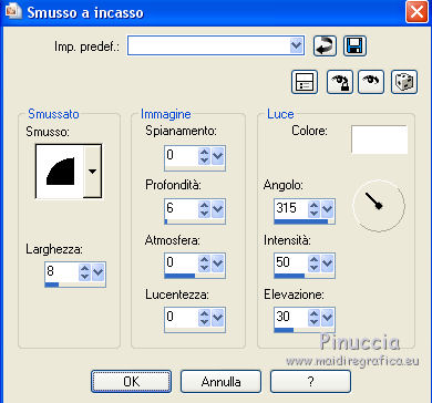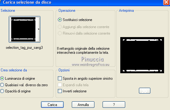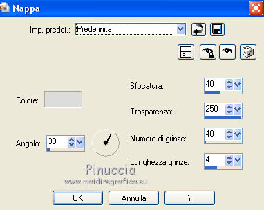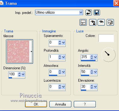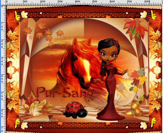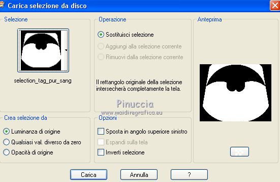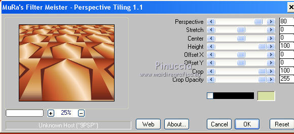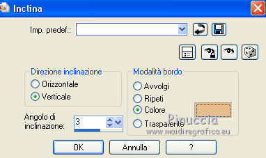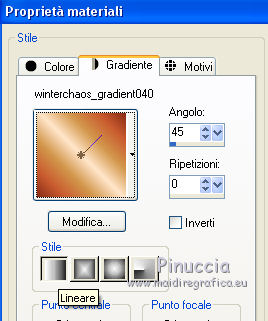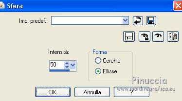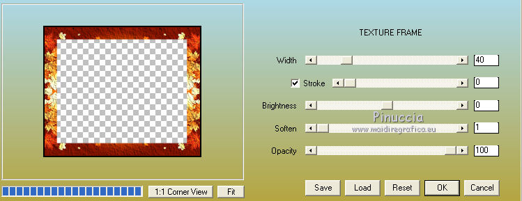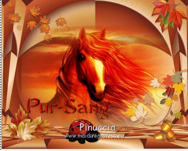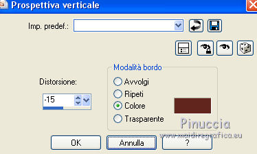 qui puoi trovare qualche risposta ai tuoi dubbi. Se l'argomento che ti interessa non è presente, ti prego di segnalarmelo. Questo tutorial è una creazione di ©Titoune e non può essere copiato su altri siti nè essere offerto per il download. Lo stesso vale per la mia traduzione. Il tutorial è stato creato con Corel17, ma può essere eseguito anche con le altre versioni di PSP. Secondo la versione utilizzata (anteriore a PSP X) potresti ottenere dei risultati differenti. Dalla versione X4, il comando Immagine>Rifletti è stato sostituito con Immagine>Capovolgi in orizzontale, e il comando Immagine>Capovolgi con Immagine>Capovolgi in verticale. Nelle versioni X5 e X6, le funzioni sono state migliorate rendendo disponibile il menu Oggetti. Con il nuovo X7 sono tornati i comandi Rifletti/Capovolgi, ma con nuove differenze. Vedi la scheda sull'argomento qui Per tradurre il tutorial ho usato PSP X. Occorrente: Un tube a scelta. Il resto del materiale qui Tube utilizzato "SSLisa-Cookie-Chocolata(2) di SSLisa. Filtri in caso di dubbi, ricorda di consultare la mia sezione filtri qui AAA Frames - Texture Frame qui Mura's Meister - Perspective Tiling qui Adjust - Variations qui Simple - Top Left Mirror qui ![]() Metti il gradiente nella cartella Gradienti. Metti la trama nella cartella Trame. Metti le selezioni nella cartella Selezioni. 1. Passa il colore di primo piano a Gradiente, e seleziona il gradiente winterchaos_gradient40, stile Sprazzo di luce. ![]() 2. Apri una nuova immagine trasparente 750 x 600 pixels, e riempila con il gradiente.3. Effetti>Effetti geometrici>Prospettiva verticale, colore #62261e. ![]() 4. Ripeti Effetti>Effetti geometrici>Prospettiva verticale, avvolgi selezionato. ![]() 5. Effetti>Effetti geometrici>Pentagono. ![]() 6. Livelli>Duplica. Effetti>Plugins>Mura's Meister - Perspective Tiling. ![]() 7. Premi il tasto K per attivare lo strumento Puntatore ![]() se stai usando PSP 9 il tasto D per attivare lo strumento Deformazione ![]() in modalità Scala , spingi il nodo superiore centrale verso il basso fino a 500 pixels,![]() 8. Effetti>Effetti geometrici>Sfera. ![]() 9. Attiva il livello originale Raster 1. Effetti>Effetti di distorsione>Coordinate polari. ![]() 10. Effetti>Effetti geometrici>Prospettiva verticale, 2 volte con i settaggi precedenti. 11. Selezione>Carica/Salva selezione>Carica selezione da disco. Cerca e carica la selezione "selection_tag_pur_sang". ![]() Selezione>Innalza selezione a livello. 12. Effetti>Effetti di trama>Trama - seleziona la trama Tilerose, con i seguenti settaggi. ![]() Selezione>Deseleziona. 13. Apri l'immagine pur-sang. Su questa immagine: Livelli>Carica/Salva maschera>Carica maschera da disco. Cerca e carica la maschera "LIBM016a". ![]() Livelli>Unisci>Unisci gruppo. Modifica>Copia. Torna al tuo lavoro e vai a Modifica>Incolla come nuovo livello. Immagine>Rifletti. 14. Immagine>Ridimensiona, al 60%, tutti i livelli non selezionato. 15. Effetti>Effetti di immagine>Scostamento. ![]() Regola>Messa a fuoco>Metti a fuoco. 16. Attiva lo strumento Gomma ![]() e cancella il bordo nero del tube rimasto visibile. ![]() Livelli>Duplica. Cambia la modalità di miscelatura di questo livello in Luce diffusa. Di nuovo Livelli>Duplica. 17. Apri l'elemento LF-DecorationFall-10092014, e vai a Modifica>Copia. Torna al tuo lavoro e vai a Modifica>Incolla come nuovo livello. Cancella la firma. Immagine>Rifletti. Spostalo in basso a destra.Vedi l'esempio finale. 18. Effetti>Effetti 3D>Sfalsa ombra, colore #601e18. 19. Apri l'elemento brown_leaves, e vai a Modifica>Copia. Torna al tuo lavoro e vai a Modifica>Incolla come nuovo livello. Spostalo in basso a sinistra.Vedi l'esempio finale. Effetti>Effetti 3D>Sfalsa ombra, con i settaggi precedenti. 20. Apri l'elemento pernette, e vai a Modifica>Copia. Torna al tuo lavoro e vai a Modifica>Incolla come nuovo livello. Spostalo dove preferisci o vedi il mio esempio.![]() Effetti>Effetti 3D>Sfalsa ombra, con i settaggi precedenti. 21. Apri l'elemento brown_green_leaves, e vai a Modifica>Copia. Torna al tuo lavoro e vai a Modifica>Incolla come nuovo livello. Spostalo in alto a destra.Vedi l'esempio finale. Effetti>Effetti 3D>Sfalsa ombra, con i settaggi precedenti. 22. Apri l'elemento swirl_leaves, e vai a Modifica>Copia. Torna al tuo lavoro e vai a Modifica>Incolla come nuovo livello. Spostalo in alto a sinistra.Vedi l'esempio finale. Niente Sfalsa ombra. 23. Apri l'elemento wordart_pur_sang, e vai a Modifica>Copia. Torna al tuo lavoro e vai a Modifica>Incolla come nuovo livello. Spostalo dove preferisci o vedi il mio esempio.Niente Sfalsa ombra. Apri l'elemento acorns, e vai a Modifica>Copia. Torna al tuo lavoro e vai a Modifica>Incolla come nuovo livello. Spostalo in basso a destra.![]() Effetti>Effetti 3D>Sfalsa ombra, con i settaggi precedenti. 24. Apri il tuo tube, e vai a Modifica>Copia. Torna al tuo lavoro e vai a Modifica>Incolla come nuovo livello. Immagine>Ridimensiona, se e quanto necessario, tutti i livelli non selezionato. Spostalo dove preferisci o vedi il mio esempio.Effetti>Effetti 3D>Sfalsa ombra, con i settaggi precedenti. Decora, se vuoi, il tuo lavoro a tuo piacimento. Firma il tuo lavoro. Livelli>Unisci>Unisci visibile. Modifica>Copia. 25. Apri una nuova immagine trasparente 900 x 750 pixels. Modifica>Incolla come nuovo livello. 26. Attiva lo strumento Bacchetta magica ![]() e clicca nella parte trasparente per selezionarla. Attiva il livello inferiore - Raster 1. 27. Apri l'elemento Fall_Style_Background, e vai a Modifica>Copia. Torna al tuo lavoro e vai a Modifica>Incolla nella selezione. Effetti>Plugins>Simple - Top Left Mirror. Selezione>Deseleziona. 28. Selezione>Carica/Salva selezione>Carica selezione da disco. Cerca e carica la selezione "selection_tag_pur_sang2". ![]() 29. Effetti>Plugins>AAA Frames - Texture Frame. ![]() Selezione>Deseleziona. 30. Selezione>Carica/Salva selezione>Carica selezione da disco. Cerca e carica la selezione "selection_tag_pur_sang". ![]() Selezione>Inn