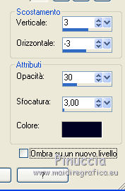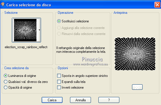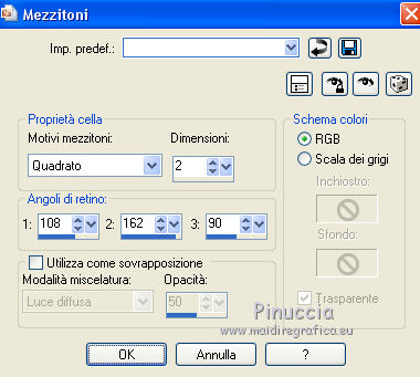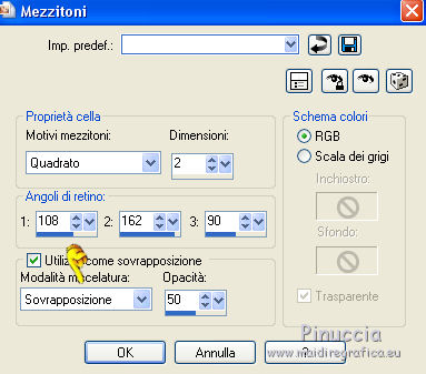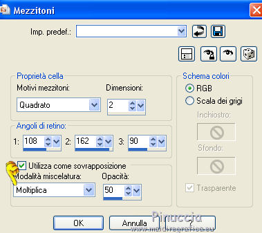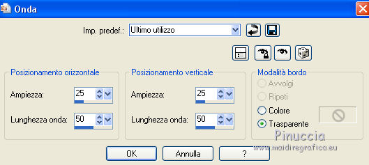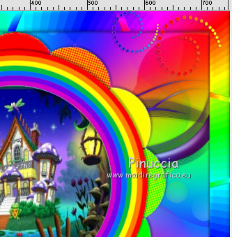 qui puoi trovare qualche risposta ai tuoi dubbi. Se l'argomento che ti interessa non è presente, ti prego di segnalarmelo. Questo tutorial è una creazione di ©Titoune e non può essere copiato su altri siti nè essere offerto per il download. Lo stesso vale per la mia traduzione. Il tutorial è stato creato con PSP X5, ma può essere eseguito anche con le altre versioni di PSP. Secondo la versione utilizzata (anteriore a PSP X) potresti ottenere dei risultati differenti. Vedi la mia scheda riguardante le funzioni Rifletti>Capovolgi in X4 e X5 qui Per tradure il tutorial ho usato PSP X. Occorrente: Un tube a scelta. Il resto del materiale qui Tube utilizzato "JoyofLife-2-BellesGraphics" di Belles Graphics Filtri in caso di dubbi, ricorda di consultare la mia sezione filtri qui Penta.com - Jeans qui Animation Shop qui ![]() Metti la selezione nella cartella Selezioni. 1. Apri una nuova immagine trasparente 750 x 600 pixels. Selezione>Deseleziona. 2. Apri l'elemento Rainbow Elements - 085 e vai a Modifica>Copia. Torna al tuo lavoro e vai a Modifica>Incolla nella selezione. 3. Selezione>Modifica>Contrai - 35 pixels. Regola>Sfocatura>Sfocatura gaussiana - raggio 45. ![]() Selezione>Inverti. Selezione>Innalza selezione a livello. 4. Effetti>Effetti 3D>Smusso a incasso. ![]() 5. Effetti>Effetti di distorsione>Onda. ![]() Di nuovo Selezione>Seleziona tutto. Selezione>Modifica>Contrai - 35 pixels. Premi sulla tastiera il tasto CANC. Selezione>Deseleziona. 6. Effetti>Effetti 3D>Sfalsa ombra, colore #010223. ![]() Ripeti l'Effetto Sfalsa ombra, cambiando verticale e orizzontale con -3/3. 7. Attiva il livello inferiore. Apri l'elemento Rainbow Elements - 094 e vai a Modifica>Copia. Torna al tuo lavoro e vai a Modifica>Incolla come nuovo livello. 8. Effetti>Effetti di immagine>Motivo unico, con i settaggi standard. ![]() Cambia la modalità di miscelatura di questo livello in Luce diffusa. 9. Apri l'elemento Rainbow Elements - 072 e vai a Modifica>Copia. Torna al tuo lavoro e vai a Modifica>Incolla come nuovo livello. 10. Effetti>Effetti di immagine>Scostamento. ![]() Effetti>Effetti 3D>Sfalsa ombra, con i settaggi precedenti. 11. Apri l'elemento Rainbow Elements - 070 e vai a Modifica>Copia. Torna al tuo lavoro e vai a Modifica>Incolla come nuovo livello. Non spostarlo. 12. Effetti>Effetti artistici>Mezzitoni. ![]() Effetti>Effetti 3D>Sfalsa ombra, con i settaggi precedenti. 13. Apri l'elemento Rainbow Elements - 071 e vai a Modifica>Copia. Torna al tuo lavoro e vai a Modifica>Incolla come nuovo livello. Non spostarlo. Effetti>Effetti 3D>Sfalsa ombra, con i settaggi precedenti. 14. Attiva lo strumento Bacchetta magica ![]() e clicca al centro dell'arcobaleno per selezionarlo. Selezione>Modifica>Espandi - 5 pixels. 15. Livelli>Nuovo livello raster. Livelli>Disponi>Sposta giù. Apri l'immagine 1442292_d6303a315c929233da e vai a Modifica>Copia. Torna al tuo lavoro e vai a Modifica>Incolla nella selezione. Selezione>Deseleziona. 16. Attiva il livello superiore. Apri l'elemento Rainbow Elements - 082 e vai a Modifica>Copia. Torna al tuo lavoro e vai a Modifica>Incolla come nuovo livello. Spostalo in alto a destra.![]() 17. Effetti>Effetti 3D>Sfalsa ombra, colore #010223. ![]() Livelli>Duplica. Immagine>Rifletti. 18. Apri l'elemento Rainbow Elements - 096 e vai a Modifica>Copia. Torna al tuo lavoro e vai a Modifica>Incolla come nuovo livello. Spostalo in basso a destra.Vedi l'esempio finale. Effetti>Effetti 3D>Sfalsa ombra, con i settaggi precedenti. 19. Apri l'elemento Rainbow Elements - 041 e vai a Modifica>Copia. Torna al tuo lavoro e vai a Modifica>Incolla come nuovo livello. Spostalo in basso a sinistra.![]() 20. Effetti>Effetti di riflesso>Specchio rotante. ![]() 21. Effetti>Effetti 3D>Sfalsa ombra, colore #010223. ![]() 22. Apri il tube JB_gouldianfinch e vai a Modifica>Copia. Torna al tuo lavoro e vai a Modifica>Incolla come nuovo livello. Spostalo a destra.Vedi l'esempio finale. Effetti>Effetti 3D>Sfalsa ombra, con i settaggi precedenti. 23. Apri l'elemento Rainbow Elements - 081 e vai a Modifica>Copia. Torna al tuo lavoro e vai a Modifica>Incolla come nuovo livello. Spostalo nell'angolo in basso a sinistra.Vedi l'esempio finale. Effetti>Effetti 3D>Sfalsa ombra, con i settaggi precedenti. 24. Apri il tuo tube e vai a Modifica>Copia. Torna al tuo lavoro e vai a Modifica>Incolla come nuovo livello. Immagine>Ridimensiona, se e quanto necessario, tutti i livelli non selezionato. Spostalo dove preferisci,o vedi il mio esempio. 25. Assicurati di essere posizionato sul livello superiore. Imposta il colore di primo piano con #ffff00. Livelli>Nuovo livello raster. Riempi con il colore di primo piano.26. Selezione>Seleziona tutto. Selezione>Modifica>Contrai - 2 pixels. Premi sulla tastiera il tasto CANC. Selezione>Inverti. Effetti>Plugins>Penta.com - Jeans, con i settaggi standard. ![]() Selezione>Deseleziona. 27. Effetti>Effetti 3D>Sfalsa ombra, colore #010223. ![]() Ripeti l'Effetto Sfalsa ombra, cambiando verticale e orizzontale con -3/3. 28. Attiva il livello inferiore. Modifica>Copia. Selezione>Seleziona tutto. Immagine>Ritaglia la selezione. 29. Immagine>Dimensioni tela - 800 x 650 pixels. ![]() 30. Livelli>Nuovo livello raster. Livelli>Disponi>Sposta giù. Selezione>Seleziona tutto. Modifica>Incolla nella selezione. 31. Livelli>Nuovo livello raster. Apri l'elemento Rainbow Elements - 051 e vai a Modifica>Copia. Torna al tuo lavoro e vai a Modifica>Incolla nella selezione. Rinomina questo livello "animazione". 32. Attiva il livello superiore. Livelli>Nuovo livello raster. Riempi con il colore di primo piano #ffff00.Selezione>Seleziona tutto. Selezione>Modifica>Contrai - 2 pixels. Premi sulla tastiera il tasto CANC. Selezione>Inverti. Effetti>Plugins>Penta.com - Jeans, con i settaggi standard. ![]() Selezione>Deseleziona. Effetti>Effetti 3D>Sfalsa ombra, con i settaggi precedenti. 33. Attiva il livello "animazione". Selezione>Carica/Salva selezione>Carica selezione da disco. Cerca e carica la selez