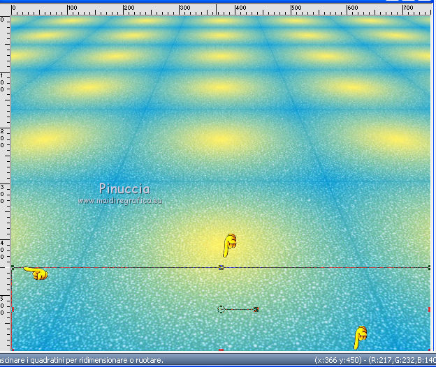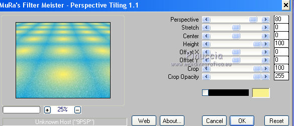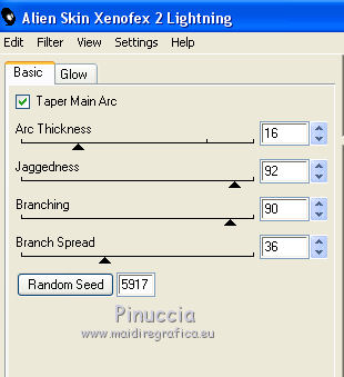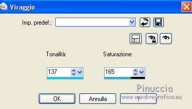 qui puoi trovare qualche risposta ai tuoi dubbi. Se l'argomento che ti interessa non è presente, ti prego di segnalarmelo. Questo tutorial è una creazione di ©Titoune e non può essere copiato su altri siti nè essere offerto per il download. Lo stesso vale per la mia traduzione. Il tutorial è stato creato con PSP X5, ma può essere eseguito anche con le altre versioni di PSP. Secondo la versione utilizzata (anteriore a PSP X) potresti ottenere dei risultati differenti. Vedi la mia scheda riguardante le funzioni Rifletti>Capovolgi in X4 e X5 qui Per tradure il tutorial ho usato PSP X. Occorrente: Un tube a scelta. Il resto del materiale qui Filtri Mura's Meister - Perspective Tiling qui Alien Skin Xenofex 2.0 - Lightning qui Animation Shop qui ![]() 1. Apri una nuova immagine trasparente 750 x 600 pixels. Selezione>Seleziona tutto. 2. Apri l'elemento rd-back5 e vai a Modifica>Copia. Torna al tuo lavoro e vai a Modifica>Incolla nella selezione. Mantieni selezionato. 3. Livelli>Nuovo livello raster. Apri l'elemento re-back2 e vai a Modifica>Copia. Torna al tuo lavoro e vai a Modifica>Incolla nella selezione. Cambia la modalità di miscelatura di questo livello in Luminanza (esistente). Mantieni ancora selezionato. 4. Livelli>Nuovo livello raster. Apri l'elemento rd-back7 e vai a Modifica>Copia. Torna al tuo lavoro e vai a Modifica>Incolla nella selezione. Selezione>Deseleziona. 5. Immagine>Ridimensiona, all'85%, tutti i livelli non selezionato. Effetti>Plugins>Mura's Meister - Perspective Tiling, con i settaggi standard. ![]() 6. Premi il tasto K per attivare lo strumento Puntatore ![]() se stai usando PSP 9 il tasto D (valido per tutte le versioni) per attivare lo strumento Deformazione ![]() In modalità Scala spingi il nodo centrale superiore verso il basso fino a 450 pixels, (puoi controllare la posizione nella barra inferiore). Se non visualizzi i righelli, vai a Visualizza>Righelli. ![]() Rinomina questo livello "terra". ![]() 7. Apri l'elemento rd-tissue e vai a Modifica>Copia. Torna al tuo lavoro e vai a Modifica>Incolla come nuovo livello. Immagine>ruota per gradi - 15 gradi a sinistra. ![]() 8. Effetti>Effetti di immagine>Scostamento. ![]() 9. Effetti>Effetti di riflesso>Specchio rotante. ![]() 10. Effetti>Effetti 3D>Sfalsa ombra, colore #033179. ![]() 11. Apri l'elemento rd-deco1 e vai a Modifica>Copia. Torna al tuo lavoro e vai a Modifica>Incolla come nuovo livello. Non spostarlo. Effetti>Effetti 3D>Sfalsa ombra, con i settaggi precedenti. 12. Apri l'elemento rd-colour-frame e vai a Modifica>Copia. Torna al tuo lavoro e vai a Modifica>Incolla come nuovo livello. Non spostarlo. Effetti>Effetti 3D>Sfalsa ombra, con i settaggi precedenti. 13. Attiva lo strumento Bacchetta magica ![]() e clicca al centro ![]() Selezione>Modifica>Espandi - 5 pixels. ![]() 14. Livelli>Nuovo livello raster. Livelli>Disponi>Sposta giù. Apri l'immagine cloud_rain e vai a Modifica>Copia. Torna al tuo lavoro e vai a Modifica>Incolla nella selezione. Selezione>Deseleziona. Rinomina questo livello "animazione". 15. Attiva il livello superiore. Apri l'elemento rd-raindrops1 e vai a Modifica>Copia. Torna al tuo lavoro e vai a Modifica>Incolla come nuovo livello. Spostalo un po' più in alto.Vedi l'esempio finale. Niente Sfalsa ombra. 16. Apri l'elemento cloud e vai a Modifica>Copia. Torna al tuo lavoro e vai a Modifica>Incolla come nuovo livello. Immagine>Ridimensiona, al 75%, tutti i livelli non selezionato. Spostalo in alto a sinistra.![]() Effetti>Effetti 3D>Sfalsa ombra, con i settaggi precedenti. 17. Apri l'elemento branch, e vai a Modifica>Copia. Torna al tuo lavoro e vai a Modifica>Incolla come nuovo livello. Immagine>Ridimensiona, all'85%, tutti i livelli non selezionato. Spostalo in basso a sinistra.Vedi l'esempio finale. Effetti>Effetti 3D>Sfalsa ombra, con i settaggi precedenti. 18. Apri l'elemento rd-flower2 e vai a Modifica>Copia. Torna al tuo lavoro e vai a Modifica>Incolla come nuovo livello. Spostalo in alto a destra.Vedi l'esempio finale. Effetti>Effetti 3D>Sfalsa ombra, con i settaggi precedenti. 19. Apri l'elemento rd-flower1a e vai a Modifica>Copia. Torna al tuo lavoro e vai a Modifica>Incolla come nuovo livello. Spostalo in alto a destra.![]() Effetti>Effetti 3D>Sfalsa ombra, con i settaggi precedenti. 20. Apri l'elemento rd-flower2a e vai a Modifica>Copia. Torna al tuo lavoro e vai a Modifica>Incolla come nuovo livello. Spostalo in basso a destra.Vedi l'esempio finale. Effetti>Effetti 3D>Sfalsa ombra, con i settaggi precedenti. 21. Apri l'elemento rd-umbrella e vai a Modifica>Copia. Torna al tuo lavoro e vai a Modifica>Incolla come nuovo livello. Spostalo in basso a destra.![]() Effetti>Effetti 3D>Sfalsa ombra, con i settaggi precedenti. 22. Apri l'elemento rd-beads e vai a Modifica>Copia. Torna al tuo lavoro e vai a Modifica>Incolla come nuovo livello. Nella paletta dei livelli porta questo livello sopra il livello "terra". 23. Regola>Tonalità e saturazione>Viraggio. ![]() Effetti>Effetti 3D>Sfalsa ombra, con i settaggi precedenti. 24. Attiva il livello superiore. Apri l'elemento wordart_raindrops e vai a Modifica>Copia. Torna al tuo lavoro e vai a Modifica>Incolla come nuovo livello. Spostalo dove preferisci,o vedi il mio esempio. Effetti>Effetti 3D>Sfalsa ombra, con i settaggi precedenti. 25. Apri il tuo tube e vai a Modifica>Copia. Torna al tuo lavoro e vai a Modifica>Incolla come nuovo livello. Immagine>Ridimensiona, se e quanto necessario, tutti i livelli non selezionato. Spostalo dove preferisci,o vedi il mio esempio. Effetti>Effetti 3D>Sfalsa ombra, con i settaggi precedenti. Firma il tuo lavoro. 26. Animazione. Attiva il livello "animazione". Livelli>Duplica - 2 volte e rimani posizionato sul livello della seconda copia. Effetti>Plugins>Alien Skin Xenofex 2.0 - Lightning. ![]() Chiudi questo livello e attiva il livello sottostante della prima copia. Effetti>Plugins>Alien Skin Xenofex 2.0 - Lightning, clicca su Random Seed e ok. Chiudi questo livello e attiva il livello "an